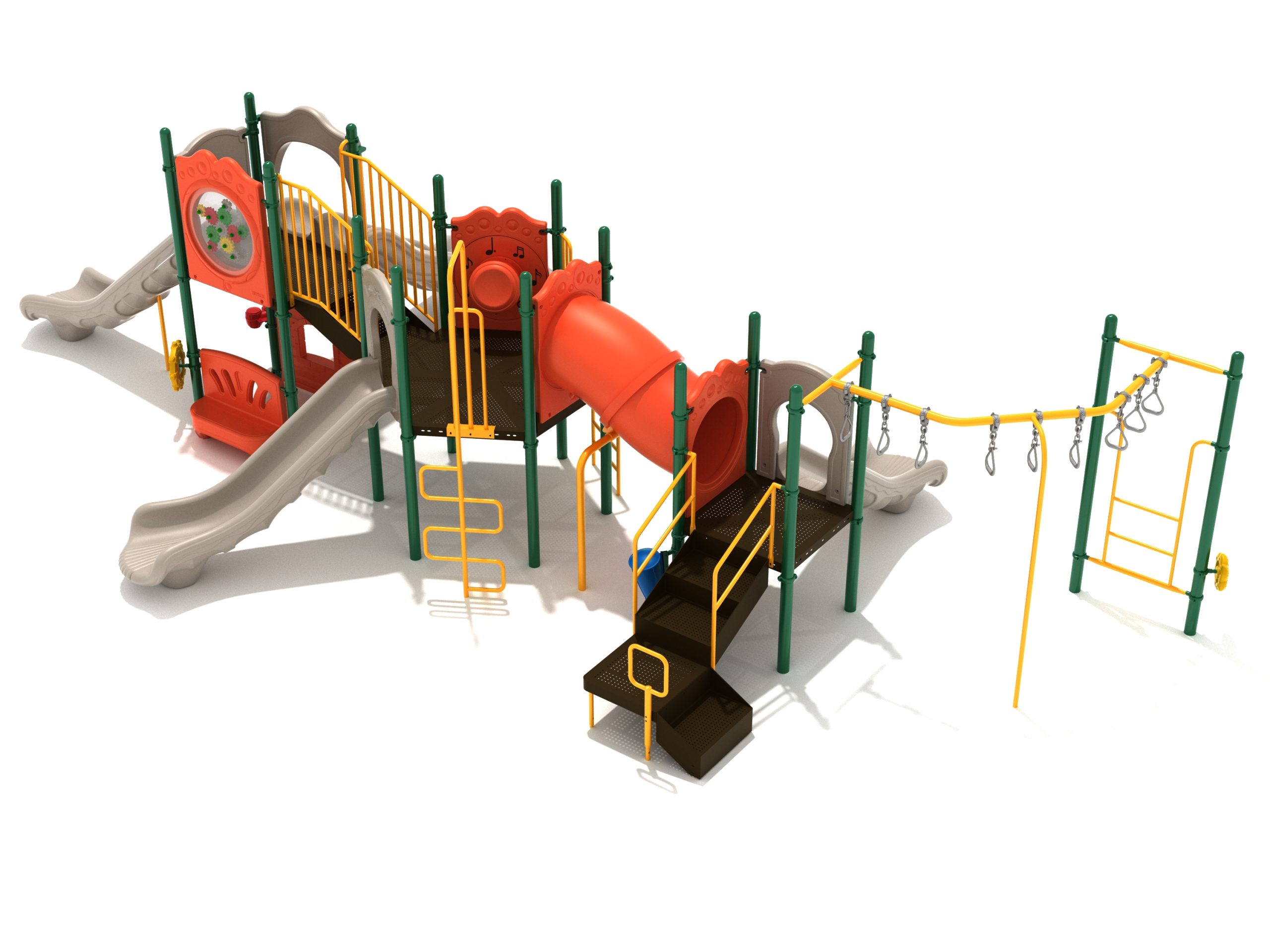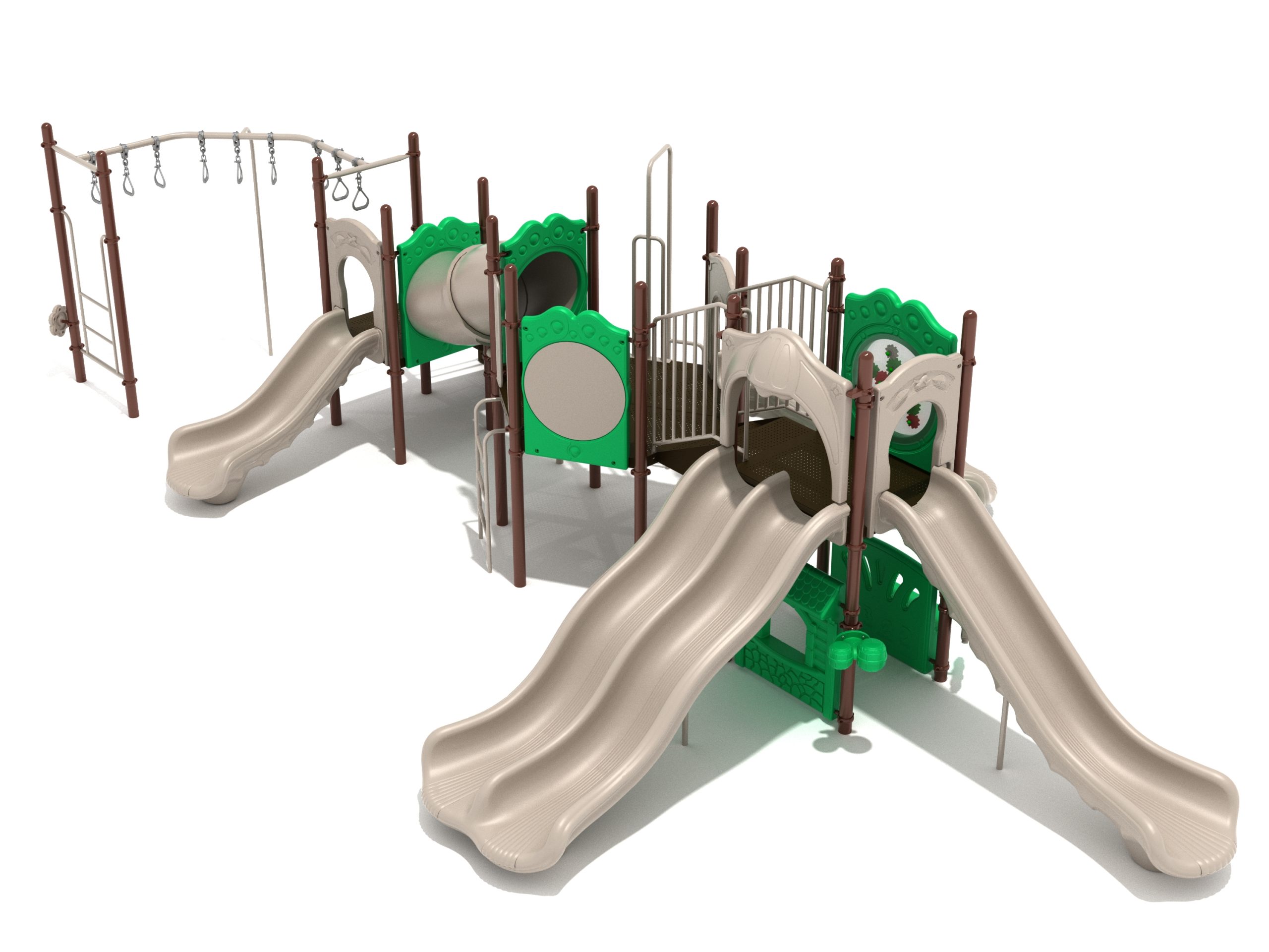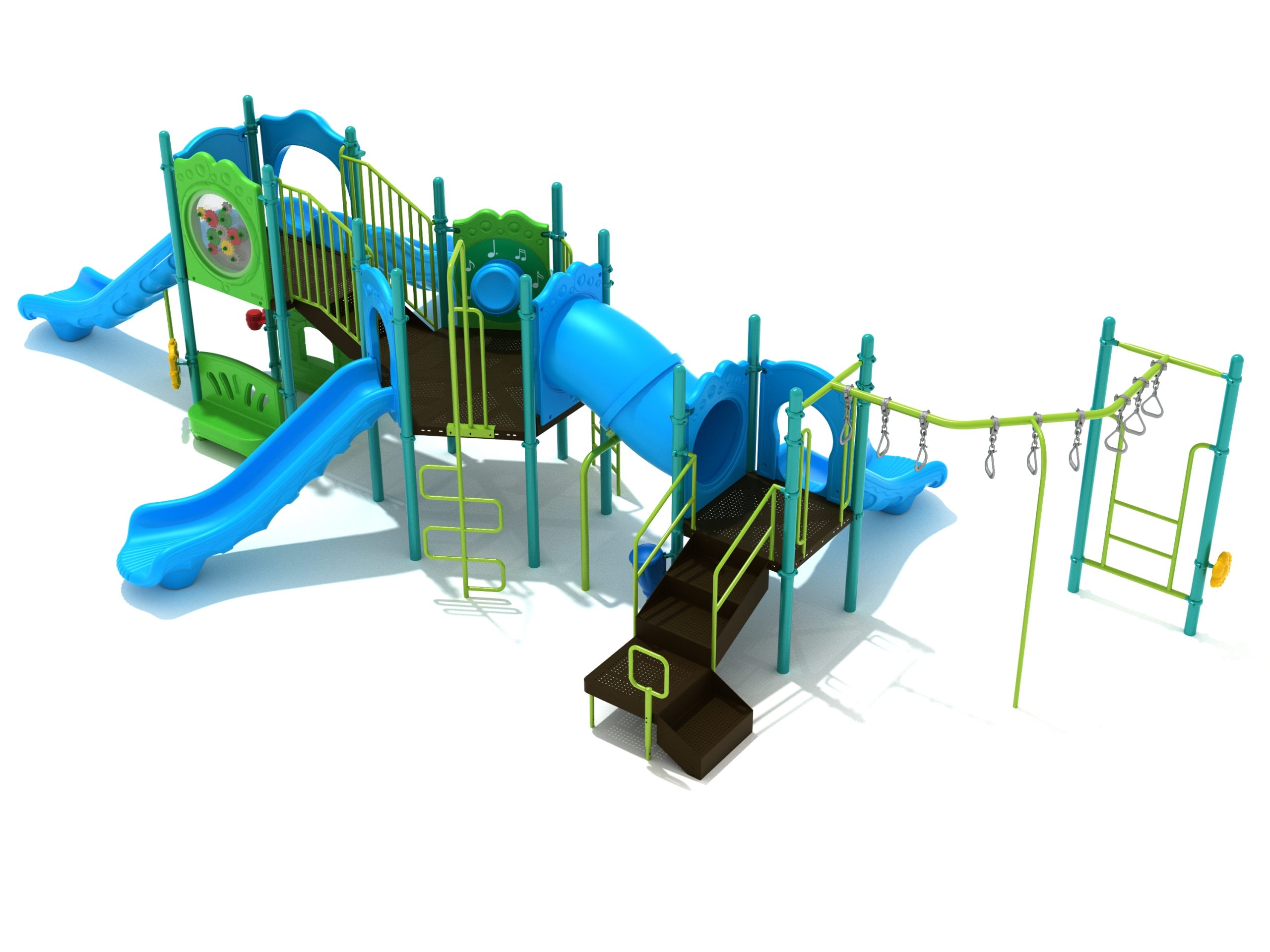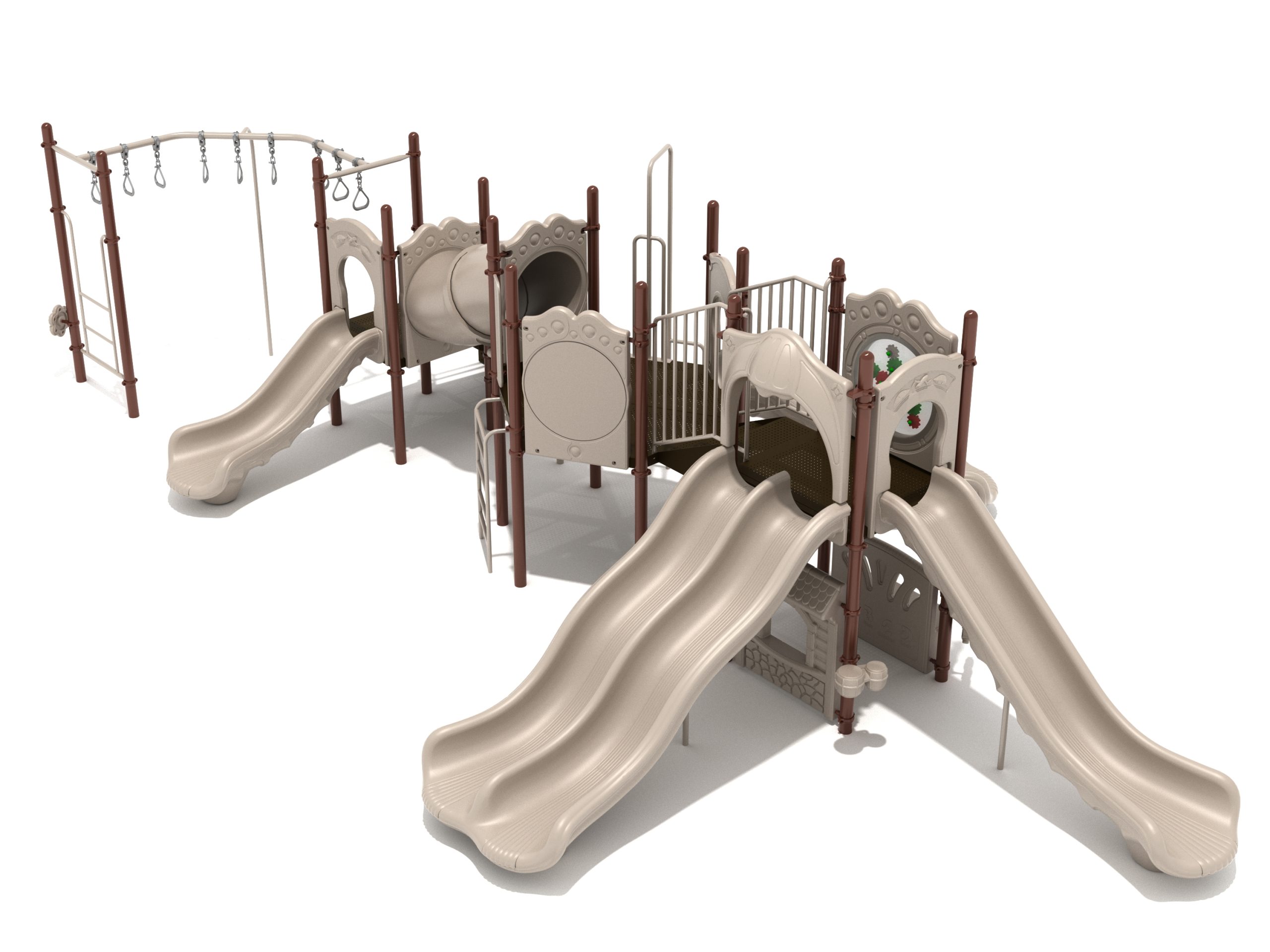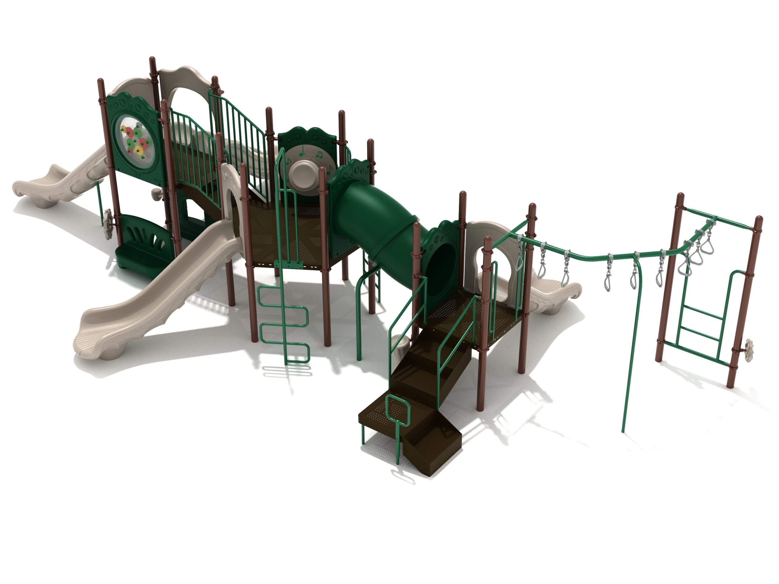 When you need to place a structure that will cater for dozens of children at the same time, the Mountain View has everything you’ll need to keep them entertained. The huge structure has three Straight Slides on multiple levels as well as a Double Wave Slide to provide the most exciting race to the bottom. On the ground level younger children not ready for climbing adventures will be able to enjoy features such as Bongos and a Single Drum for music making, a Ship’s Wheel to spin around, a Bench Panel for chatting with friends, and a Rain Wheel that makes it sound like pouring rain when spun. There’s a large Drum Panel and Gear Panel on the upper level to keep children entertained with an interactive experience. For children who love nothing more to swing, climb and hang, they’ll be pleased to see the Mountain View also has a 90 Degree Swinging Ring Ladder to monkey their way over a fast-flowing river or exotic jungle canopy onto a platform before crawling on hands and knees through the Incline Tube Bridge. A Snake Climber and Vertical Climber offer two ways to scale the structure and require agility and flexibility.