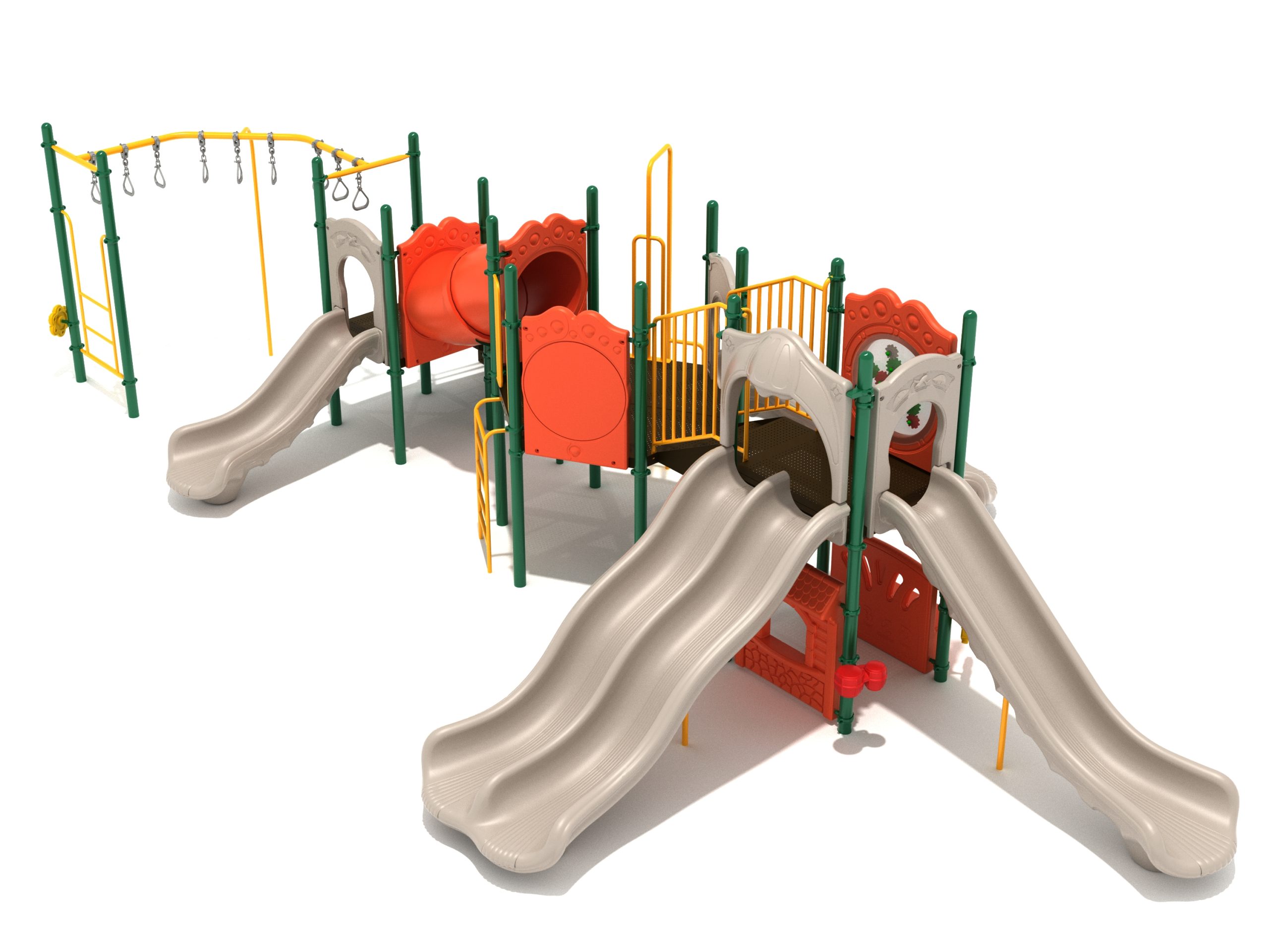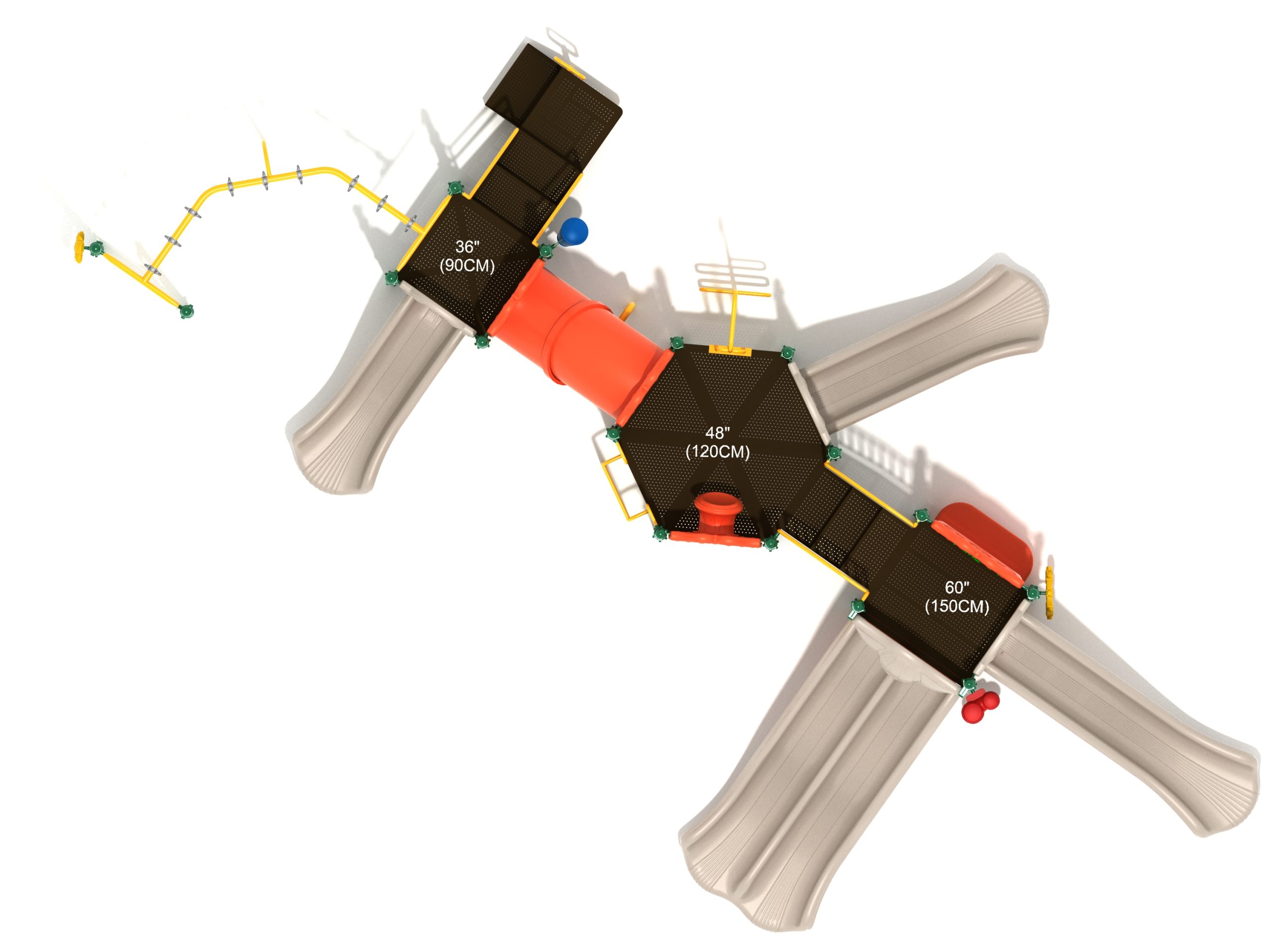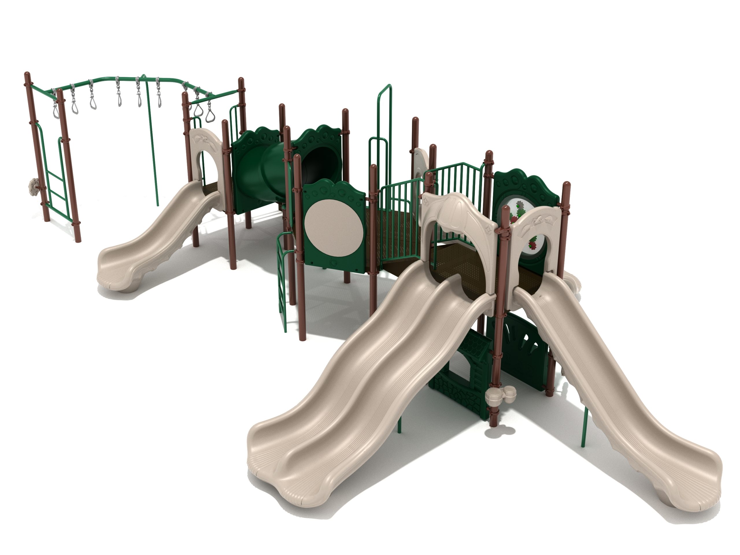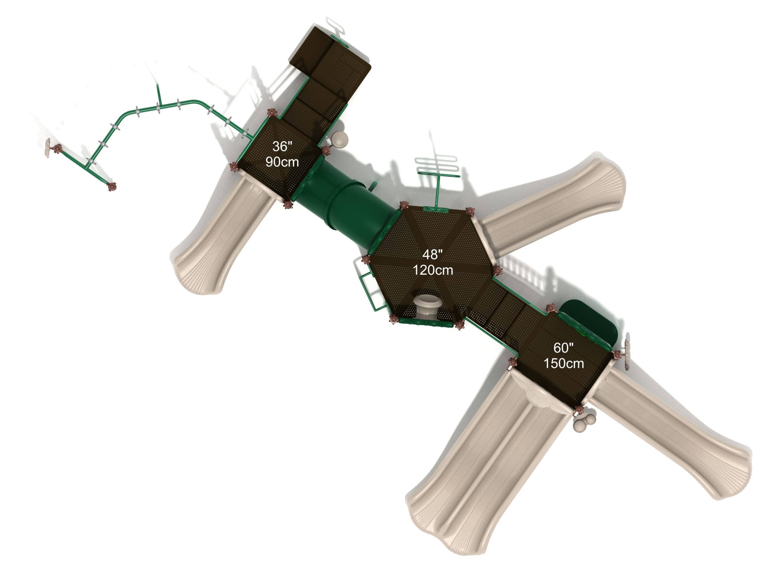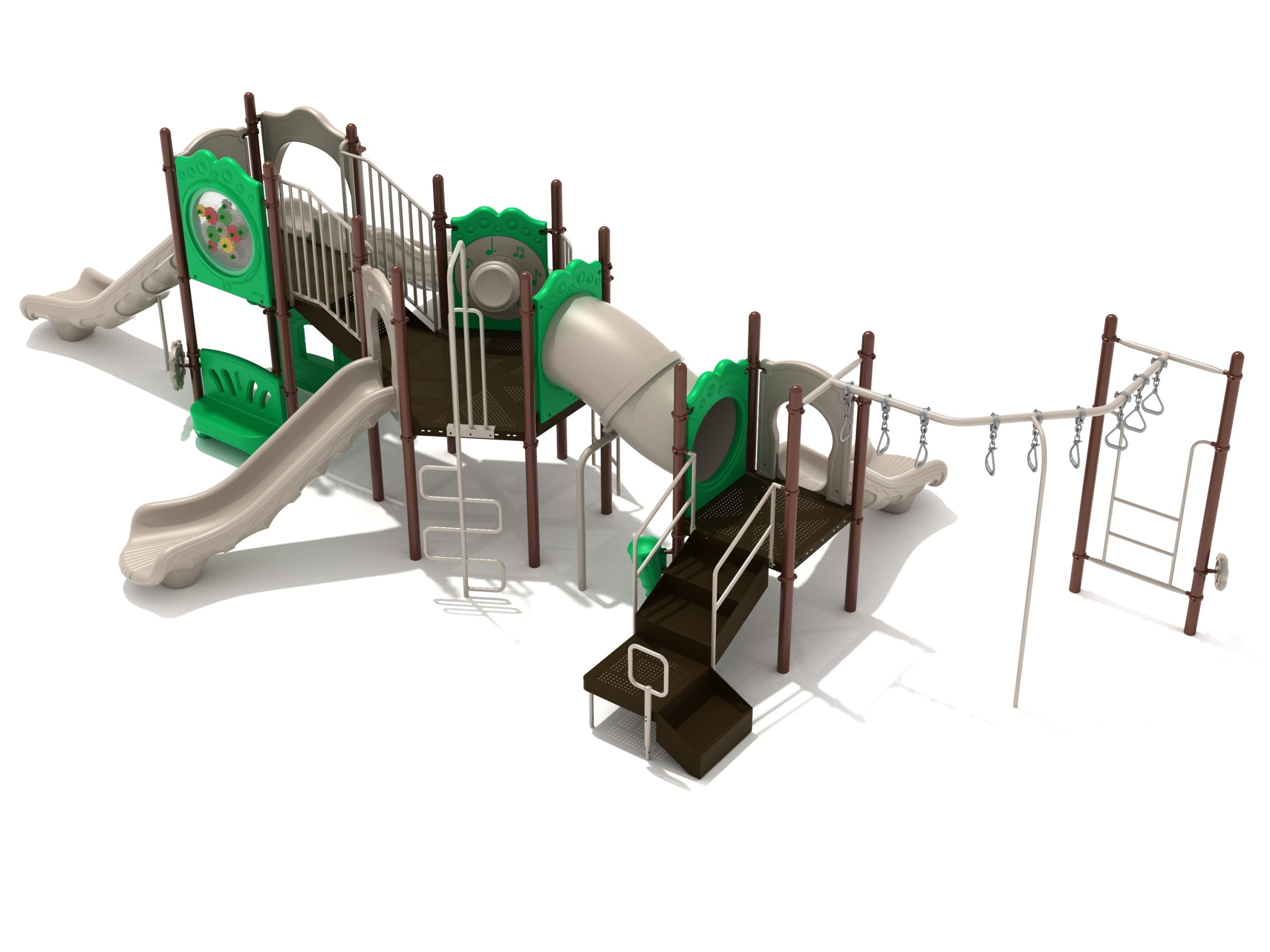 When you need to place a structure that will cater for dozens of children at the same time, the Mountain View has everything you’ll need to keep them entertained. The huge structure has three Straight Slides on multiple levels as well as a Double Wave Slide to provide the most exciting race to the bottom. On the ground level younger children not ready for climbing adventures will be able to enjoy features such as Bongos and a Single Drum for music making, a Ship’s Wheel to spin around, a Bench Panel for chatting with friends, and a Rain Wheel that makes it sound like pouring rain when spun. There’s a large Drum Panel and Gear Panel on the upper level to keep children entertained with an interactive experience. For children who love nothing more to swing, climb and hang, they’ll be pleased to see the Mountain View also has a 90 Degree Swinging Ring Ladder to monkey their way over a fast-flowing river or exotic jungle canopy onto a platform before crawling on hands and knees through the Incline Tube Bridge. A Snake Climber and Vertical Climber offer two ways to scale the structure and require agility and flexibility.