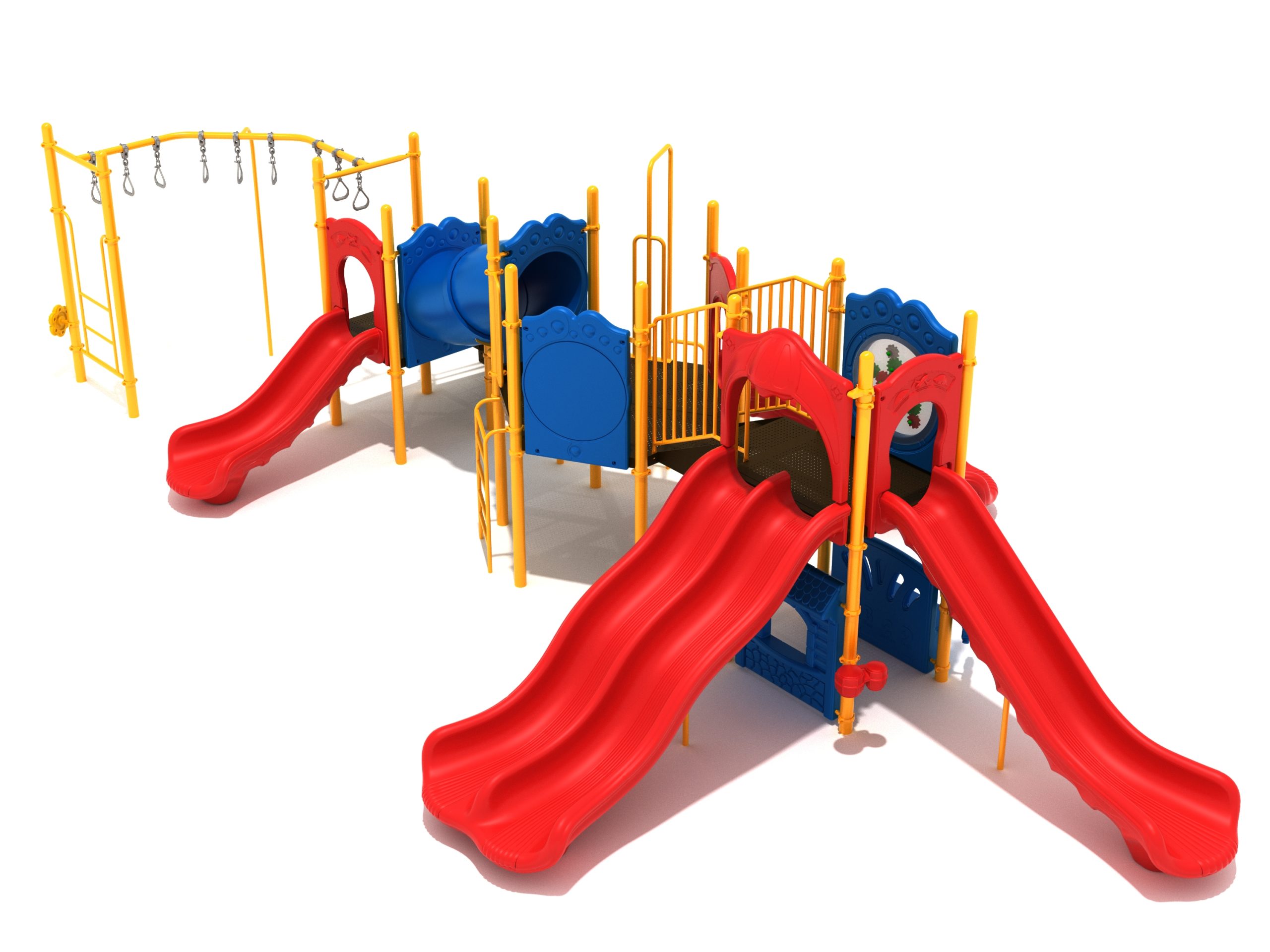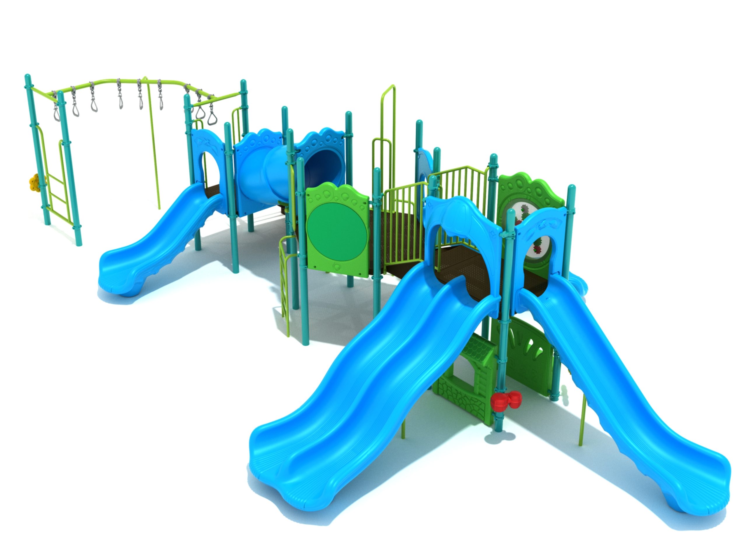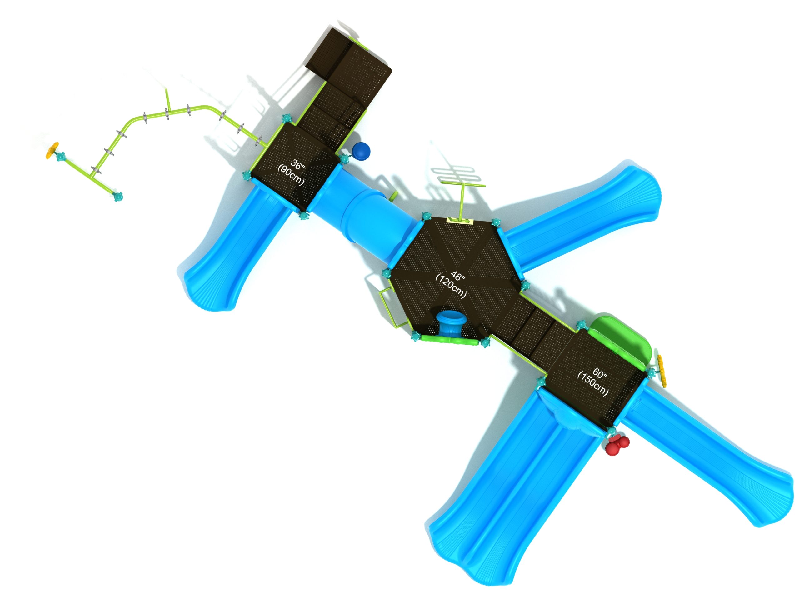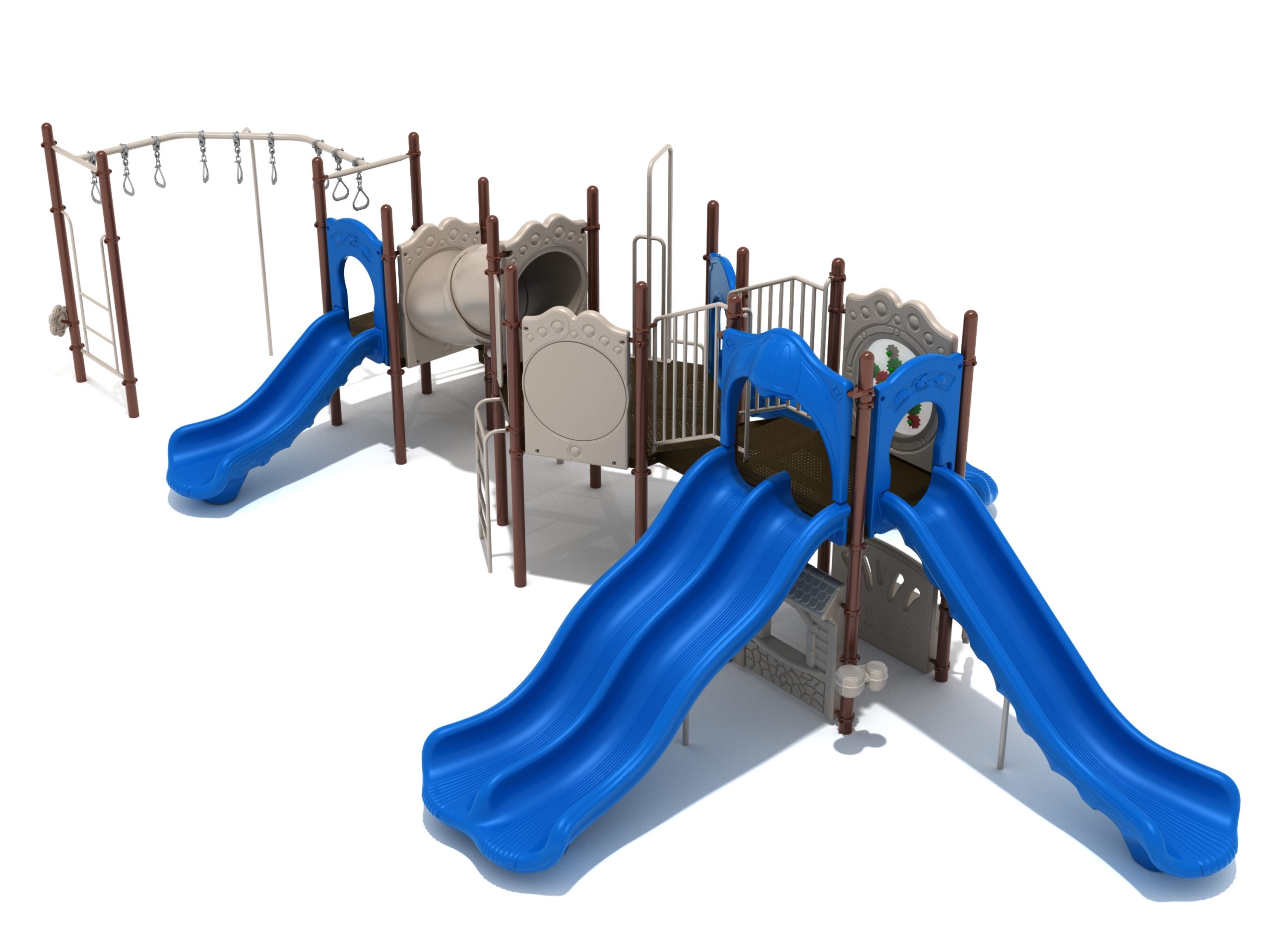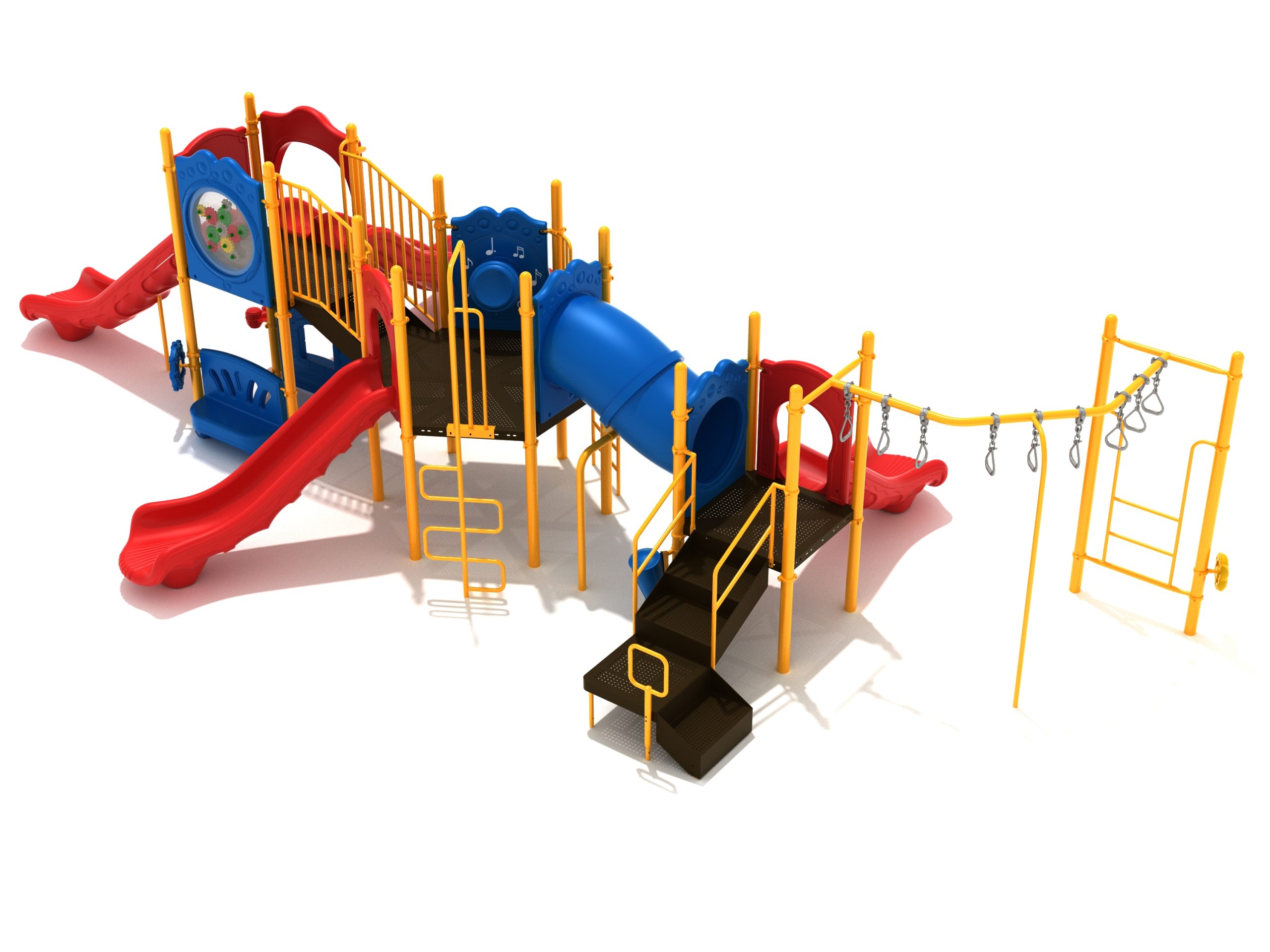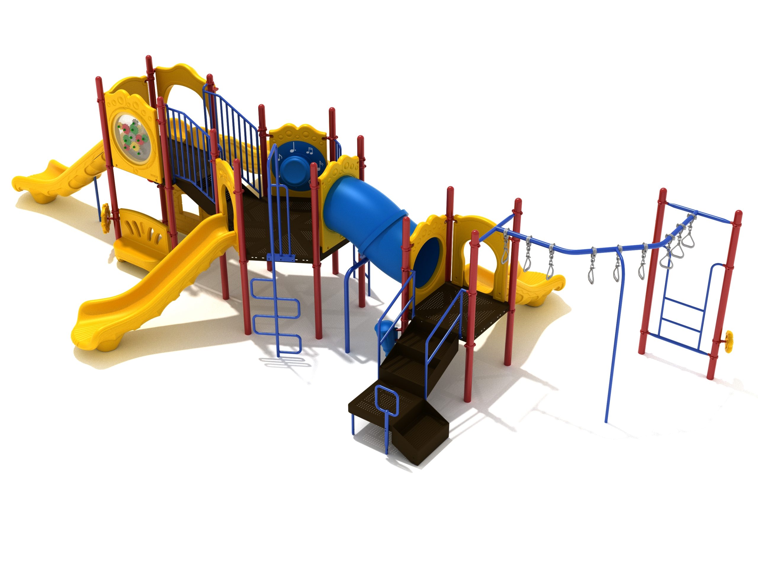 When you need to place a structure that will cater for dozens of children at the same time, the Mountain View has everything you’ll need to keep them entertained. The huge structure has three Straight Slides on multiple levels as well as a Double Wave Slide to provide the most exciting race to the bottom. On the ground level younger children not ready for climbing adventures will be able to enjoy features such as Bongos and a Single Drum for music making, a Ship’s Wheel to spin around, a Bench Panel for chatting with friends, and a Rain Wheel that makes it sound like pouring rain when spun. There’s a large Drum Panel and Gear Panel on the upper level to keep children entertained with an interactive experience. For children who love nothing more to swing, climb and hang, they’ll be pleased to see the Mountain View also has a 90 Degree Swinging Ring Ladder to monkey their way over a fast-flowing river or exotic jungle canopy onto a platform before crawling on hands and knees through the Incline Tube Bridge. A Snake Climber and Vertical Climber offer two ways to scale the structure and require agility and flexibility.