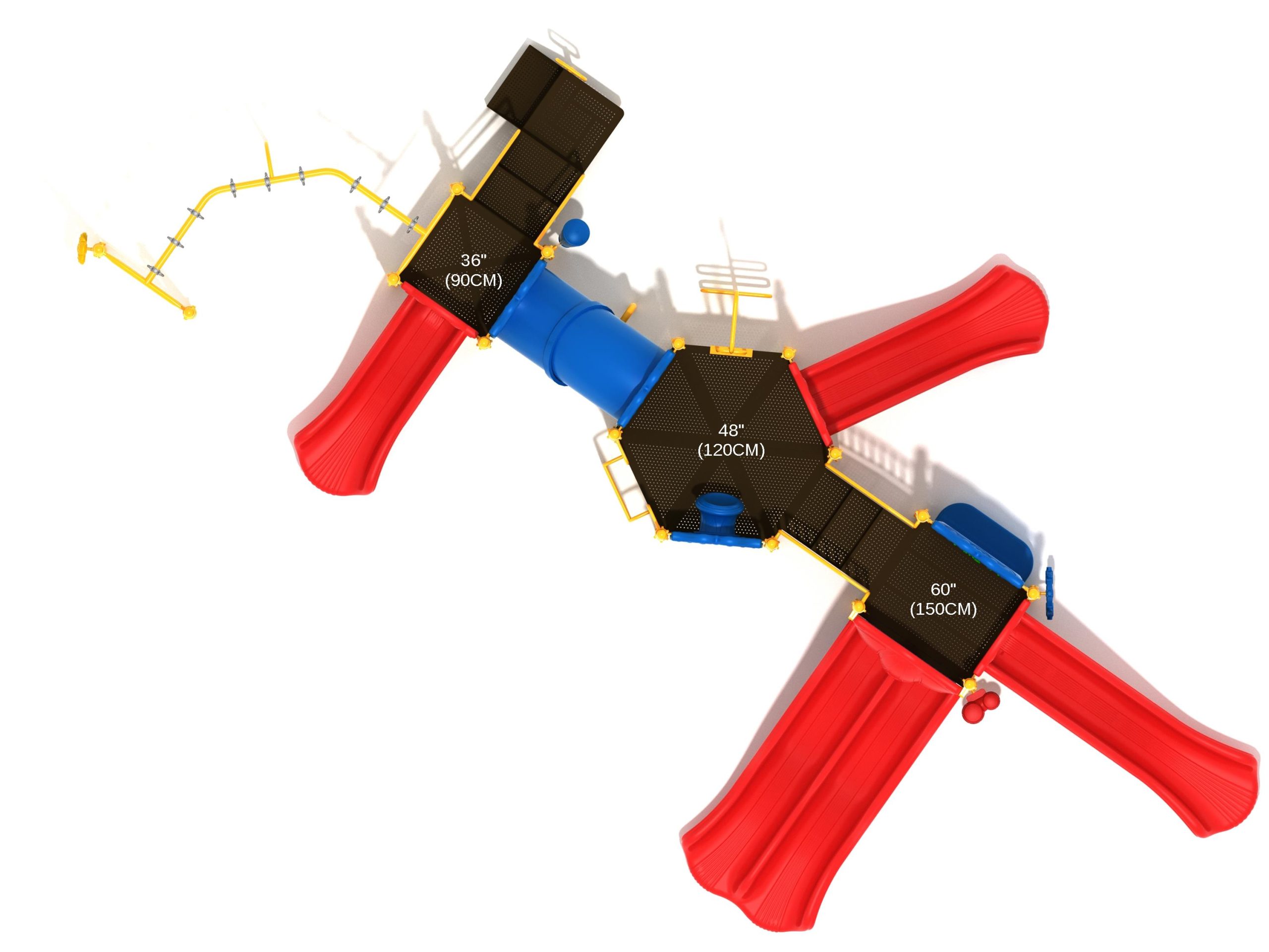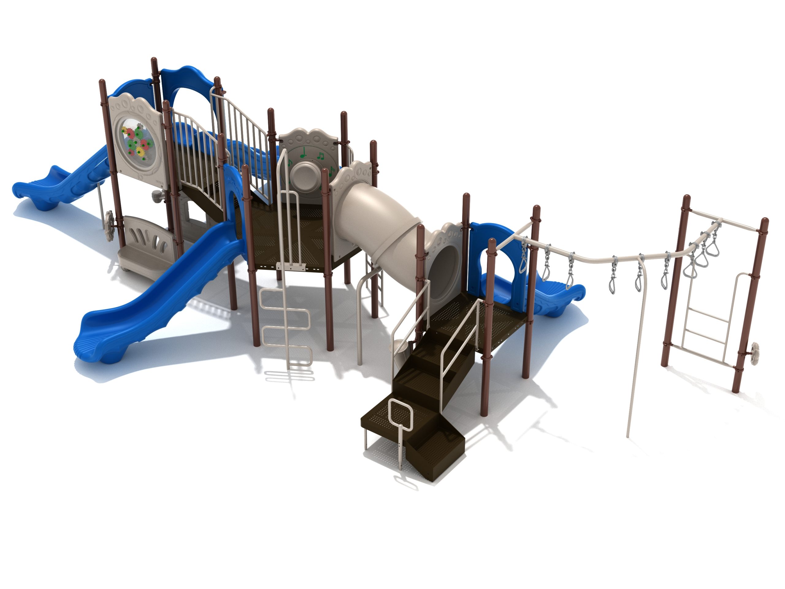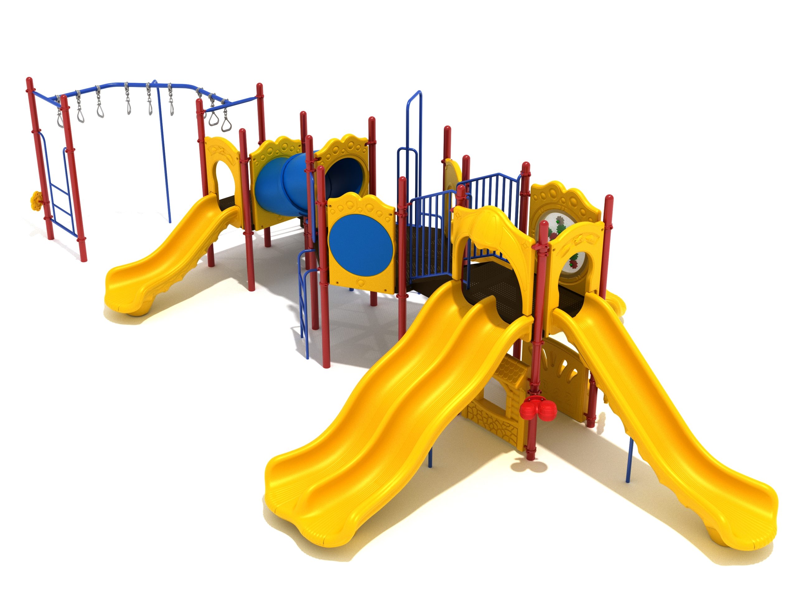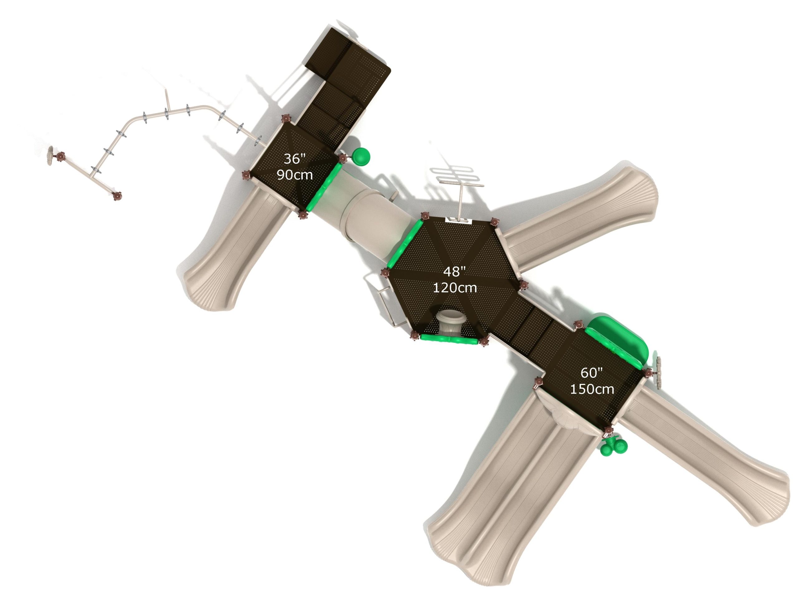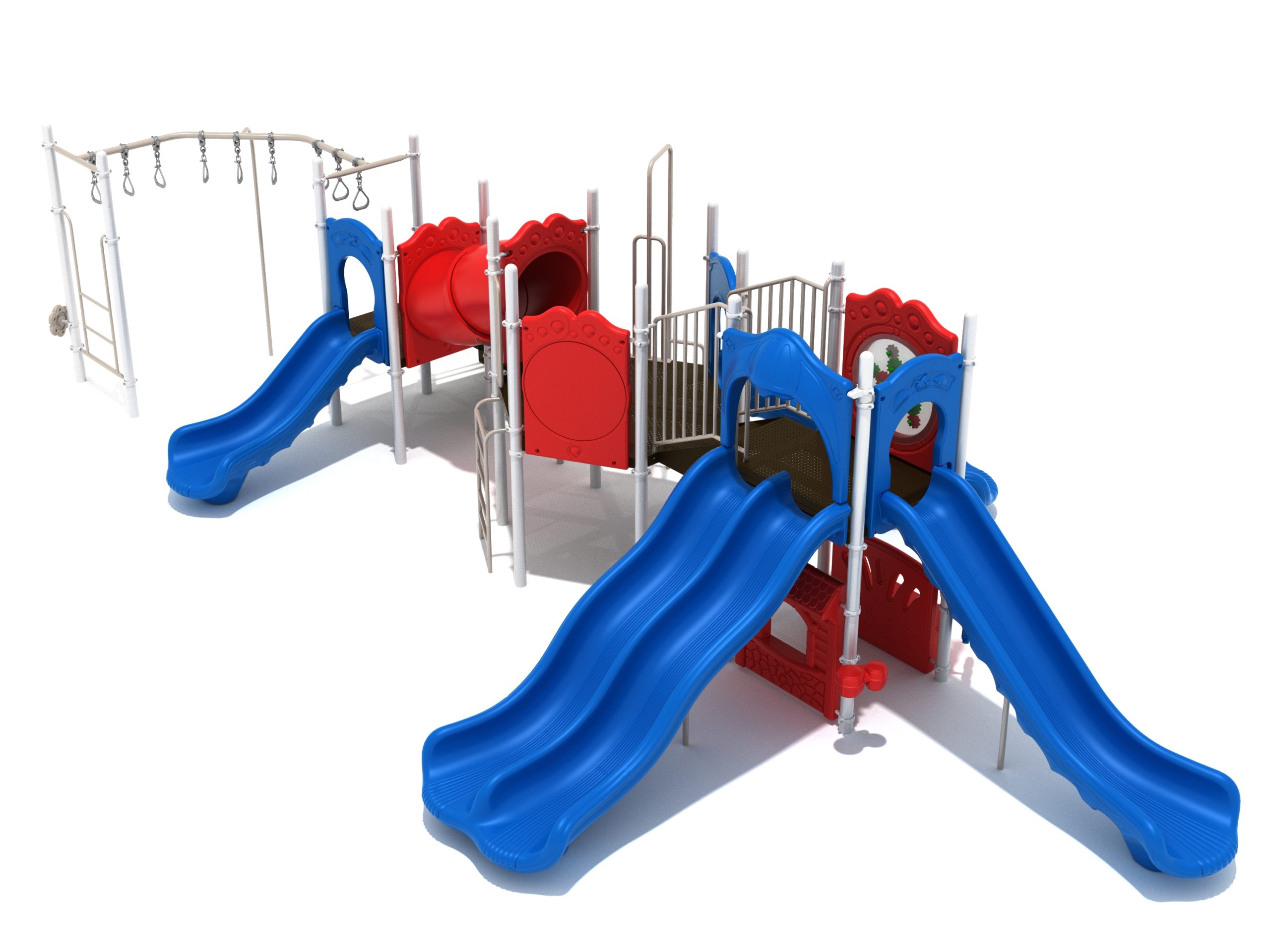 When you need to place a structure that will cater for dozens of children at the same time, the Mountain View has everything you’ll need to keep them entertained. The huge structure has three Straight Slides on multiple levels as well as a Double Wave Slide to provide the most exciting race to the bottom. On the ground level younger children not ready for climbing adventures will be able to enjoy features such as Bongos and a Single Drum for music making, a Ship’s Wheel to spin around, a Bench Panel for chatting with friends, and a Rain Wheel that makes it sound like pouring rain when spun. There’s a large Drum Panel and Gear Panel on the upper level to keep children entertained with an interactive experience. For children who love nothing more to swing, climb and hang, they’ll be pleased to see the Mountain View also has a 90 Degree Swinging Ring Ladder to monkey their way over a fast-flowing river or exotic jungle canopy onto a platform before crawling on hands and knees through the Incline Tube Bridge. A Snake Climber and Vertical Climber offer two ways to scale the structure and require agility and flexibility.