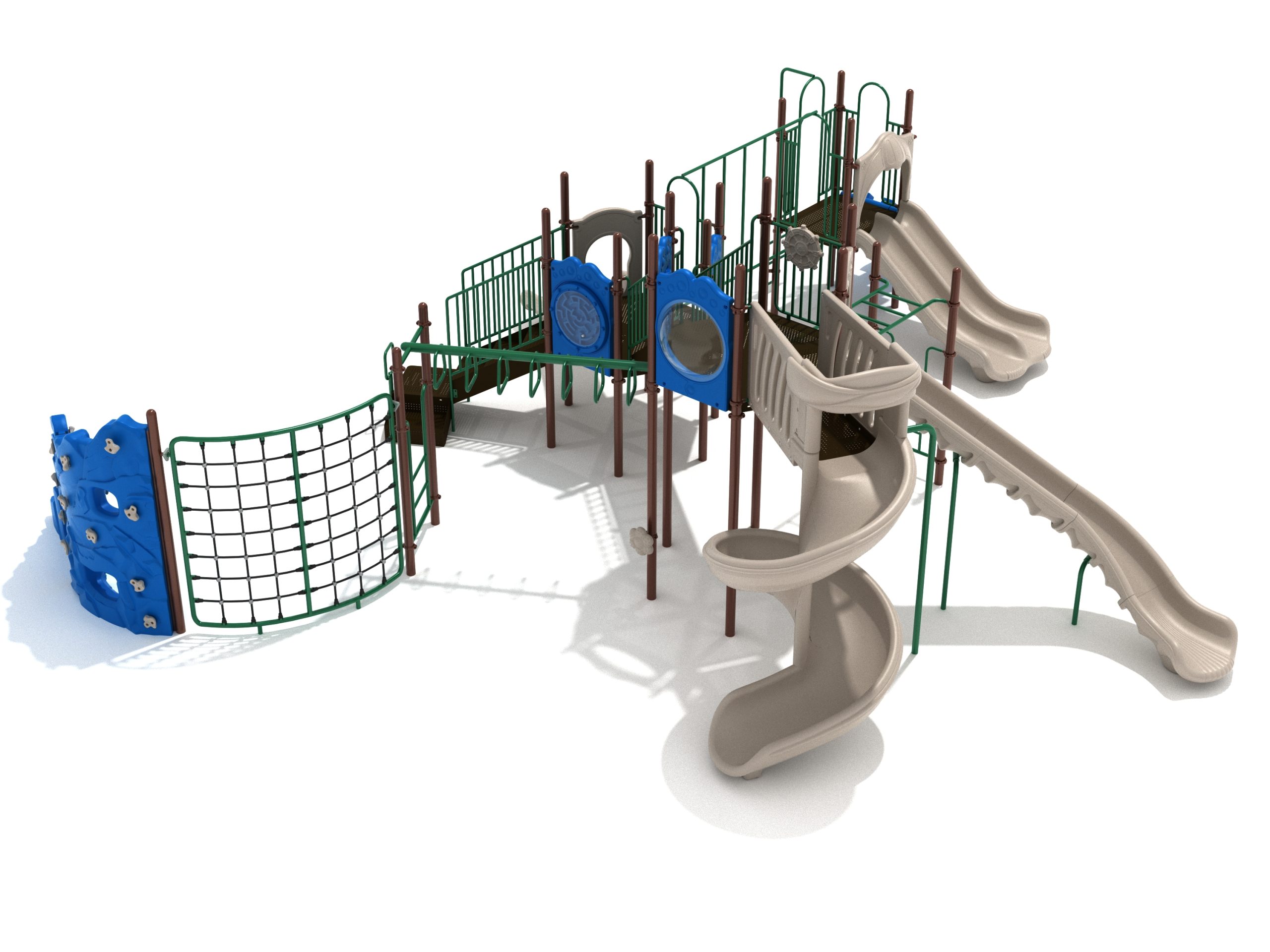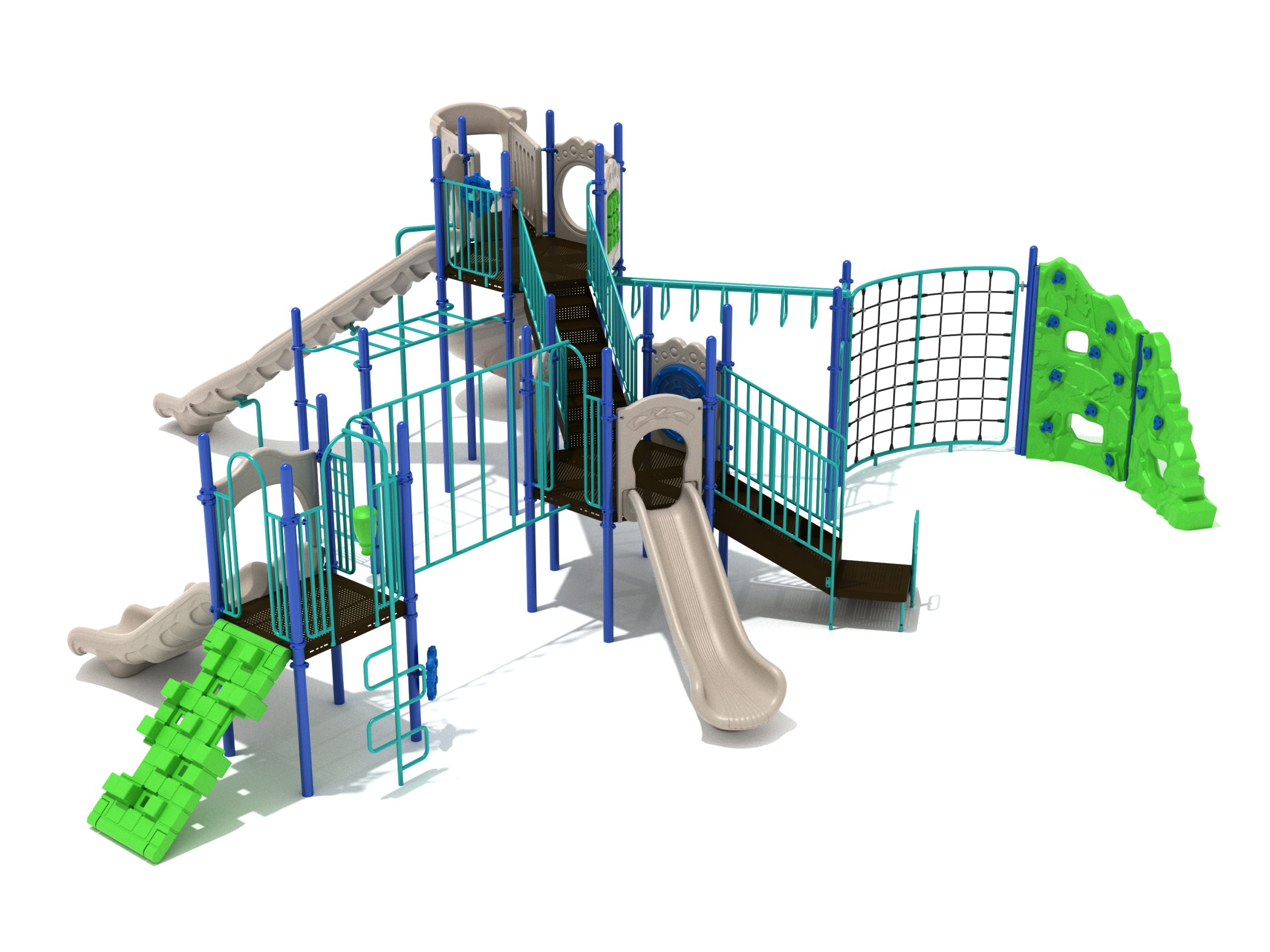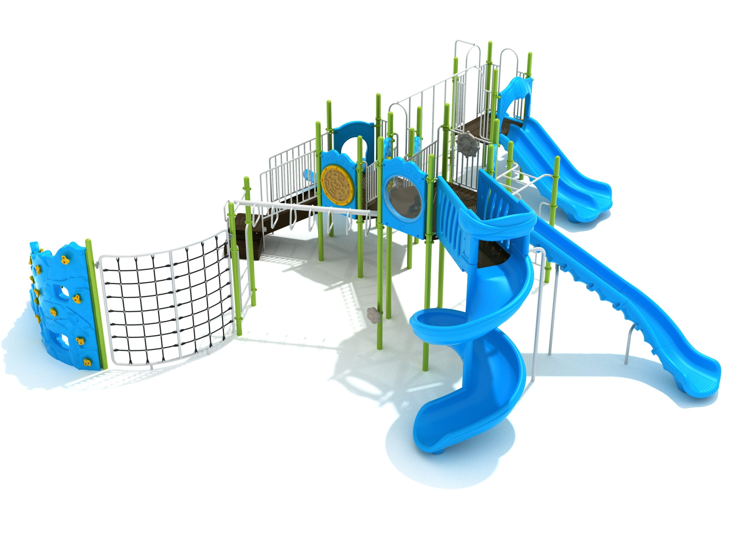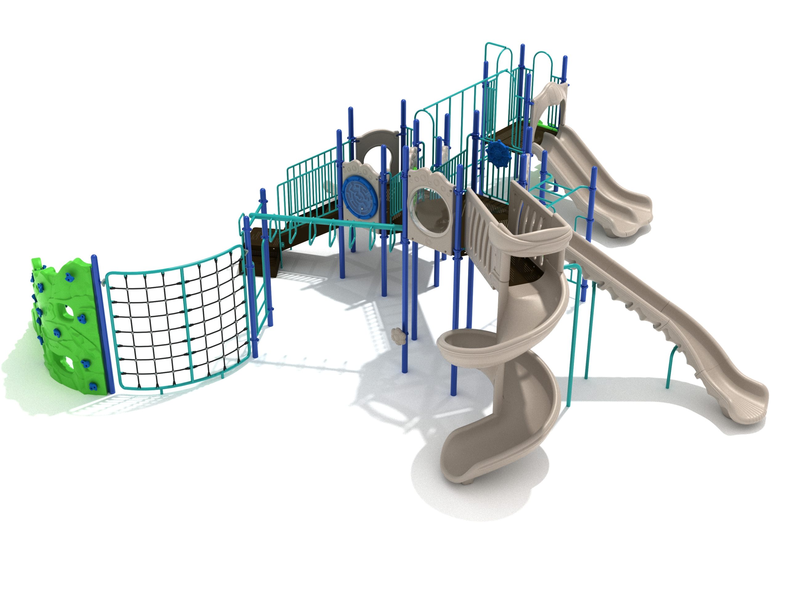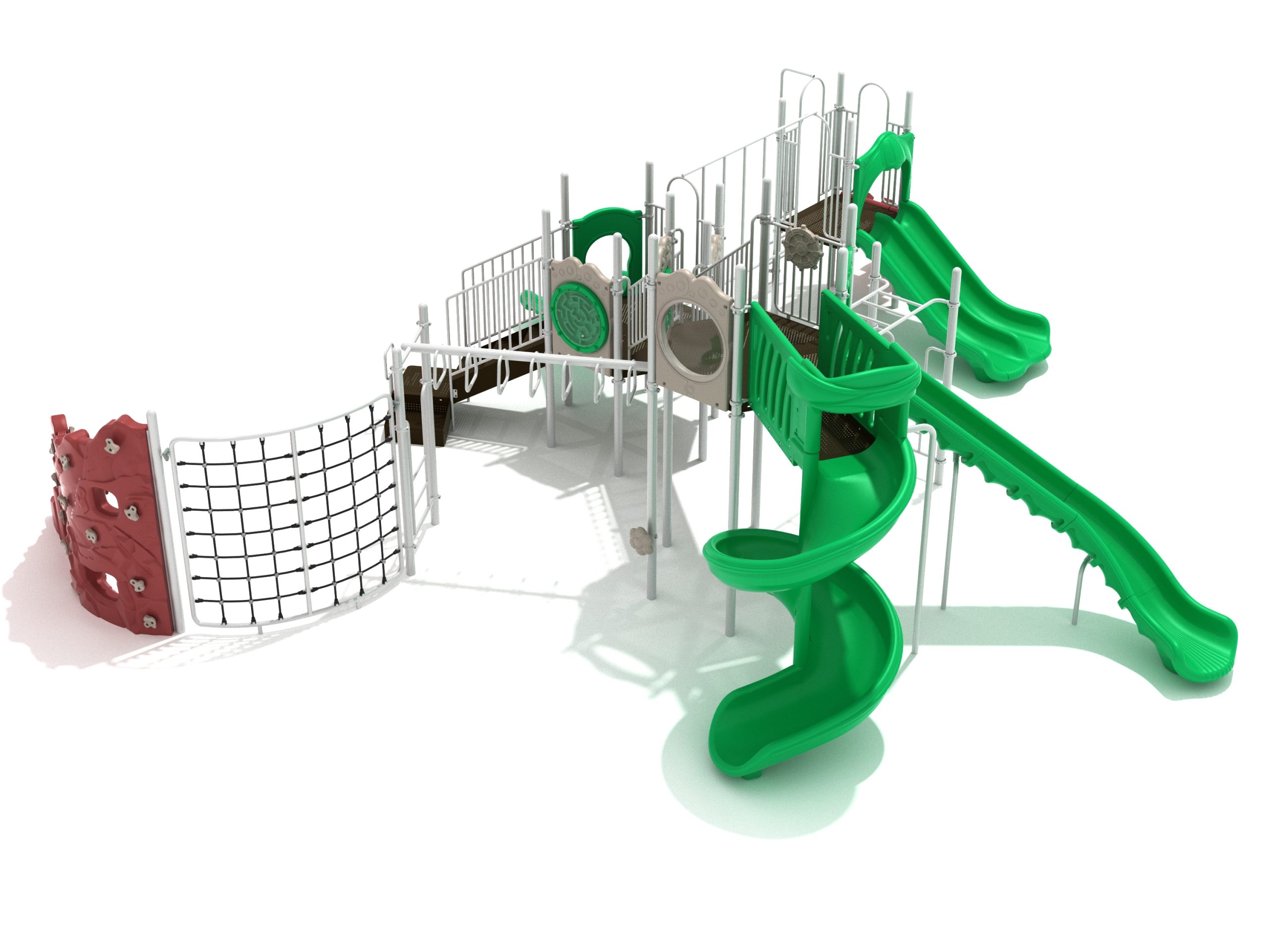 The Oceanside is what you get when you merge a slides hub with an obstacle course. Some obstacles lead to the deck of the Oceanside, while others aren’t connected to a deck but yet develop upper body strength in kids that attempt them. Kids can start with the Craggy Climber that resembles real rock formations, then jump onto the even more challenging Curved Net Climber, and finally swing across the Overhead Straight Trapezoid Loop Ladder, all without touching the ground. Next, they can reward themselves by taking the easy Transfer Station stairway to the deck and trying out all the slides, including the short and fast Straight Slide, the whopping 8-foot tall gently curved Right Turn Slide, and the amazing Spiral Slide. Kids can also attempt the lateral Ladder Bridge and land on the launching point of a short Double Slide. An inclined Pixel Climber and vertical Snake Climber are also there to add to the challenge. You’ll also see a good number of kids busy with the multiple activity panels and mounted toys.