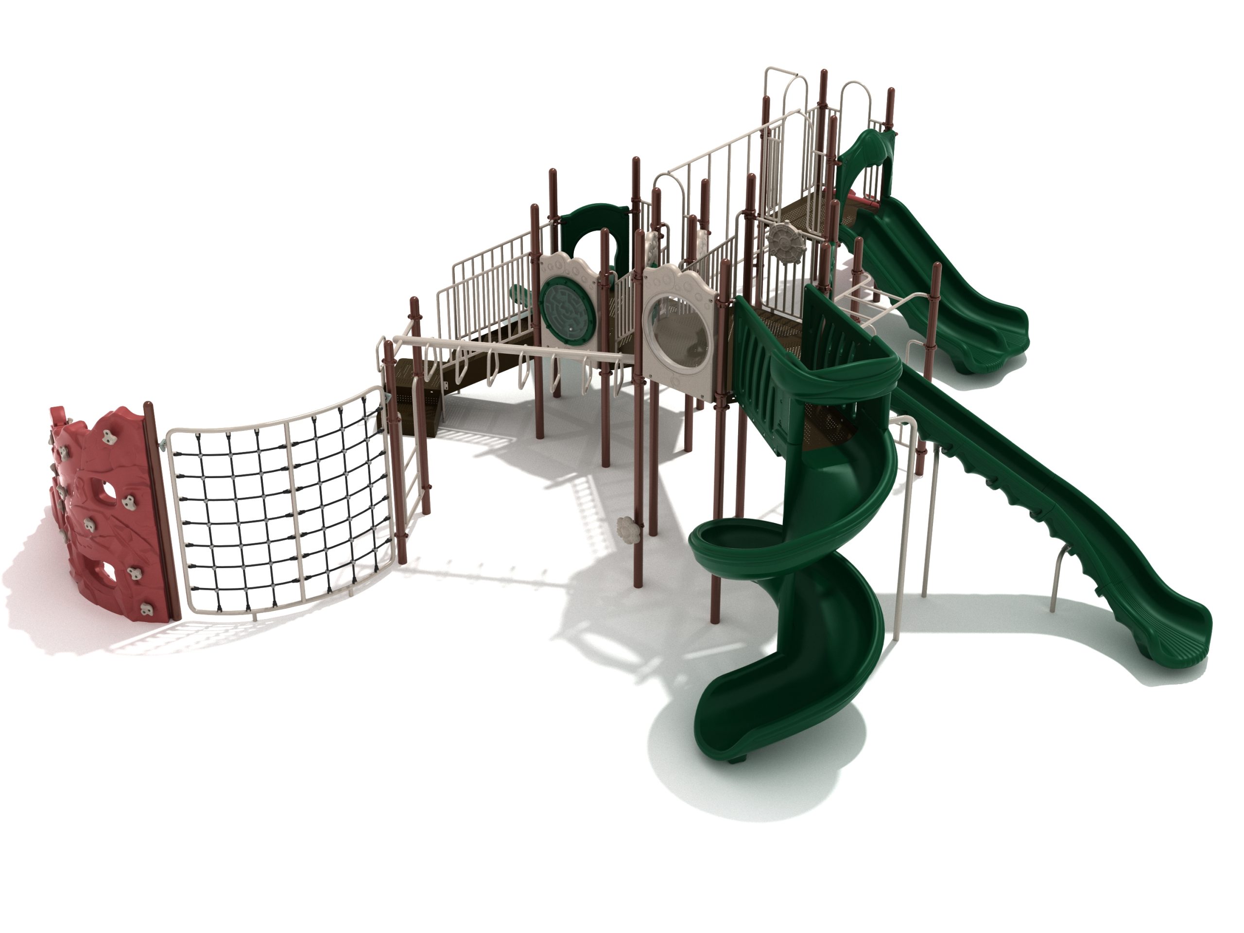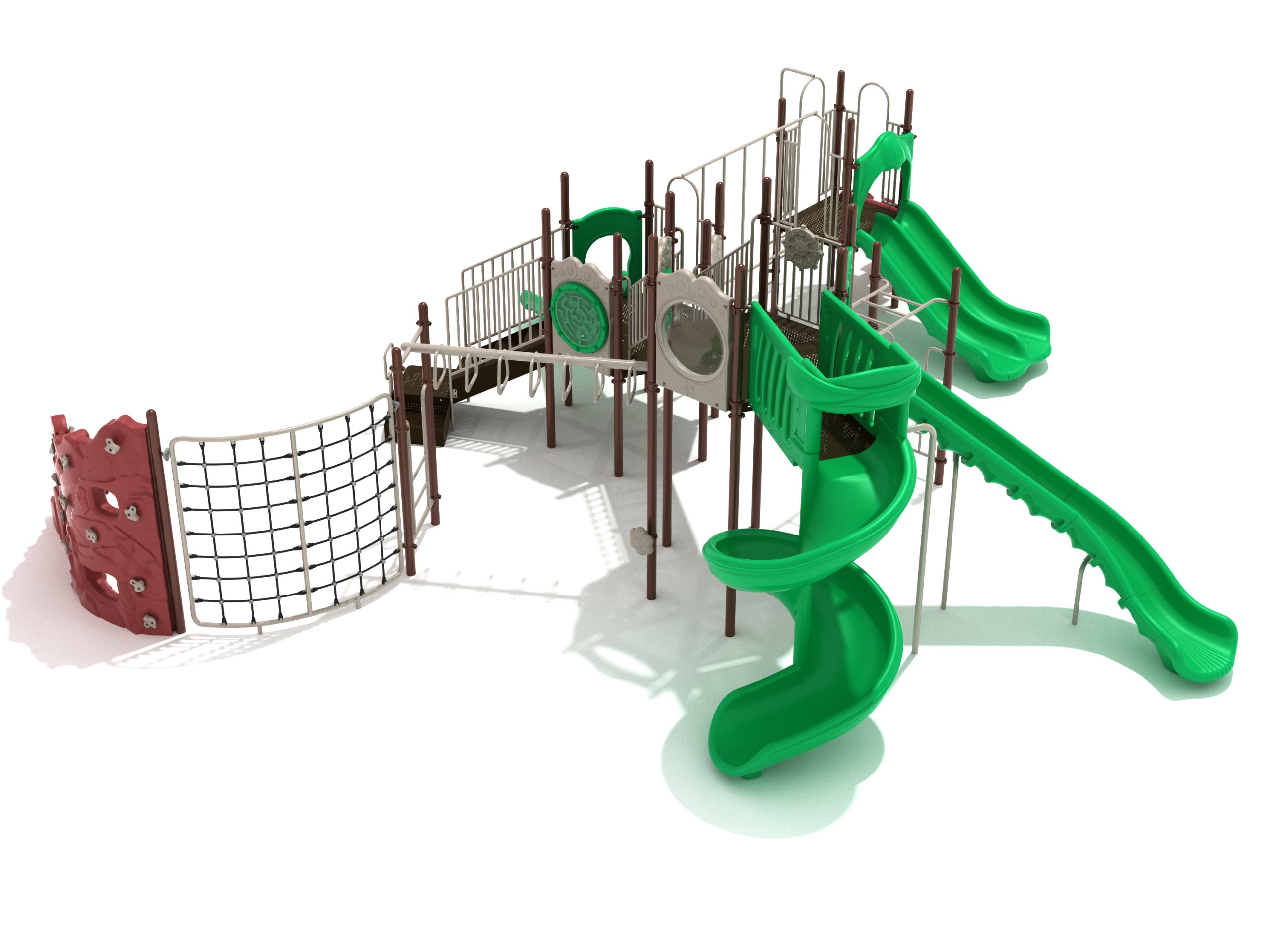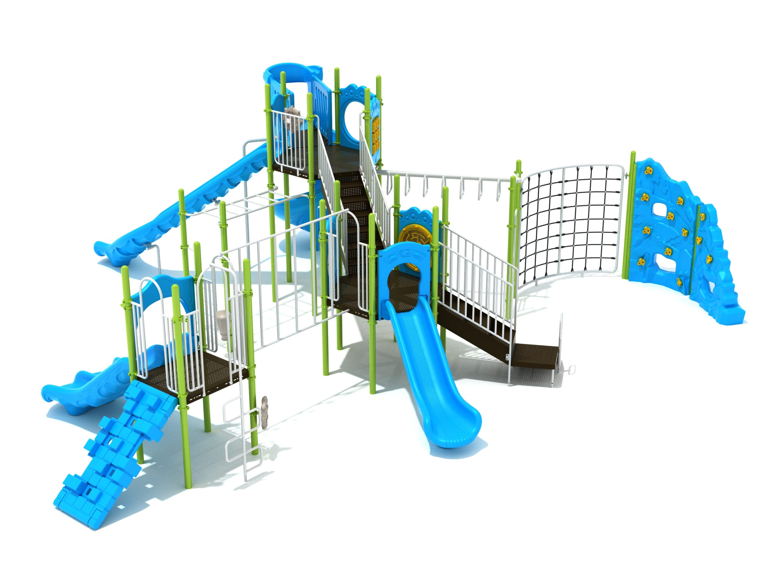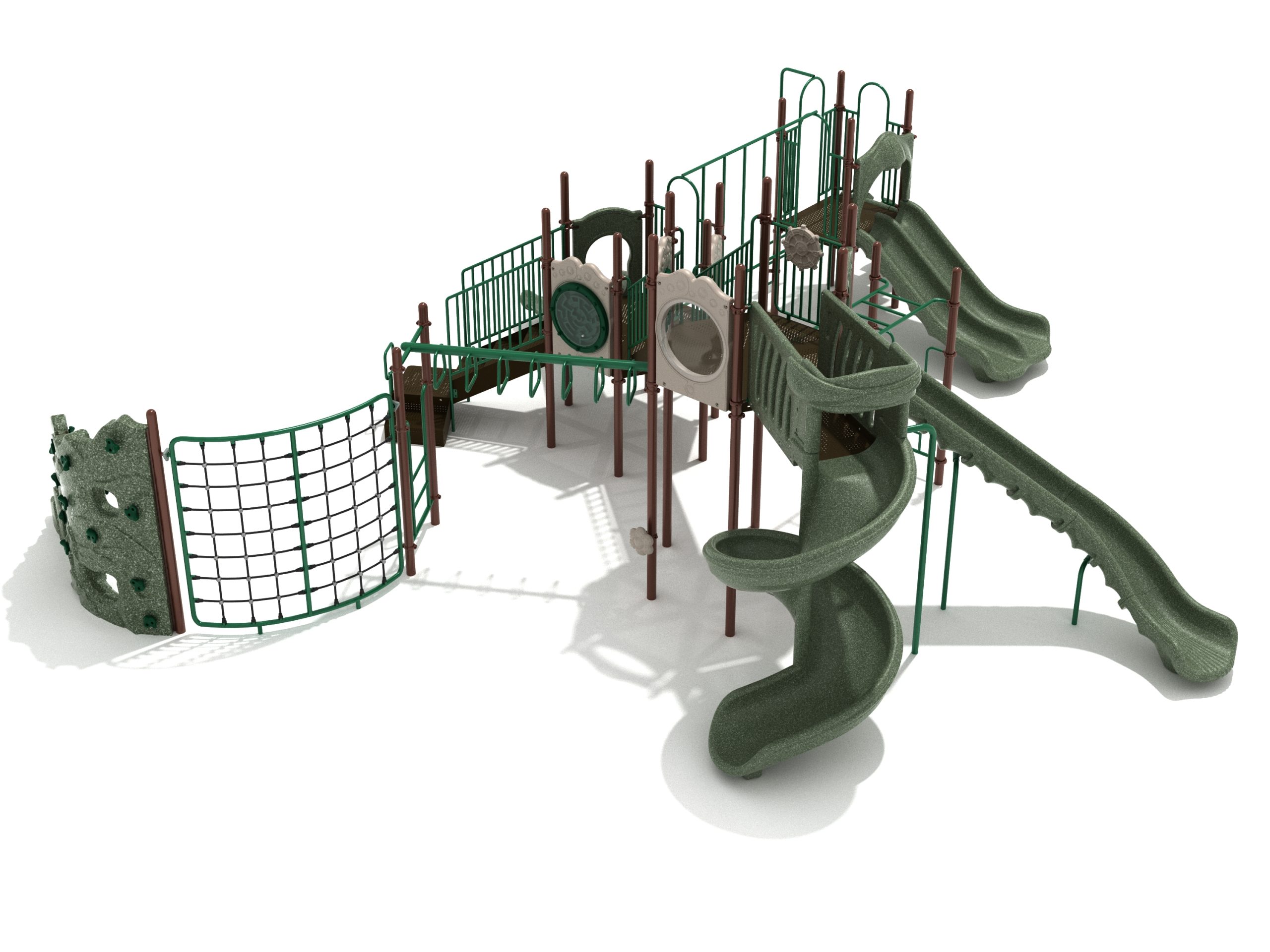 The Oceanside is what you get when you merge a slides hub with an obstacle course. Some obstacles lead to the deck of the Oceanside, while others aren’t connected to a deck but yet develop upper body strength in kids that attempt them. Kids can start with the Craggy Climber that resembles real rock formations, then jump onto the even more challenging Curved Net Climber, and finally swing across the Overhead Straight Trapezoid Loop Ladder, all without touching the ground. Next, they can reward themselves by taking the easy Transfer Station stairway to the deck and trying out all the slides, including the short and fast Straight Slide, the whopping 8-foot tall gently curved Right Turn Slide, and the amazing Spiral Slide. Kids can also attempt the lateral Ladder Bridge and land on the launching point of a short Double Slide. An inclined Pixel Climber and vertical Snake Climber are also there to add to the challenge. You’ll also see a good number of kids busy with the multiple activity panels and mounted toys.