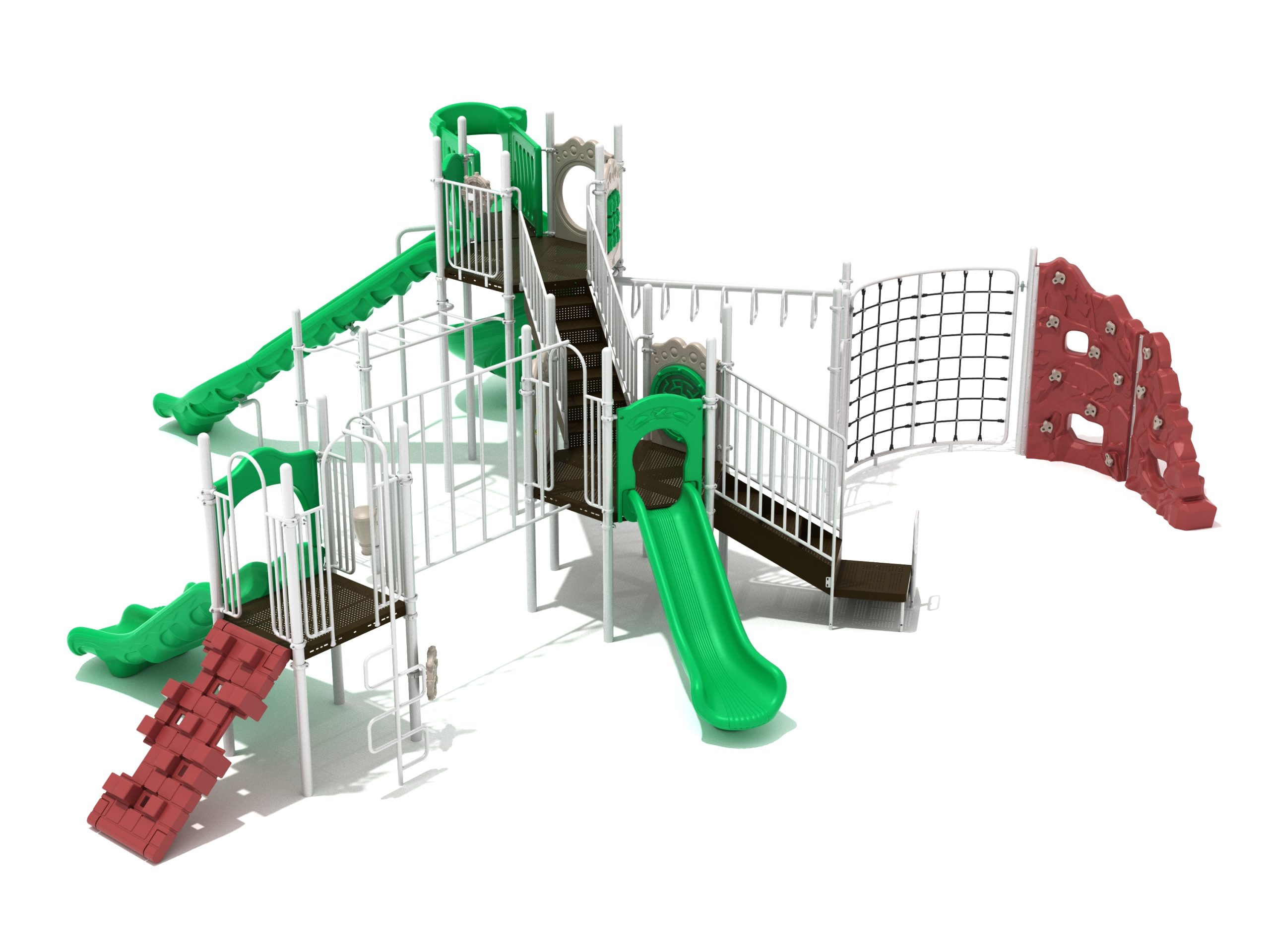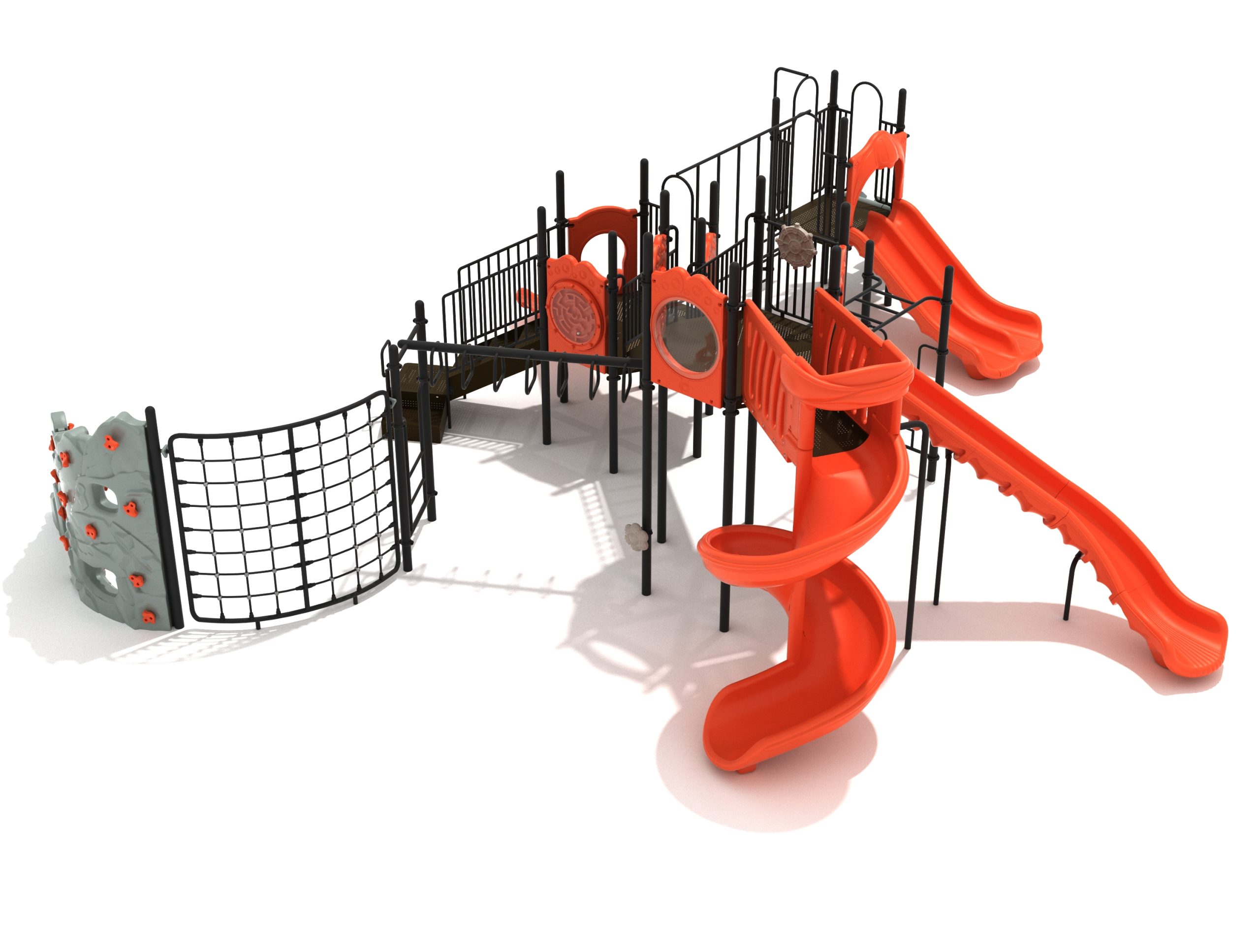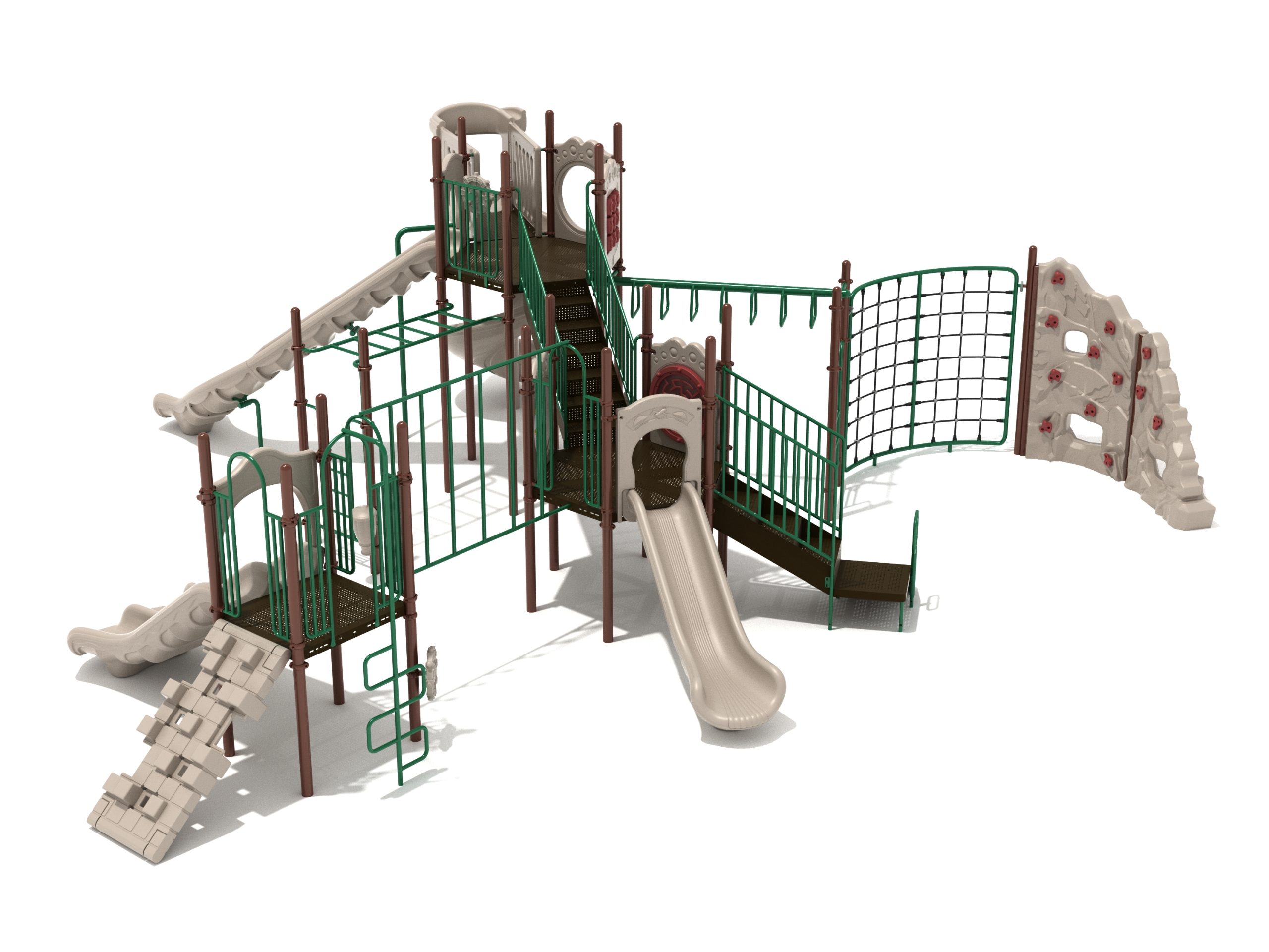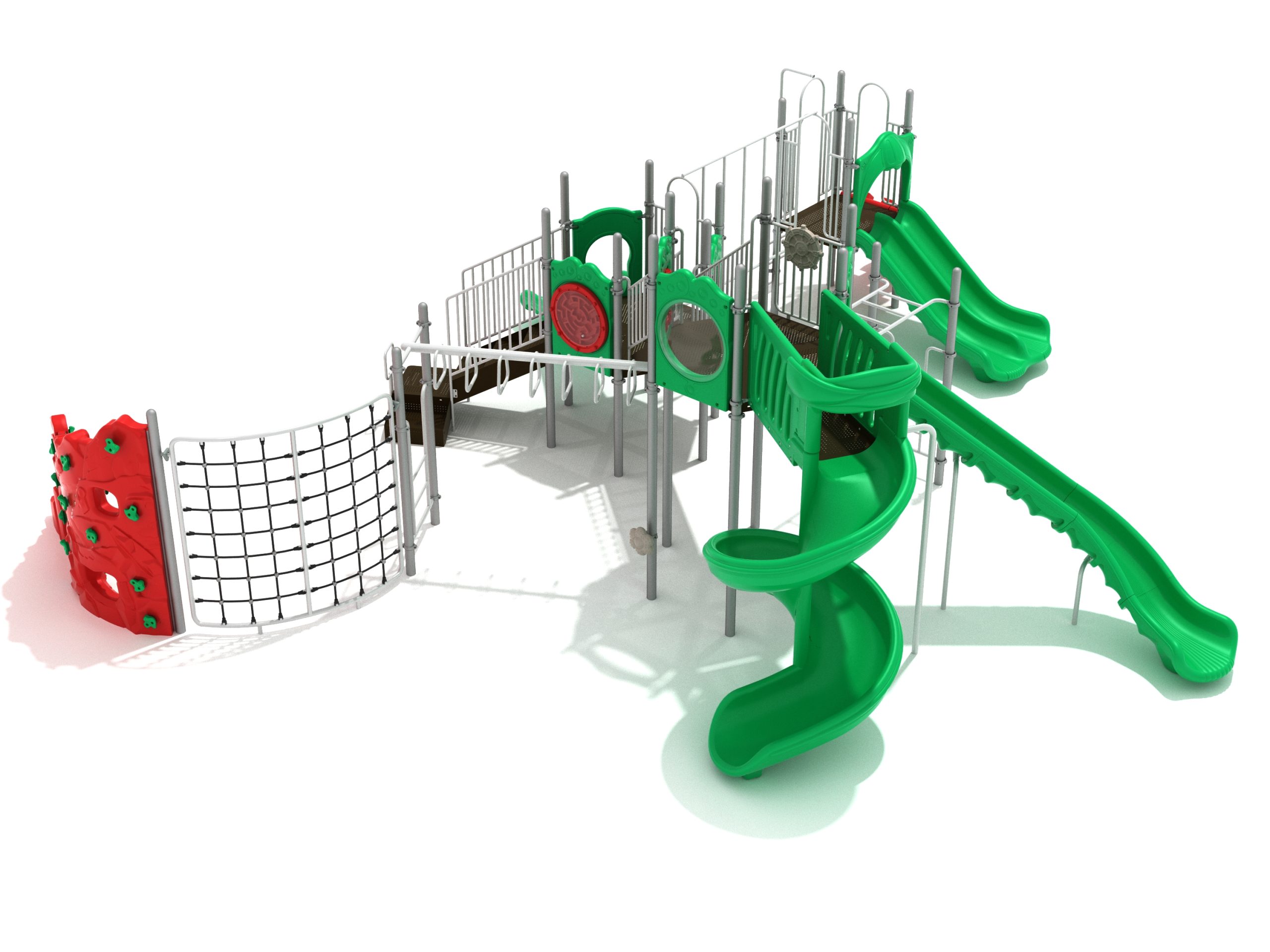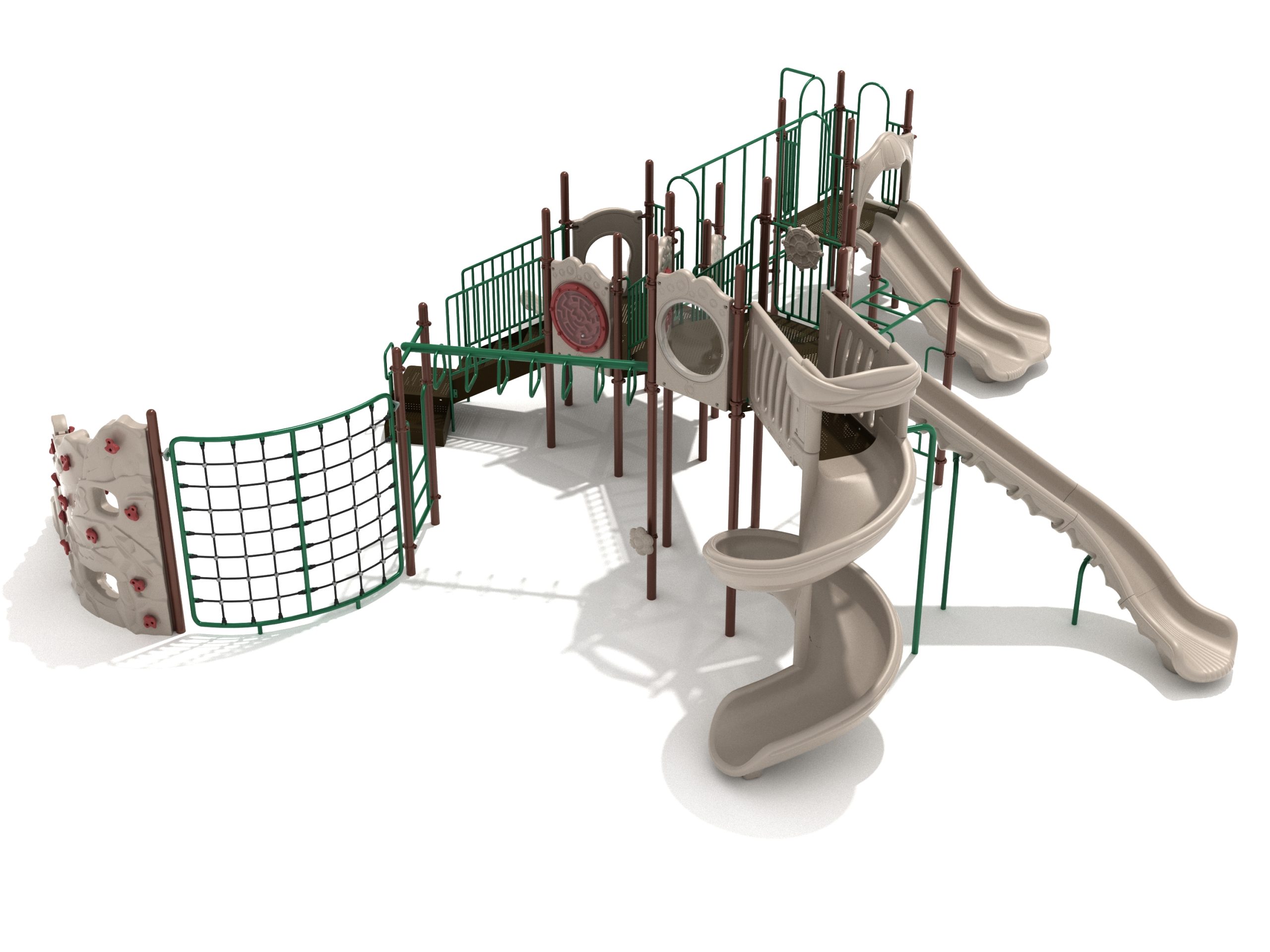 The Oceanside is what you get when you merge a slides hub with an obstacle course. Some obstacles lead to the deck of the Oceanside, while others aren’t connected to a deck but yet develop upper body strength in kids that attempt them. Kids can start with the Craggy Climber that resembles real rock formations, then jump onto the even more challenging Curved Net Climber, and finally swing across the Overhead Straight Trapezoid Loop Ladder, all without touching the ground. Next, they can reward themselves by taking the easy Transfer Station stairway to the deck and trying out all the slides, including the short and fast Straight Slide, the whopping 8-foot tall gently curved Right Turn Slide, and the amazing Spiral Slide. Kids can also attempt the lateral Ladder Bridge and land on the launching point of a short Double Slide. An inclined Pixel Climber and vertical Snake Climber are also there to add to the challenge. You’ll also see a good number of kids busy with the multiple activity panels and mounted toys.