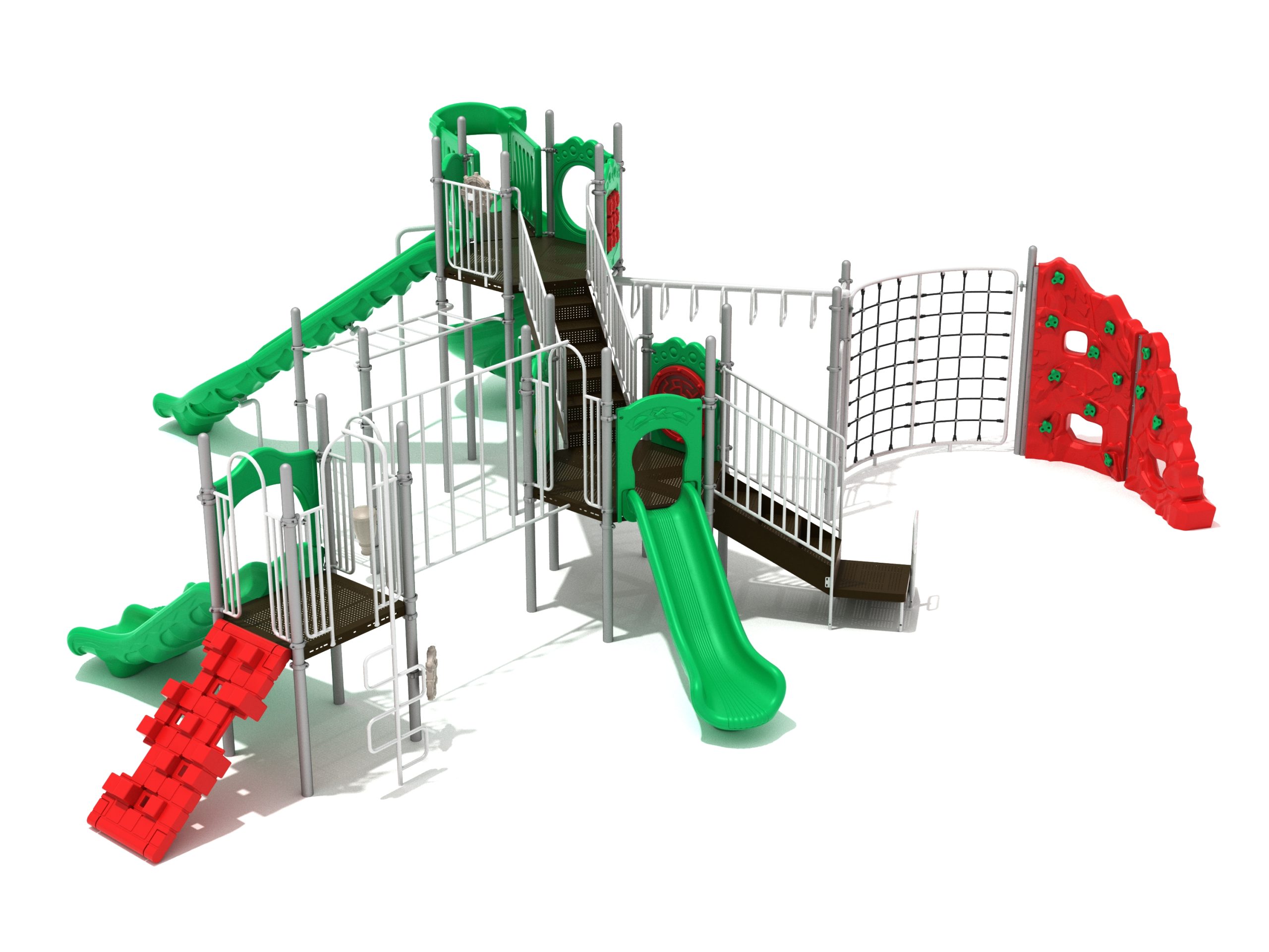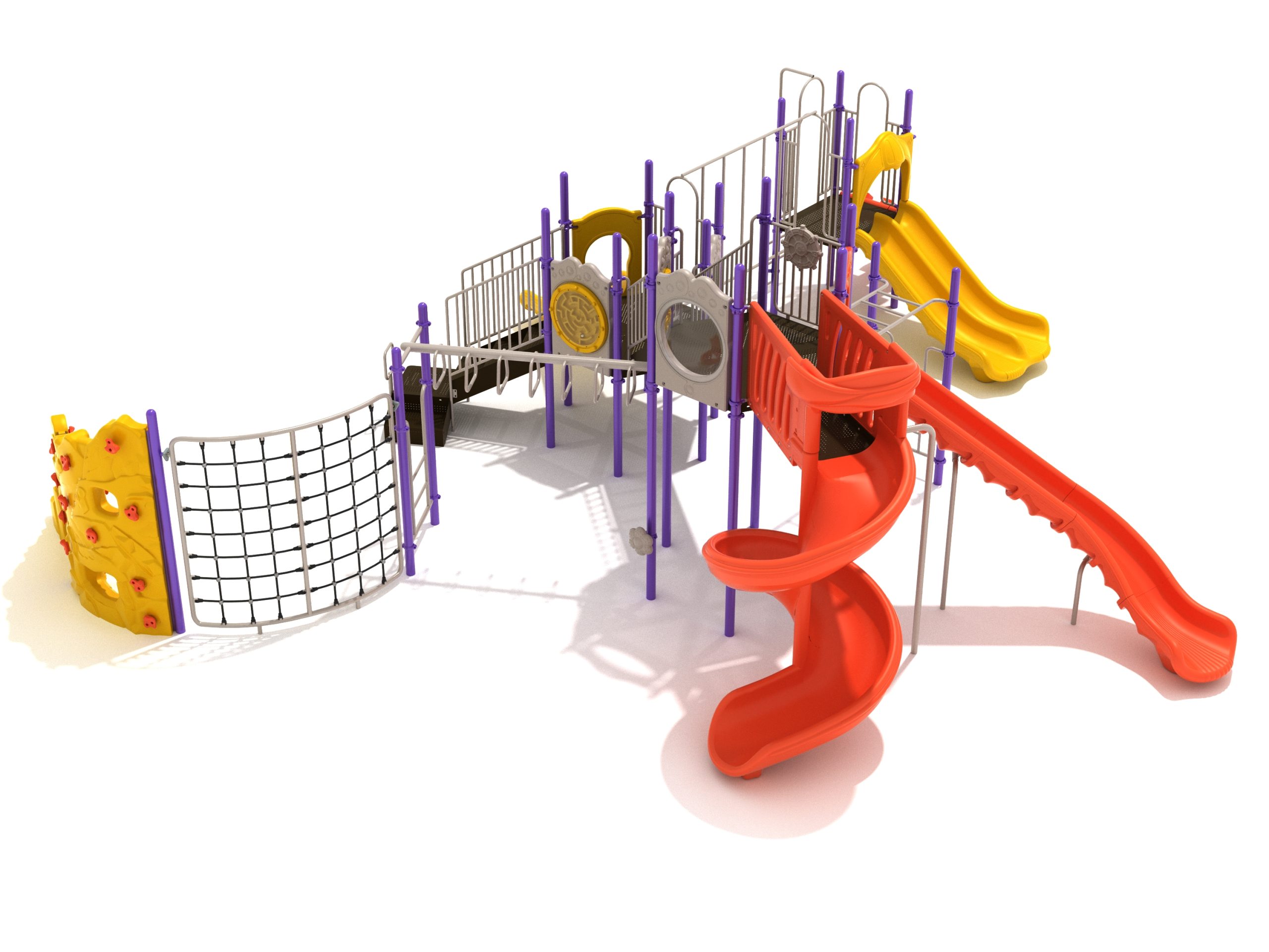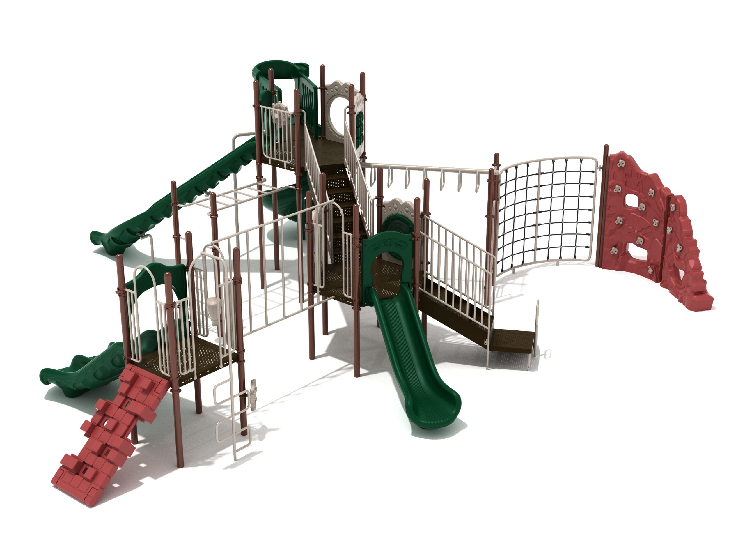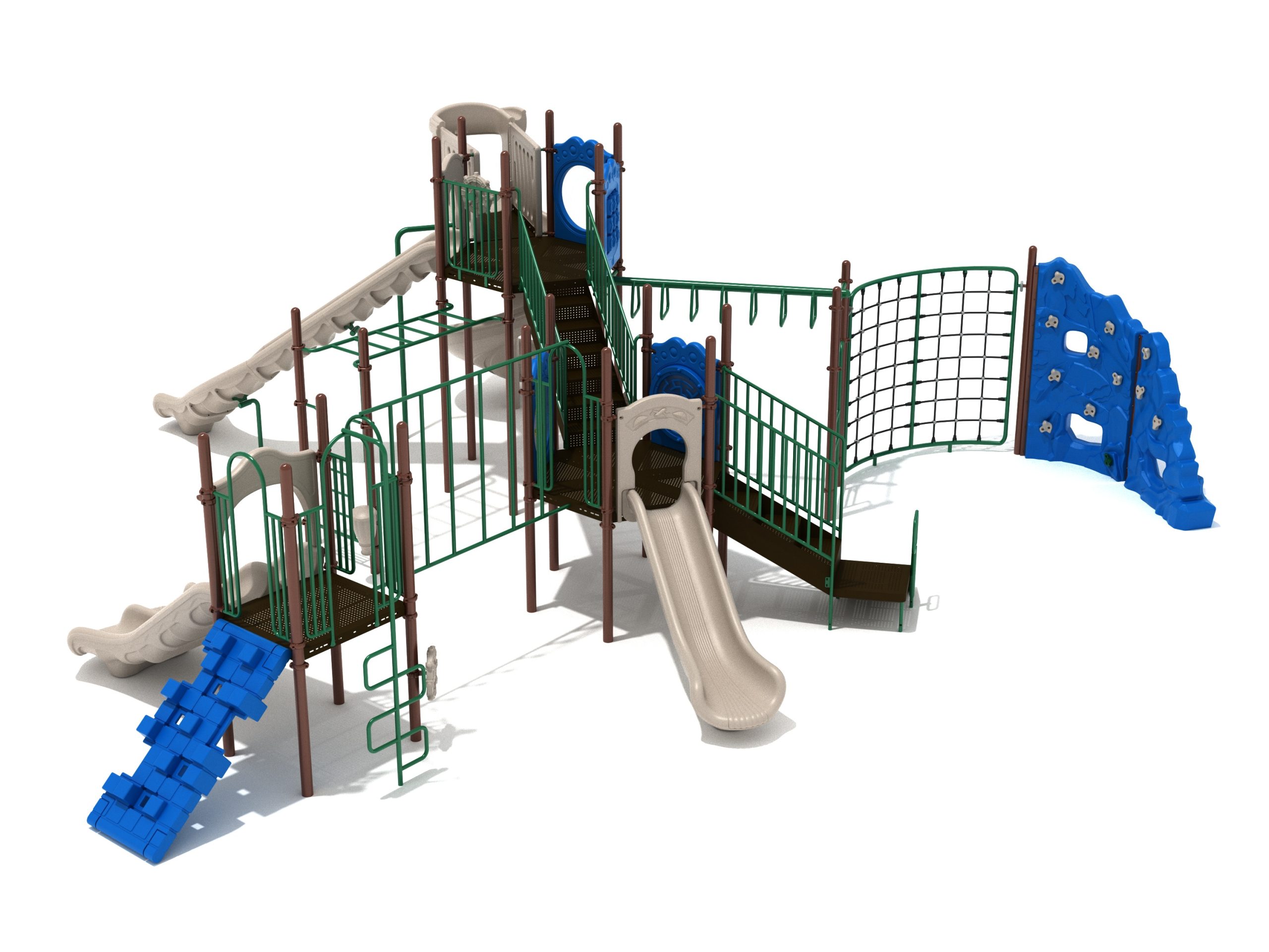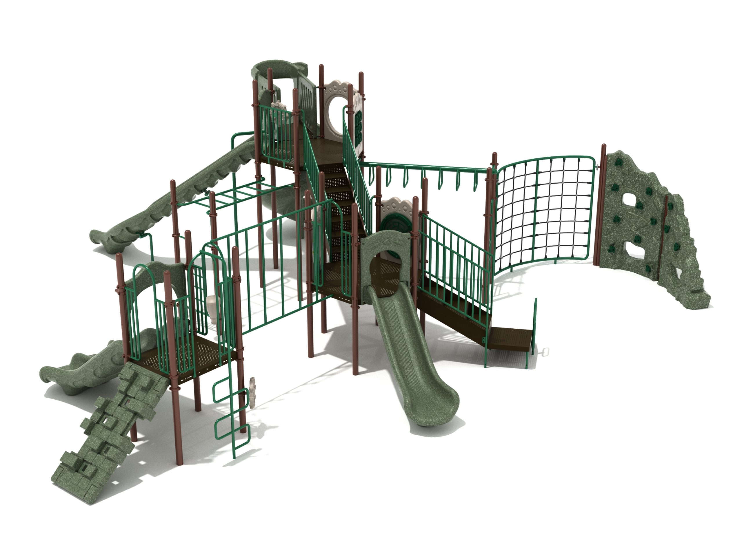 The Oceanside is what you get when you merge a slides hub with an obstacle course. Some obstacles lead to the deck of the Oceanside, while others aren’t connected to a deck but yet develop upper body strength in kids that attempt them. Kids can start with the Craggy Climber that resembles real rock formations, then jump onto the even more challenging Curved Net Climber, and finally swing across the Overhead Straight Trapezoid Loop Ladder, all without touching the ground. Next, they can reward themselves by taking the easy Transfer Station stairway to the deck and trying out all the slides, including the short and fast Straight Slide, the whopping 8-foot tall gently curved Right Turn Slide, and the amazing Spiral Slide. Kids can also attempt the lateral Ladder Bridge and land on the launching point of a short Double Slide. An inclined Pixel Climber and vertical Snake Climber are also there to add to the challenge. You’ll also see a good number of kids busy with the multiple activity panels and mounted toys.