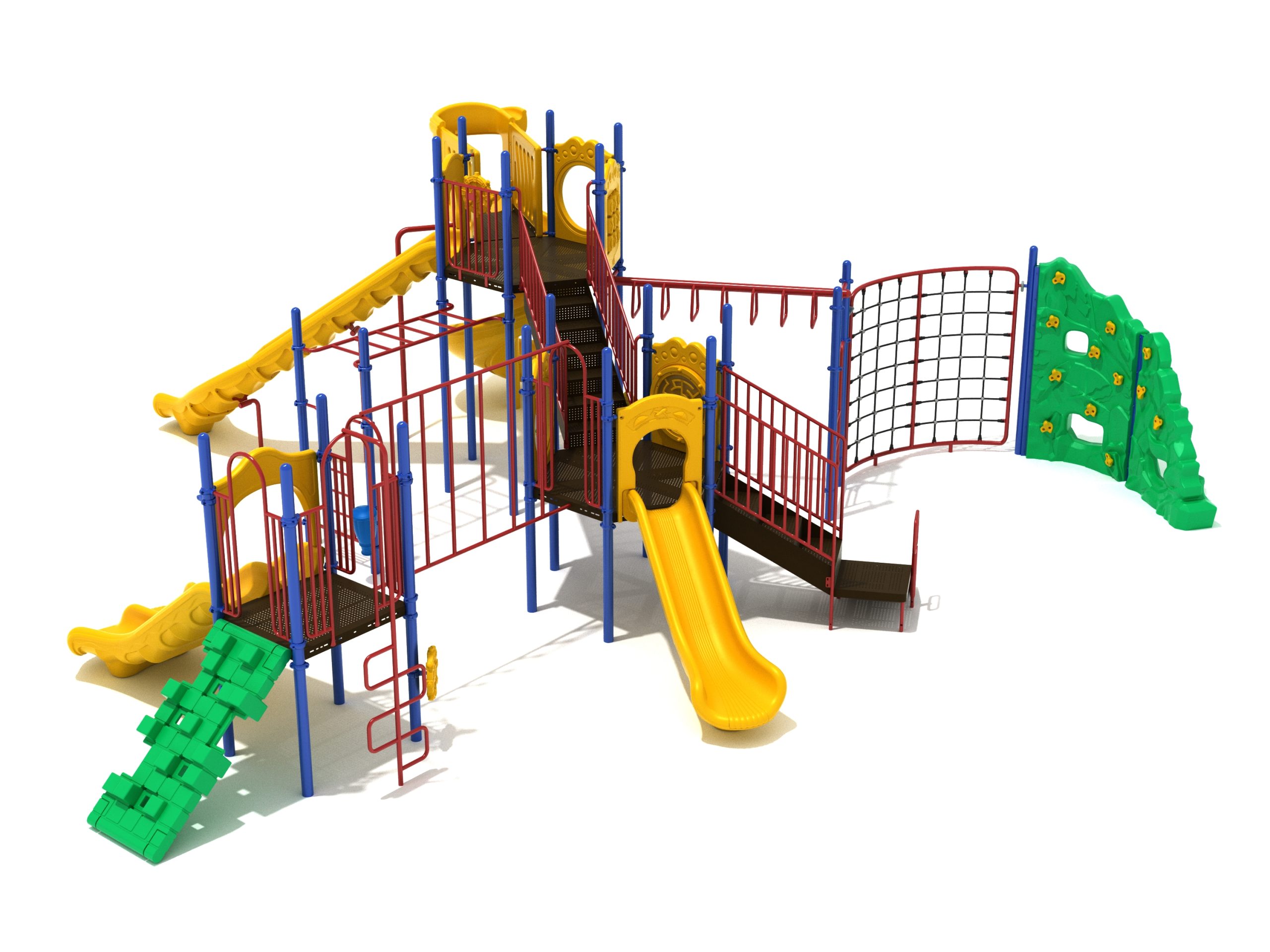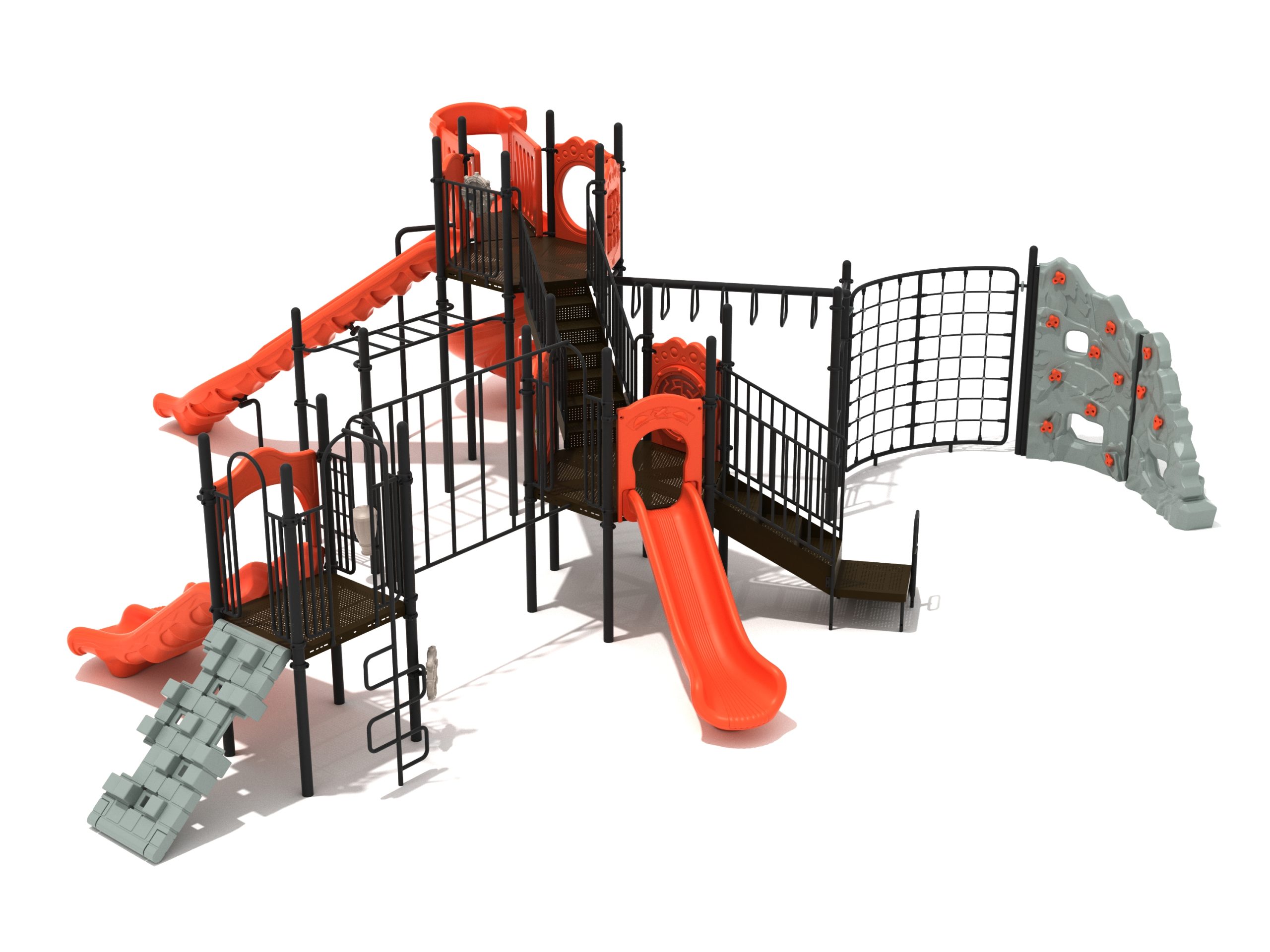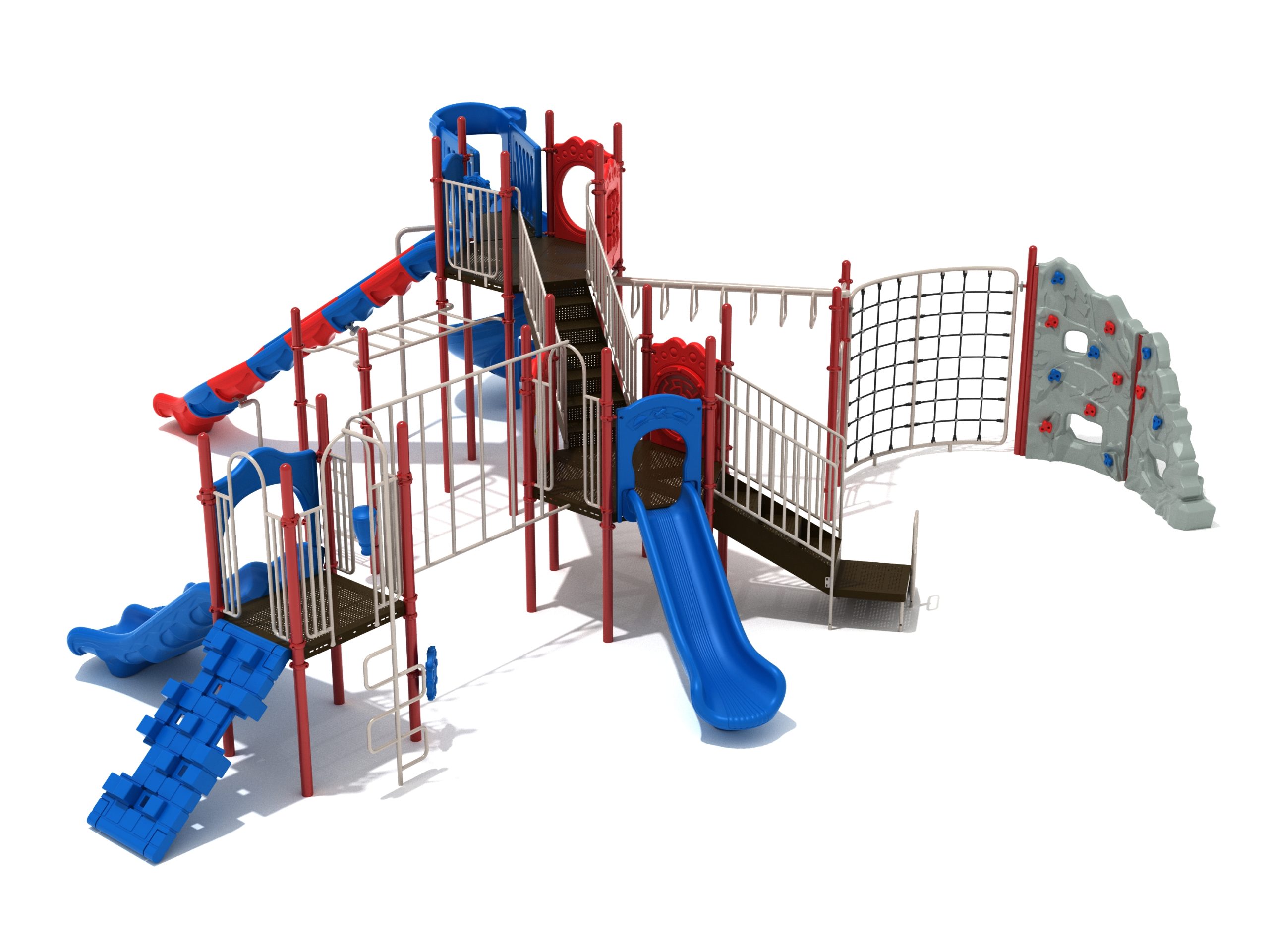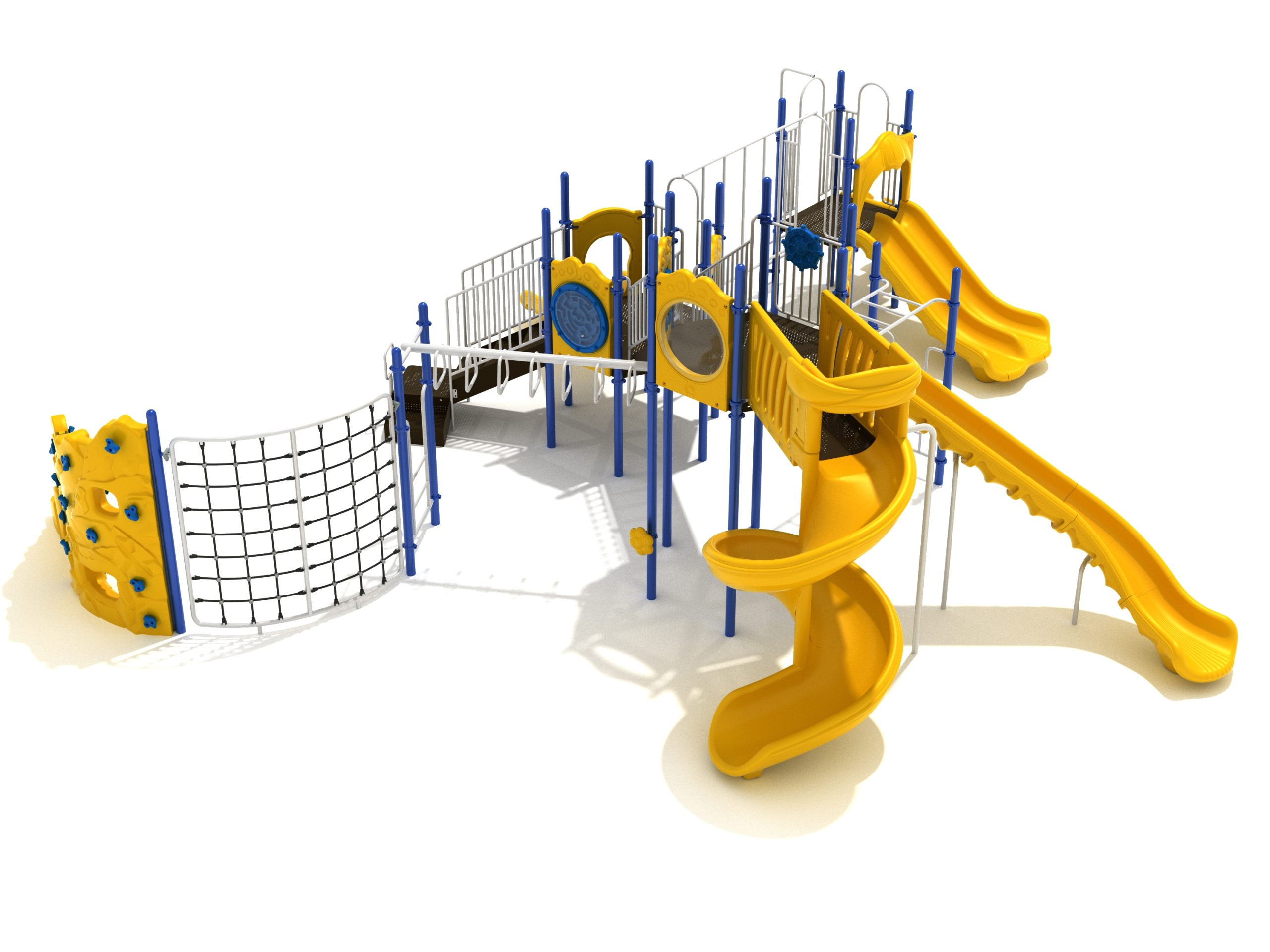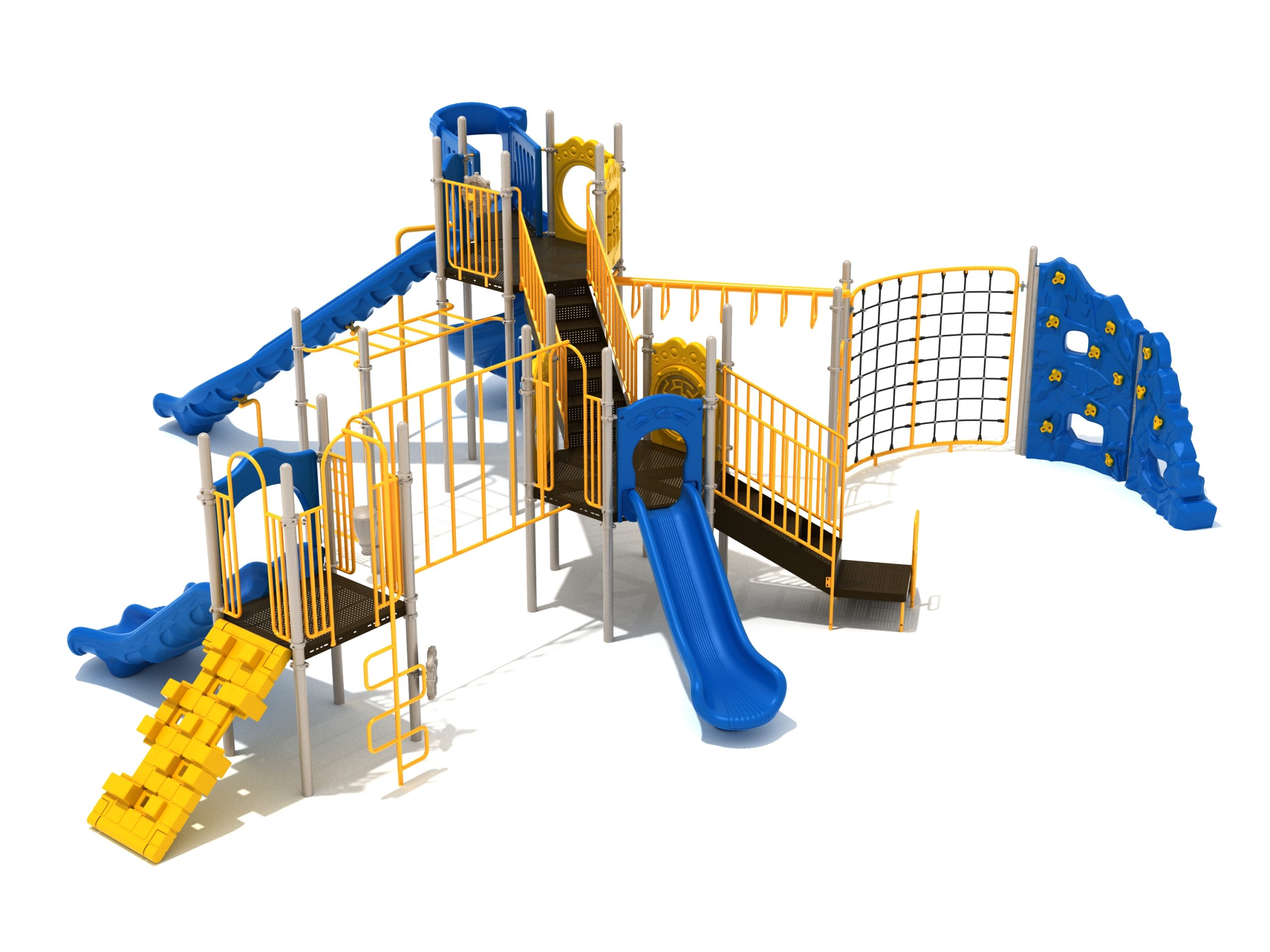 The Oceanside is what you get when you merge a slides hub with an obstacle course. Some obstacles lead to the deck of the Oceanside, while others aren’t connected to a deck but yet develop upper body strength in kids that attempt them. Kids can start with the Craggy Climber that resembles real rock formations, then jump onto the even more challenging Curved Net Climber, and finally swing across the Overhead Straight Trapezoid Loop Ladder, all without touching the ground. Next, they can reward themselves by taking the easy Transfer Station stairway to the deck and trying out all the slides, including the short and fast Straight Slide, the whopping 8-foot tall gently curved Right Turn Slide, and the amazing Spiral Slide. Kids can also attempt the lateral Ladder Bridge and land on the launching point of a short Double Slide. An inclined Pixel Climber and vertical Snake Climber are also there to add to the challenge. You’ll also see a good number of kids busy with the multiple activity panels and mounted toys.