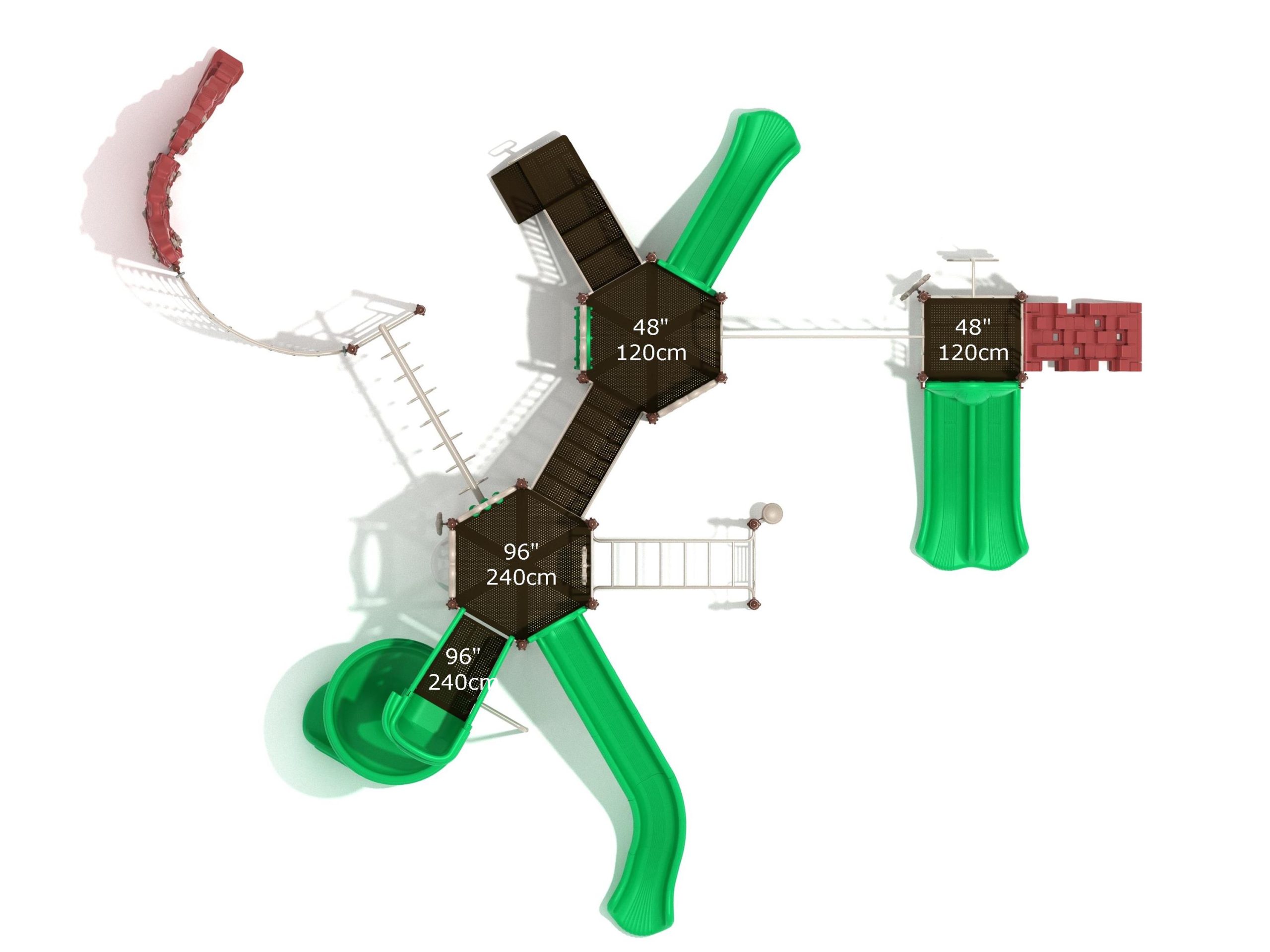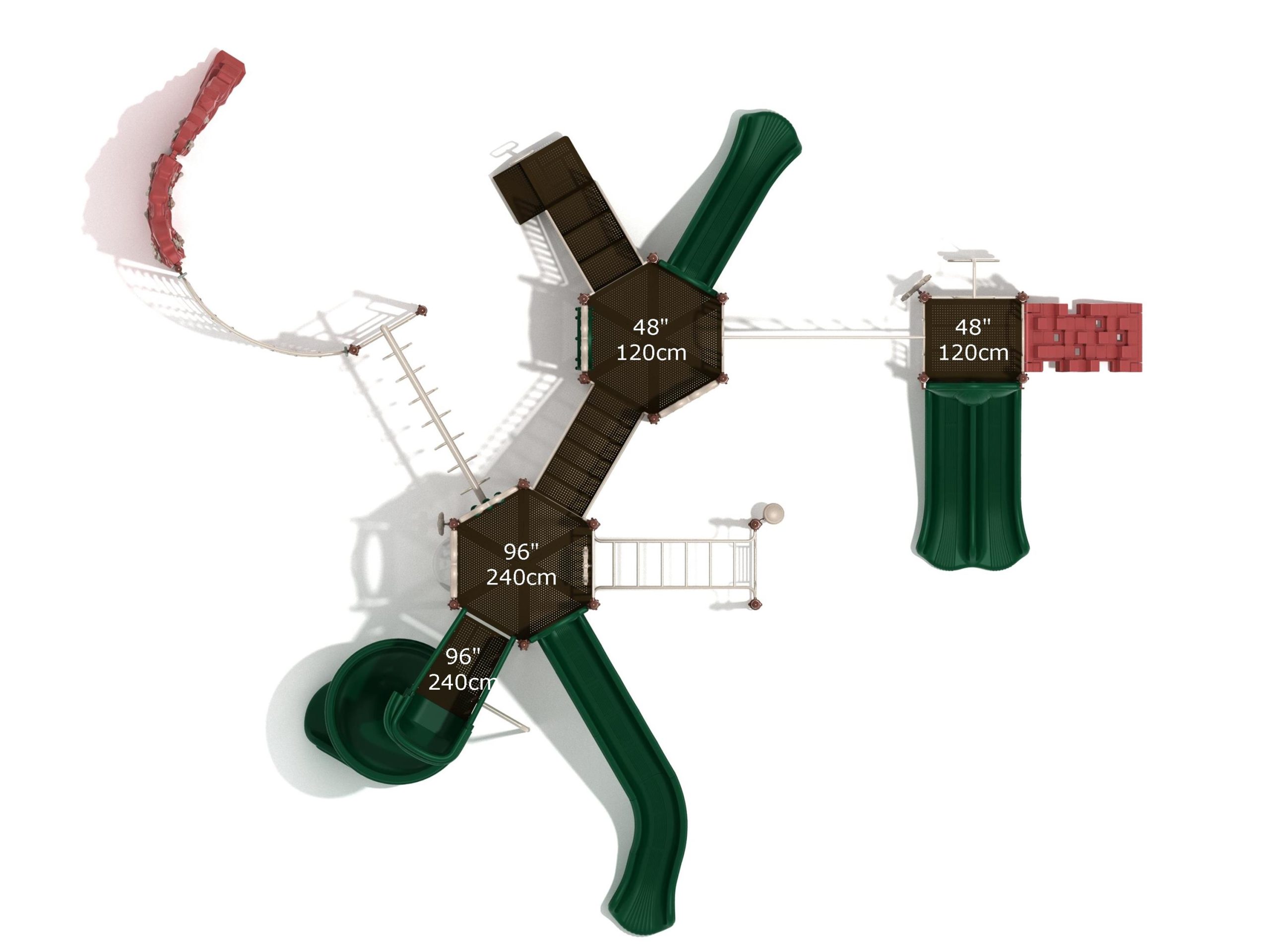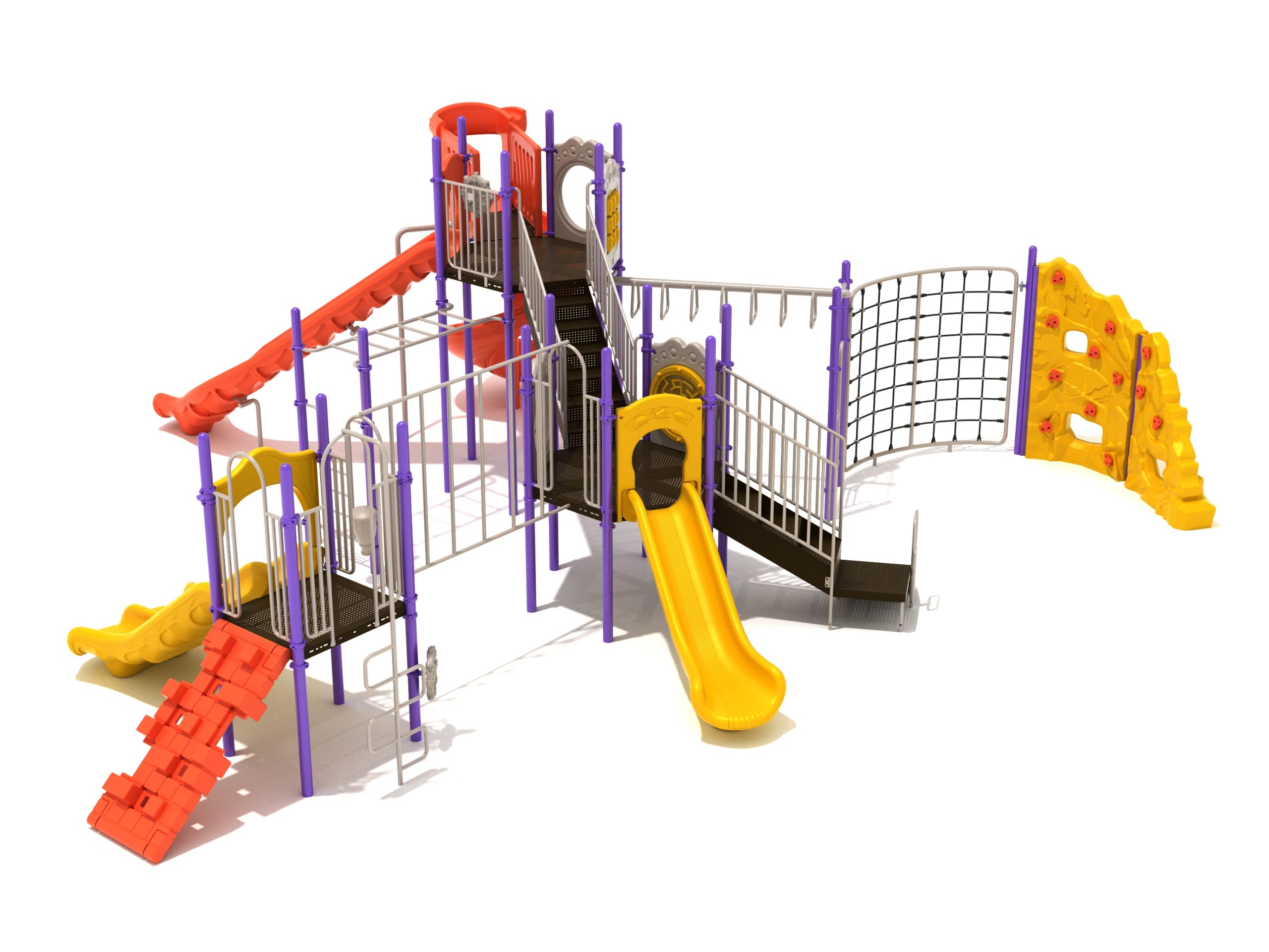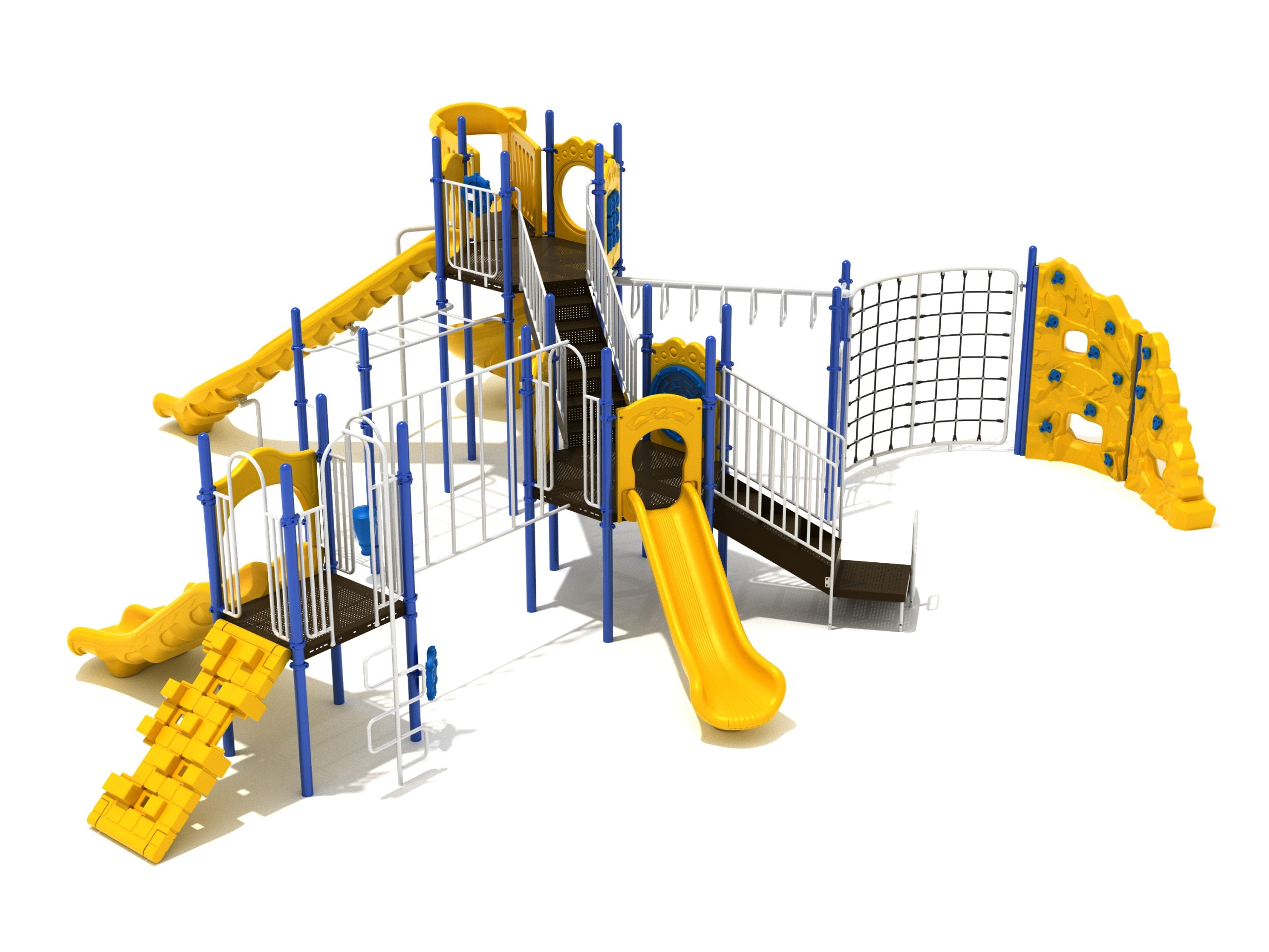 The Oceanside is what you get when you merge a slides hub with an obstacle course. Some obstacles lead to the deck of the Oceanside, while others aren’t connected to a deck but yet develop upper body strength in kids that attempt them. Kids can start with the Craggy Climber that resembles real rock formations, then jump onto the even more challenging Curved Net Climber, and finally swing across the Overhead Straight Trapezoid Loop Ladder, all without touching the ground. Next, they can reward themselves by taking the easy Transfer Station stairway to the deck and trying out all the slides, including the short and fast Straight Slide, the whopping 8-foot tall gently curved Right Turn Slide, and the amazing Spiral Slide. Kids can also attempt the lateral Ladder Bridge and land on the launching point of a short Double Slide. An inclined Pixel Climber and vertical Snake Climber are also there to add to the challenge. You’ll also see a good number of kids busy with the multiple activity panels and mounted toys.