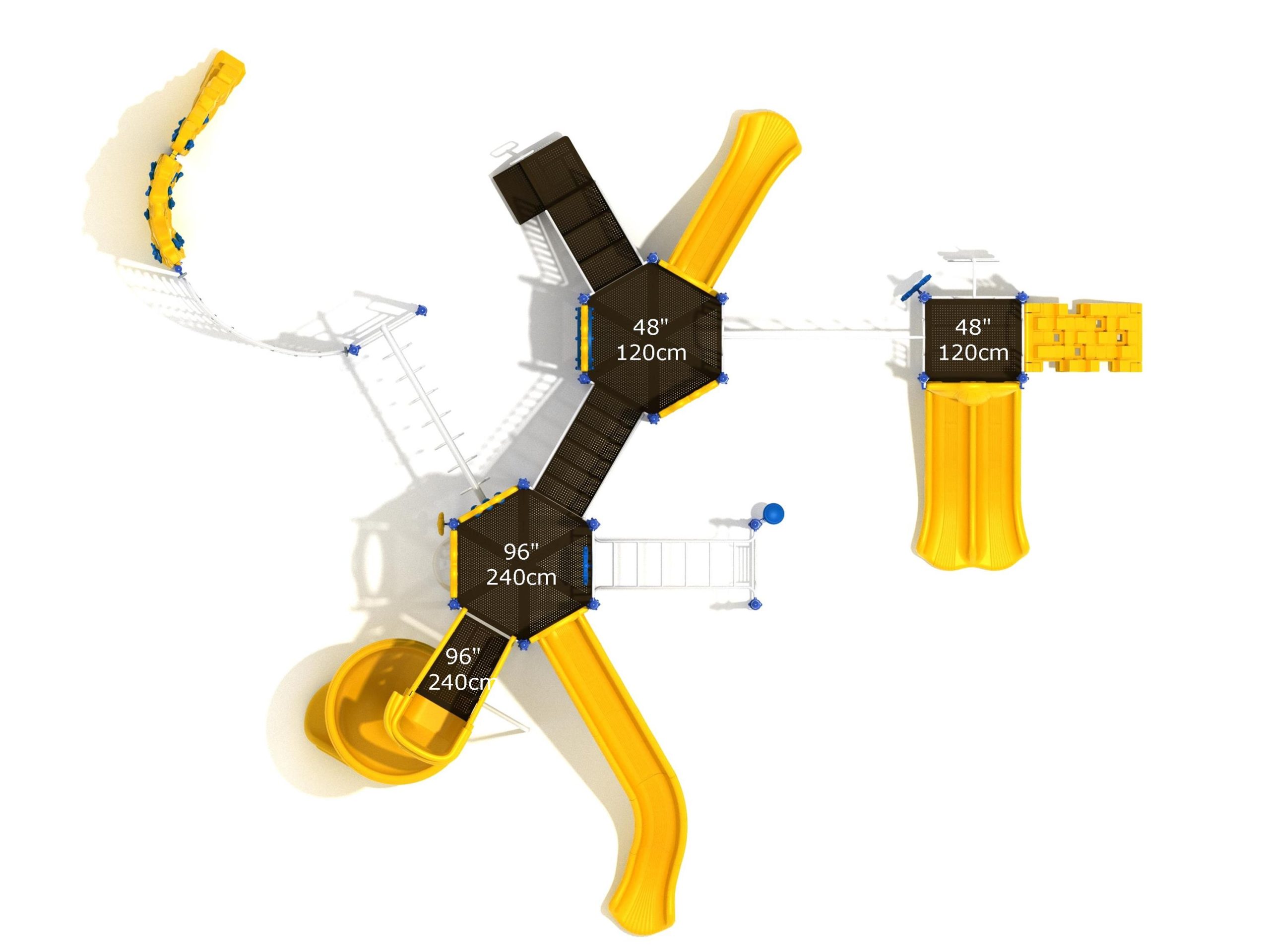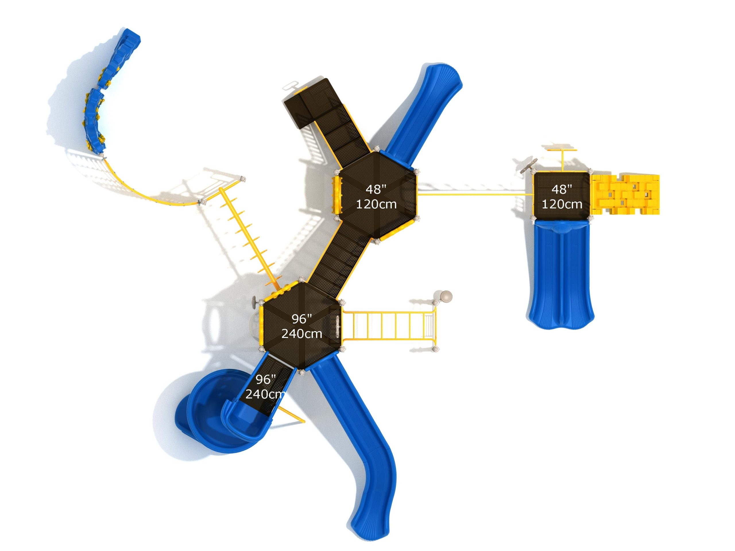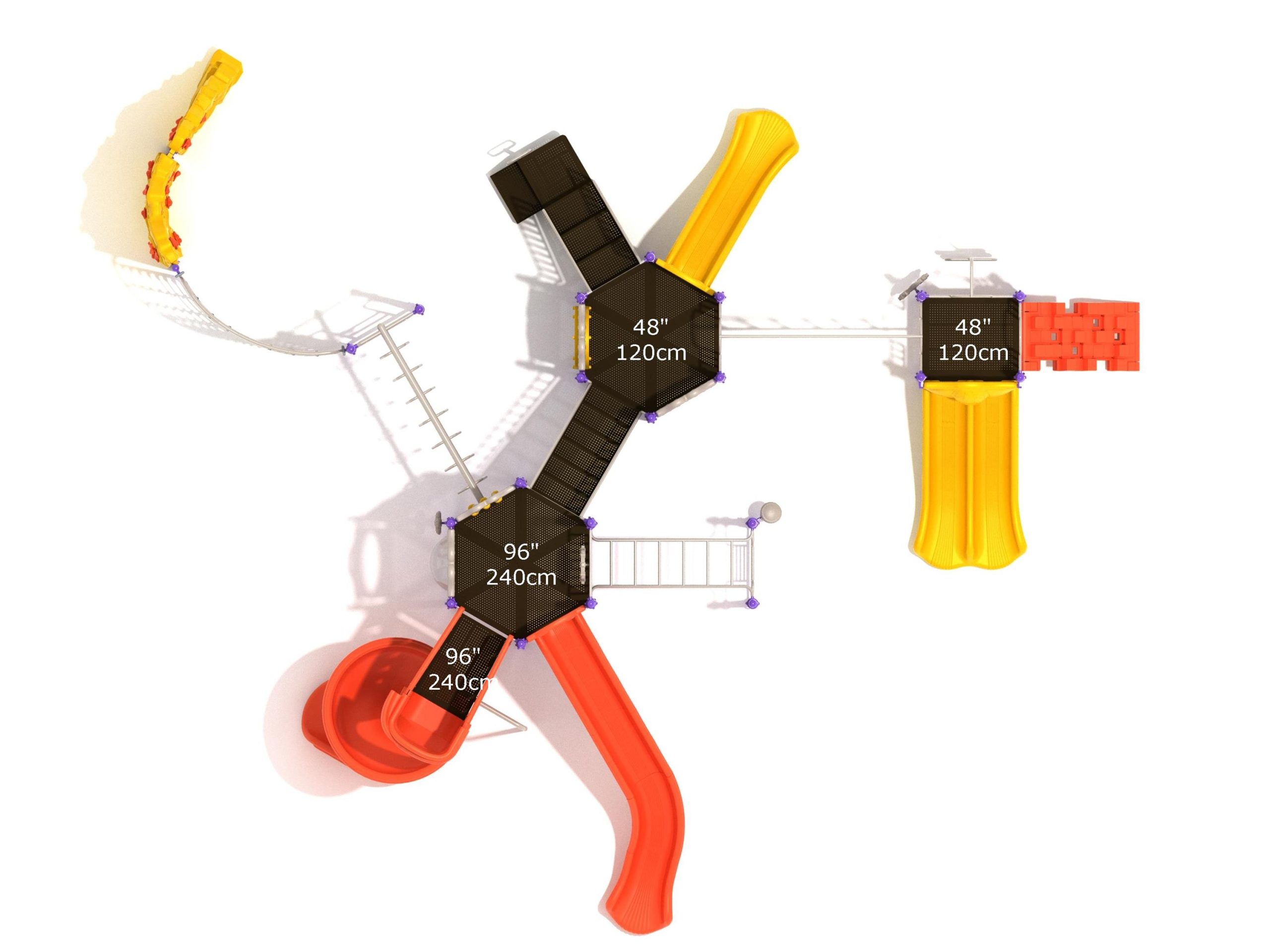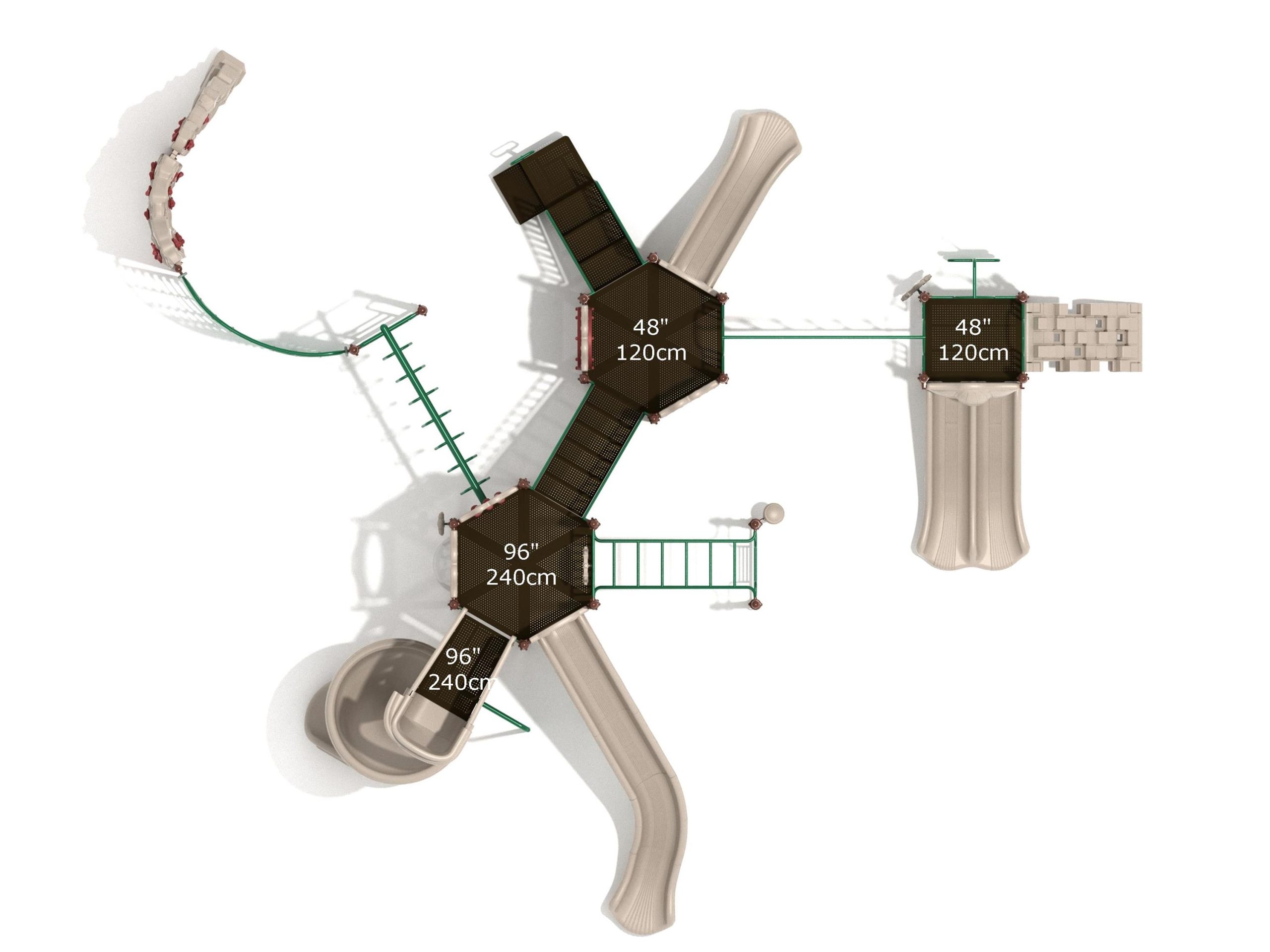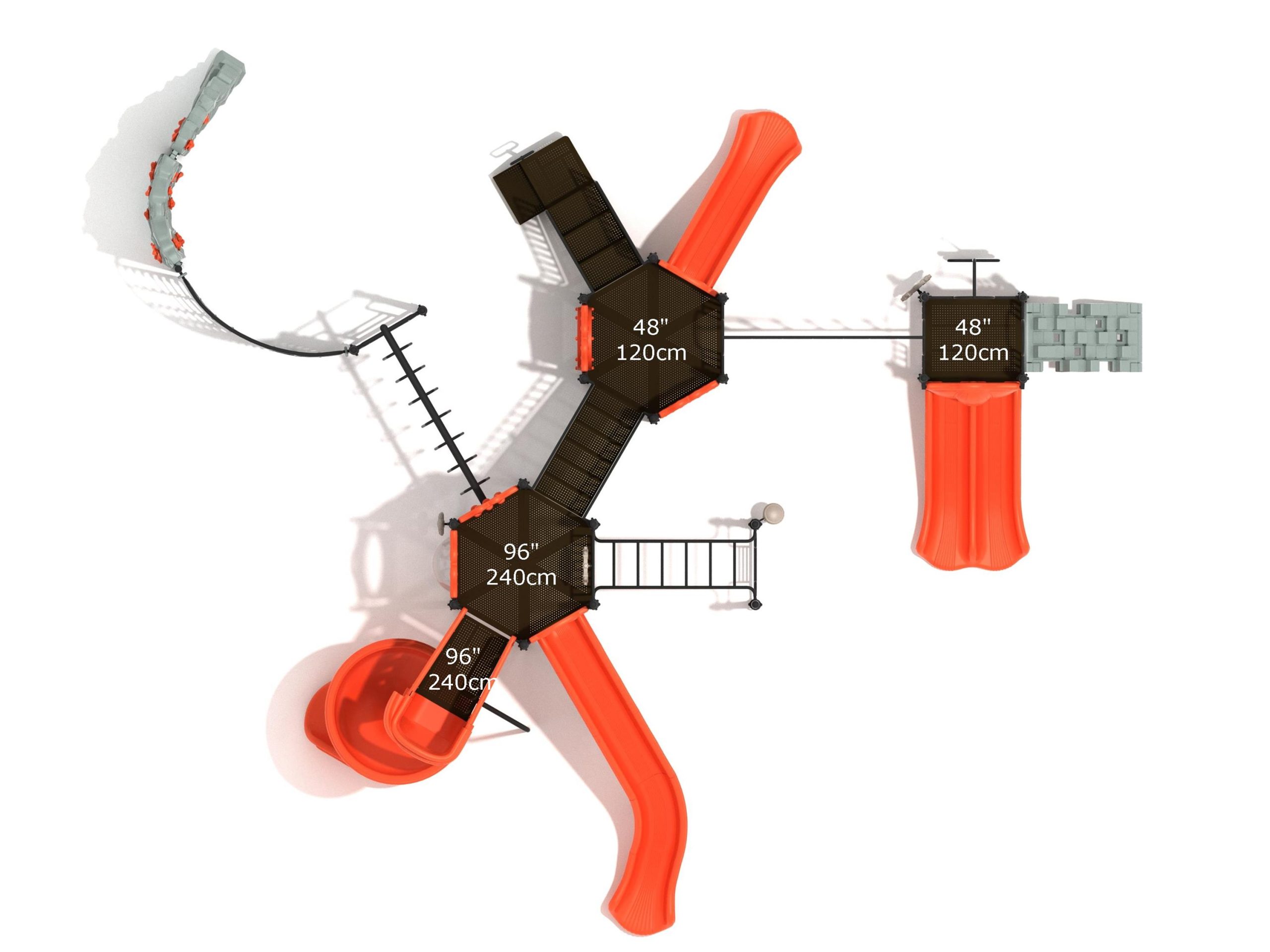 The Oceanside is what you get when you merge a slides hub with an obstacle course. Some obstacles lead to the deck of the Oceanside, while others aren’t connected to a deck but yet develop upper body strength in kids that attempt them. Kids can start with the Craggy Climber that resembles real rock formations, then jump onto the even more challenging Curved Net Climber, and finally swing across the Overhead Straight Trapezoid Loop Ladder, all without touching the ground. Next, they can reward themselves by taking the easy Transfer Station stairway to the deck and trying out all the slides, including the short and fast Straight Slide, the whopping 8-foot tall gently curved Right Turn Slide, and the amazing Spiral Slide. Kids can also attempt the lateral Ladder Bridge and land on the launching point of a short Double Slide. An inclined Pixel Climber and vertical Snake Climber are also there to add to the challenge. You’ll also see a good number of kids busy with the multiple activity panels and mounted toys.