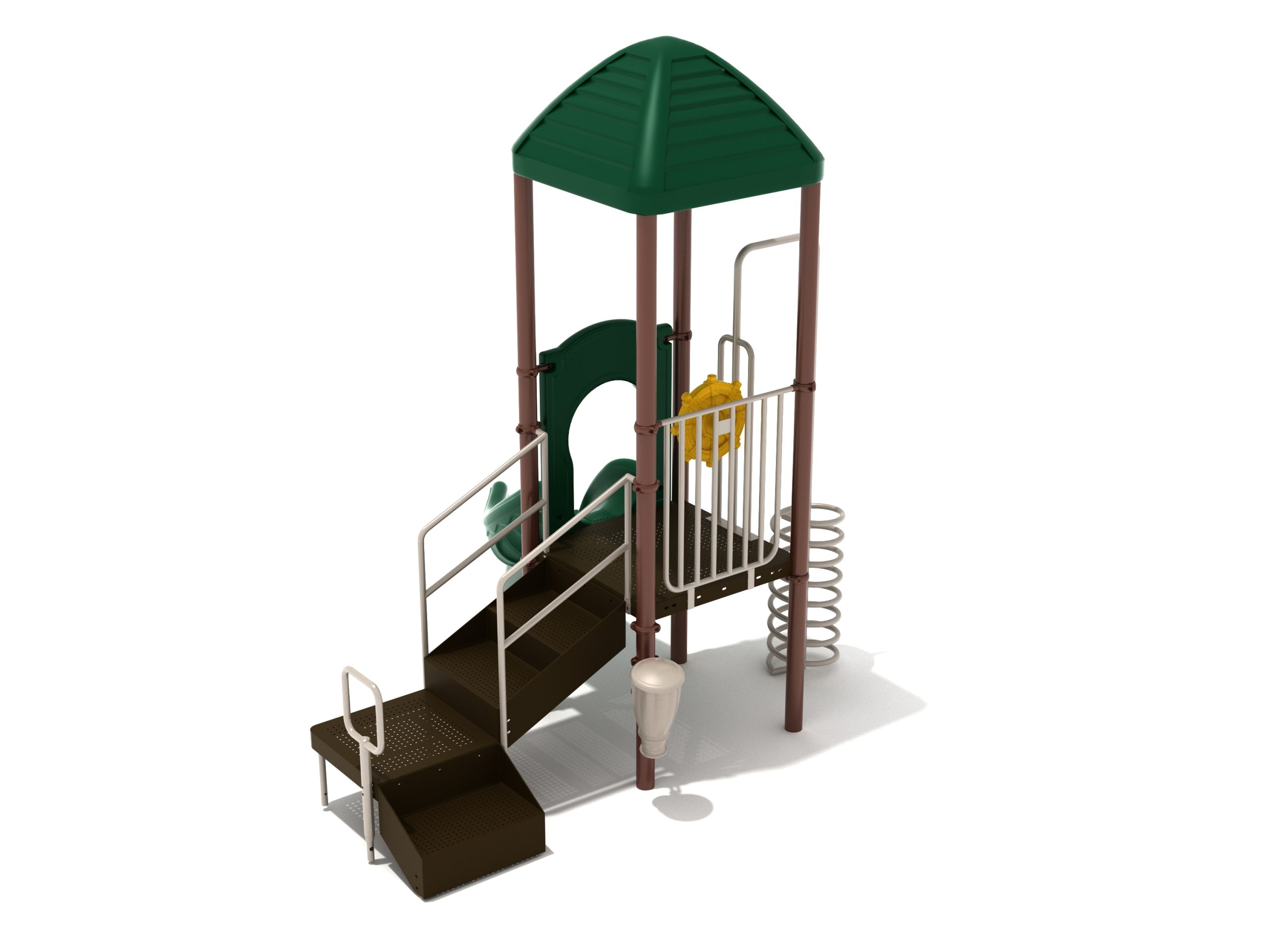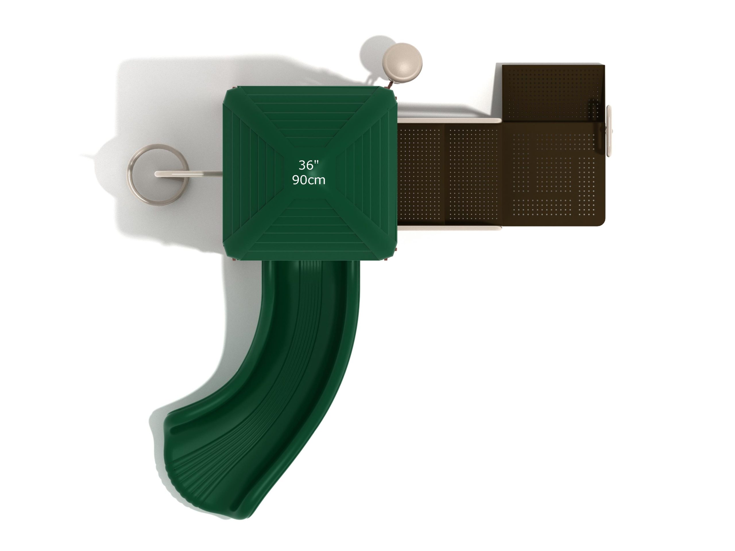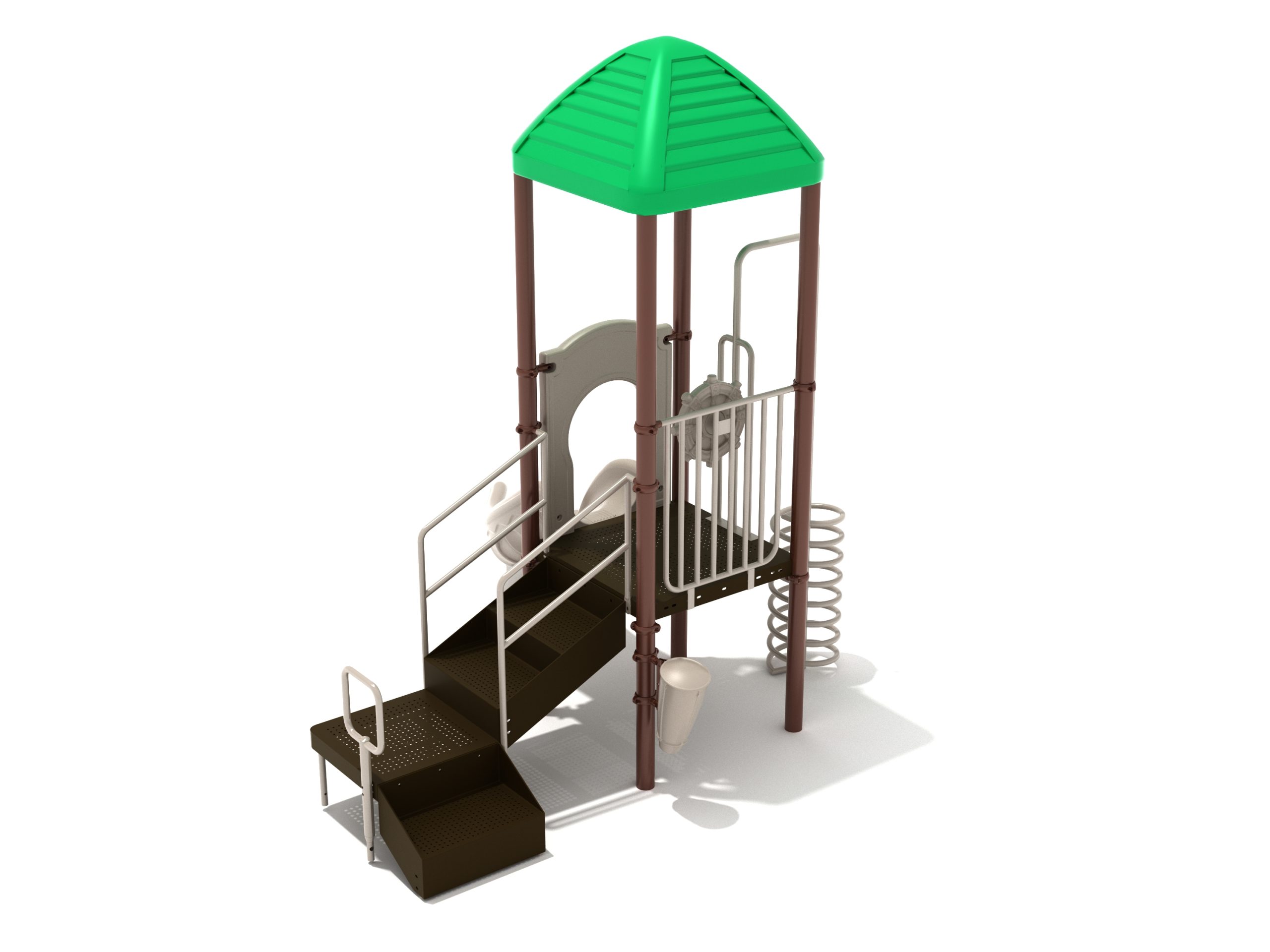 Pawtucket is a cute compact hub designed with the littlest adventurers in mind! The heart of the Pawtucket is a sturdy 3-foot square deck crowned with a ridge-shaped roof. There is something fun on all four sides of this play structure to entertain the maximum number of kids at once. To get to the top, kids can either use the simpler Transfer Station stairway or the challenging Spiral Climber if they’re feeling adventurous. The vertical, twisty climb of the Spiral Climber is sure to get their little legs moving and their energy flowing. At the top of the tower, they’ll find the Right Turn Slide, which offers a smooth and speedy ride back to the ground. It’s the kind of slide that invites repeat trips up and down. Kids waiting for their turn to slide can keep themselves busy with the Ship Wheel and pretend they’re steering a mighty ship. A single drum mounted beside the staircase can also keep children busy in case queues form.