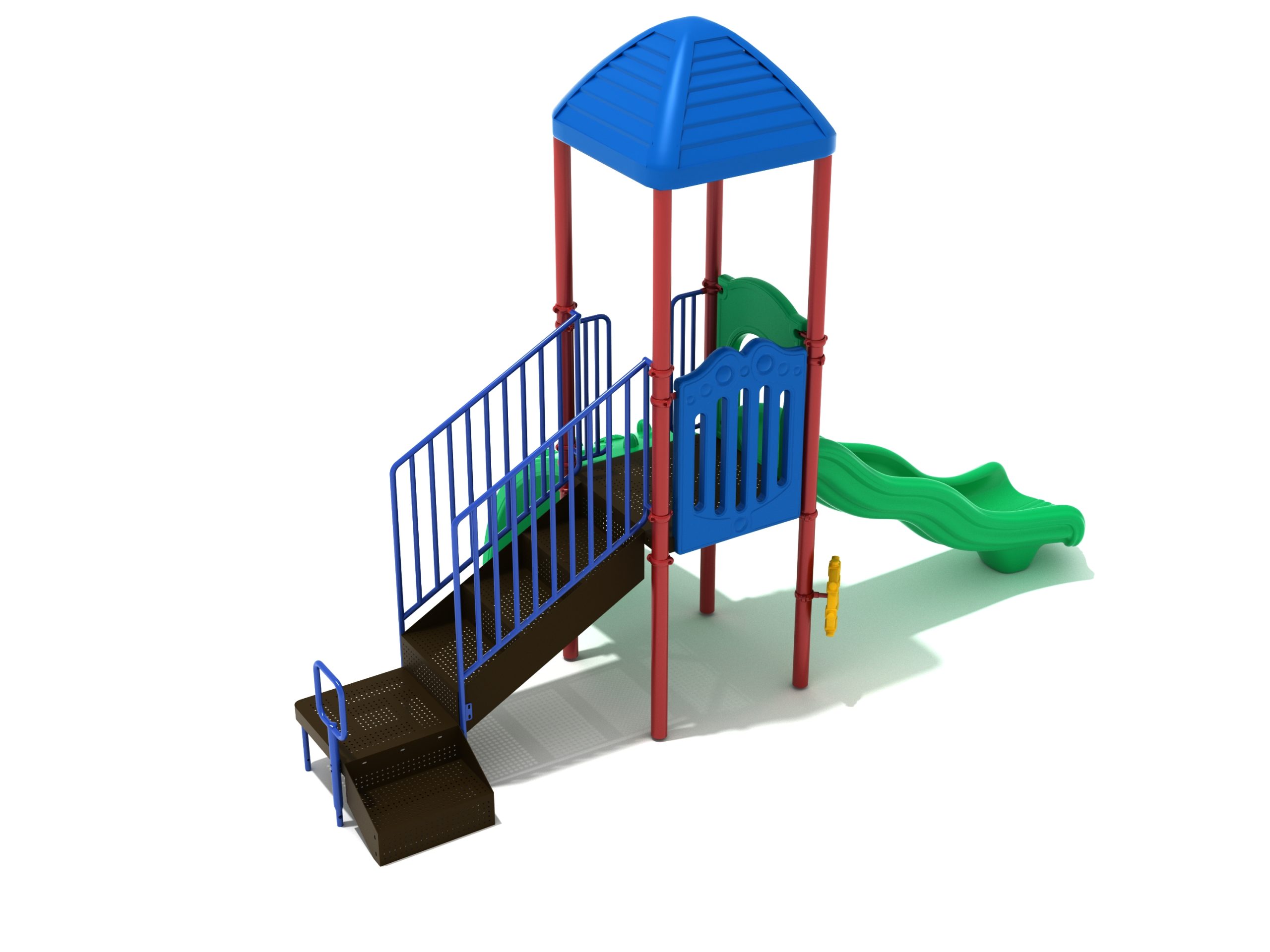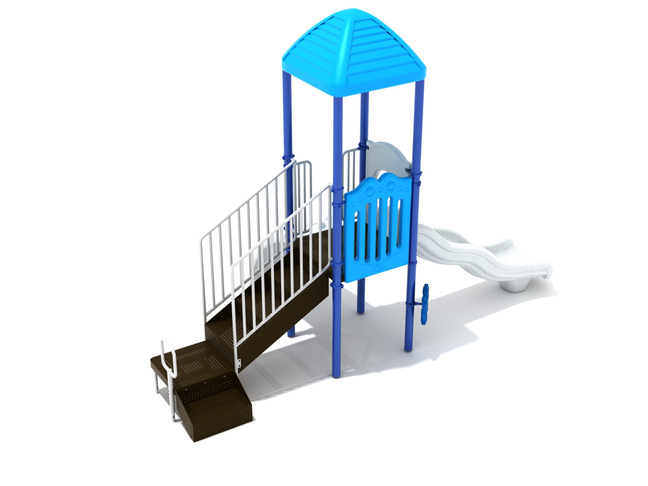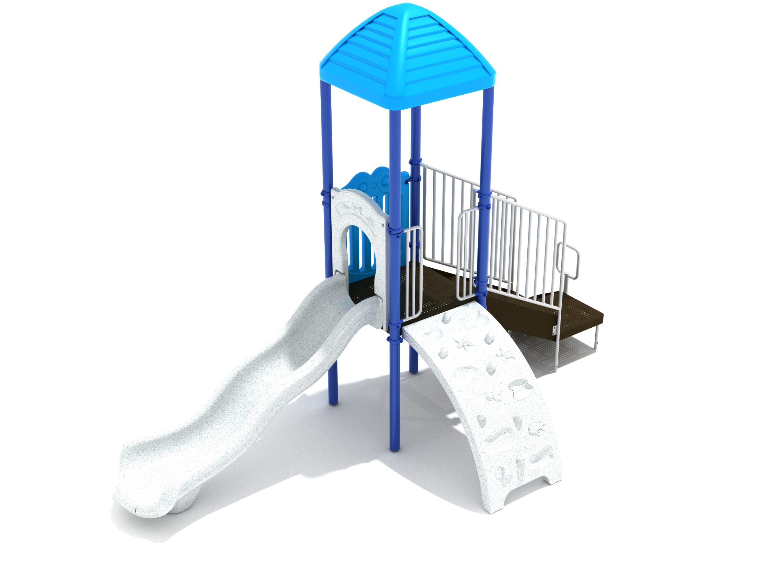 Plymouth is a simple play structure equipped with all of the basic features that kids love. Its most exciting component is the four foot wave slide which comes down from its highest deck. This slide has a wavy shape that makes it particularly exciting every tie the child uses it. To reach the slide, children can scale the Sea Creature Climber. This exciting and decorative climbing piece is molded with three dimensional crabs, starfish, and other ocean animals, which kids can use as hand grips as they make their way up. There is also a set of transfer station stairs which is easily accessible, even to children with physical disabilities. There is even a Ship’s Wheel at the base of the structure which kids can use to fuel imaginary adventures at sea. The whole structure is capped off with a square roof piece.