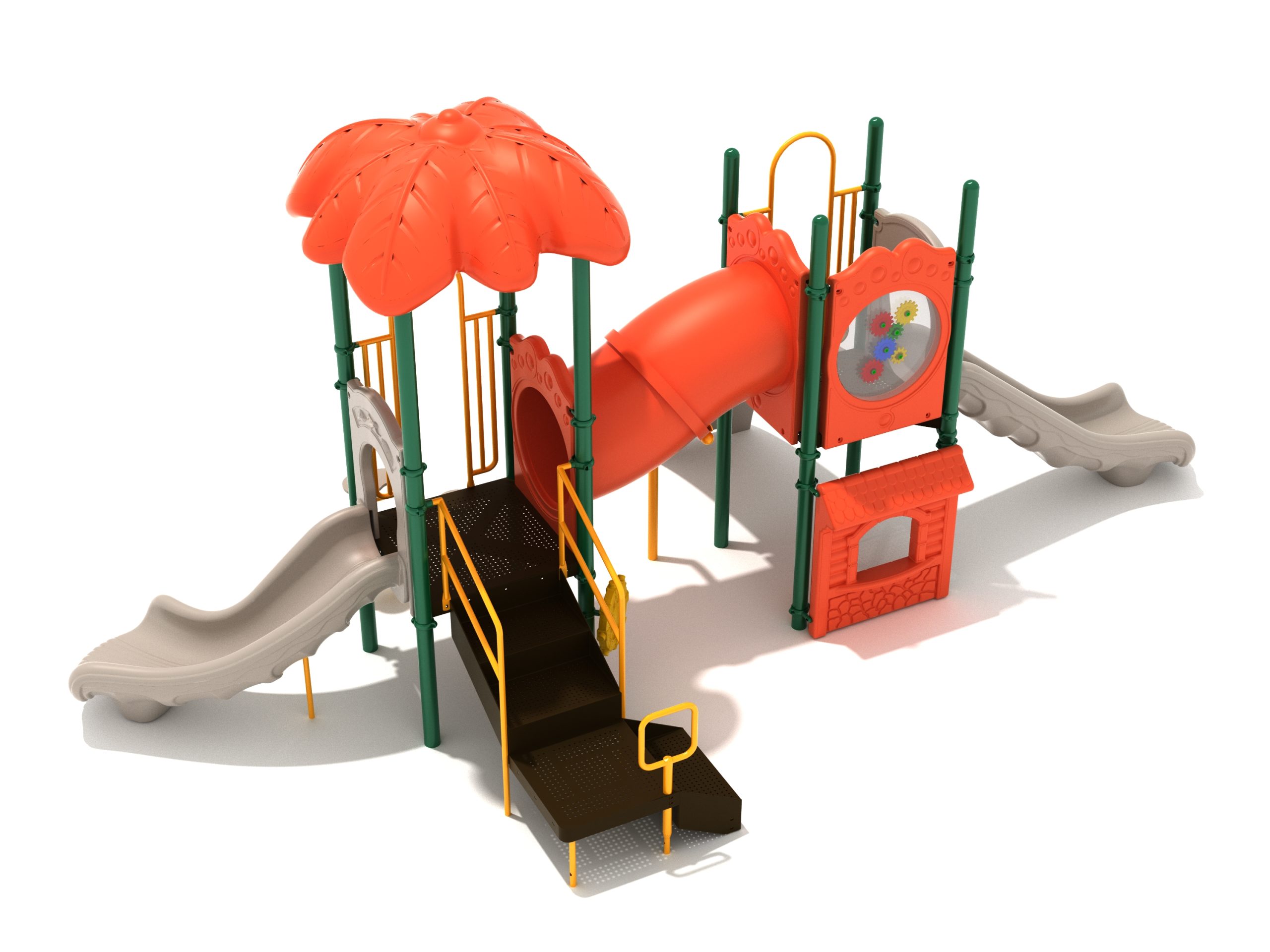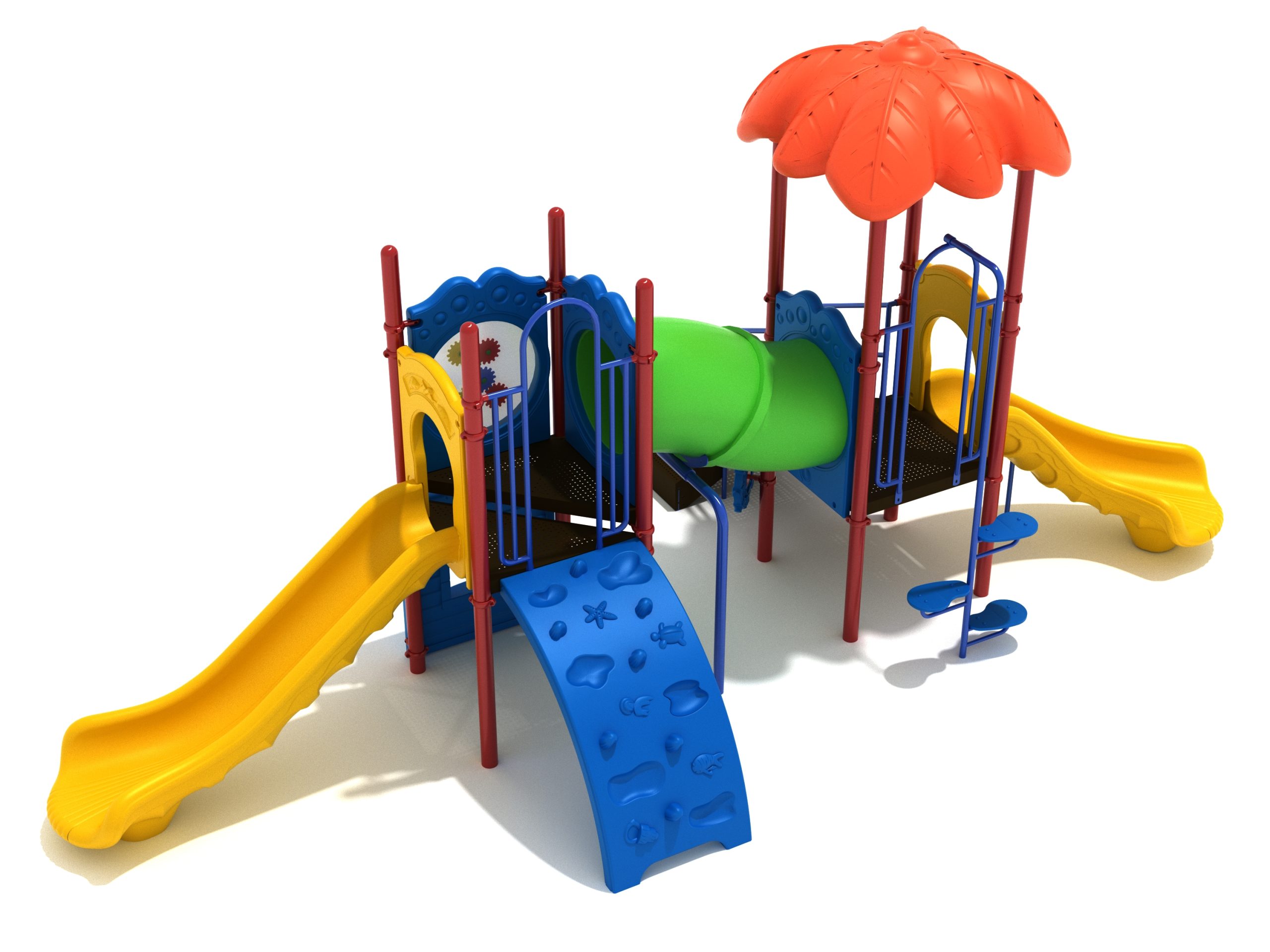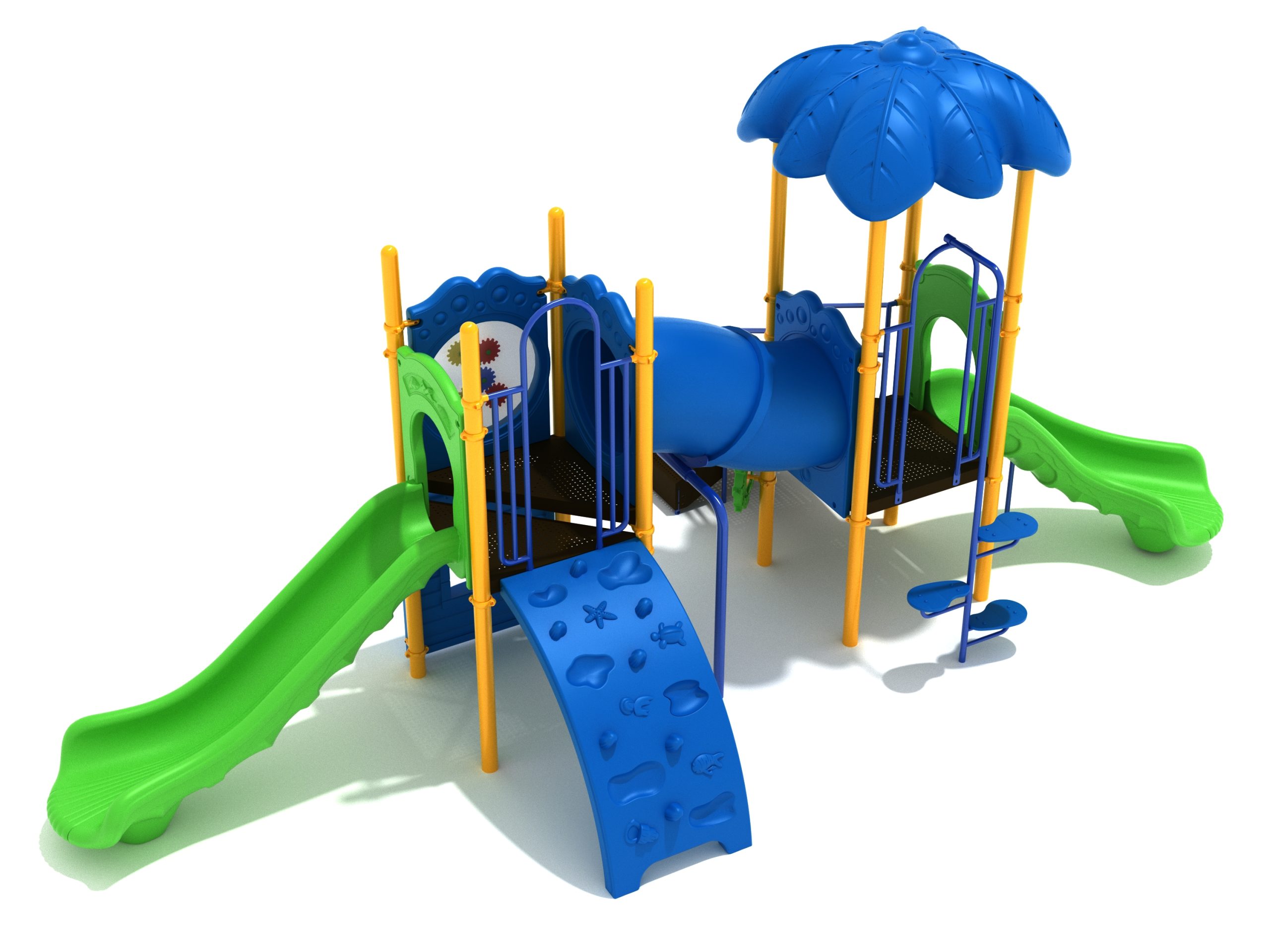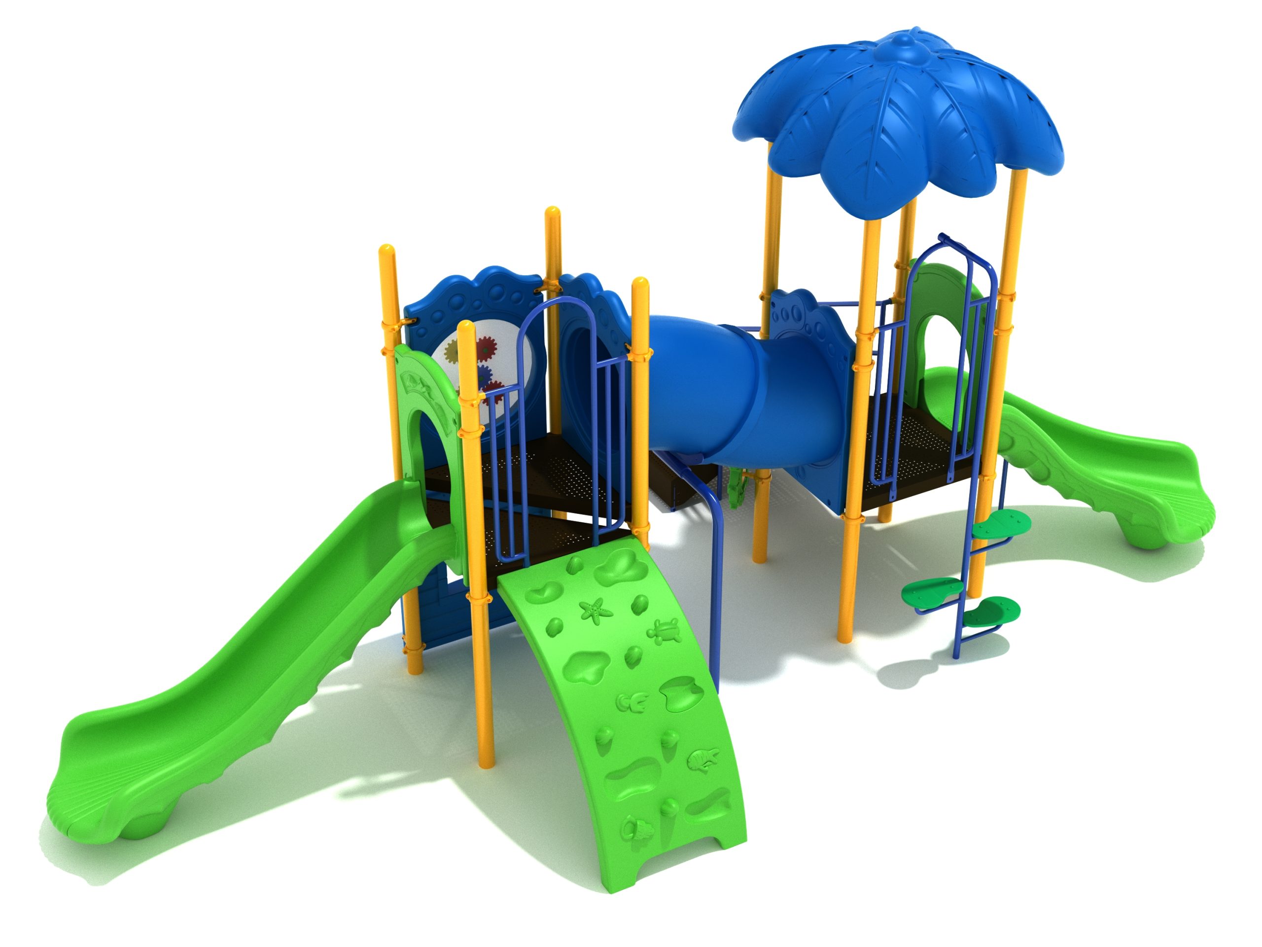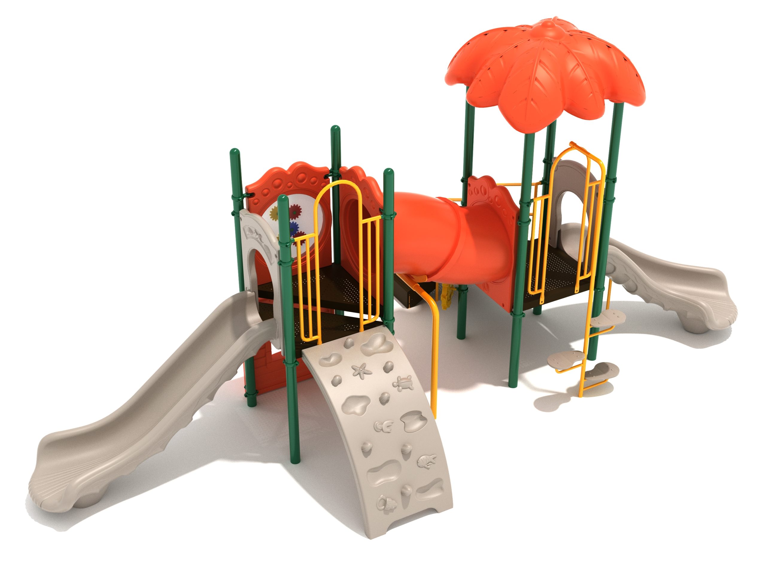 The Provo play set brings an exotic experience with many awesome features included under the tropical Leaf Roof which provides shade in summer and also shelter from rain showers. The Sea Creature Climber is an inventive way to get to the upper platforms by using indented spaces for foothold and 3D starfish and shells for handholds to propel them upwards. Adjacent to this is the Pea Pod Climber which features leaf-like platforms extending from the sides like a growing plant. When they’ve completed their climb children are presented with numerous options to enjoy including an Inclined Tube Bridge where children can pass each other on hands and knees, a Straight Slide to whizz down fast or a Right Turn Slide to add a twist to their descent. A Store Panel and Ship’s Wheel inspire adventure and creative thinking while the Gear Panel offers a tactile experience with colorful turning cogs. Withstands many years of outdoor use and requires minimal maintenance.