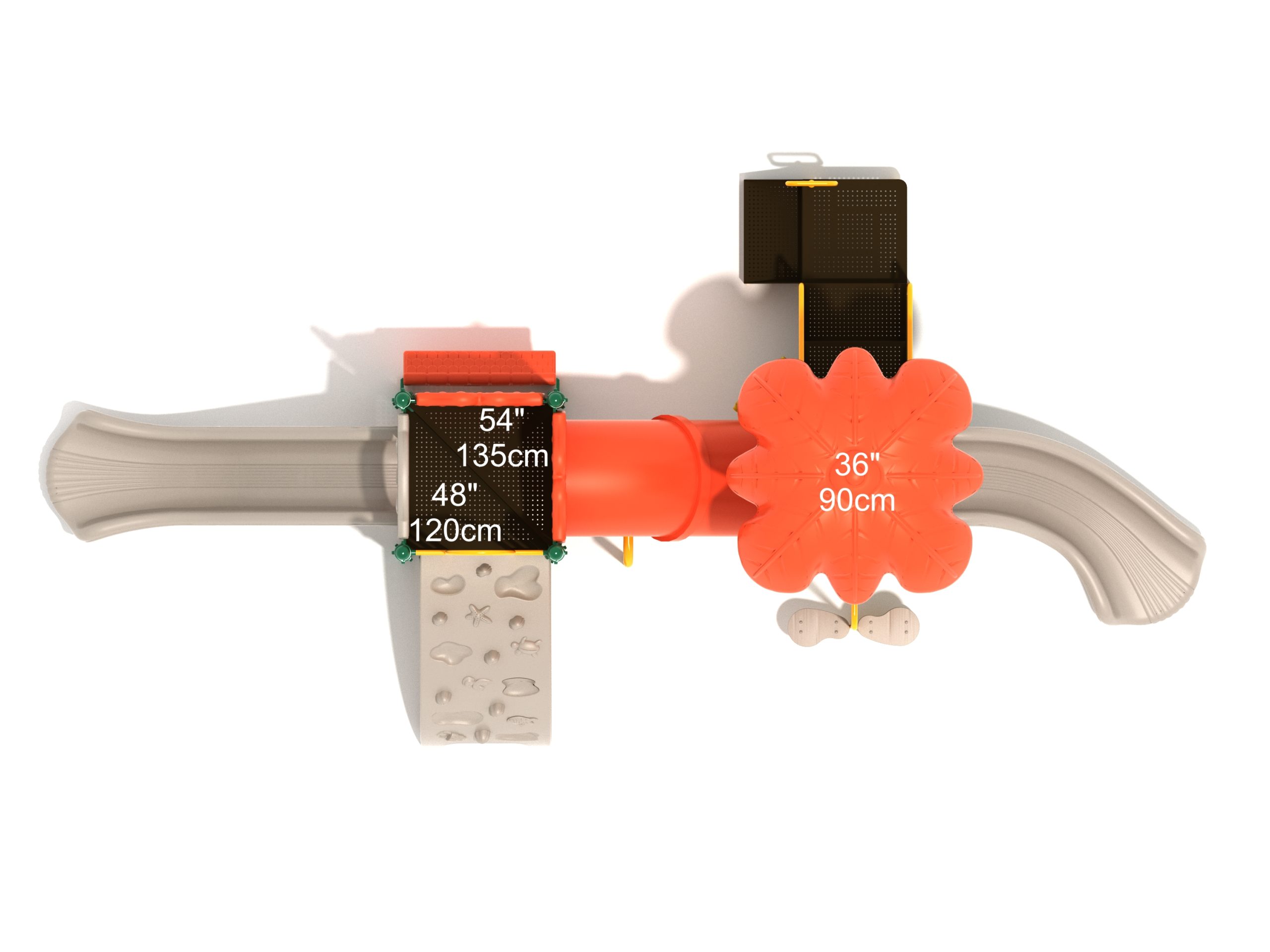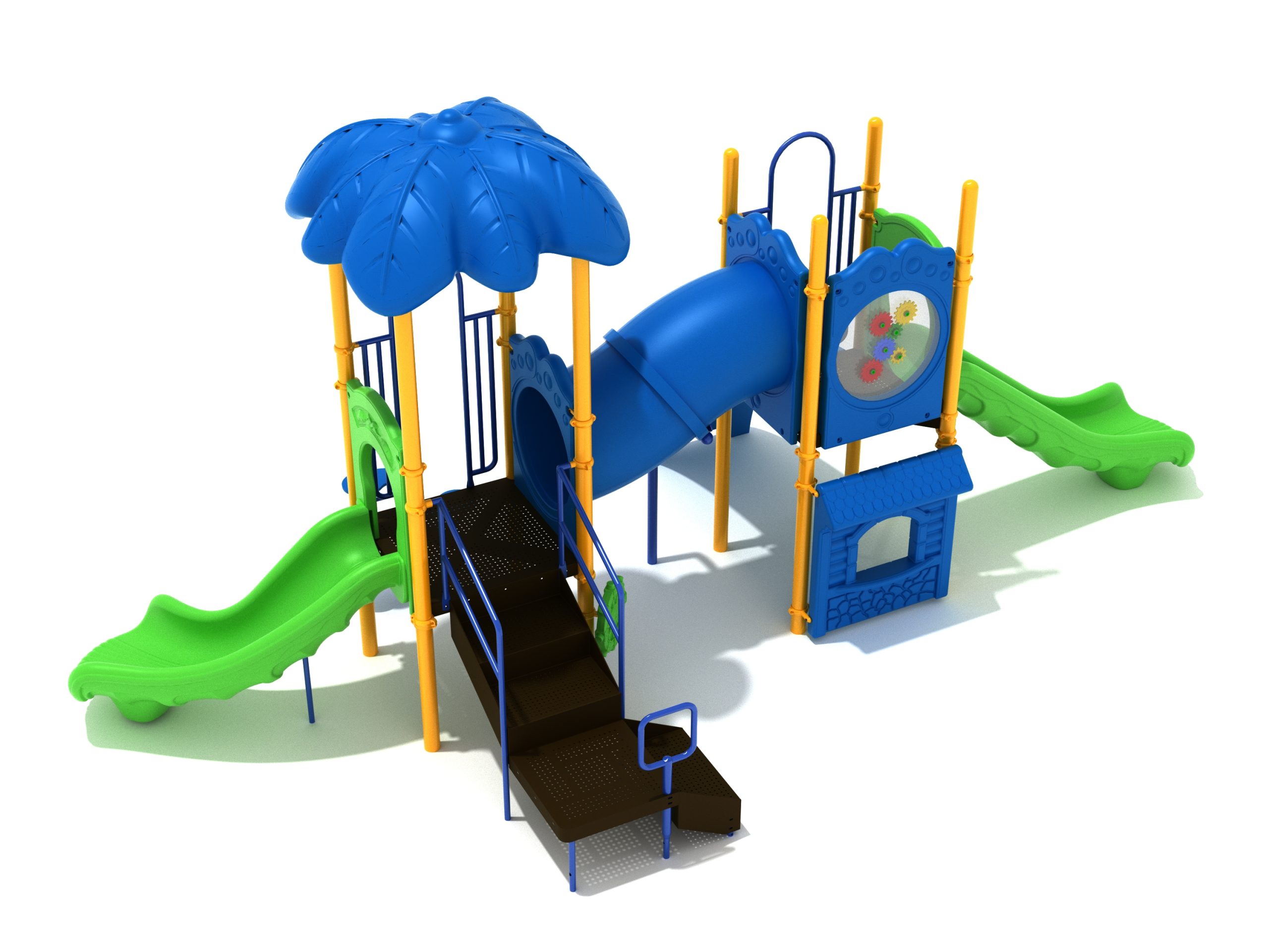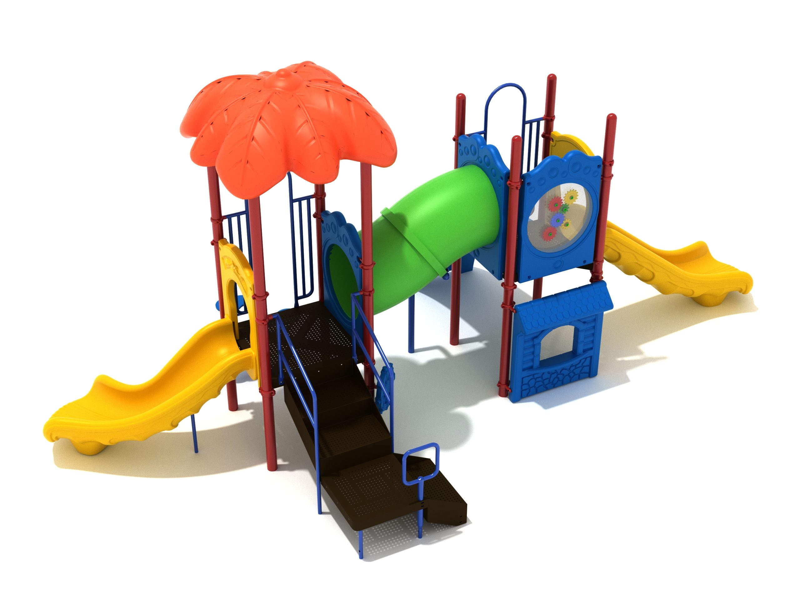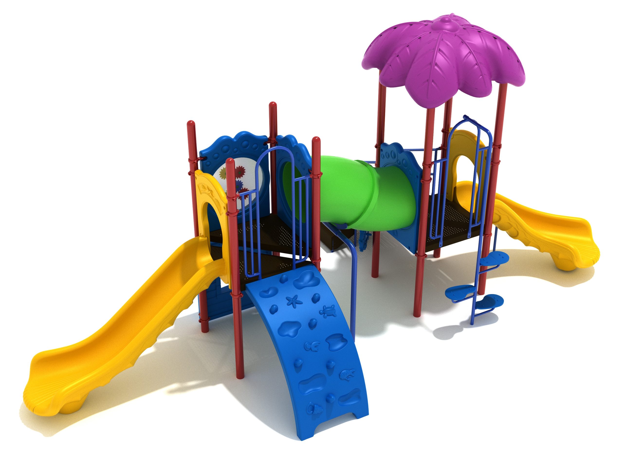 The Provo play set brings an exotic experience with many awesome features included under the tropical Leaf Roof which provides shade in summer and also shelter from rain showers. The Sea Creature Climber is an inventive way to get to the upper platforms by using indented spaces for foothold and 3D starfish and shells for handholds to propel them upwards. Adjacent to this is the Pea Pod Climber which features leaf-like platforms extending from the sides like a growing plant. When they’ve completed their climb children are presented with numerous options to enjoy including an Inclined Tube Bridge where children can pass each other on hands and knees, a Straight Slide to whizz down fast or a Right Turn Slide to add a twist to their descent. A Store Panel and Ship’s Wheel inspire adventure and creative thinking while the Gear Panel offers a tactile experience with colorful turning cogs. Withstands many years of outdoor use and requires minimal maintenance.