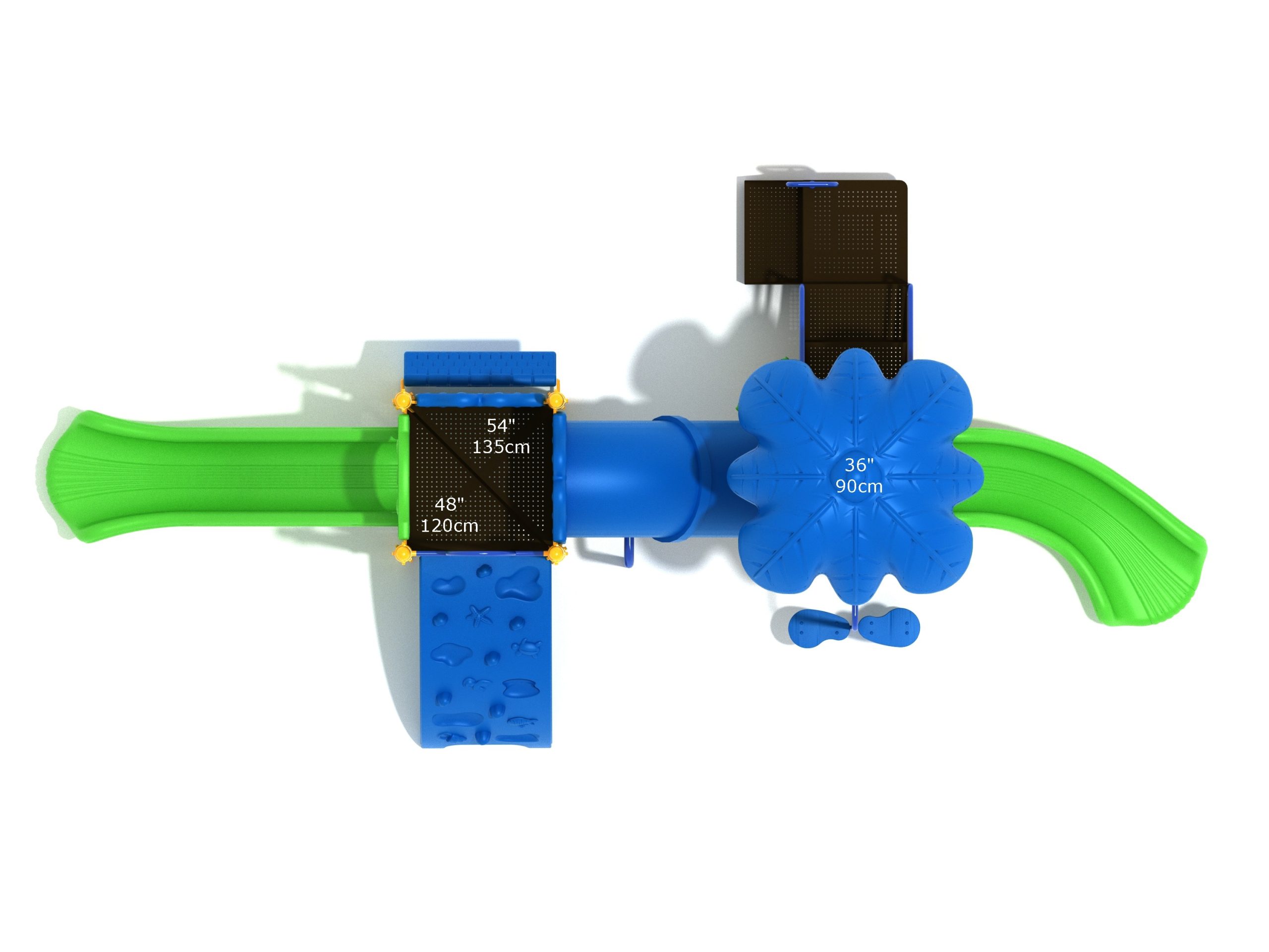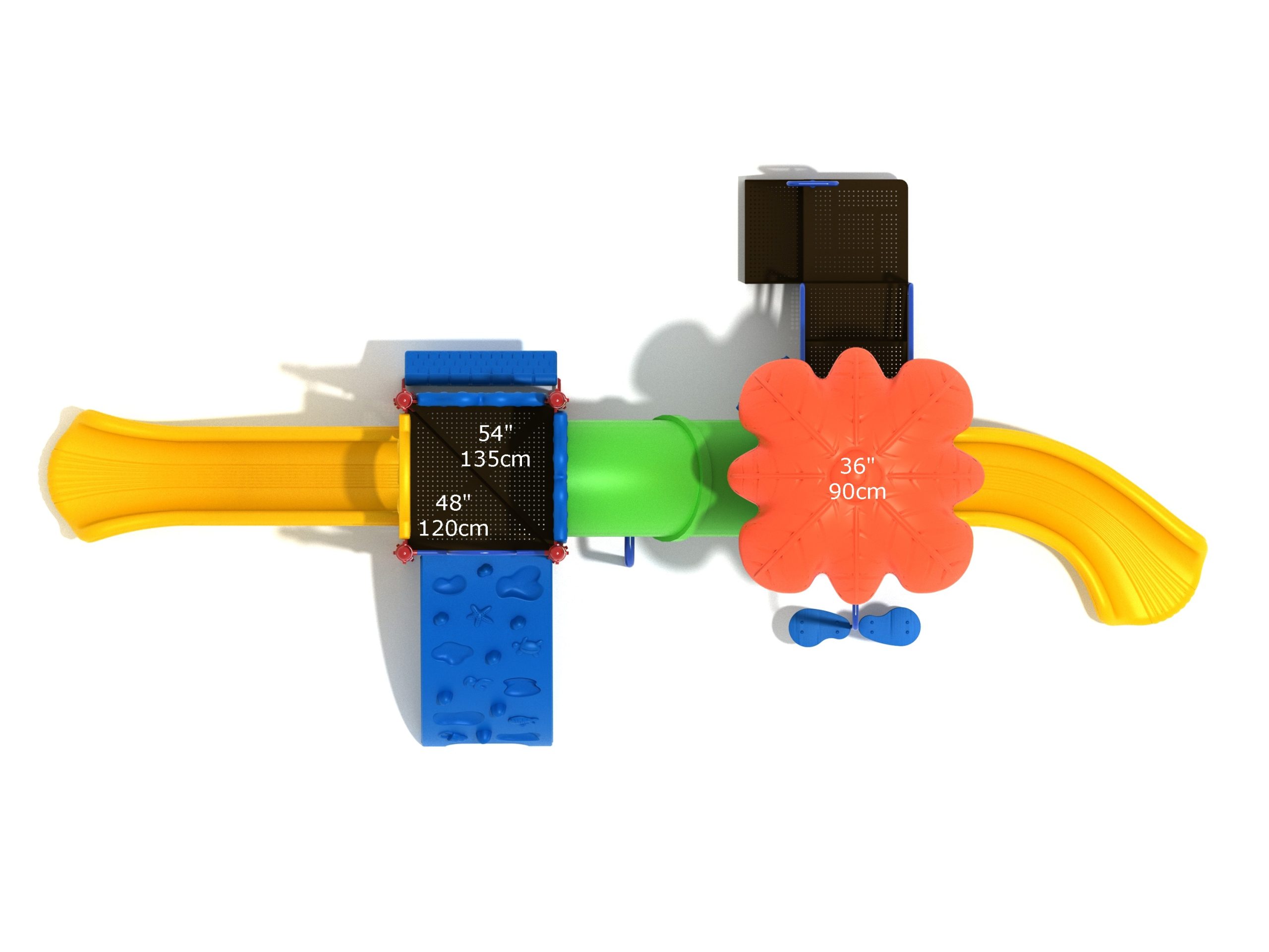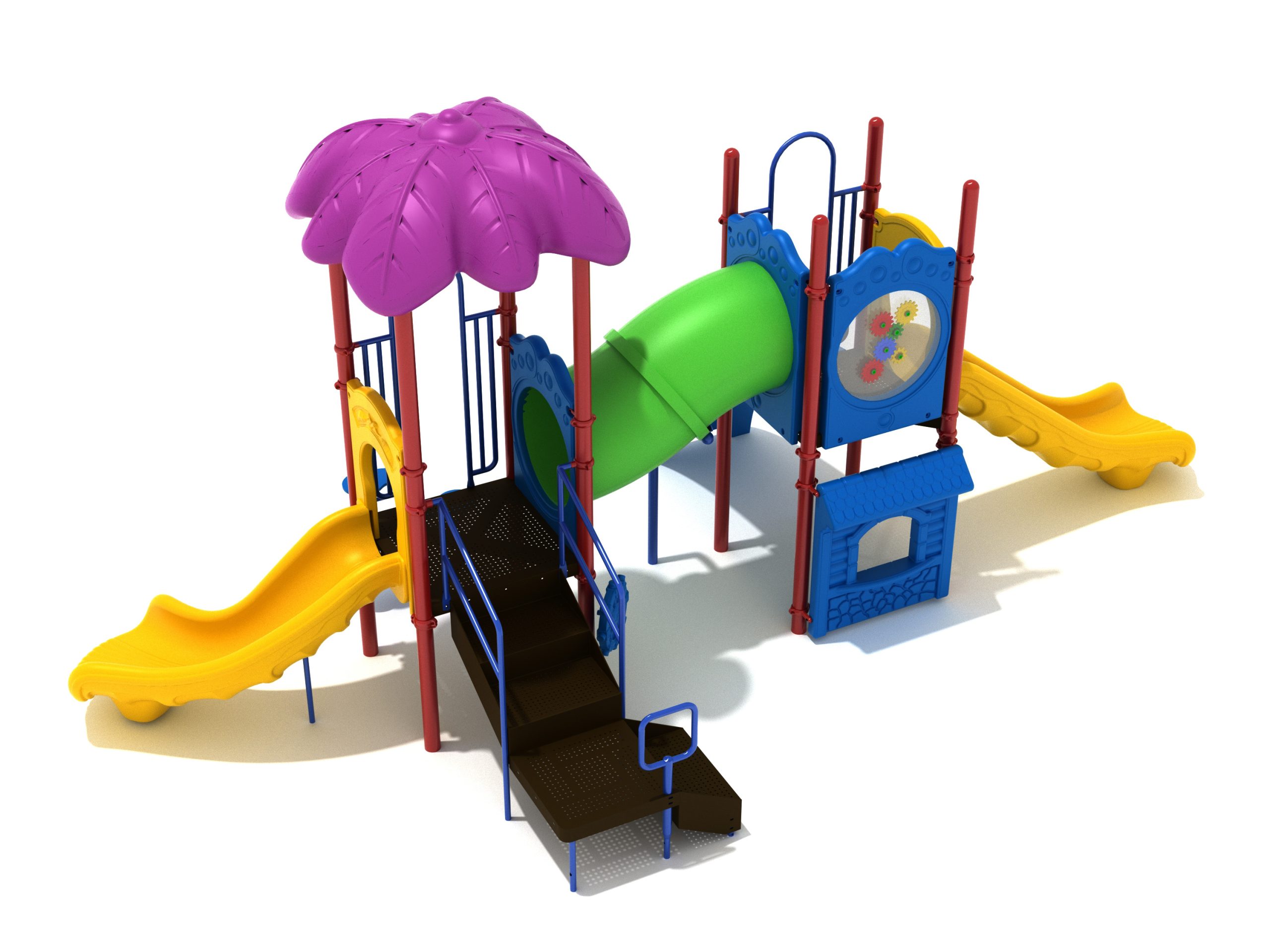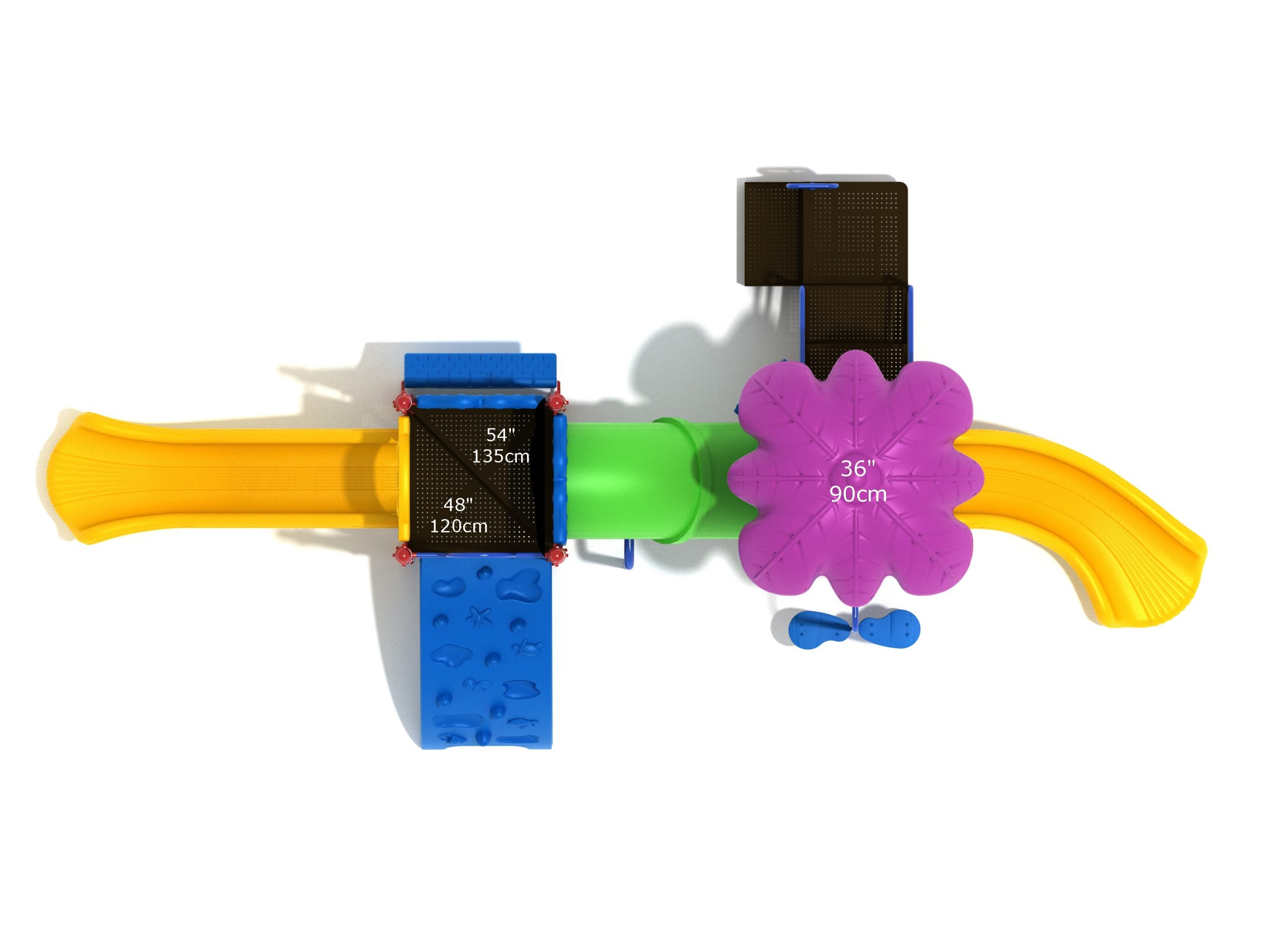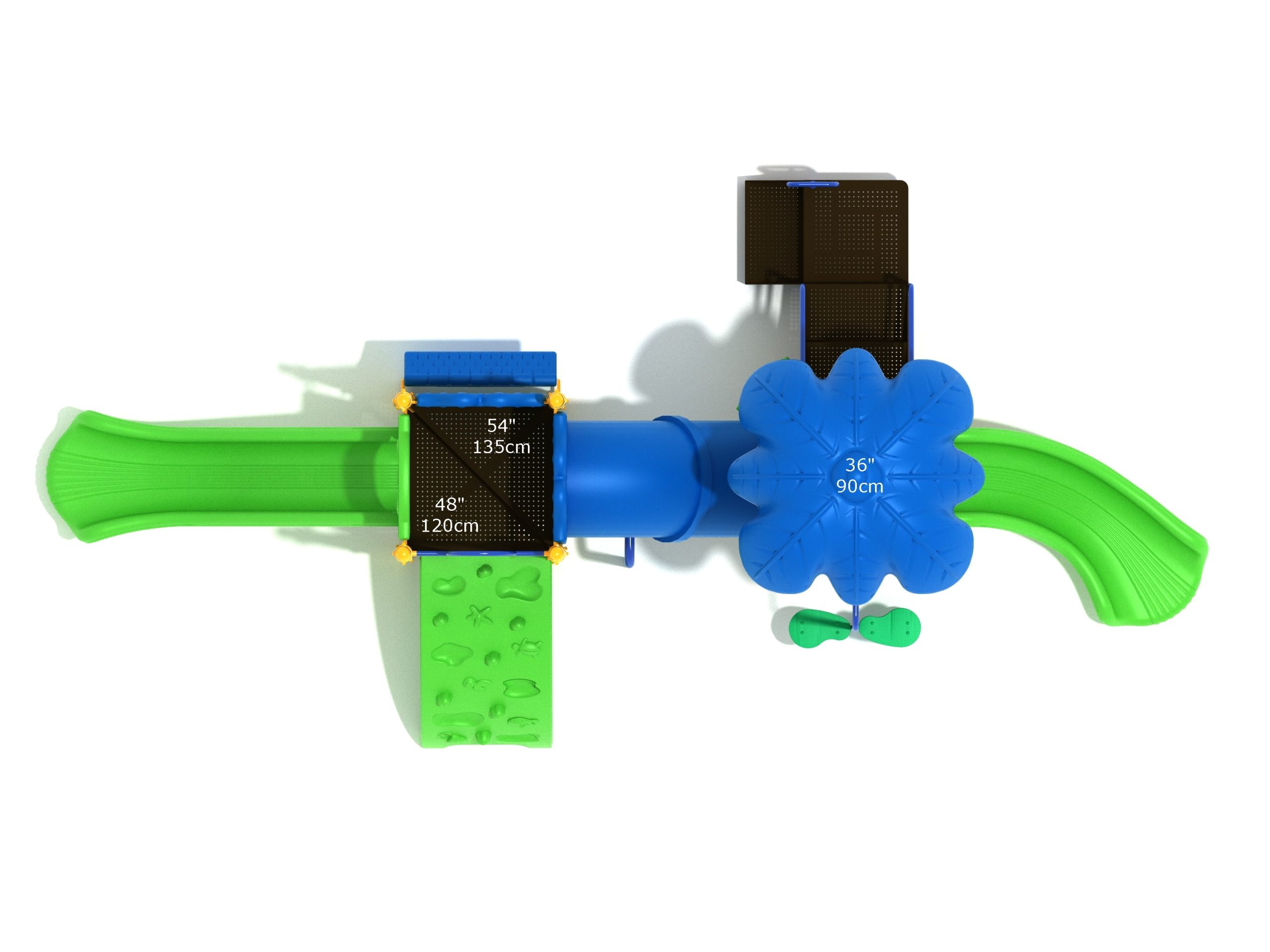 The Provo play set brings an exotic experience with many awesome features included under the tropical Leaf Roof which provides shade in summer and also shelter from rain showers. The Sea Creature Climber is an inventive way to get to the upper platforms by using indented spaces for foothold and 3D starfish and shells for handholds to propel them upwards. Adjacent to this is the Pea Pod Climber which features leaf-like platforms extending from the sides like a growing plant. When they’ve completed their climb children are presented with numerous options to enjoy including an Inclined Tube Bridge where children can pass each other on hands and knees, a Straight Slide to whizz down fast or a Right Turn Slide to add a twist to their descent. A Store Panel and Ship’s Wheel inspire adventure and creative thinking while the Gear Panel offers a tactile experience with colorful turning cogs. Withstands many years of outdoor use and requires minimal maintenance.