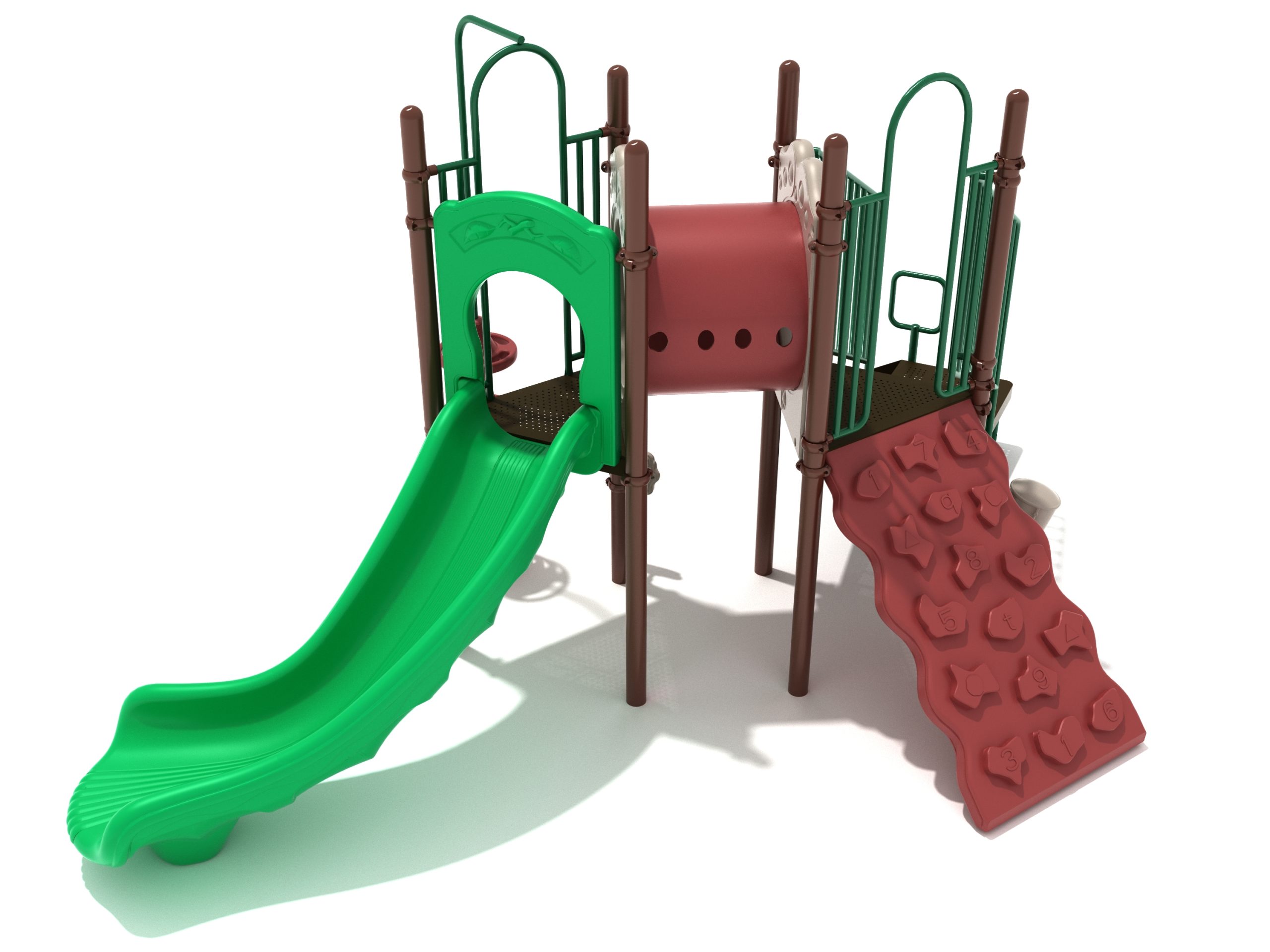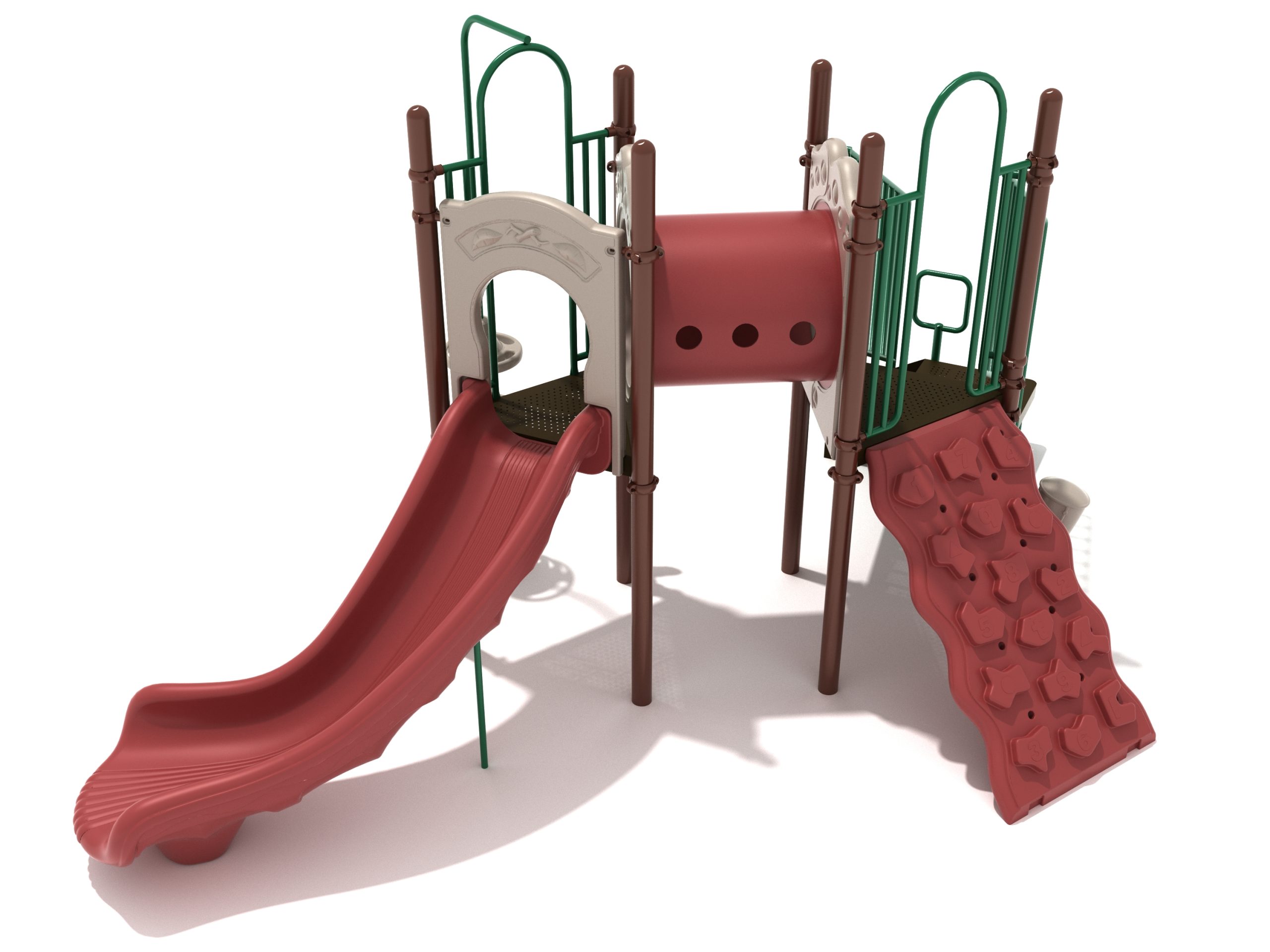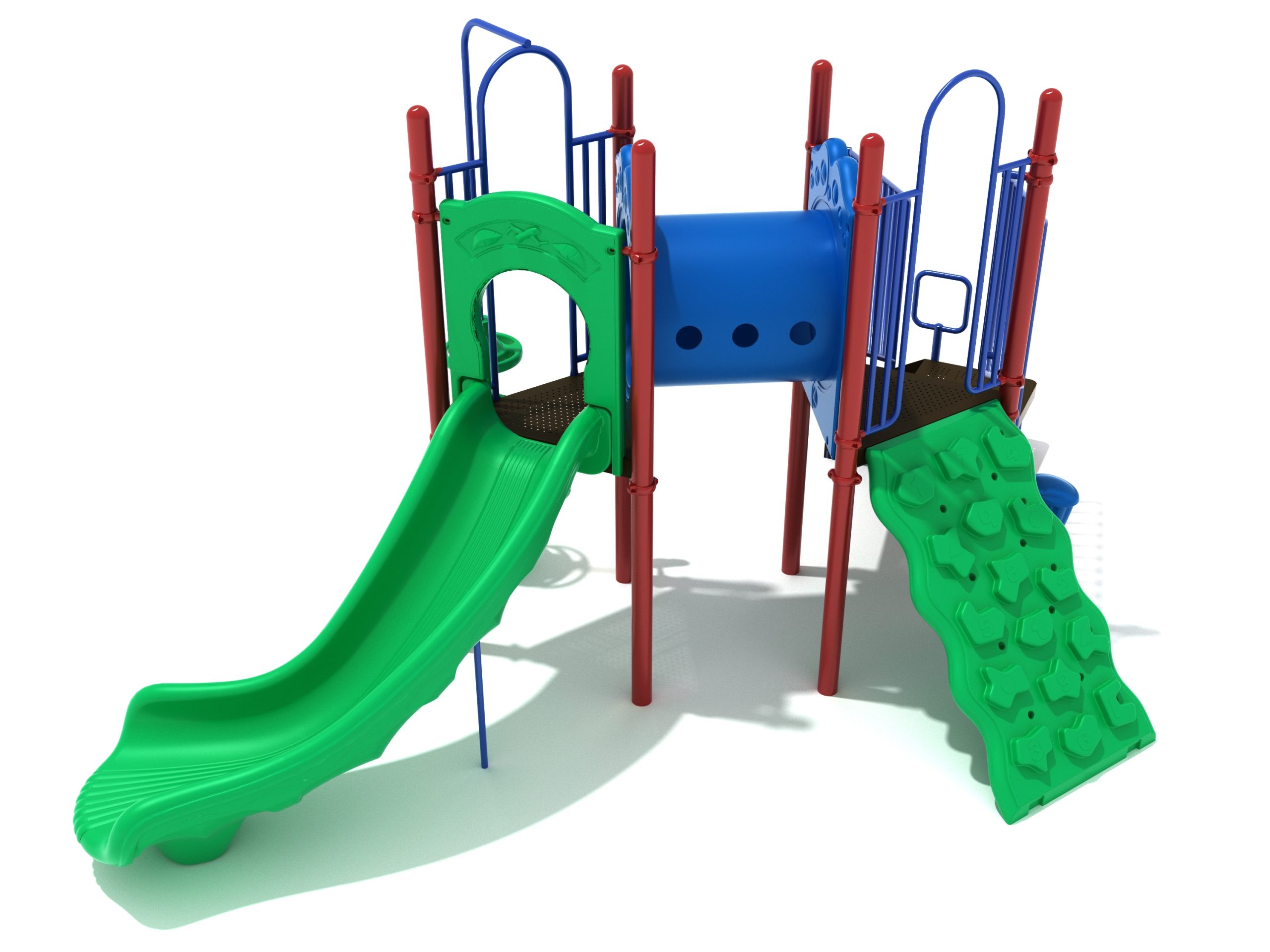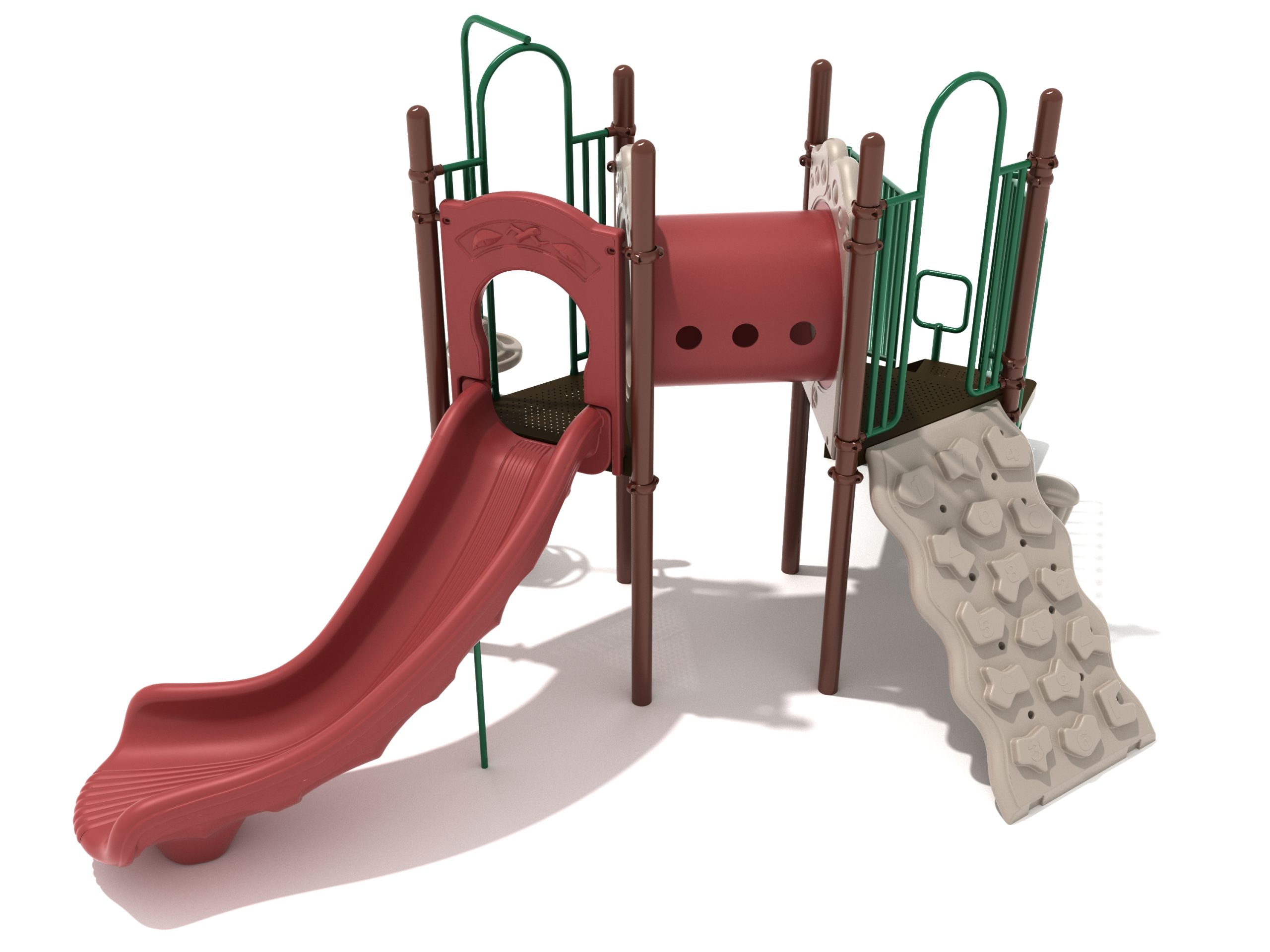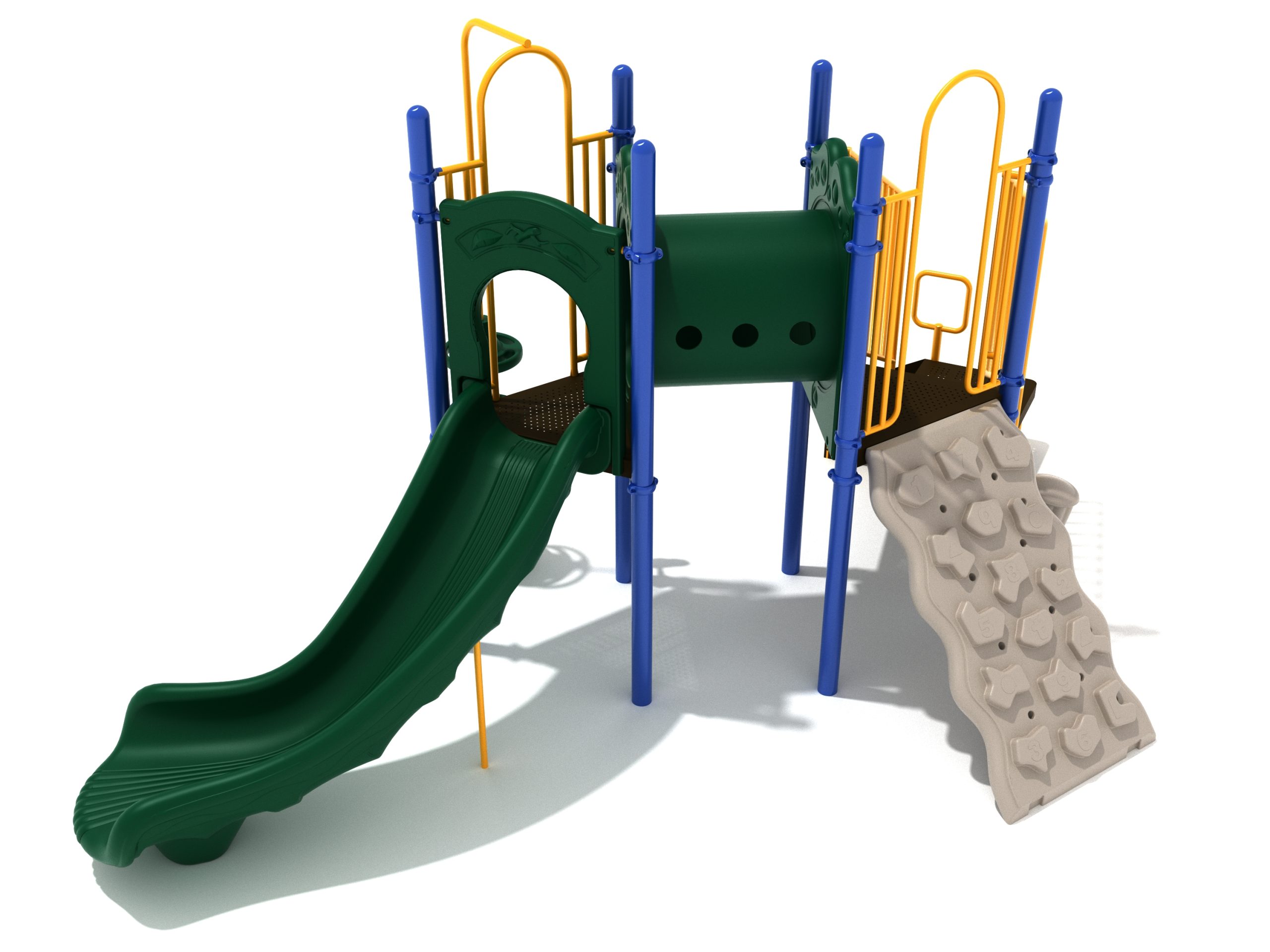 The Redmond play structure is will the hub of excitement on the playground that children will love to gather at. Made up of two triangular 48” elevated platforms that are connected by a tube bridge, this play structure is accessible by a number climber, a pod climber, or by stairs. Children can take a right turn slide that attaches itself to one of the triangular elevated platforms off of the play structure. A rain wheel and a single drum found on the ground level provide opportunities for on-ground play and also make the Redmond play structure ADA compliant. This play structure is sure to be one of the most popular places on the playground, and children will love to gather around it as well as play on it. It is a great deal. This play structure is designed for children who are between the ages of 2 and 12 years old.