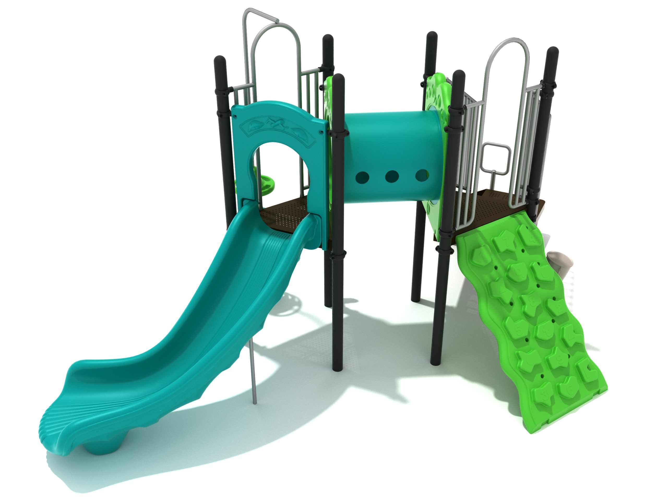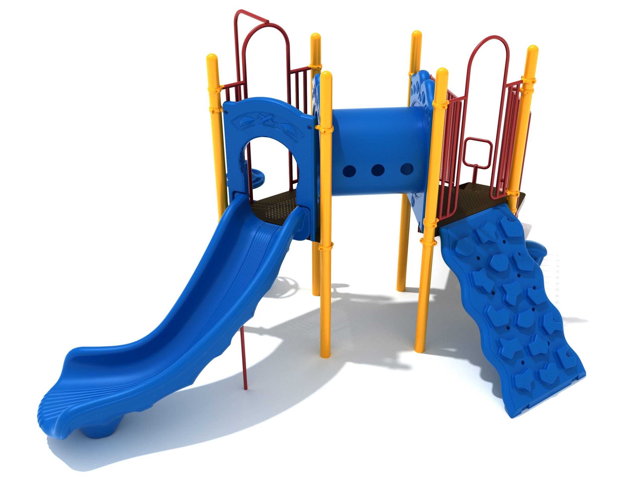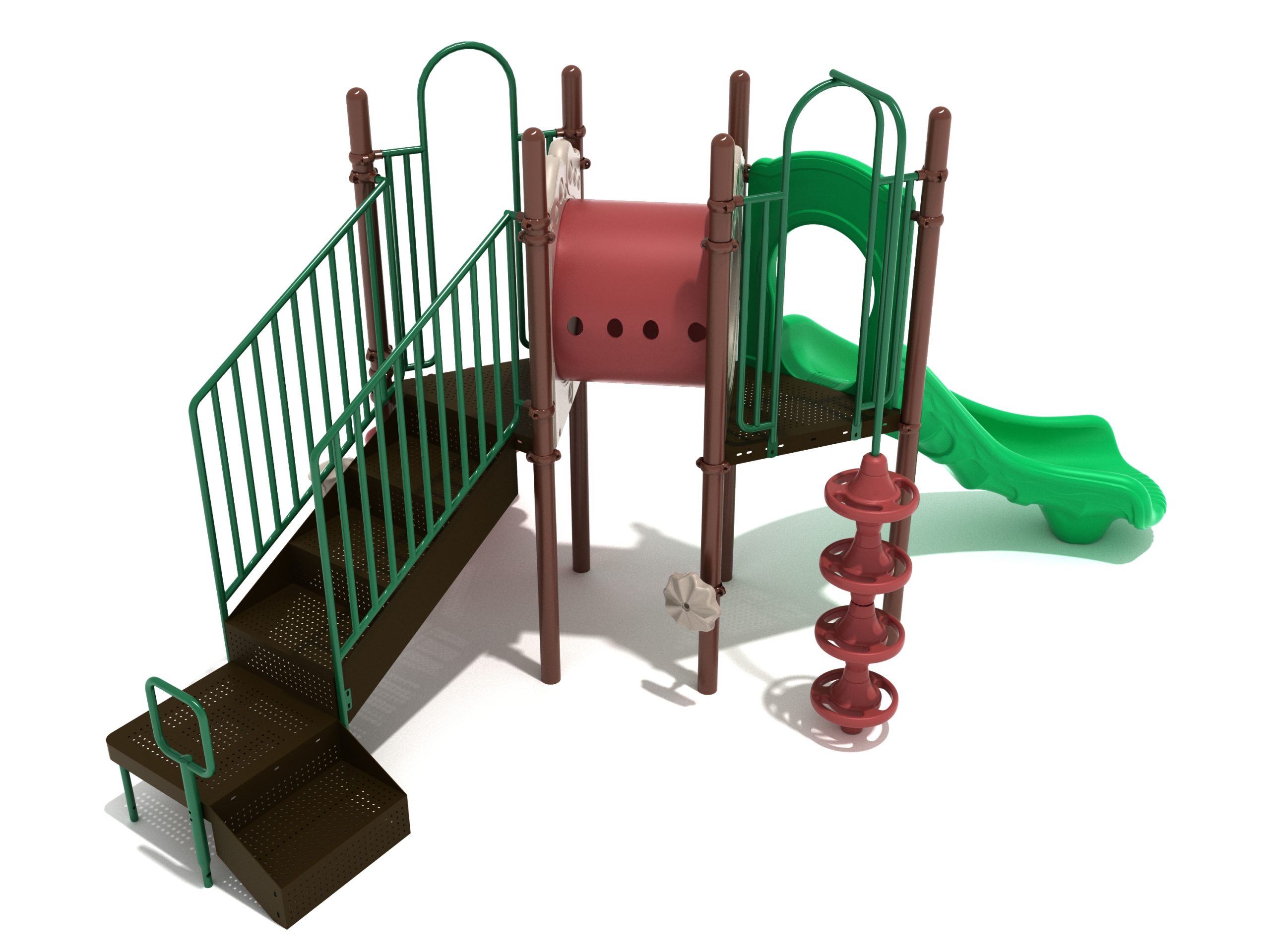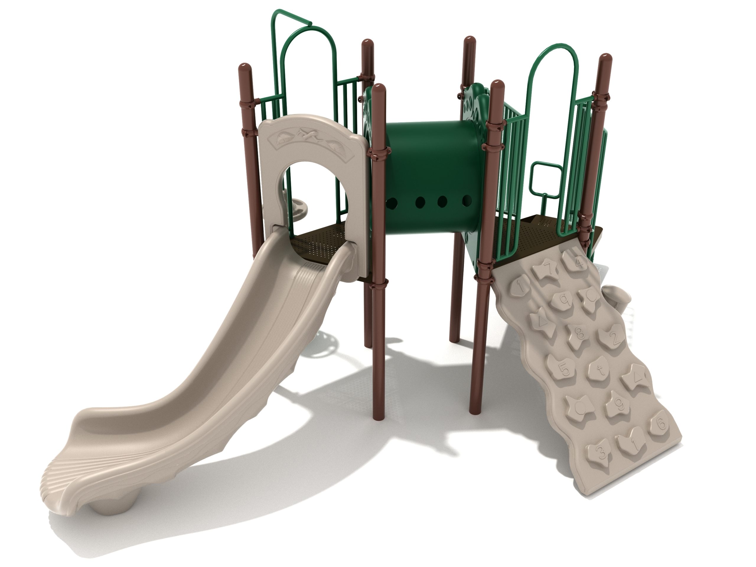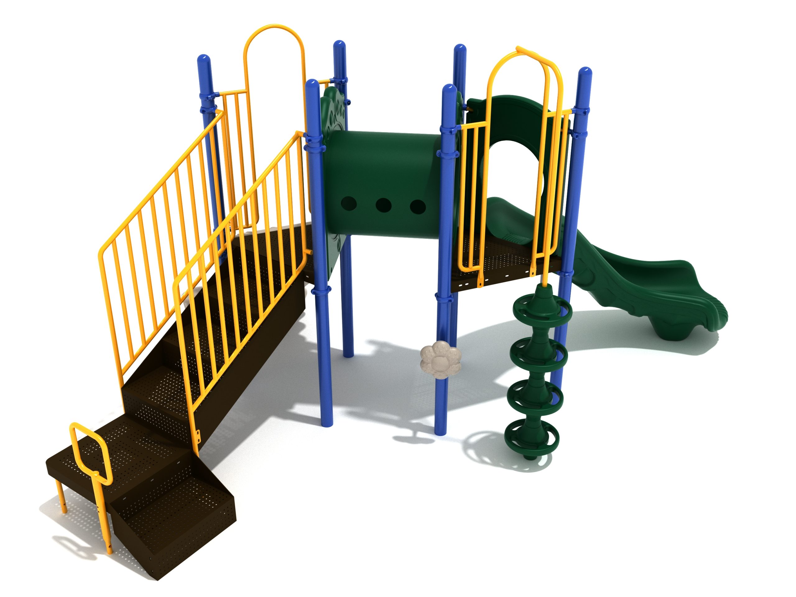 The Redmond play structure is will the hub of excitement on the playground that children will love to gather at. Made up of two triangular 48” elevated platforms that are connected by a tube bridge, this play structure is accessible by a number climber, a pod climber, or by stairs. Children can take a right turn slide that attaches itself to one of the triangular elevated platforms off of the play structure. A rain wheel and a single drum found on the ground level provide opportunities for on-ground play and also make the Redmond play structure ADA compliant. This play structure is sure to be one of the most popular places on the playground, and children will love to gather around it as well as play on it. It is a great deal. This play structure is designed for children who are between the ages of 2 and 12 years old.