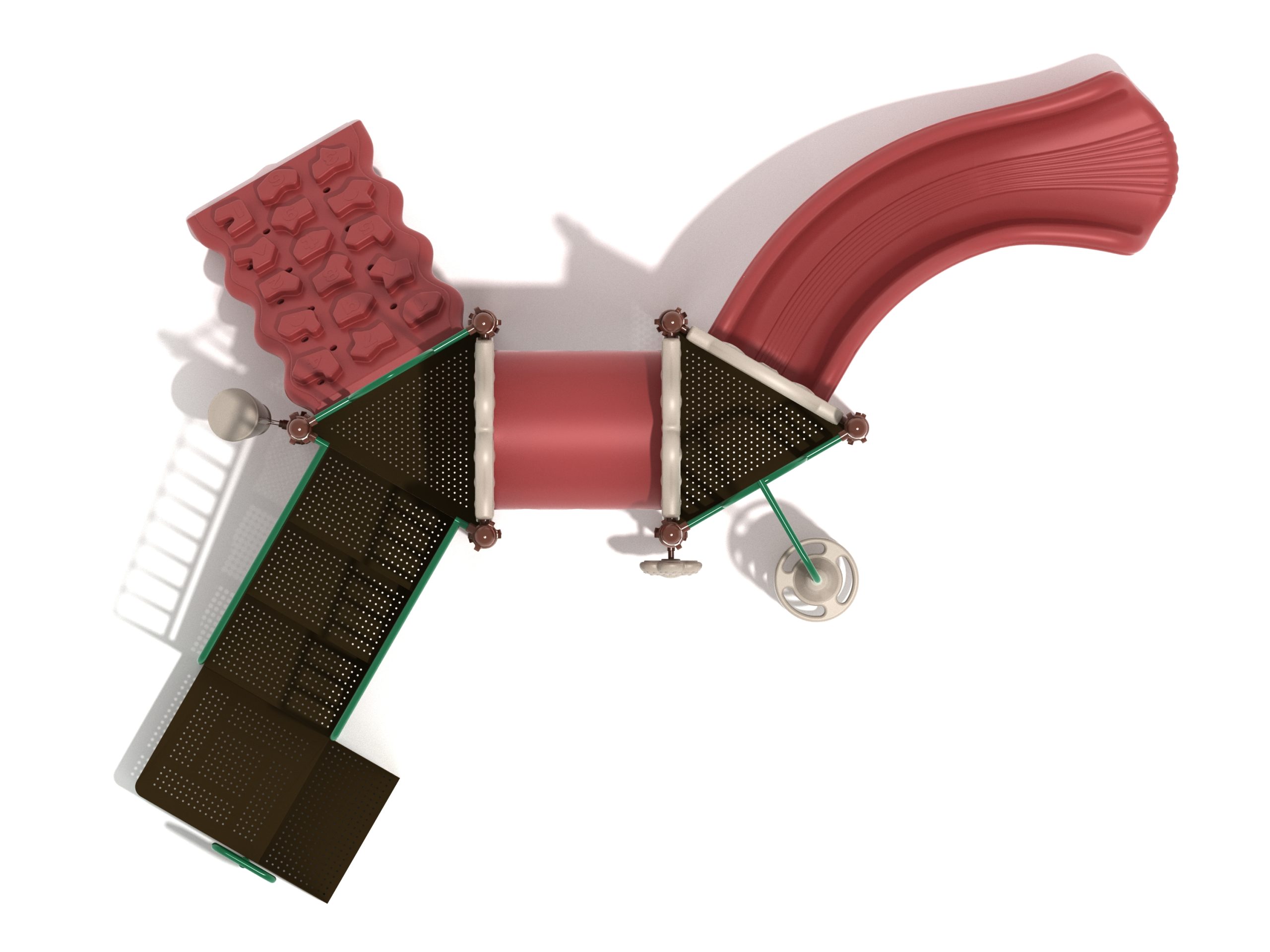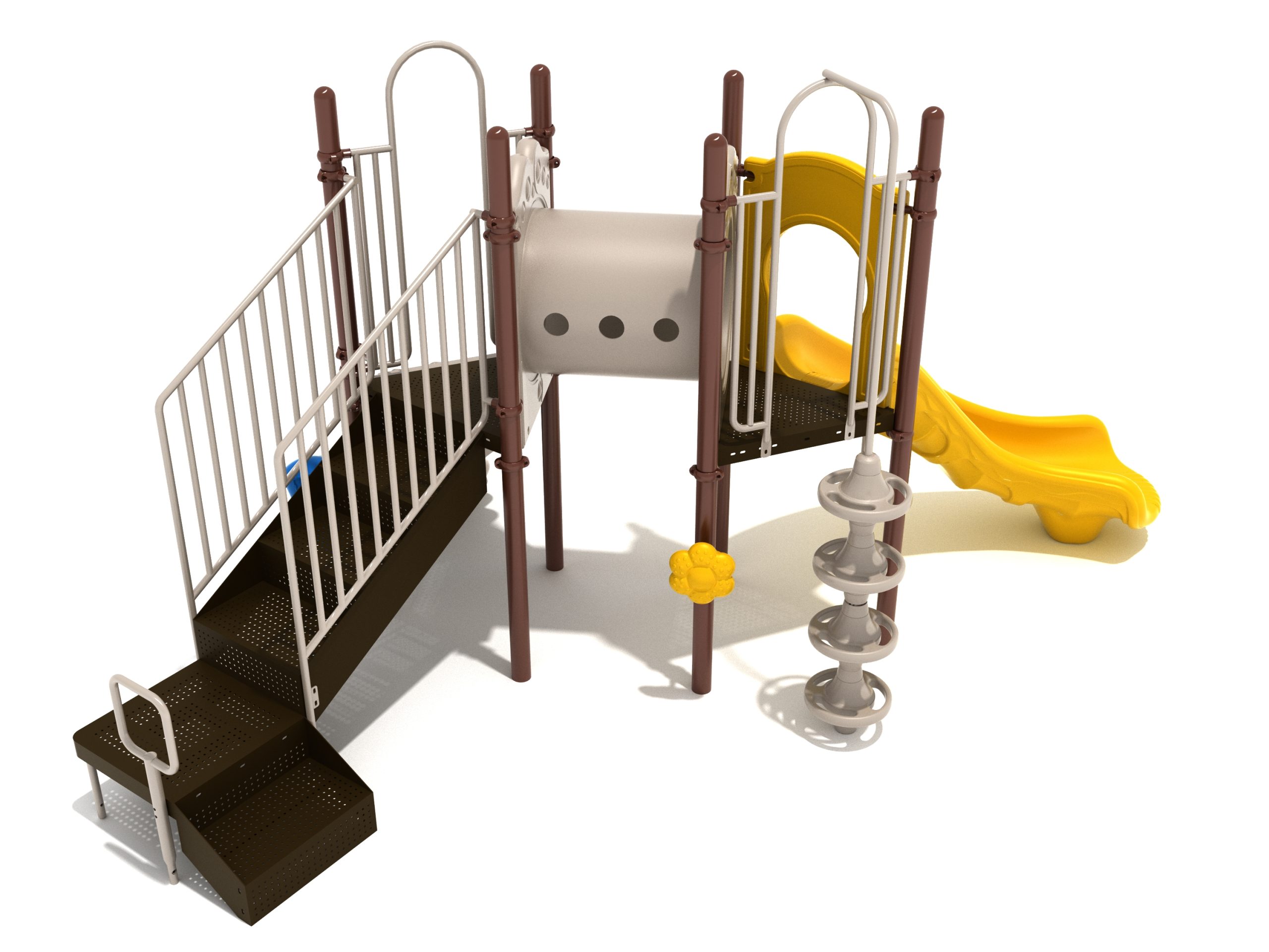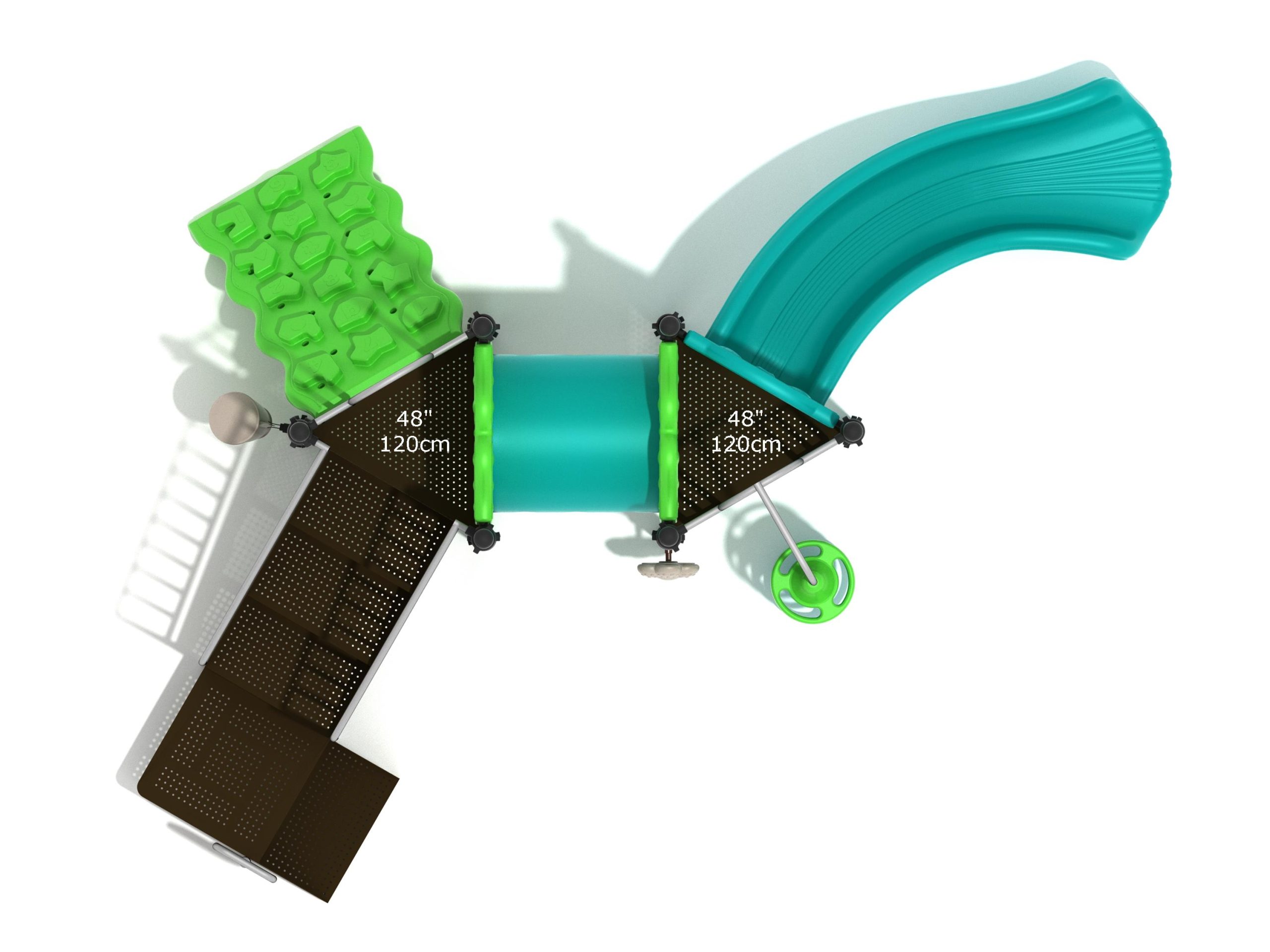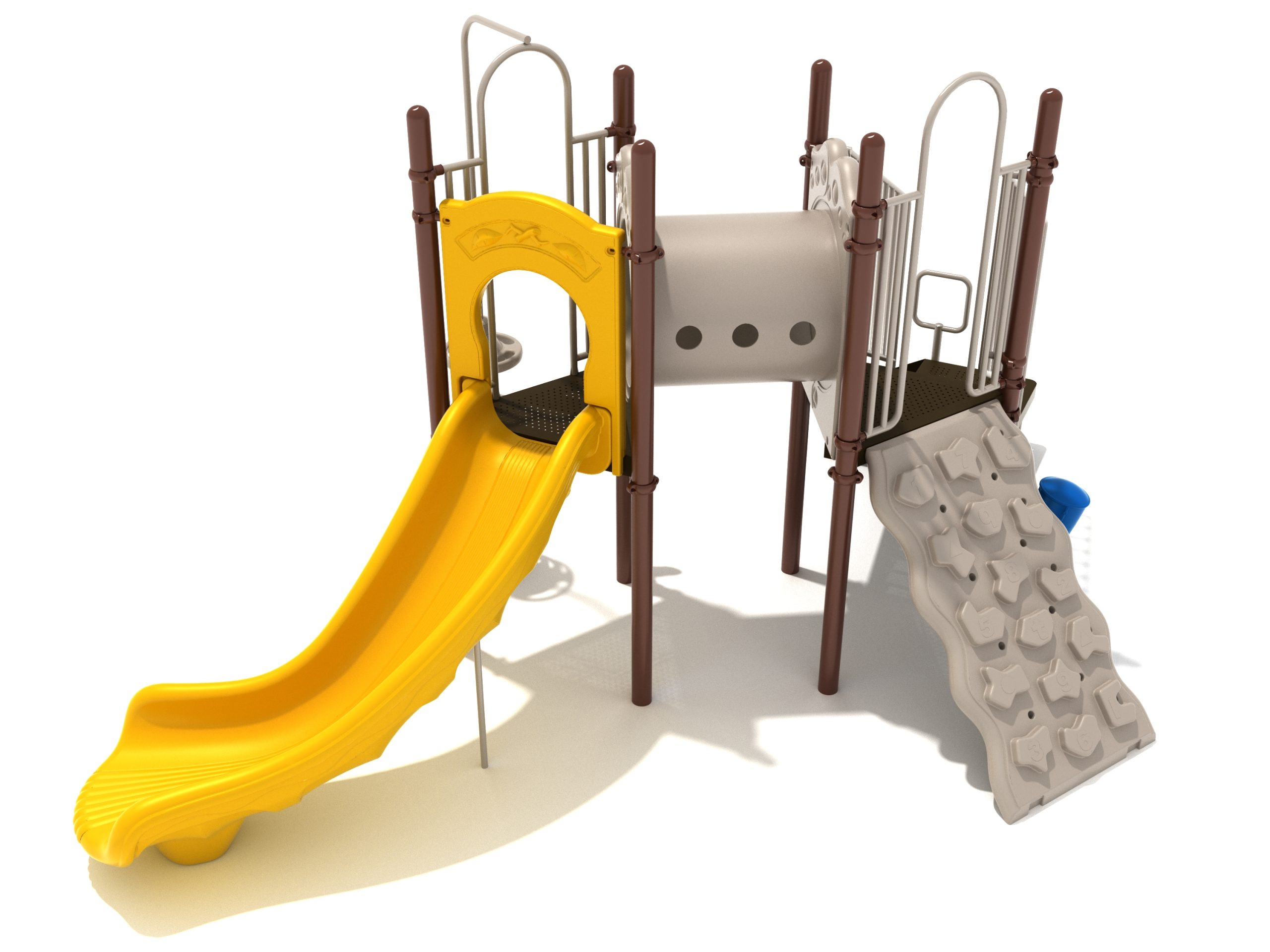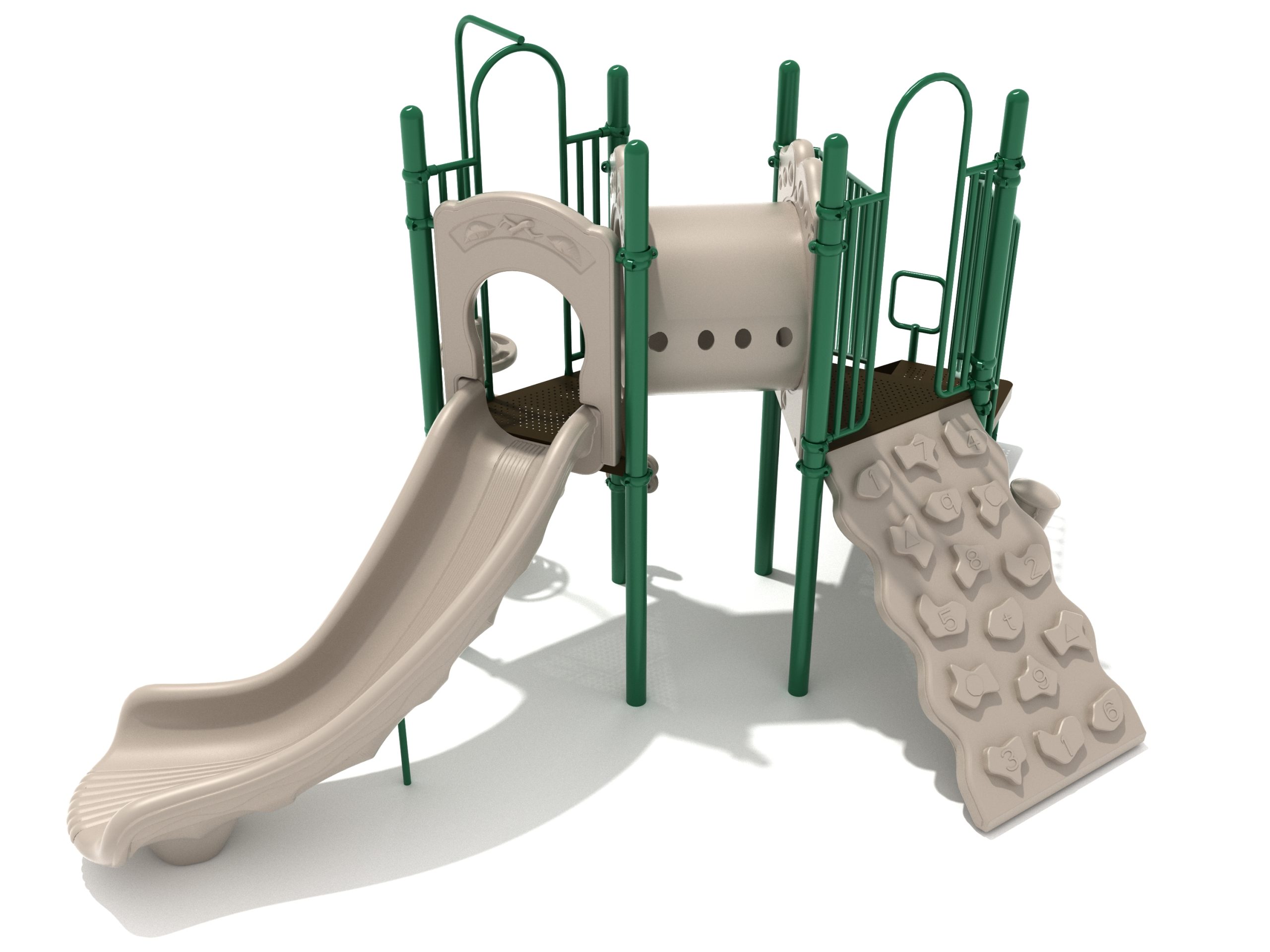 The Redmond play structure is will the hub of excitement on the playground that children will love to gather at. Made up of two triangular 48” elevated platforms that are connected by a tube bridge, this play structure is accessible by a number climber, a pod climber, or by stairs. Children can take a right turn slide that attaches itself to one of the triangular elevated platforms off of the play structure. A rain wheel and a single drum found on the ground level provide opportunities for on-ground play and also make the Redmond play structure ADA compliant. This play structure is sure to be one of the most popular places on the playground, and children will love to gather around it as well as play on it. It is a great deal. This play structure is designed for children who are between the ages of 2 and 12 years old.