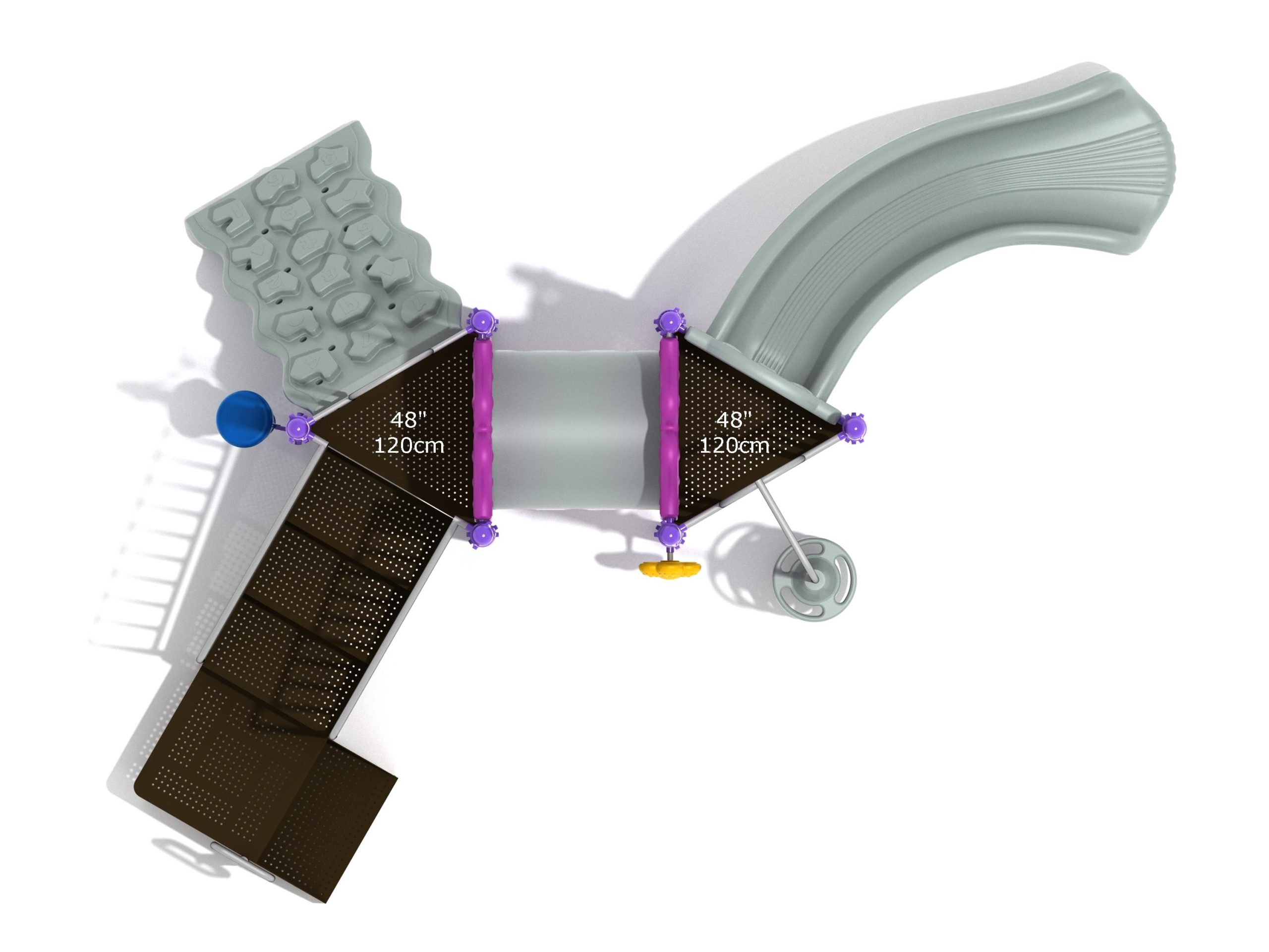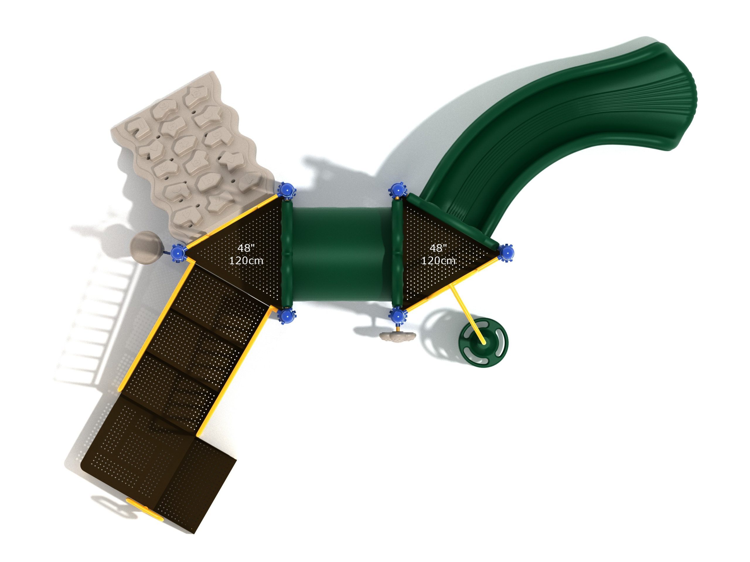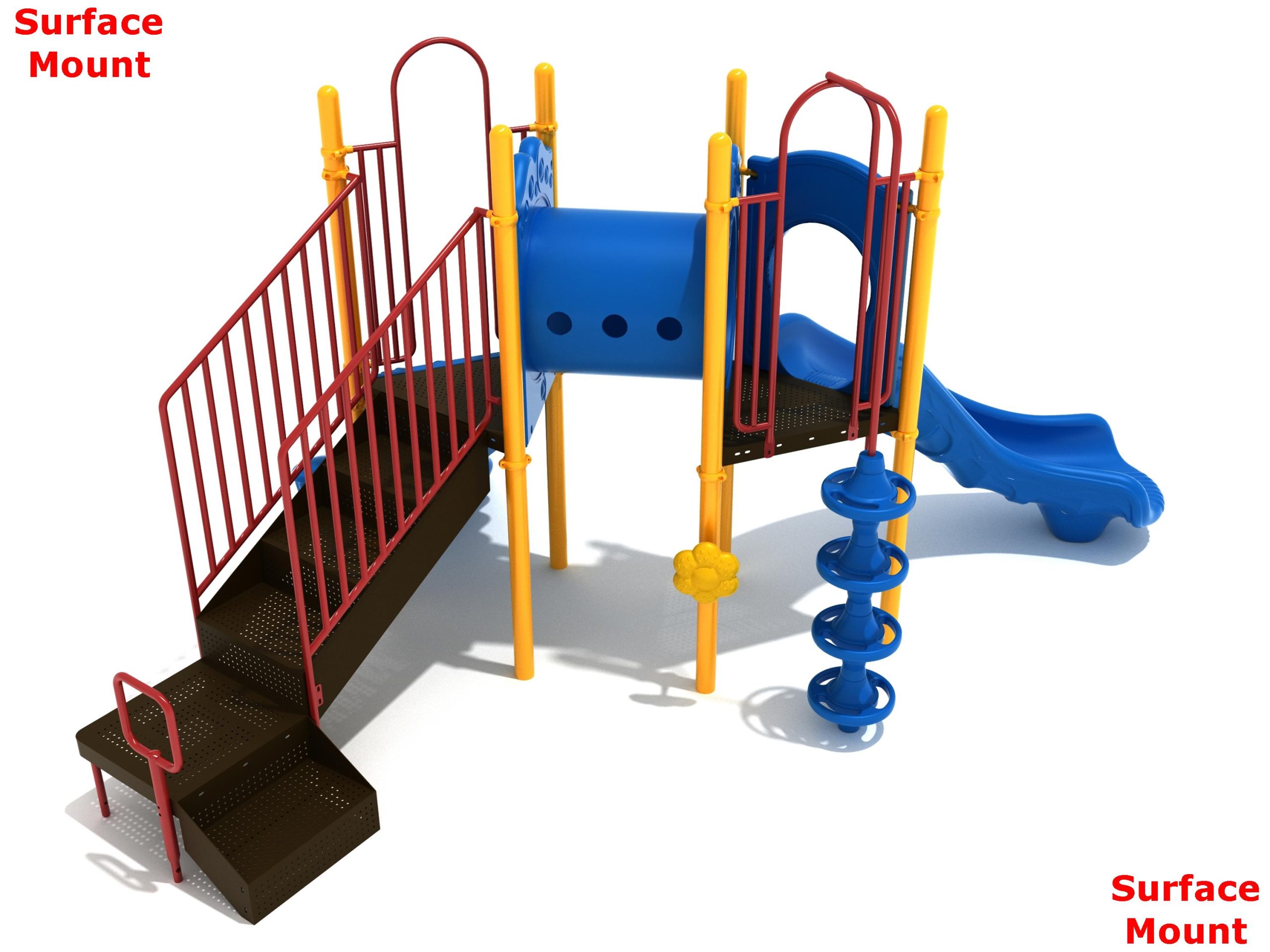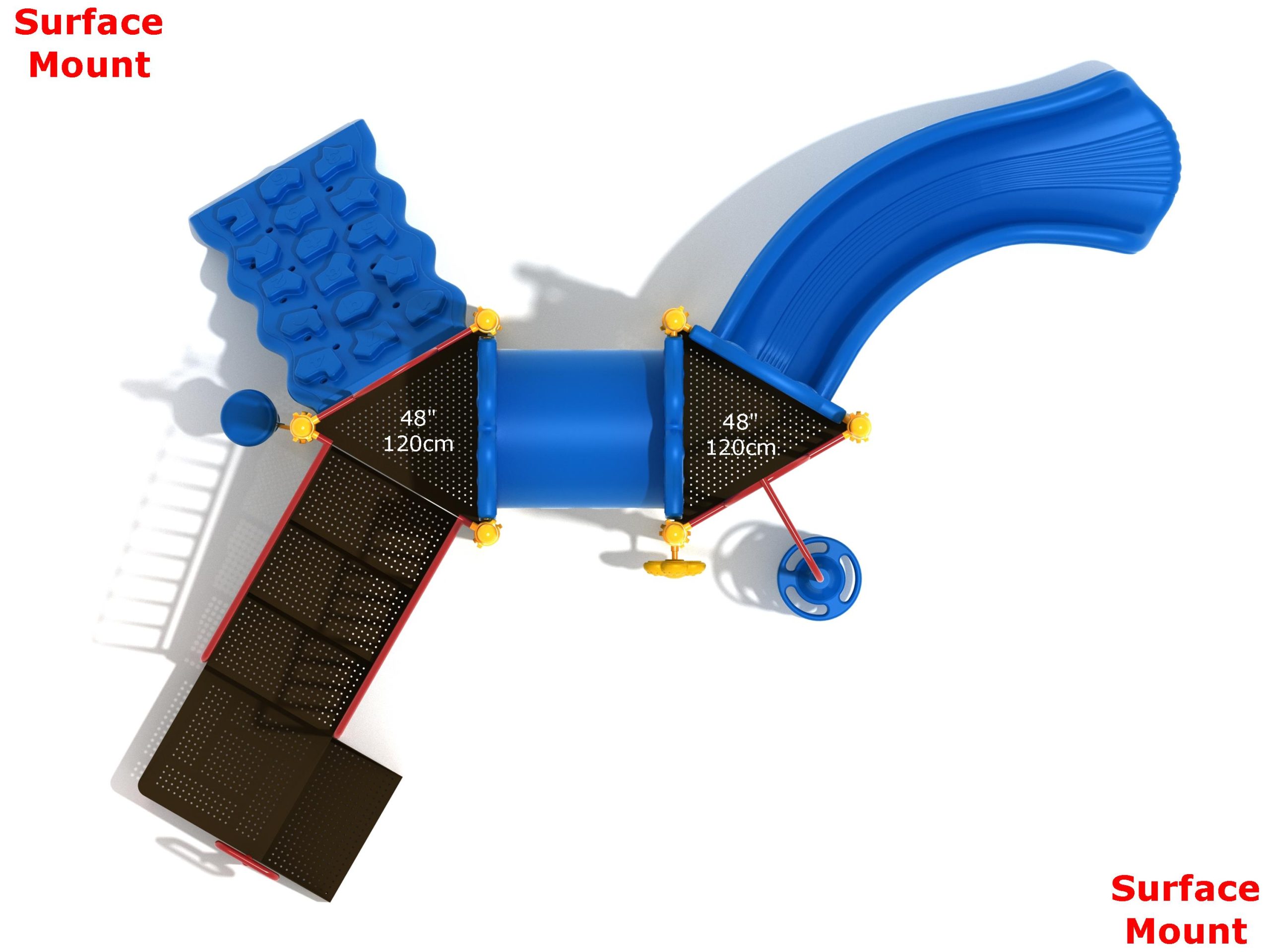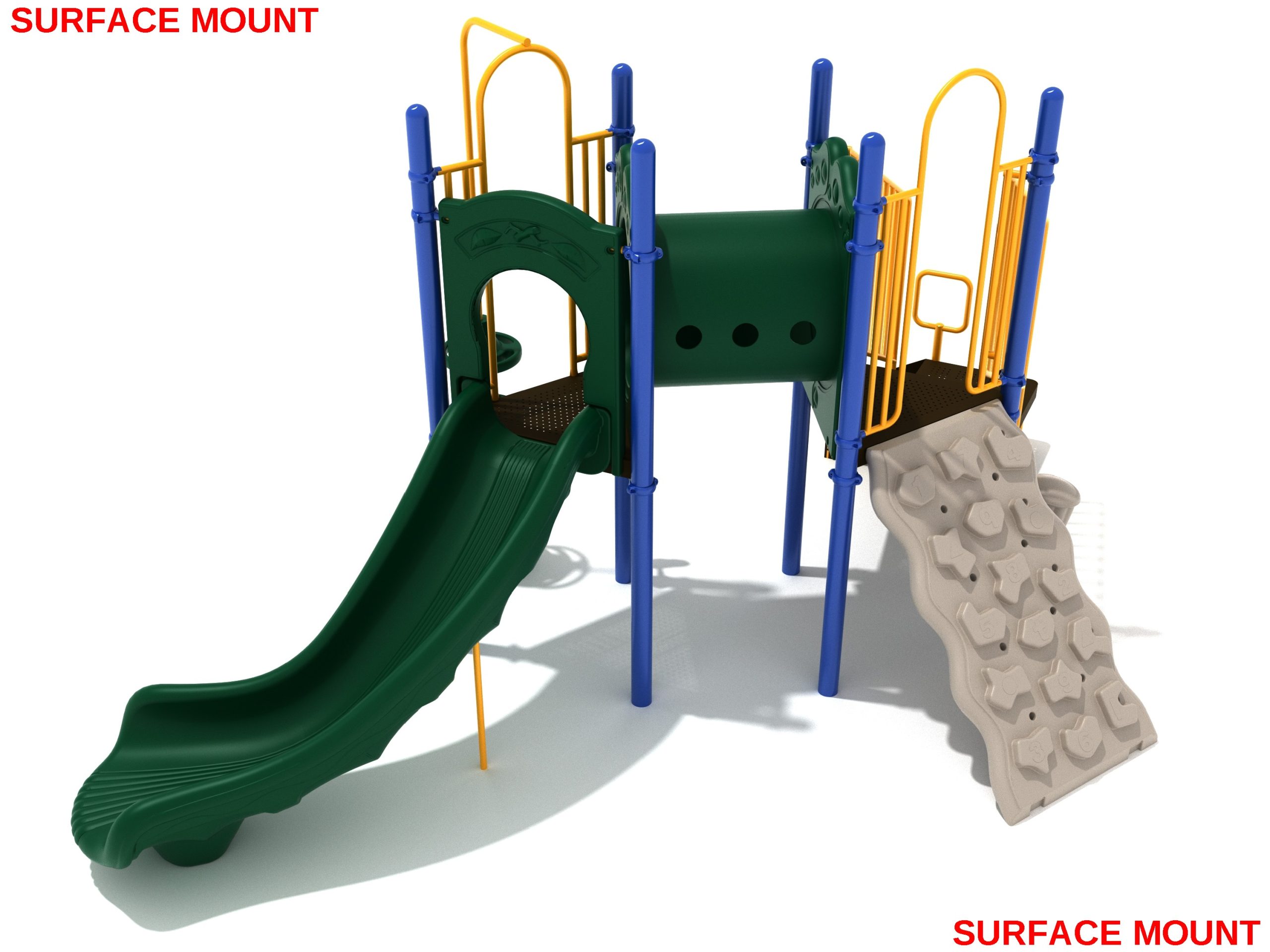 The Redmond play structure is will the hub of excitement on the playground that children will love to gather at. Made up of two triangular 48” elevated platforms that are connected by a tube bridge, this play structure is accessible by a number climber, a pod climber, or by stairs. Children can take a right turn slide that attaches itself to one of the triangular elevated platforms off of the play structure. A rain wheel and a single drum found on the ground level provide opportunities for on-ground play and also make the Redmond play structure ADA compliant. This play structure is sure to be one of the most popular places on the playground, and children will love to gather around it as well as play on it. It is a great deal. This play structure is designed for children who are between the ages of 2 and 12 years old.
