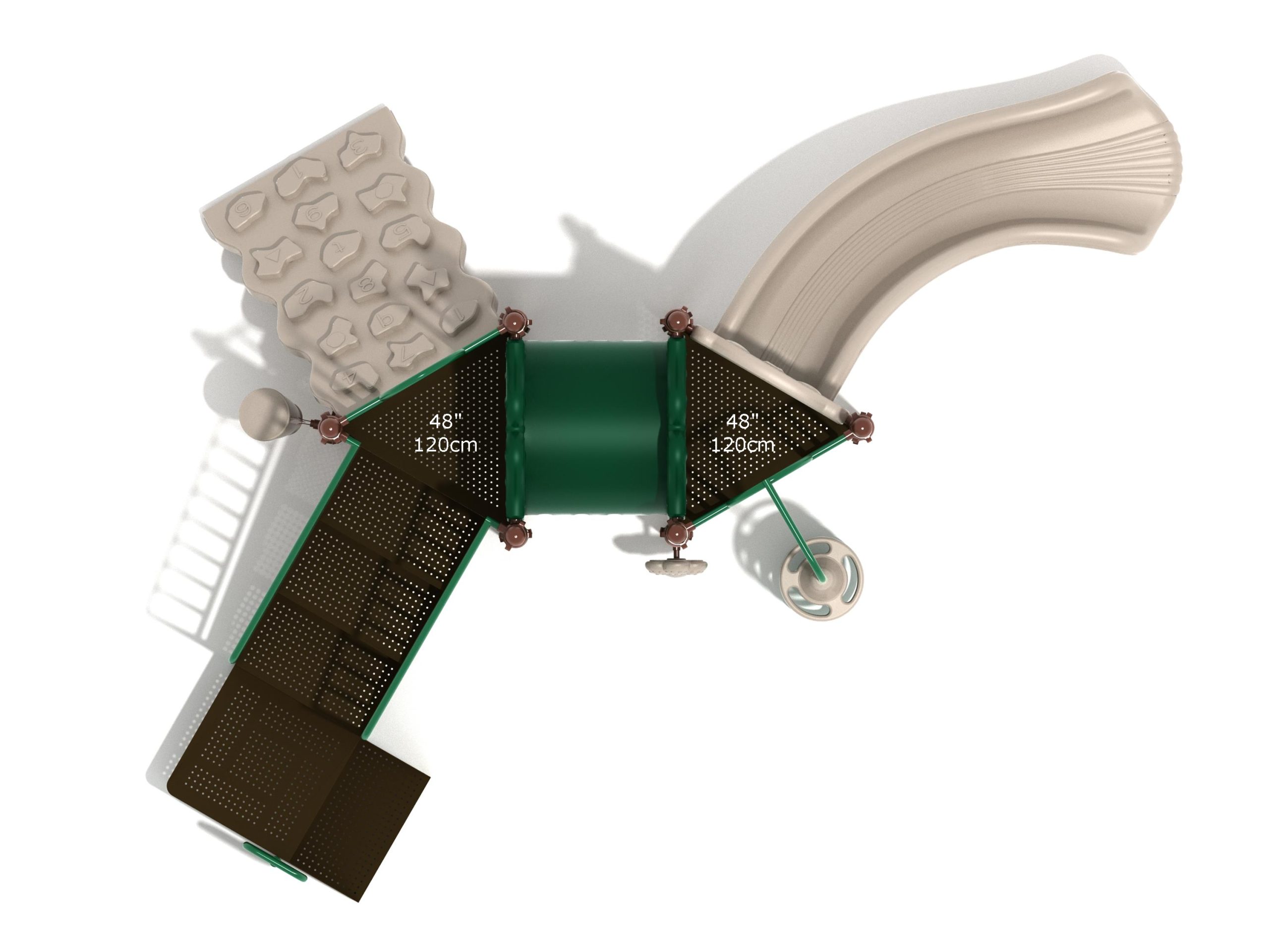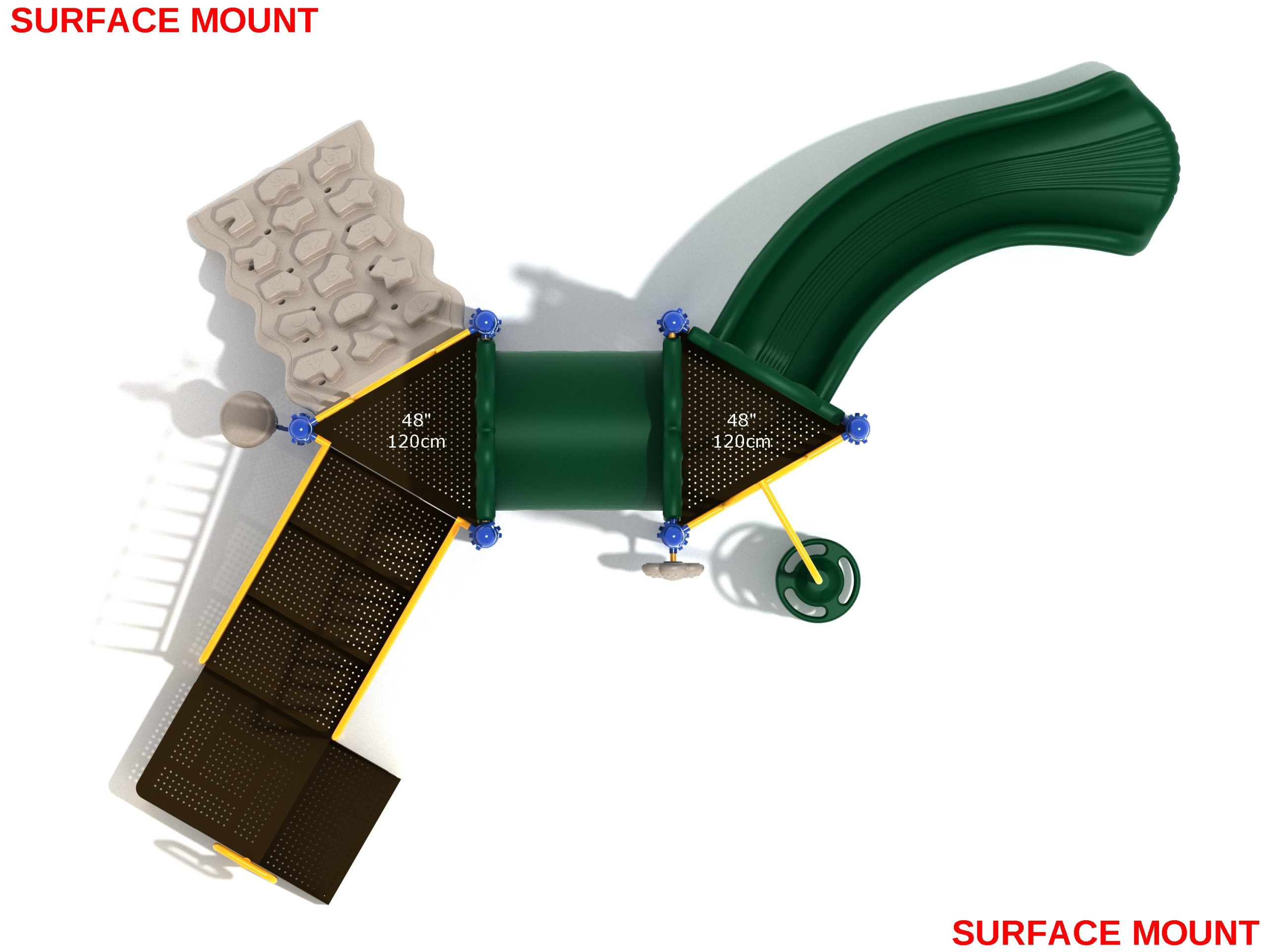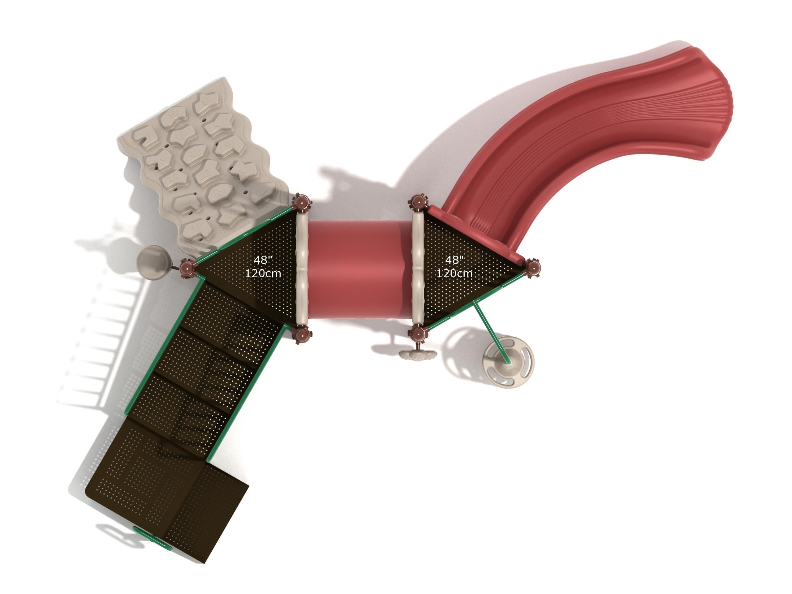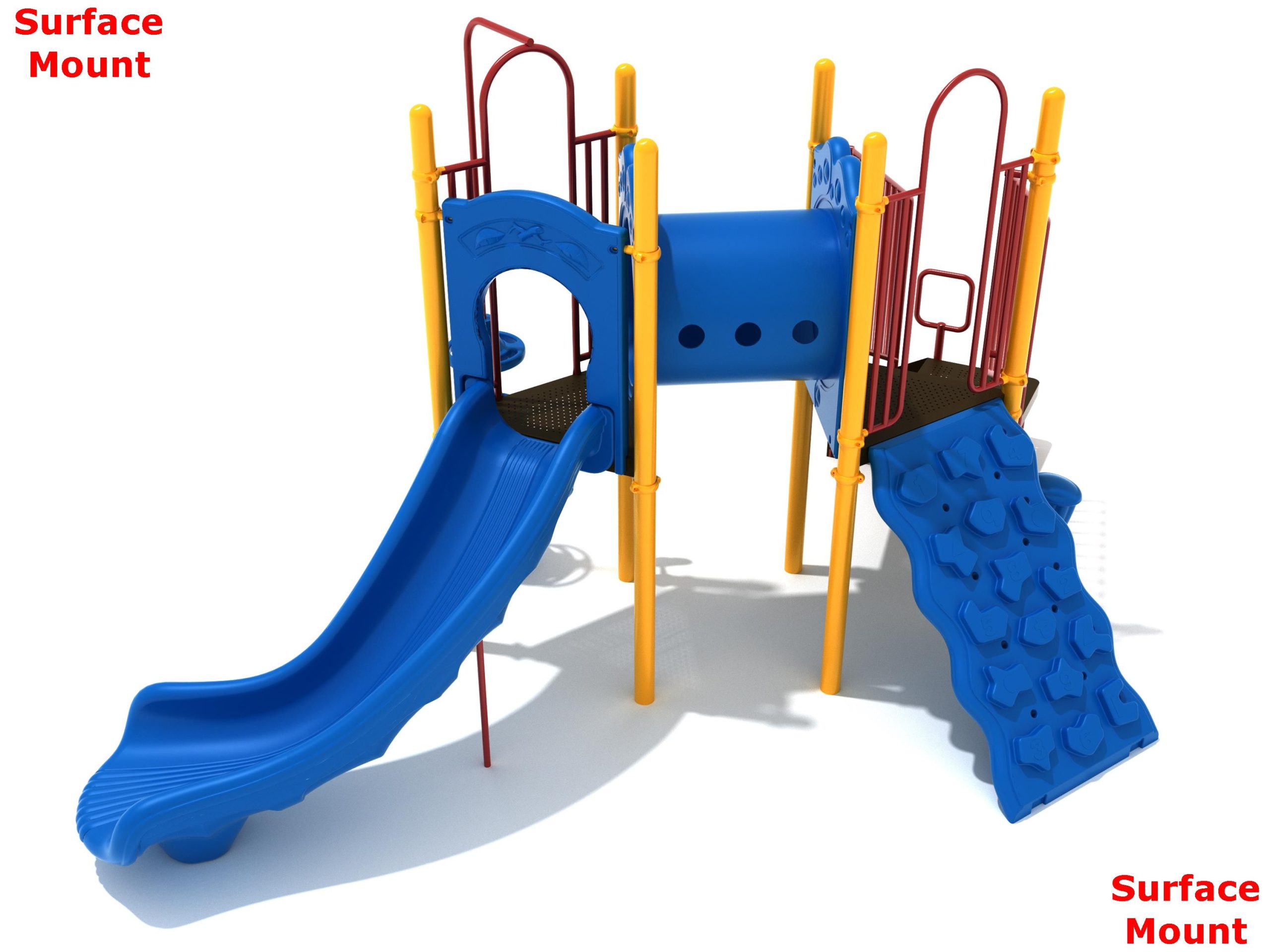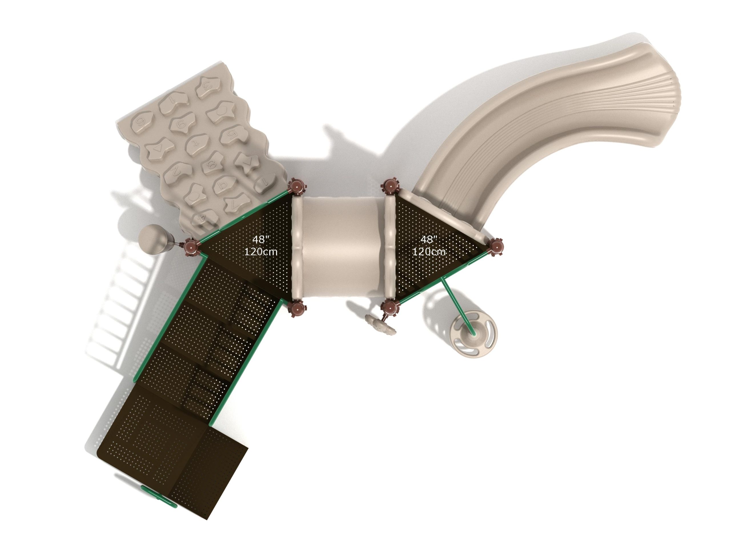 The Redmond play structure is will the hub of excitement on the playground that children will love to gather at. Made up of two triangular 48” elevated platforms that are connected by a tube bridge, this play structure is accessible by a number climber, a pod climber, or by stairs. Children can take a right turn slide that attaches itself to one of the triangular elevated platforms off of the play structure. A rain wheel and a single drum found on the ground level provide opportunities for on-ground play and also make the Redmond play structure ADA compliant. This play structure is sure to be one of the most popular places on the playground, and children will love to gather around it as well as play on it. It is a great deal. This play structure is designed for children who are between the ages of 2 and 12 years old.