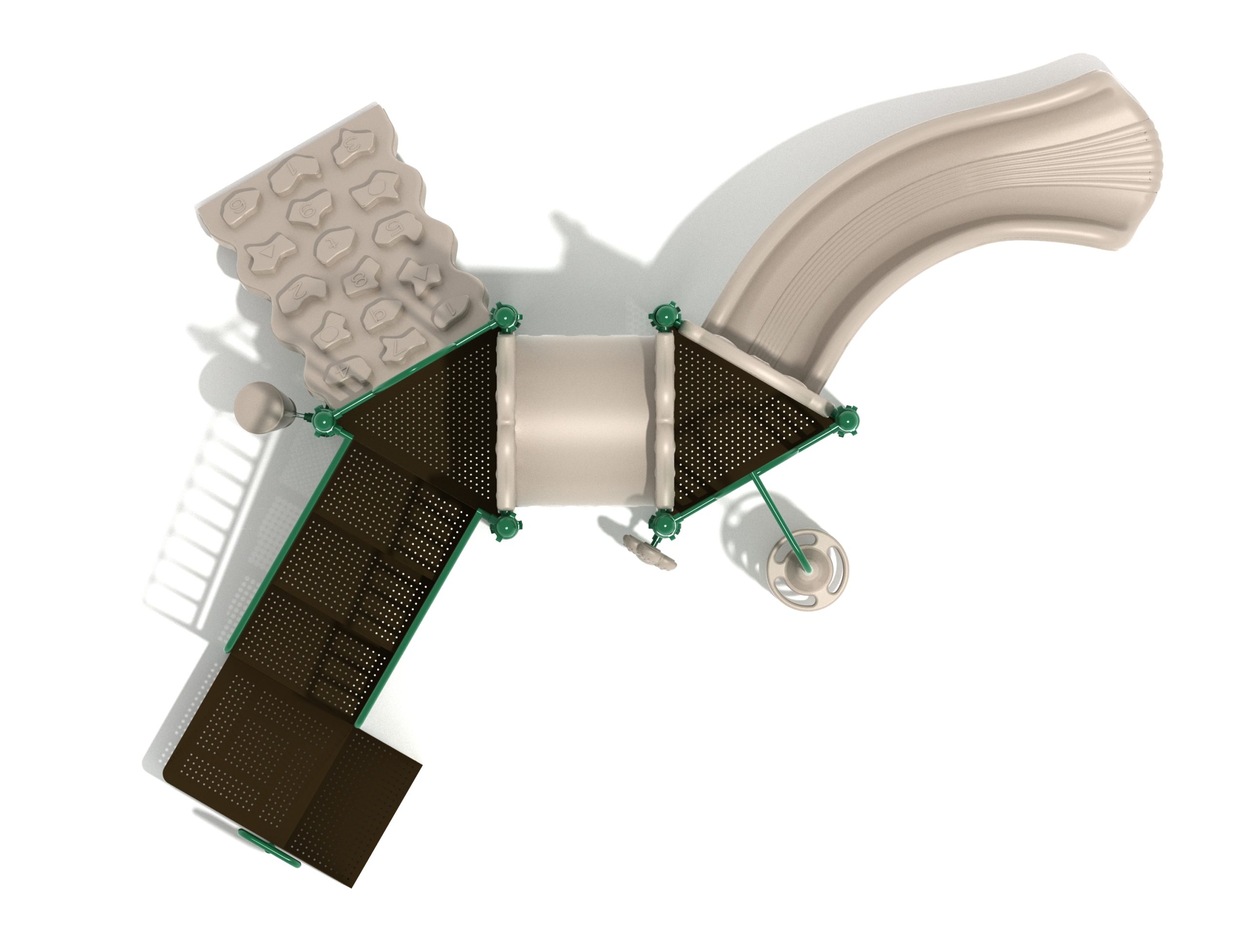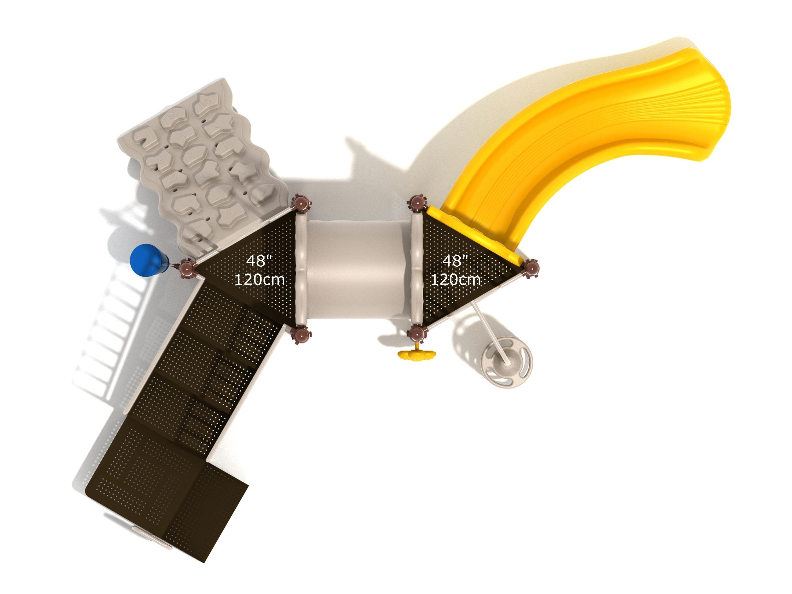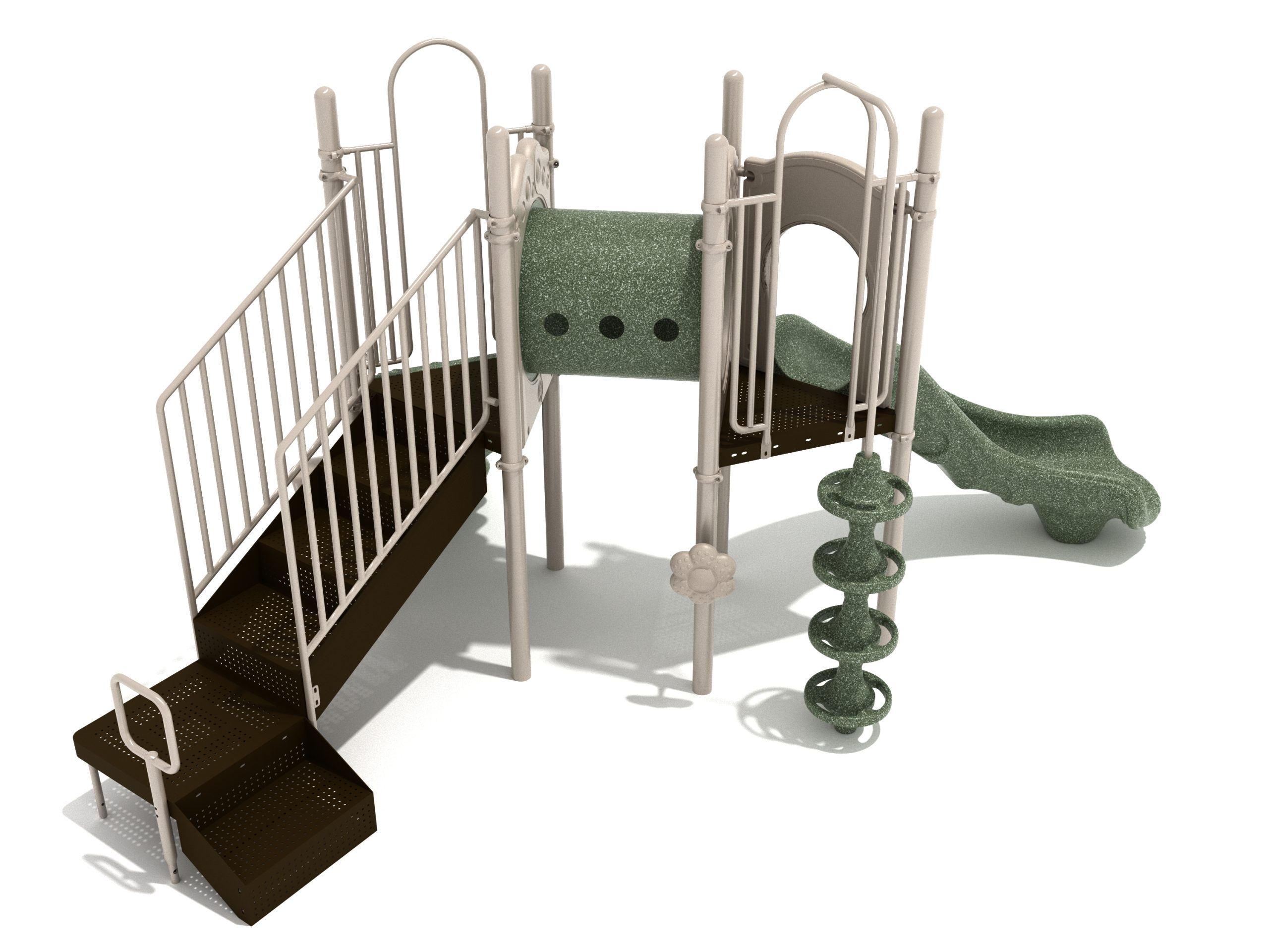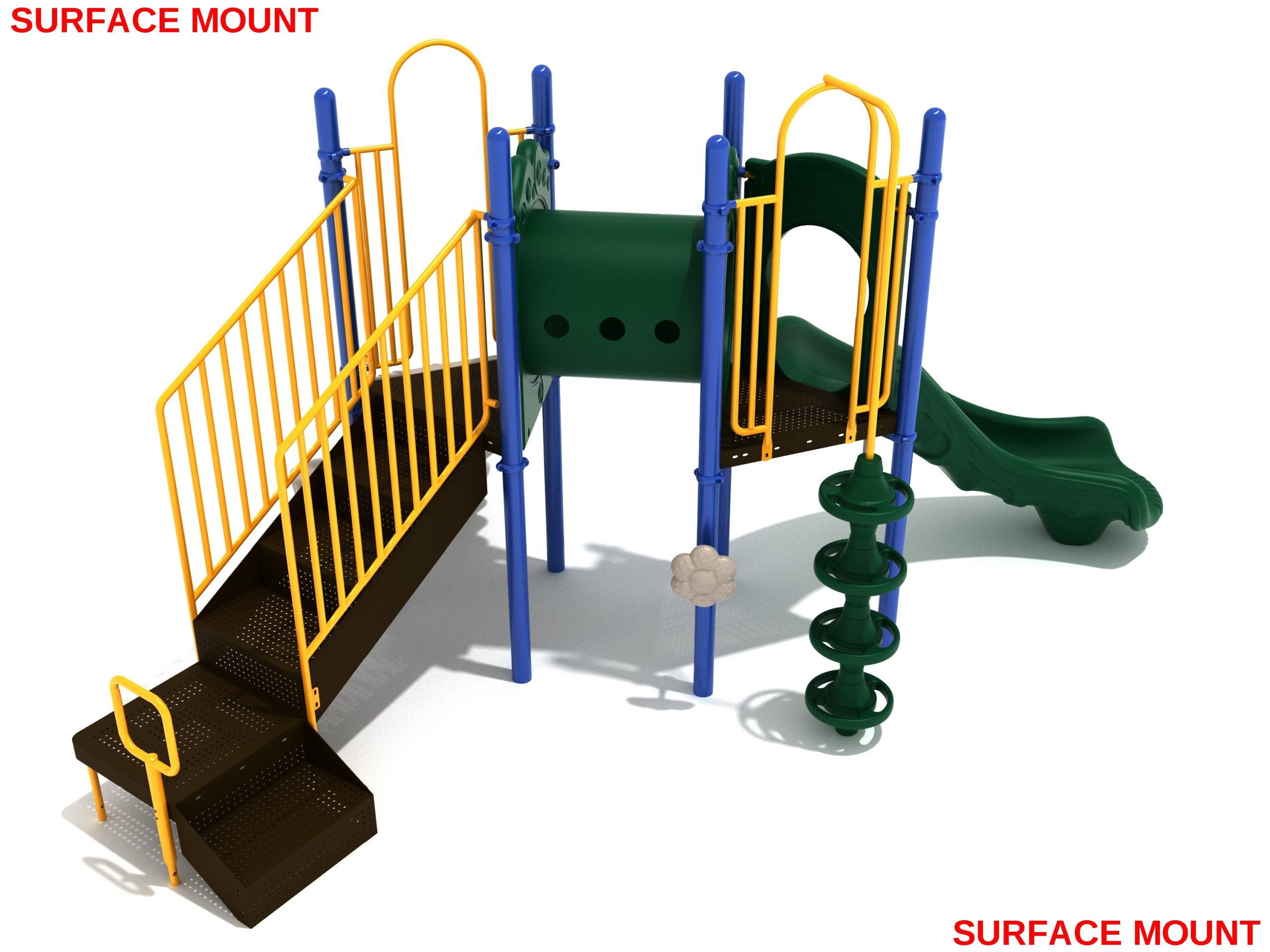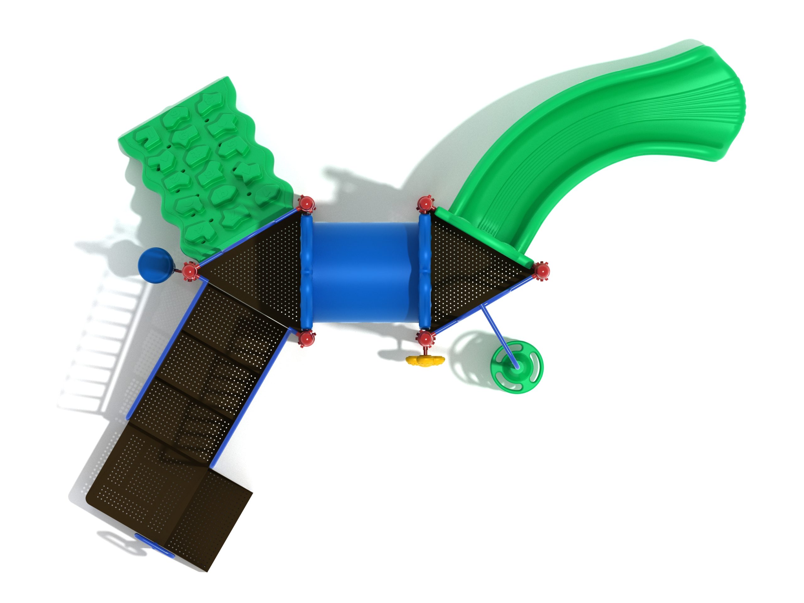 The Redmond play structure is will the hub of excitement on the playground that children will love to gather at. Made up of two triangular 48” elevated platforms that are connected by a tube bridge, this play structure is accessible by a number climber, a pod climber, or by stairs. Children can take a right turn slide that attaches itself to one of the triangular elevated platforms off of the play structure. A rain wheel and a single drum found on the ground level provide opportunities for on-ground play and also make the Redmond play structure ADA compliant. This play structure is sure to be one of the most popular places on the playground, and children will love to gather around it as well as play on it. It is a great deal. This play structure is designed for children who are between the ages of 2 and 12 years old.