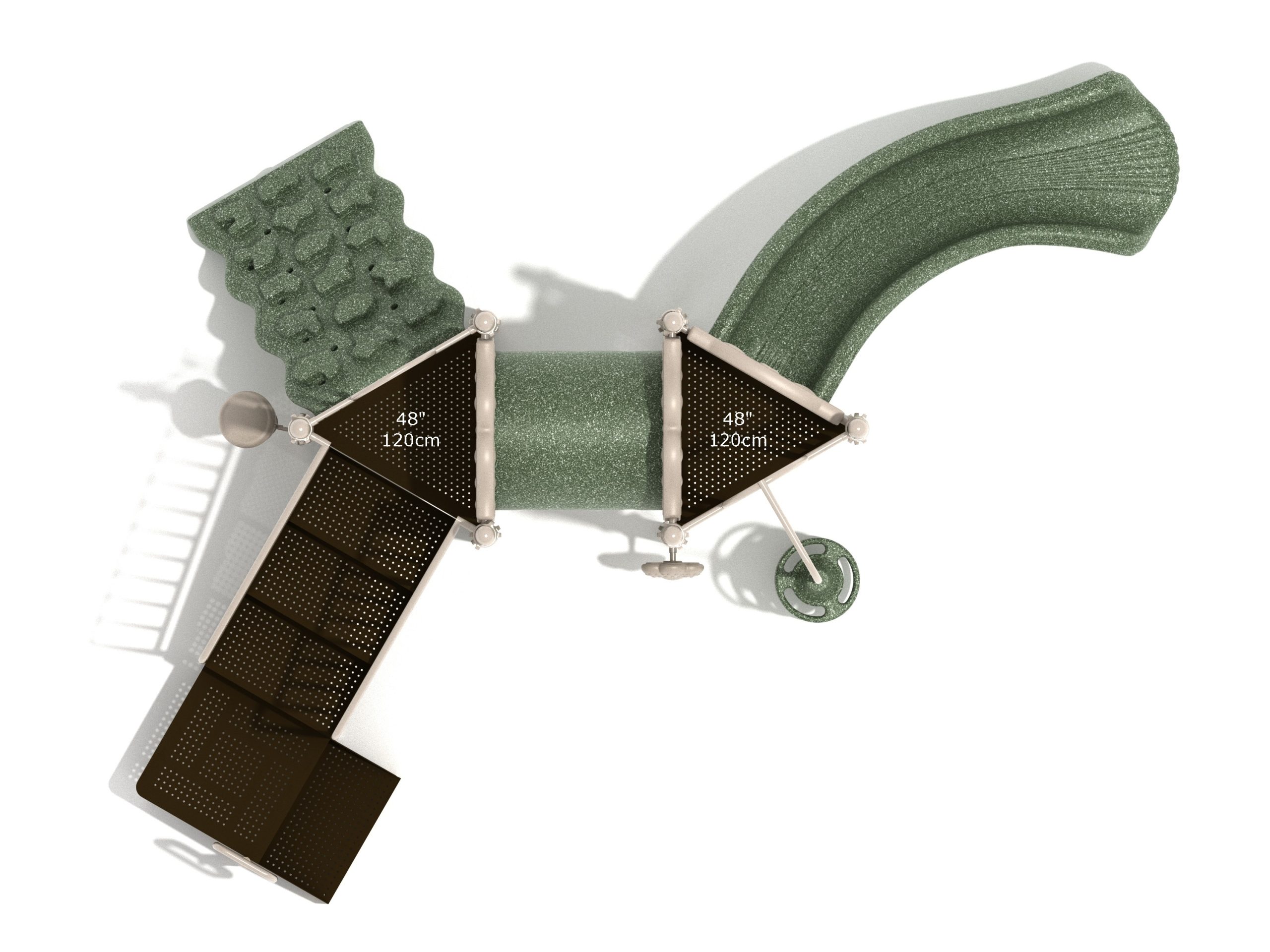 Starting at the Transfer Station entrance, kids can run and crawl their way through the covered Tube Bridge before twisting down the Right Turn Slide towards the ground. For kids thirsty for adventure there are two other ways to access the upper deck. A Pod Climber lets children use the circular platforms to stand on and the spaces are just the right size for small hands to pull themselves up. The Figure Climber on the other side of the structure places kids on the side of a rocky mountain as they grapple their way up the angular holds to reach the triangular platform. It’s even trickier trying to get down this way backwards as their feet will swing around looking for a suitable hold. A Rain Wheel is affixed to the bottom pole which can be spun around fast to create the sound of whooshing water and a Single Drum brings a welcomed sense of rhythm and melody to playtimes.