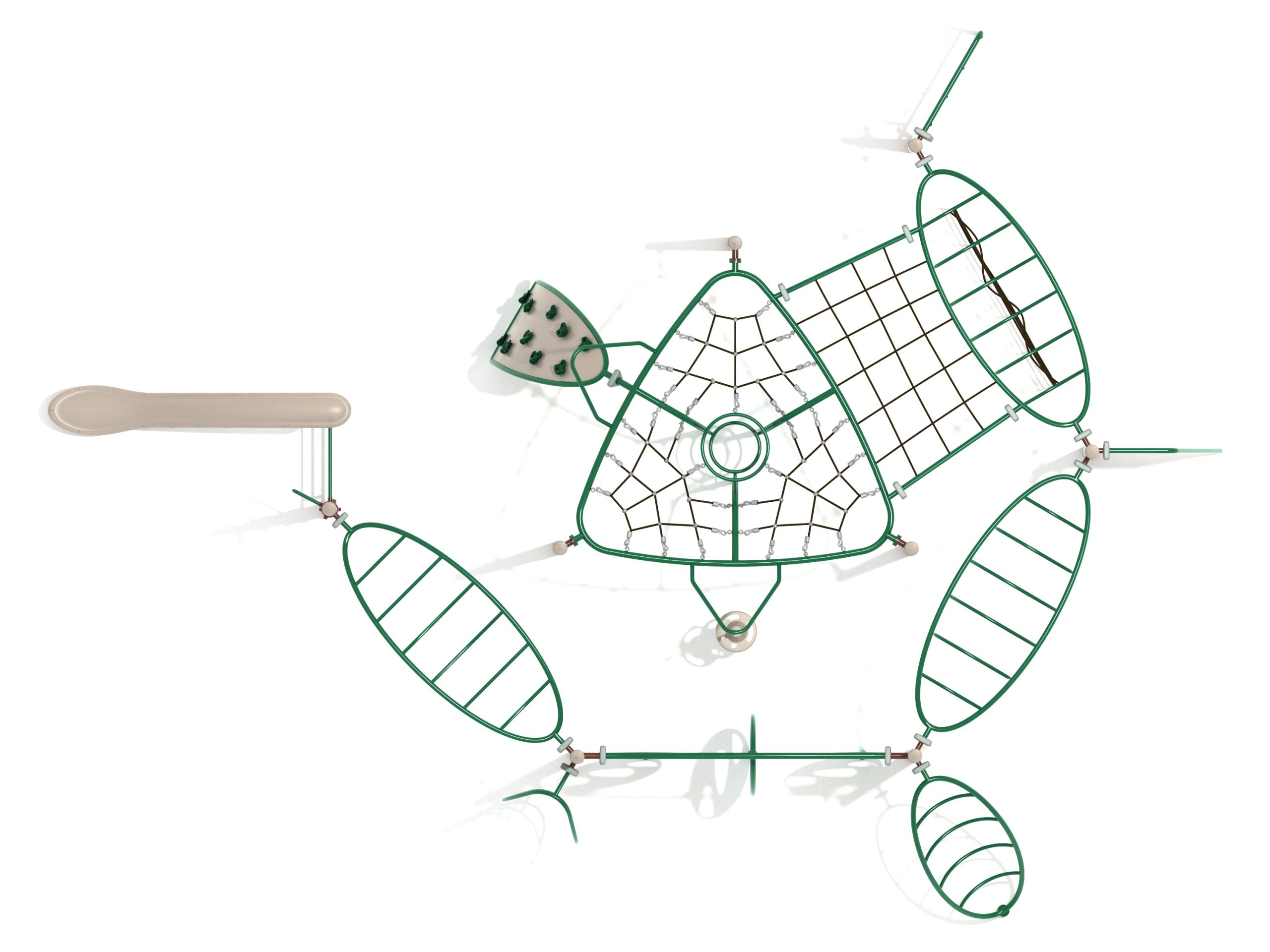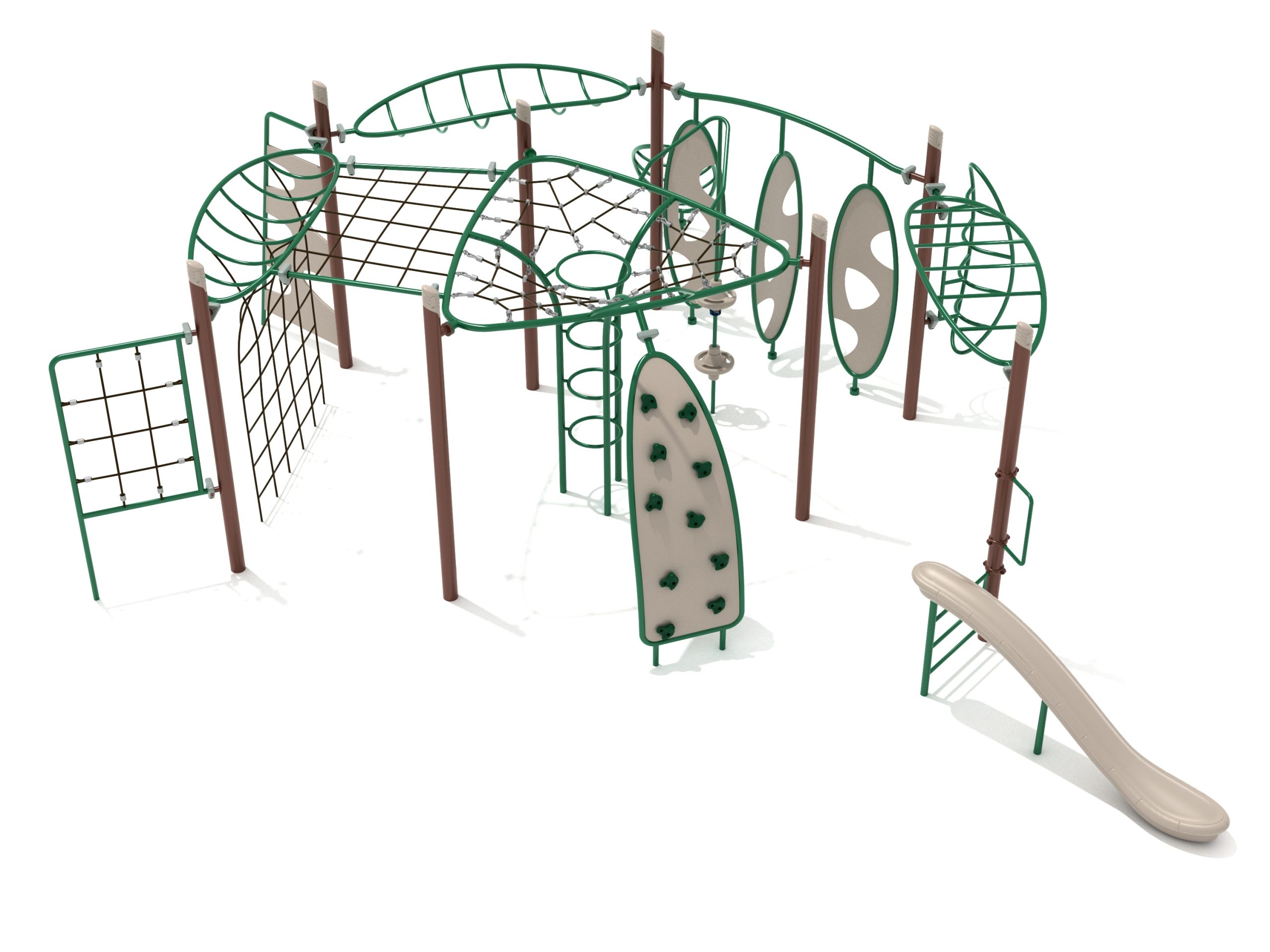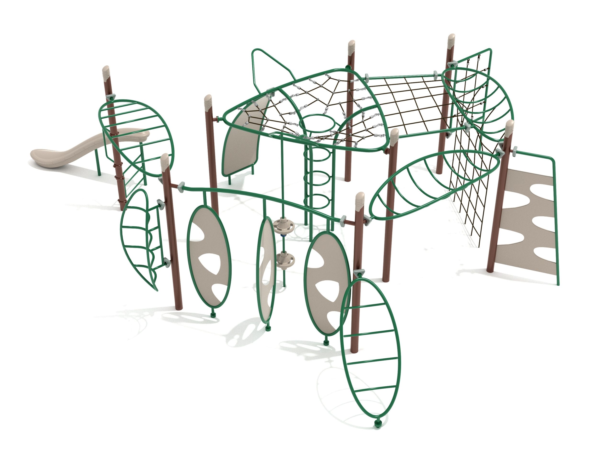 With two Overhead Horizon Climbers, an Overhead Rope Climber, and a Vertical Horizon Climber, kids will be able to test their climbing abilities to the max. Watch as kids swing their way around the structure on sturdy metal bars, ropes and chains, with a central Combination Manhole Rope Climber offering lots of potential for fun. The Overhead Inverted Horizon Climber with Rope Attachment lets children climb to the top of the net and then monkey bars their way to the next feature. The addition of a Pod Climber, Climber Attachment, and Triple Wing Climber ensures that there are multiple ways for children to test their skills as each one requires a different approach to scale it. The Leaf Climbing Wall is suitable for younger children to use too and brings a forest theme to the playset, and children can imagine they’re sliding down a huge fallen tree when they use the smooth surface of the Saddle Slide.