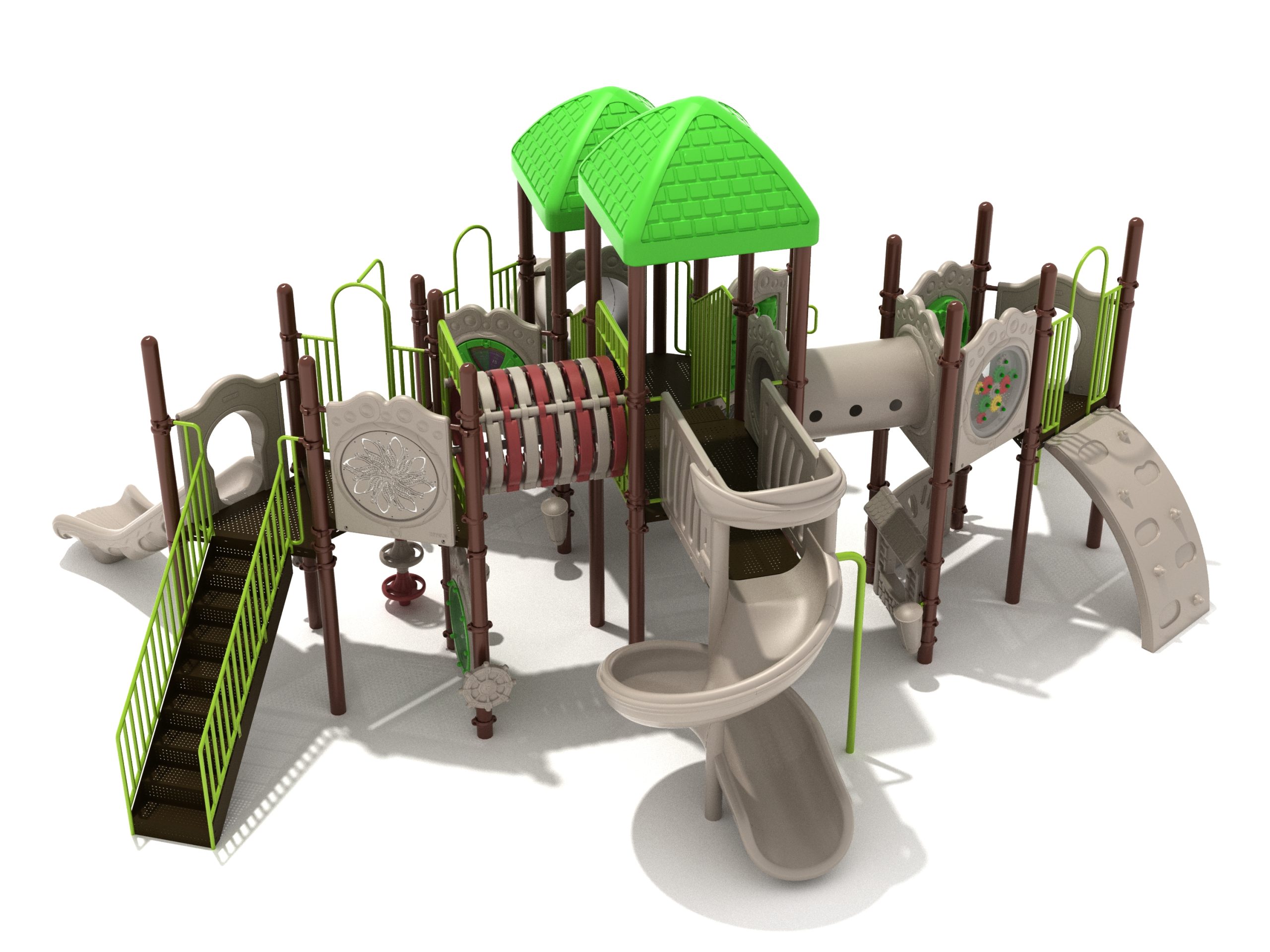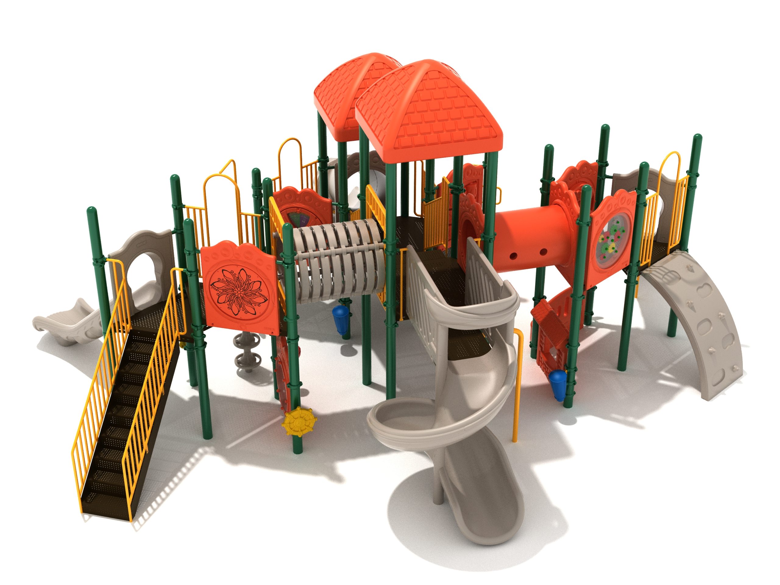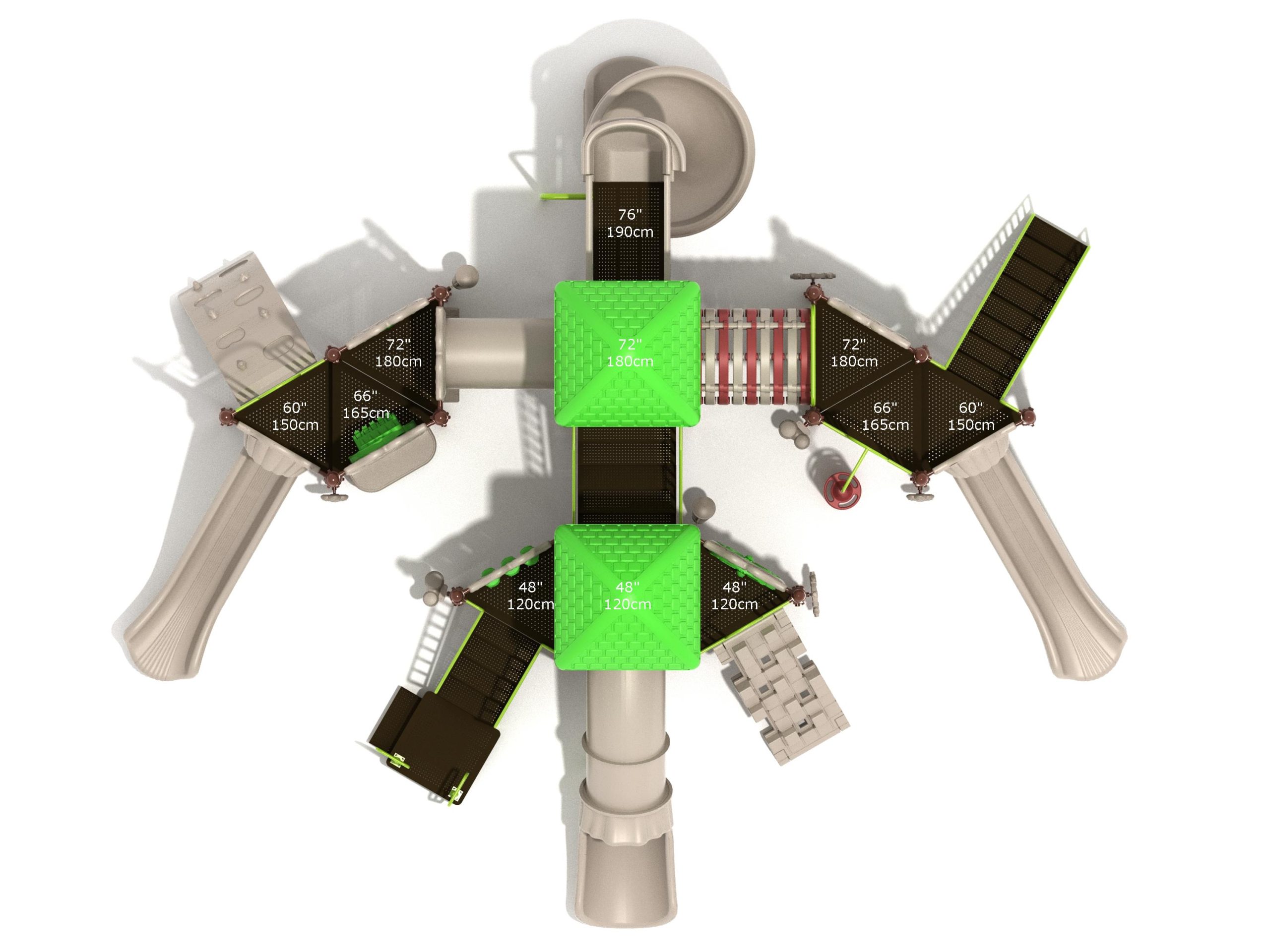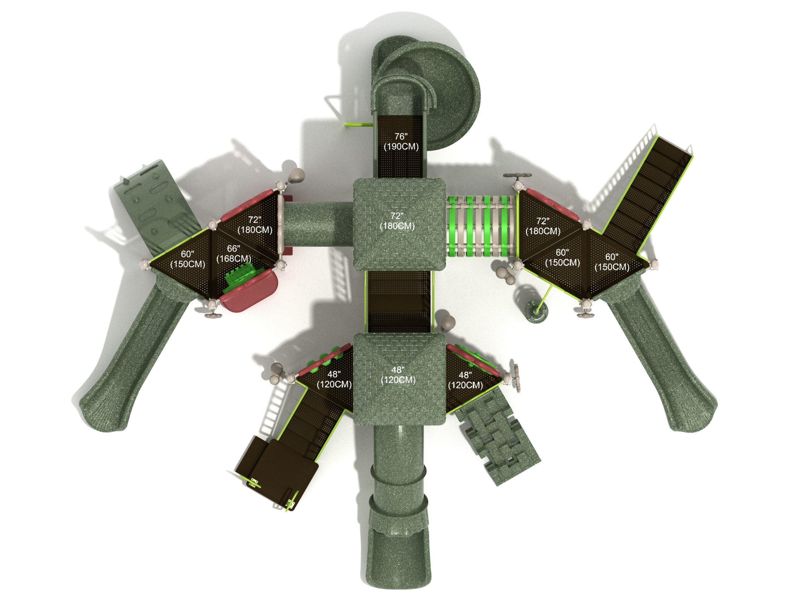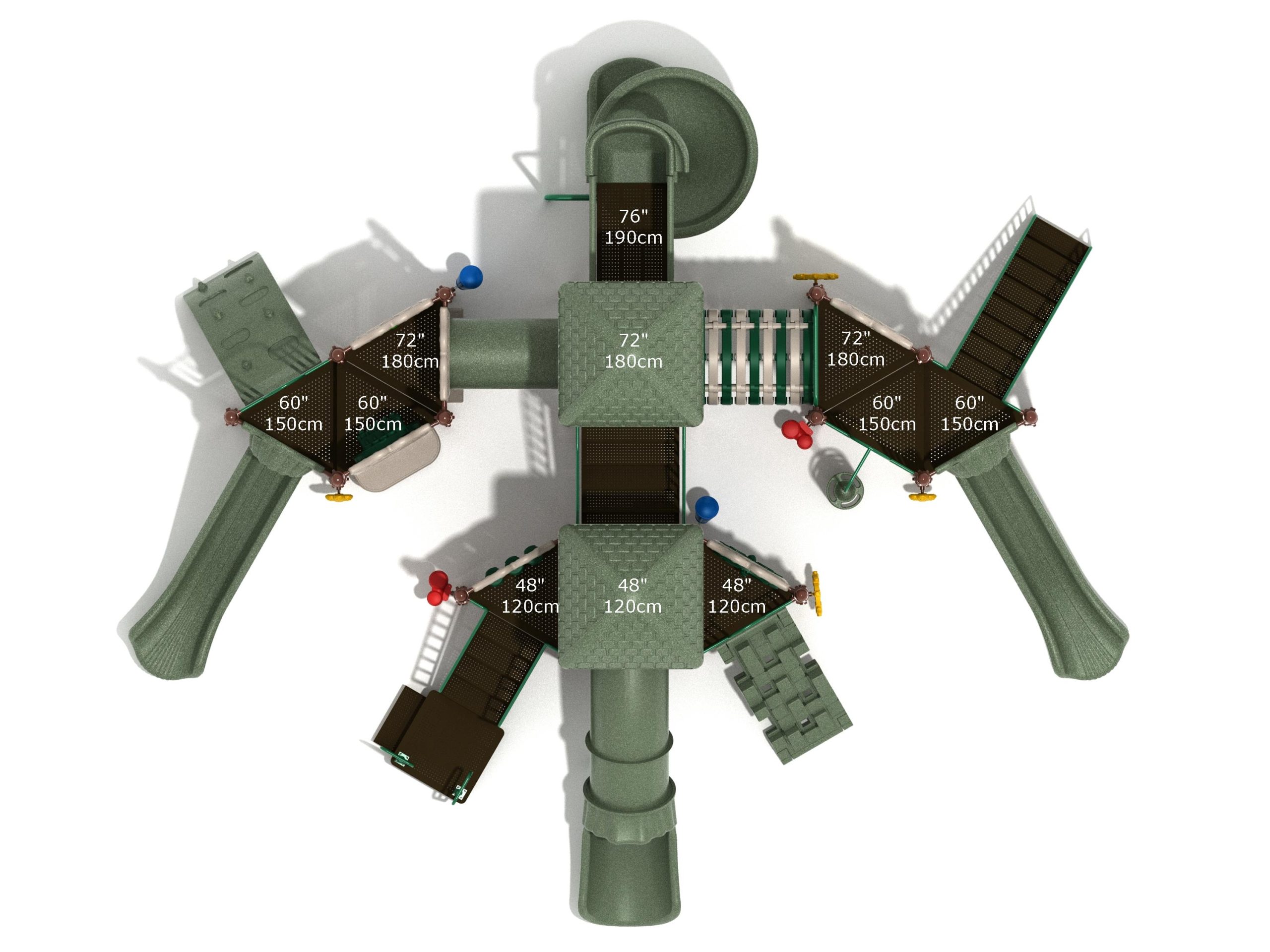 True to its name, the Roaring Fork is spread out in all four directions with a unique slide and a climber of its own. There are two easy-access stairways to mount the structure at two distant spots. At the top of one of these stairways is a 4-foot Tube Slide. The other two branches of the Roaring Fork each have a 5-foot-tall Straight Slide, offering a breezy ride down the deck. At the last and highest branch is a whopping 66-inch Spiral Slide that provides kids with a 360-degree view of the playground. The Fork also tests and polishes the climbing skills of kids with the curved and tilted Sea Creature Climber, Pixel Climber, and the vertical Pod Climber. Different activity panels are placed to ensure no kid is standing idle. Kids will have to lie down and crawl their way through at two points of the Fork, the thin Tube Bridge and the colorful Bones Tunnel. Musical instruments at the ground level also invite kids to experiment with sounds.