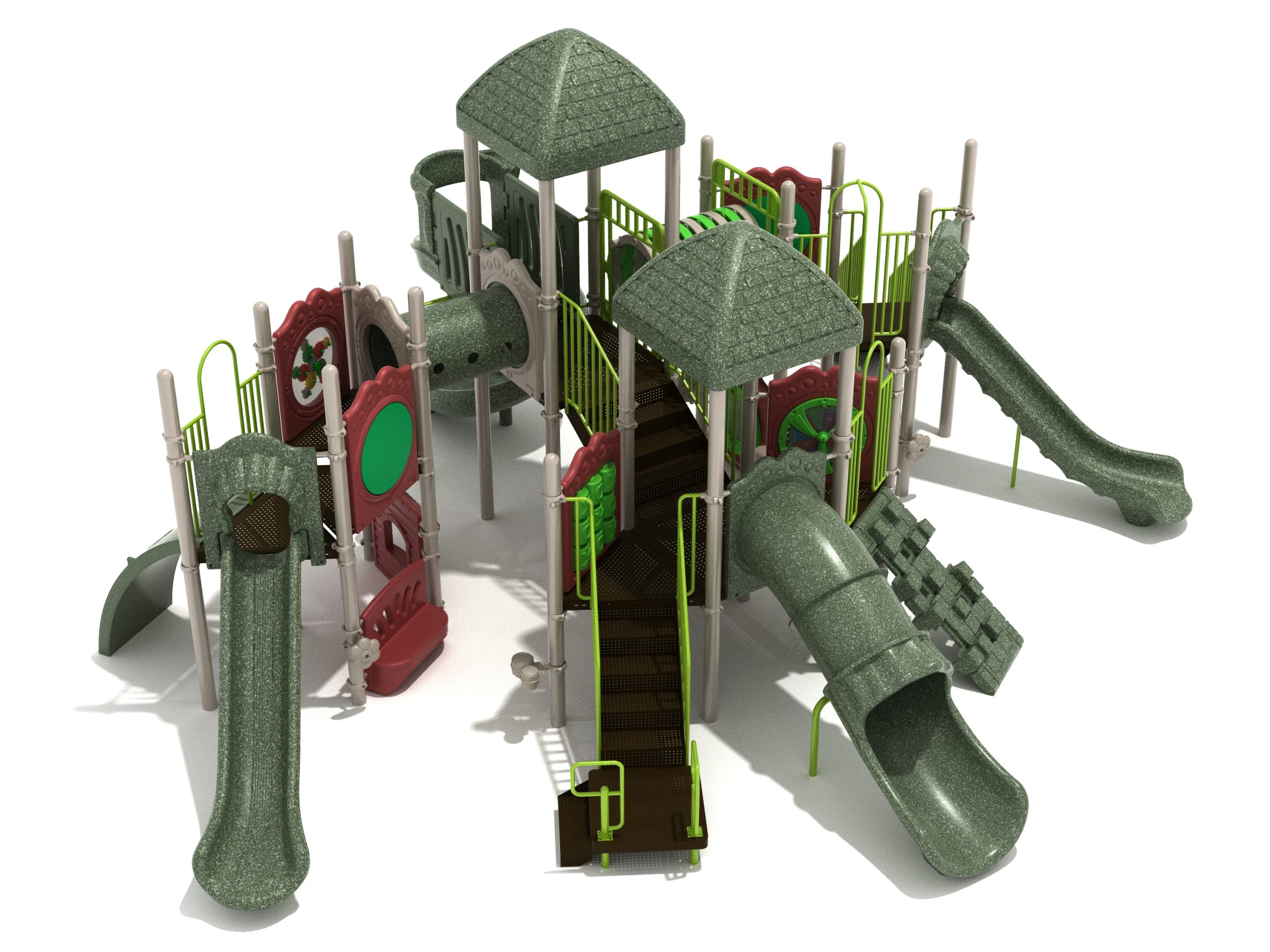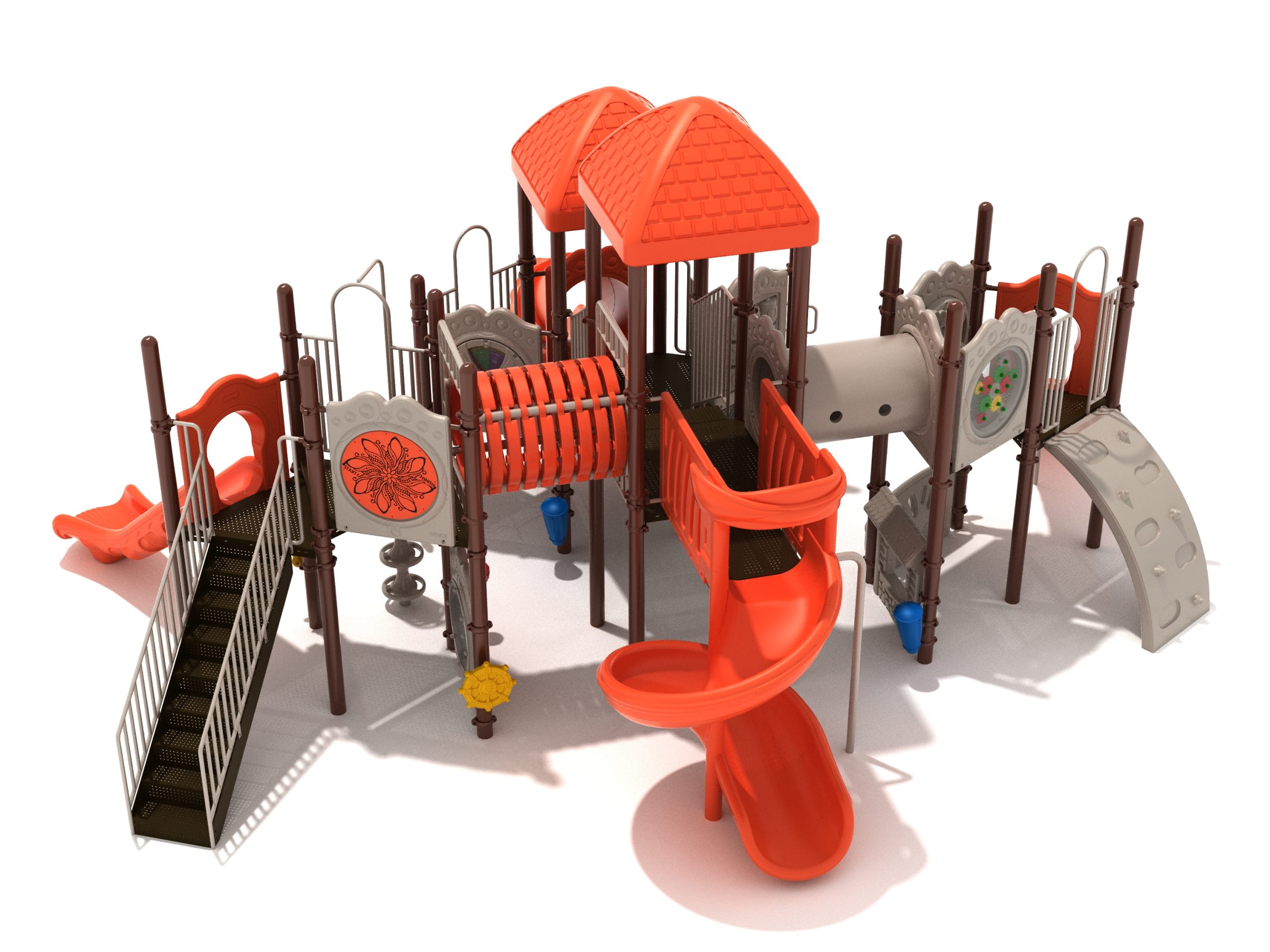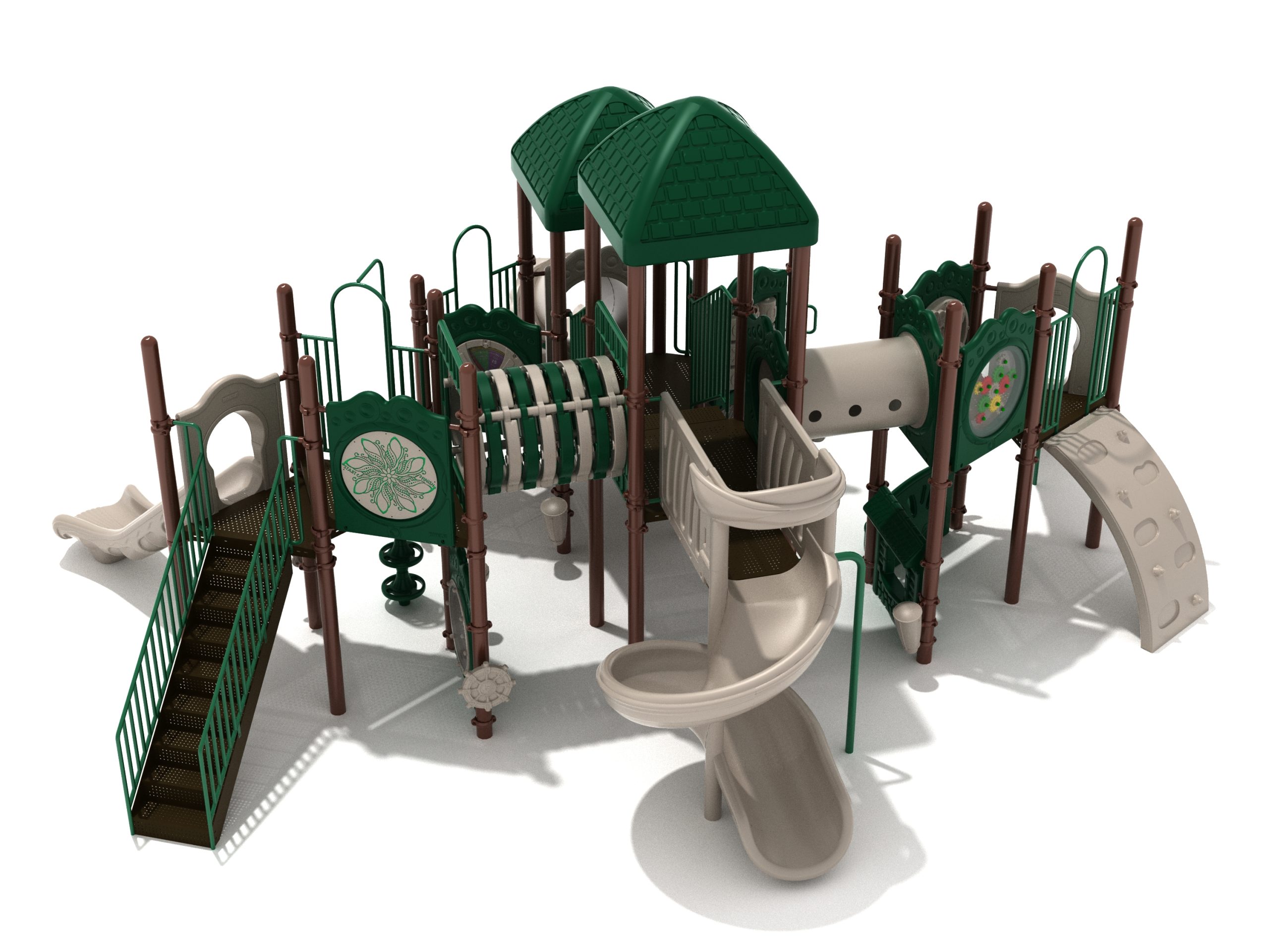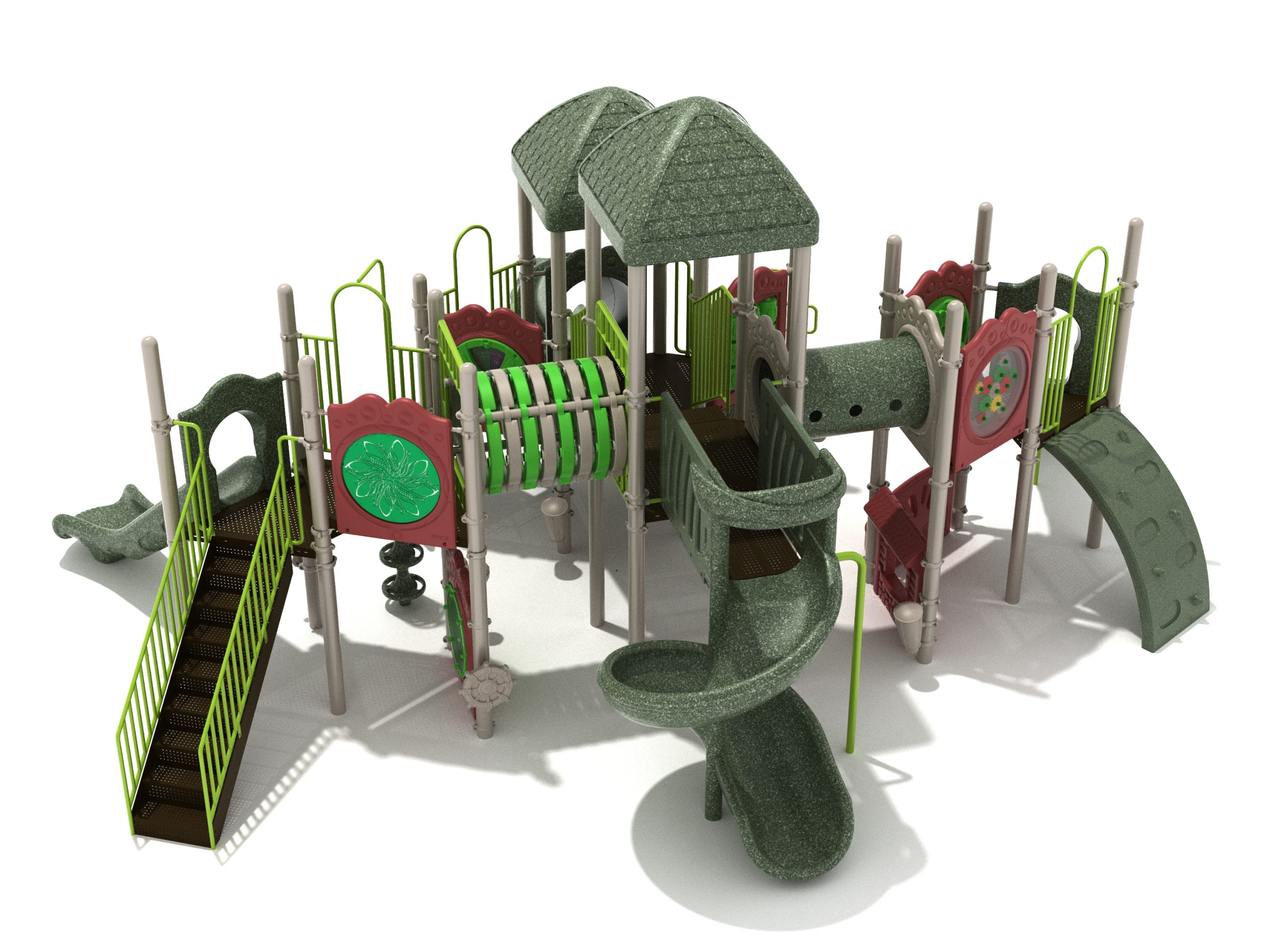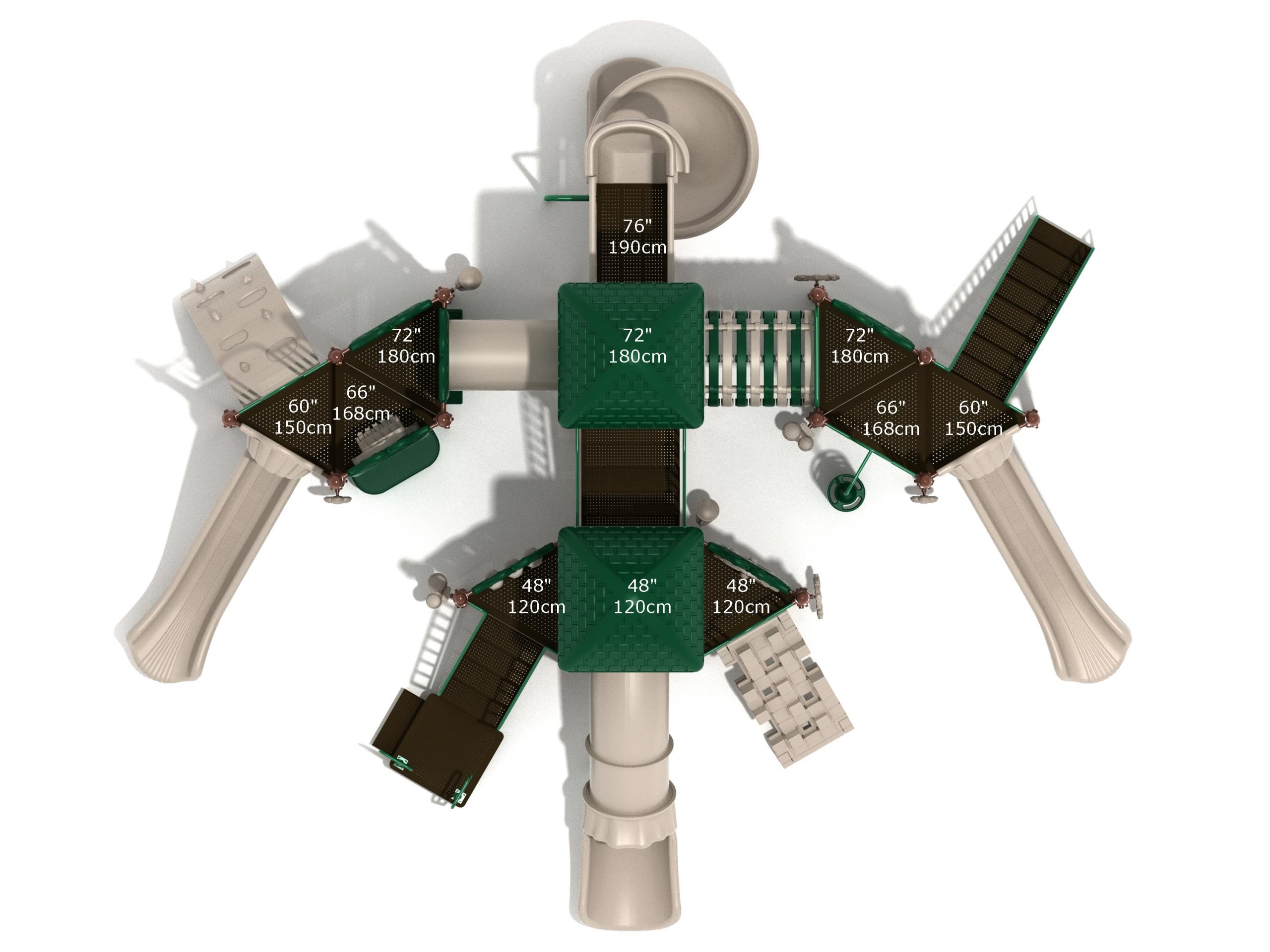 True to its name, the Roaring Fork is spread out in all four directions with a unique slide and a climber of its own. There are two easy-access stairways to mount the structure at two distant spots. At the top of one of these stairways is a 4-foot Tube Slide. The other two branches of the Roaring Fork each have a 5-foot-tall Straight Slide, offering a breezy ride down the deck. At the last and highest branch is a whopping 66-inch Spiral Slide that provides kids with a 360-degree view of the playground. The Fork also tests and polishes the climbing skills of kids with the curved and tilted Sea Creature Climber, Pixel Climber, and the vertical Pod Climber. Different activity panels are placed to ensure no kid is standing idle. Kids will have to lie down and crawl their way through at two points of the Fork, the thin Tube Bridge and the colorful Bones Tunnel. Musical instruments at the ground level also invite kids to experiment with sounds.