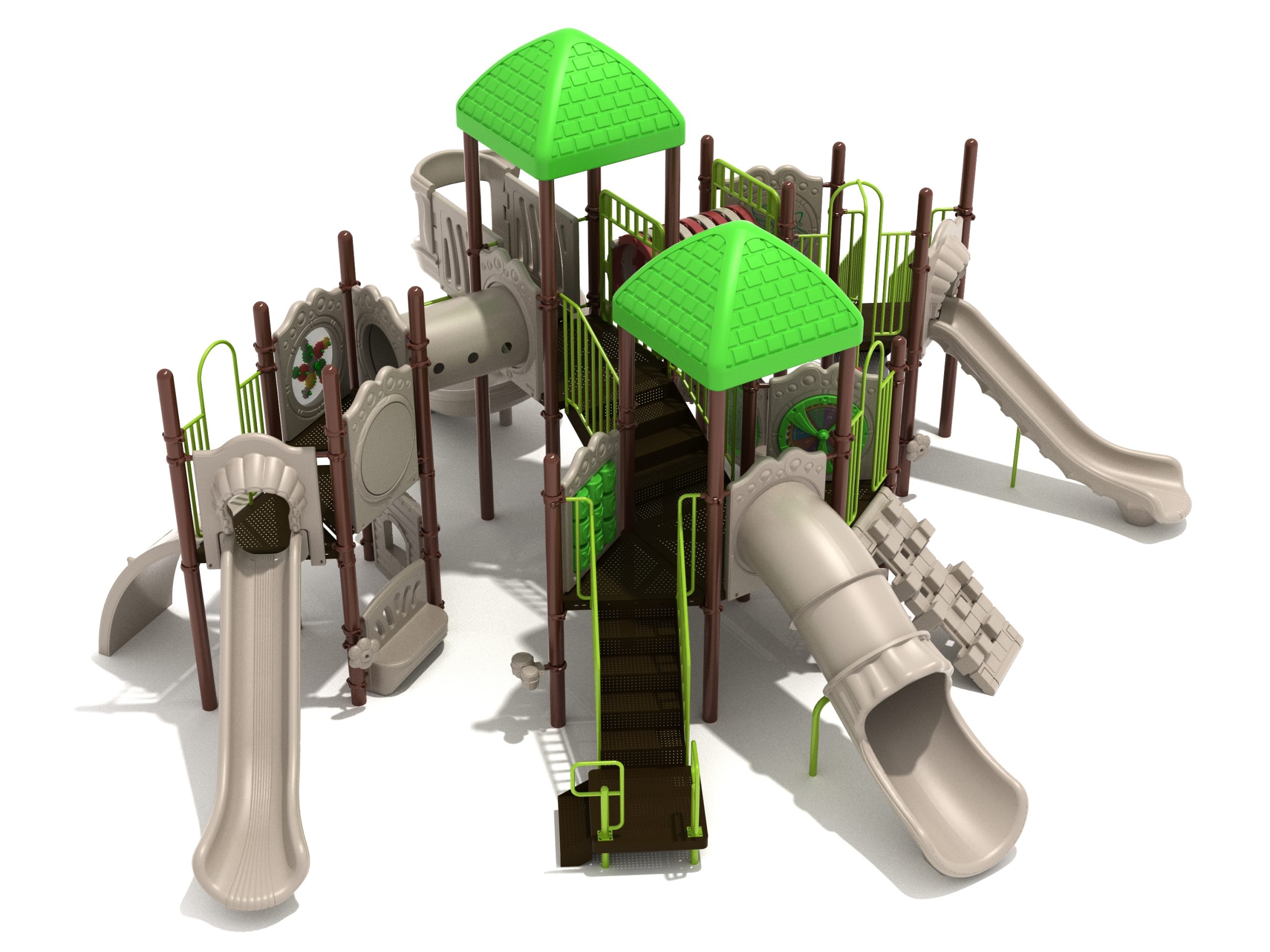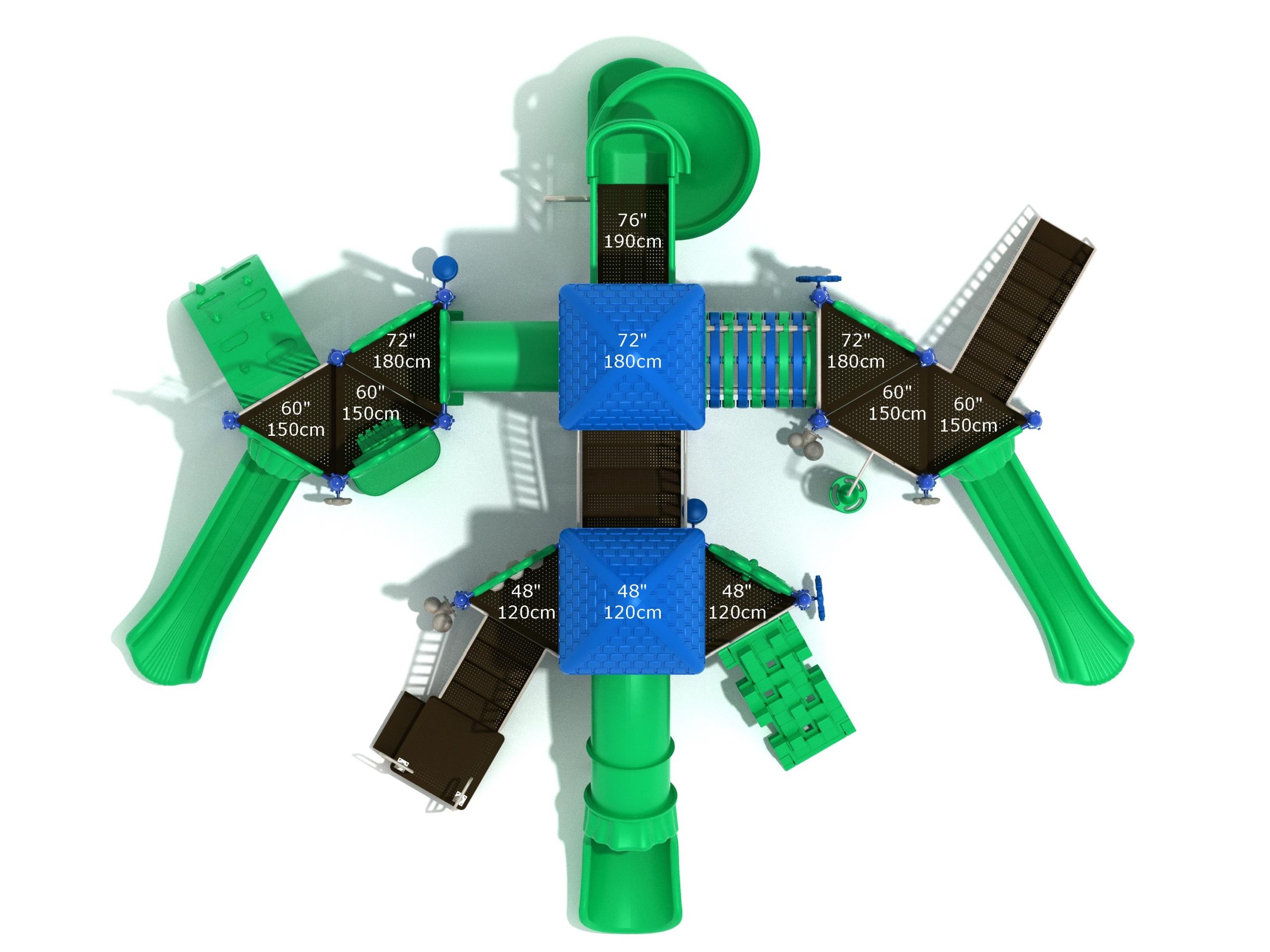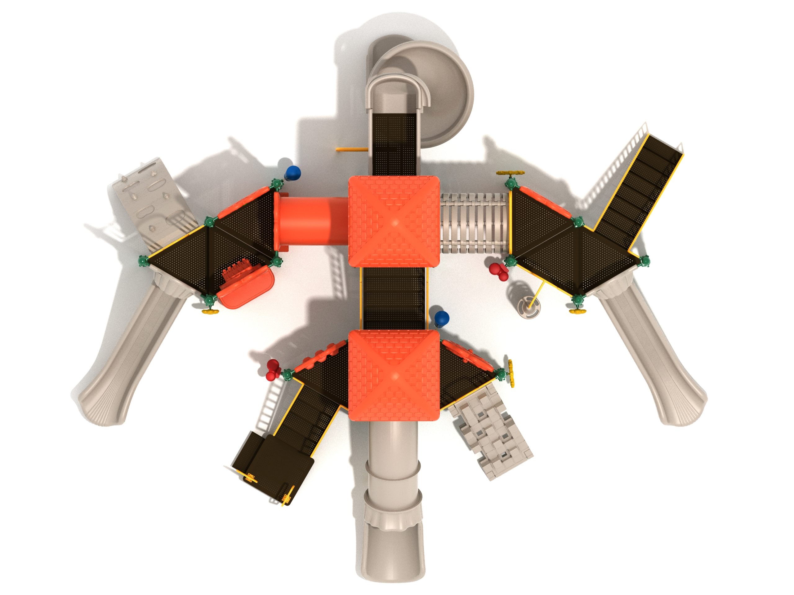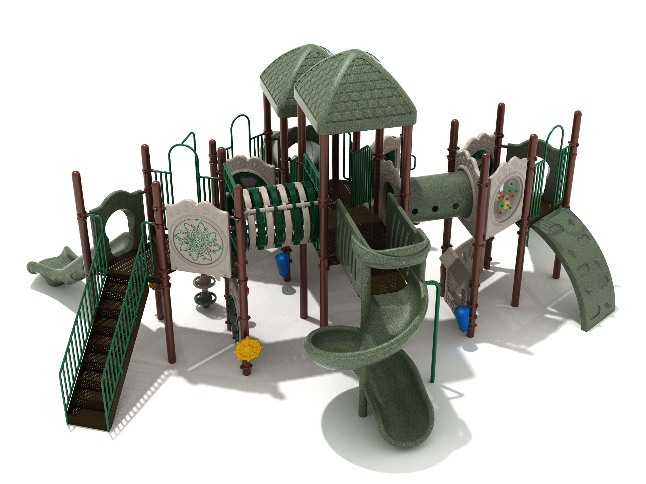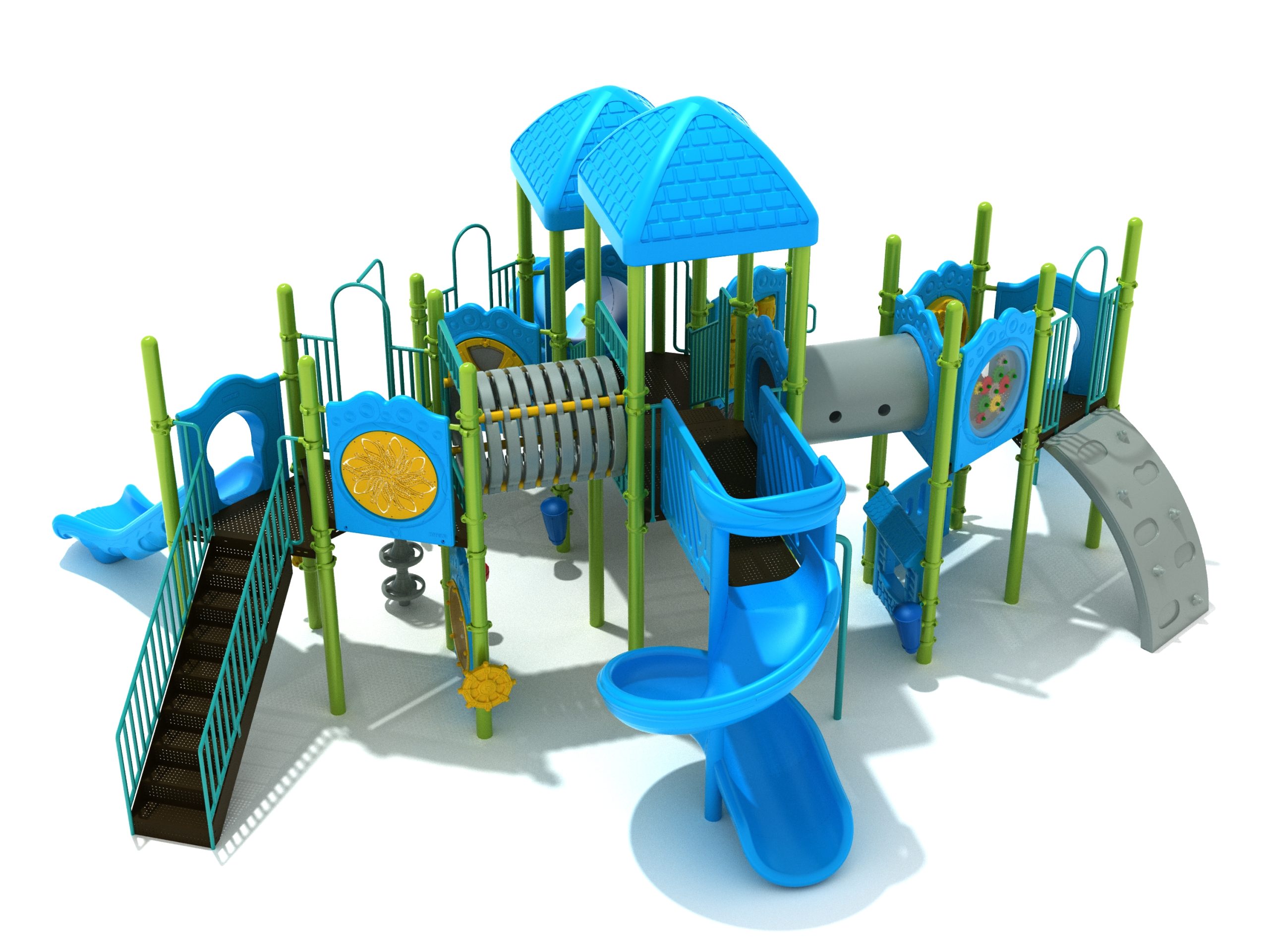 True to its name, the Roaring Fork is spread out in all four directions with a unique slide and a climber of its own. There are two easy-access stairways to mount the structure at two distant spots. At the top of one of these stairways is a 4-foot Tube Slide. The other two branches of the Roaring Fork each have a 5-foot-tall Straight Slide, offering a breezy ride down the deck. At the last and highest branch is a whopping 66-inch Spiral Slide that provides kids with a 360-degree view of the playground. The Fork also tests and polishes the climbing skills of kids with the curved and tilted Sea Creature Climber, Pixel Climber, and the vertical Pod Climber. Different activity panels are placed to ensure no kid is standing idle. Kids will have to lie down and crawl their way through at two points of the Fork, the thin Tube Bridge and the colorful Bones Tunnel. Musical instruments at the ground level also invite kids to experiment with sounds.
