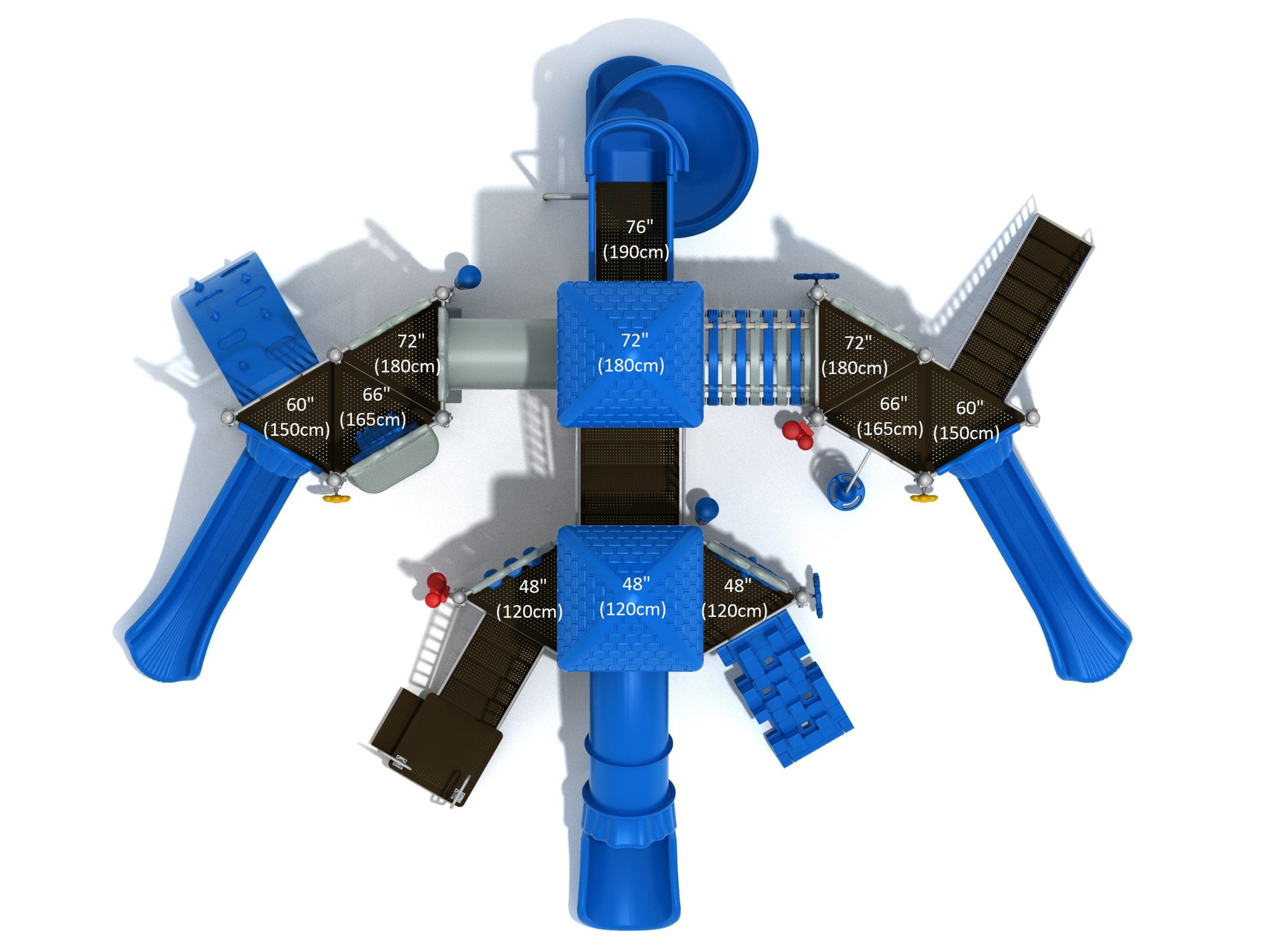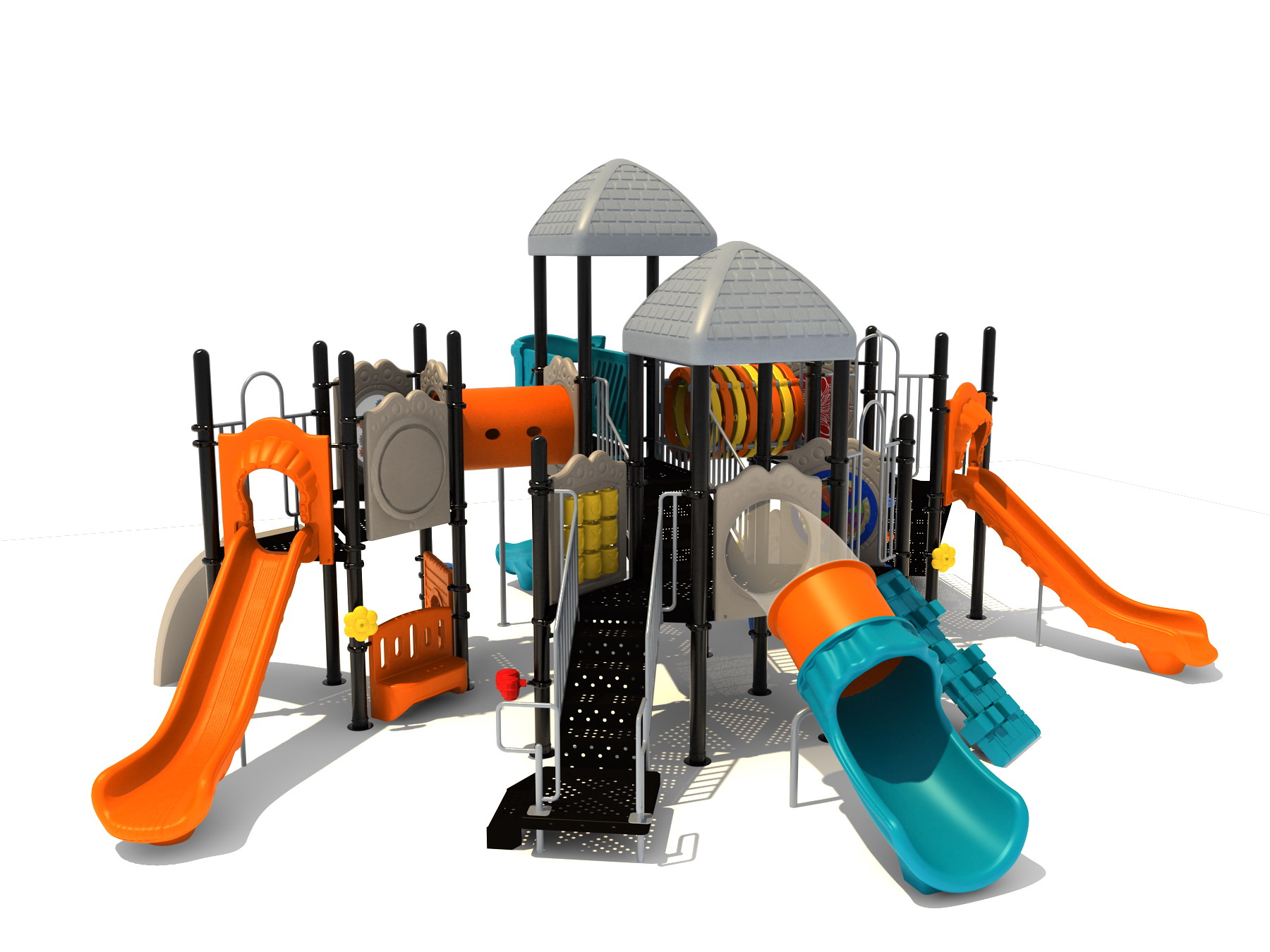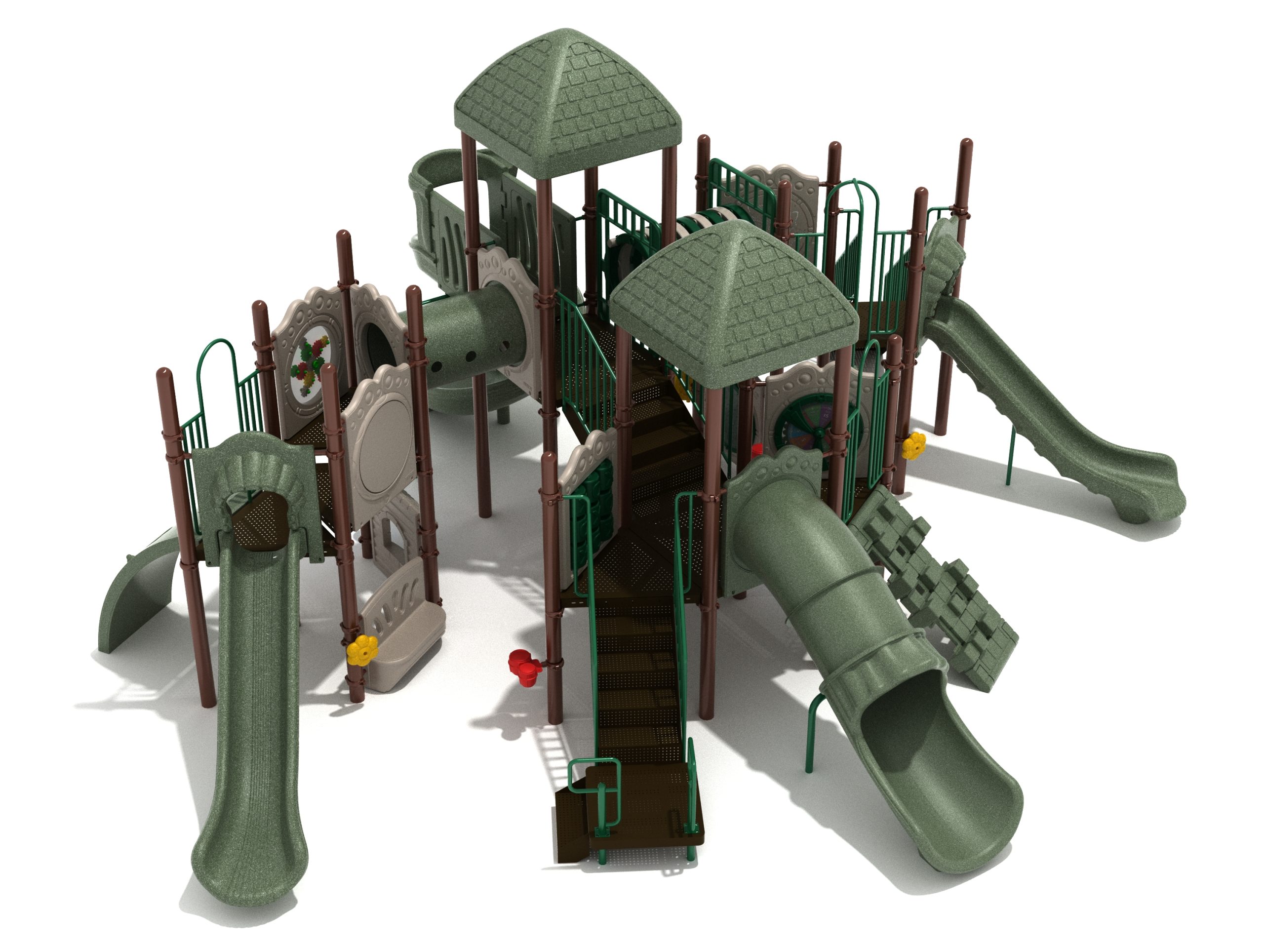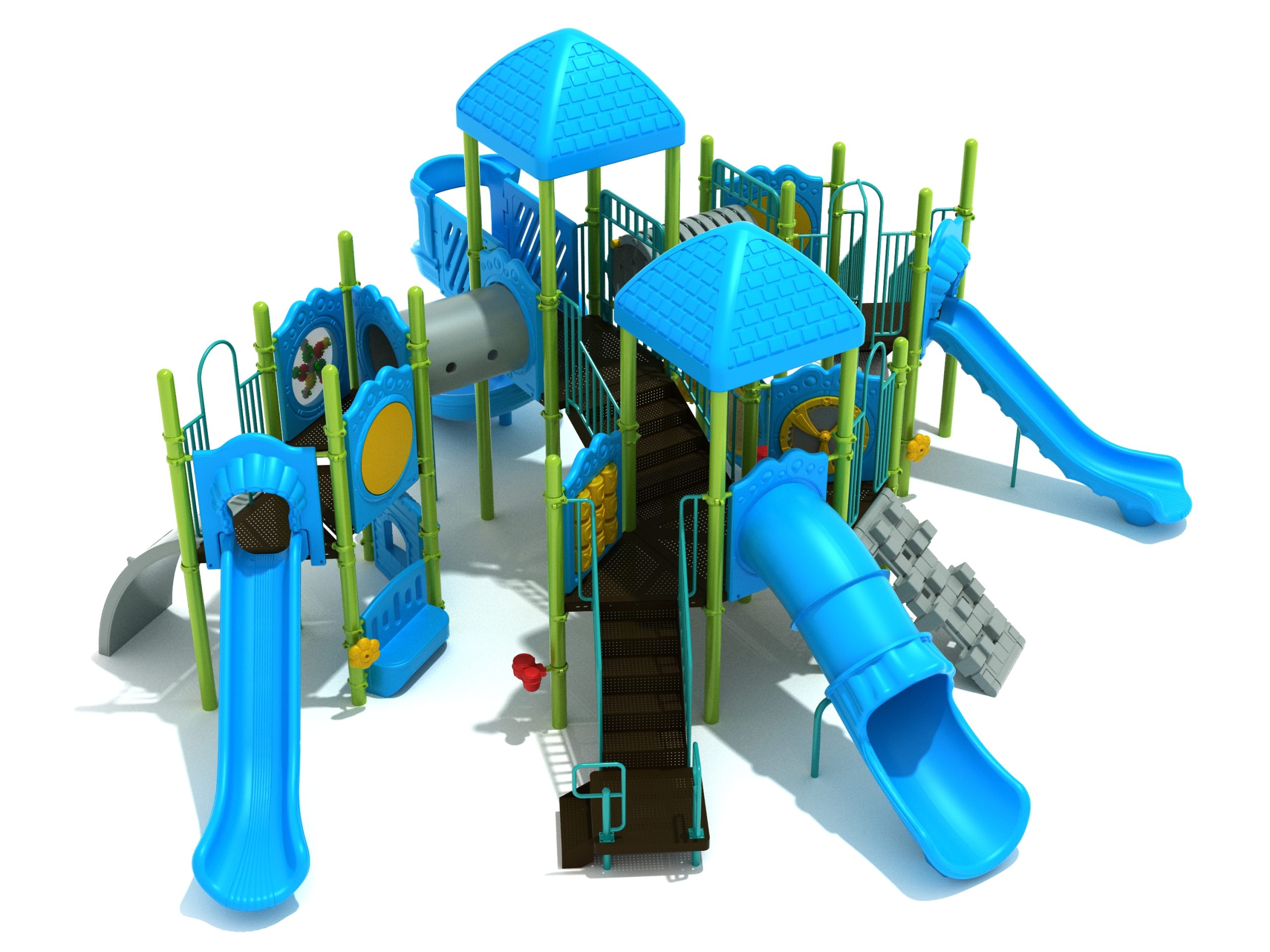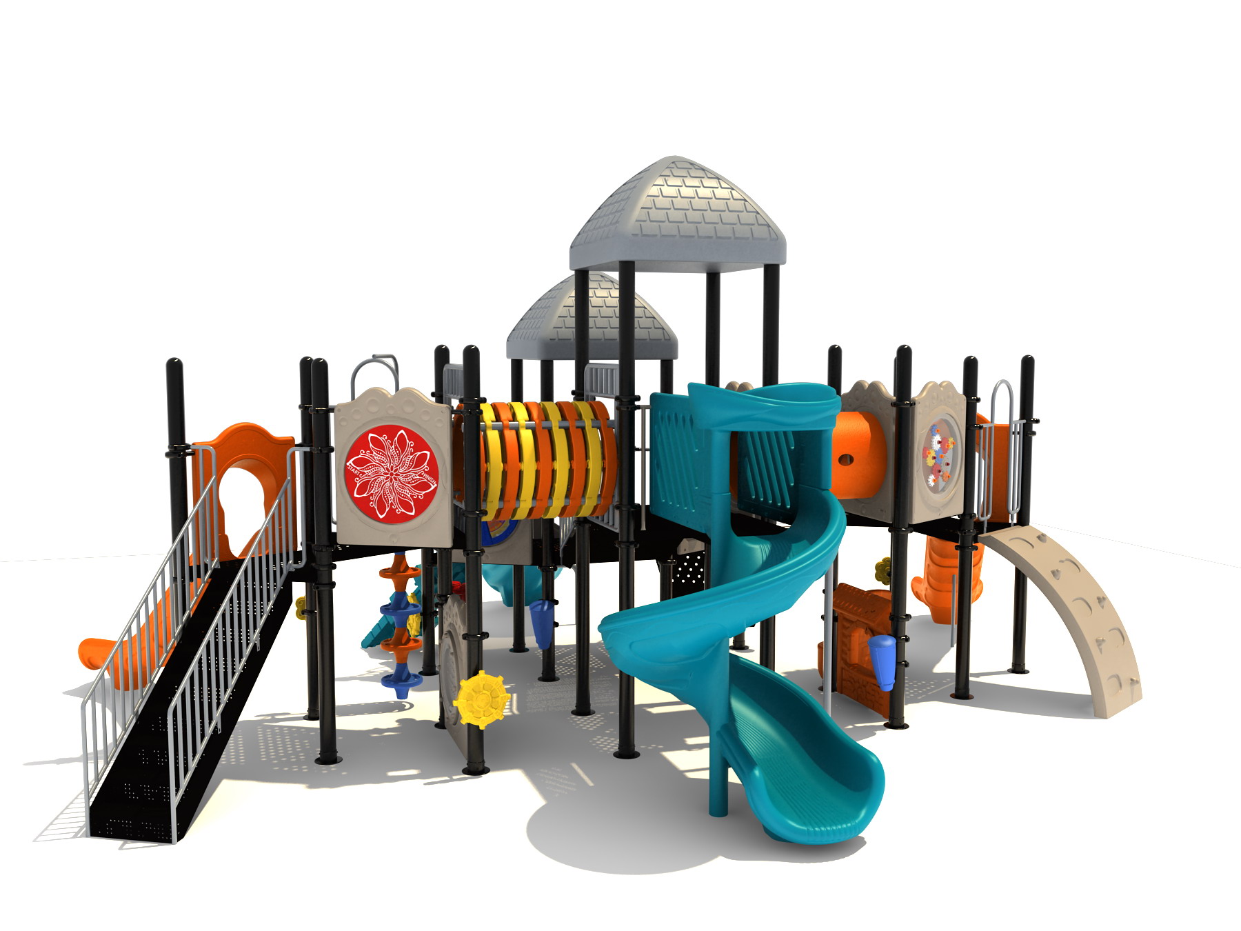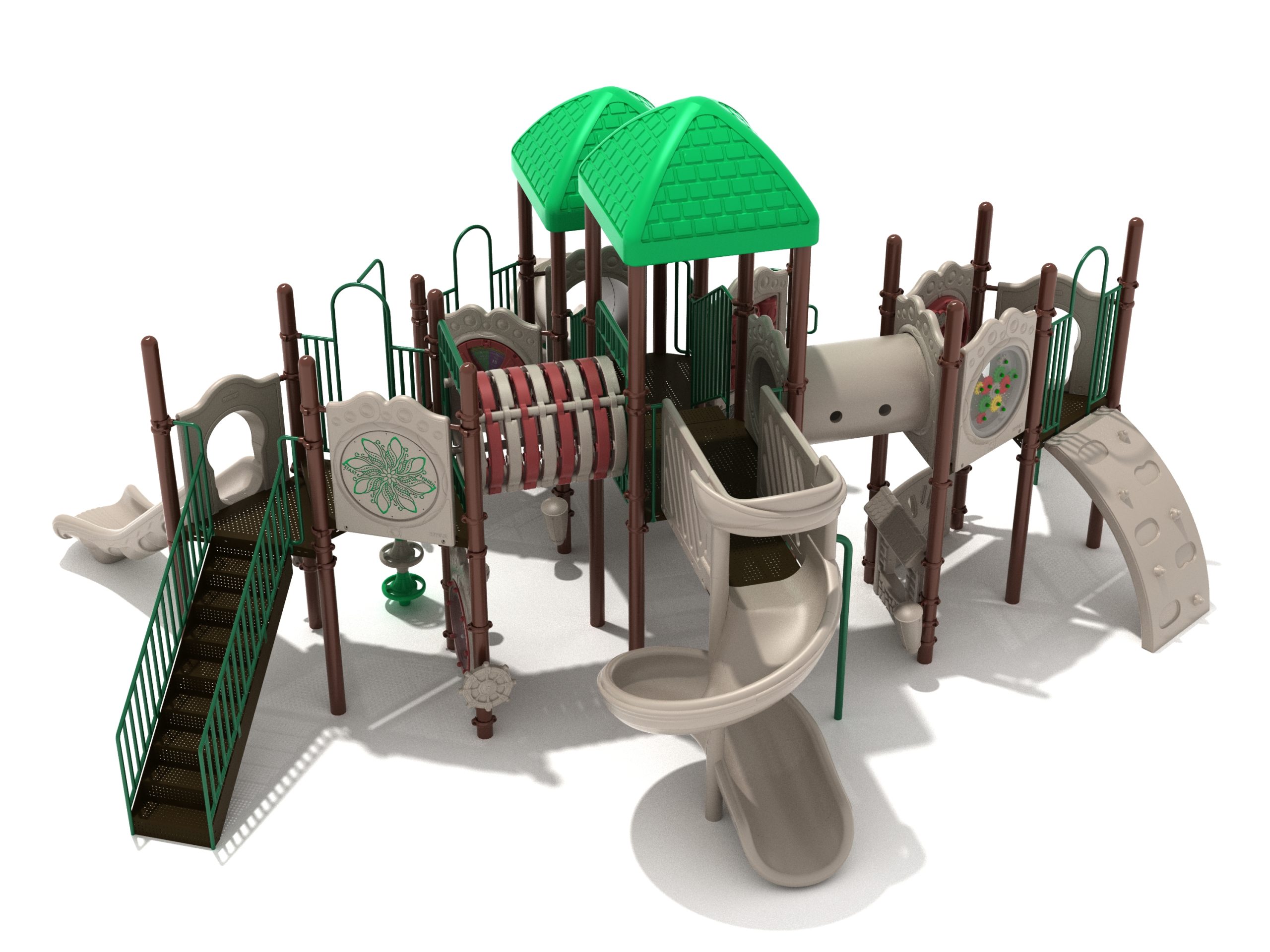 True to its name, the Roaring Fork is spread out in all four directions with a unique slide and a climber of its own. There are two easy-access stairways to mount the structure at two distant spots. At the top of one of these stairways is a 4-foot Tube Slide. The other two branches of the Roaring Fork each have a 5-foot-tall Straight Slide, offering a breezy ride down the deck. At the last and highest branch is a whopping 66-inch Spiral Slide that provides kids with a 360-degree view of the playground. The Fork also tests and polishes the climbing skills of kids with the curved and tilted Sea Creature Climber, Pixel Climber, and the vertical Pod Climber. Different activity panels are placed to ensure no kid is standing idle. Kids will have to lie down and crawl their way through at two points of the Fork, the thin Tube Bridge and the colorful Bones Tunnel. Musical instruments at the ground level also invite kids to experiment with sounds.