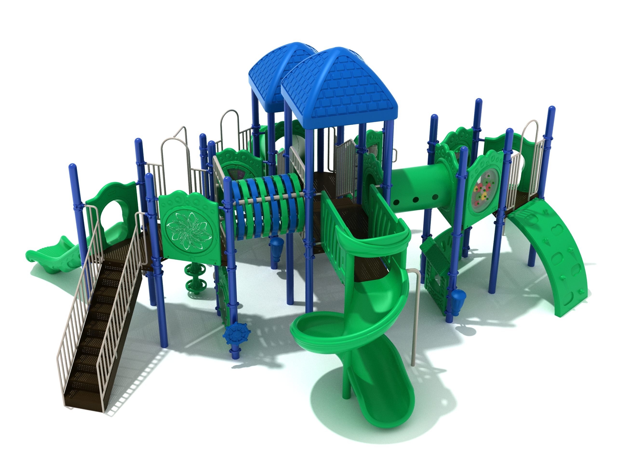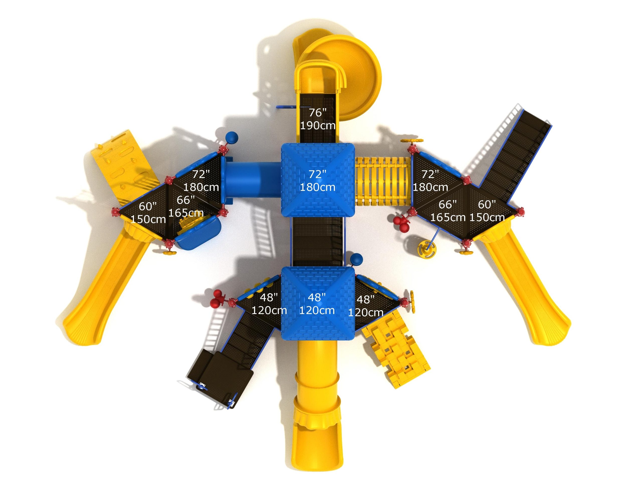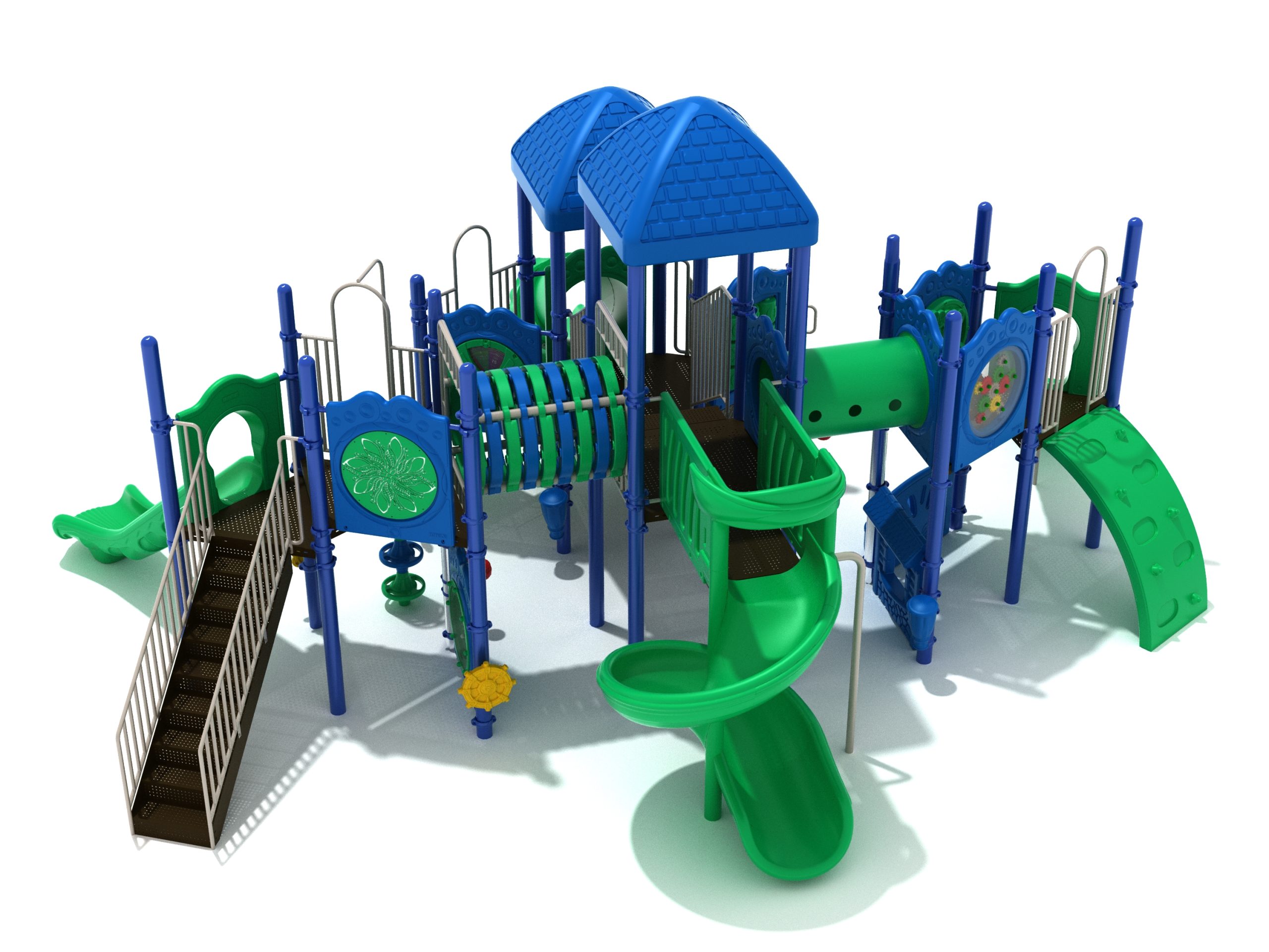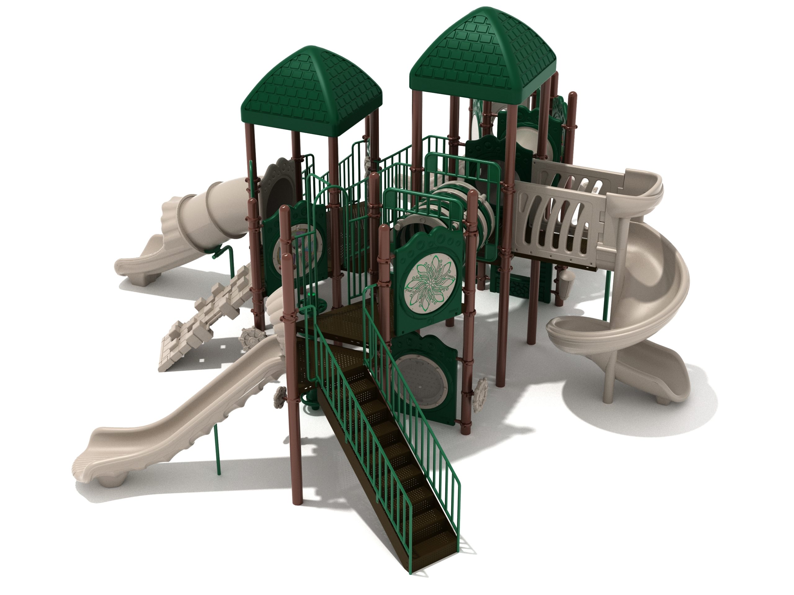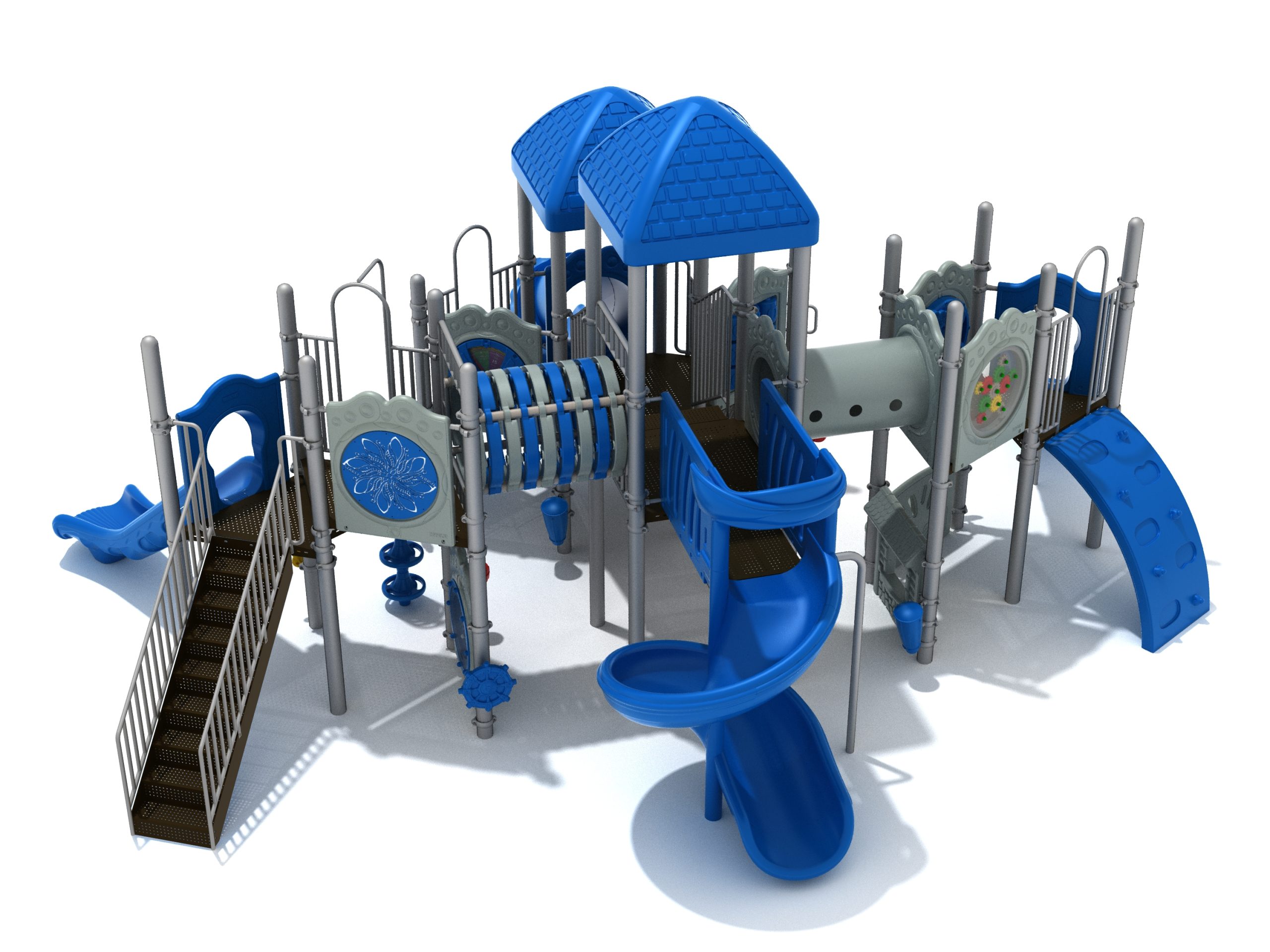 True to its name, the Roaring Fork is spread out in all four directions with a unique slide and a climber of its own. There are two easy-access stairways to mount the structure at two distant spots. At the top of one of these stairways is a 4-foot Tube Slide. The other two branches of the Roaring Fork each have a 5-foot-tall Straight Slide, offering a breezy ride down the deck. At the last and highest branch is a whopping 66-inch Spiral Slide that provides kids with a 360-degree view of the playground. The Fork also tests and polishes the climbing skills of kids with the curved and tilted Sea Creature Climber, Pixel Climber, and the vertical Pod Climber. Different activity panels are placed to ensure no kid is standing idle. Kids will have to lie down and crawl their way through at two points of the Fork, the thin Tube Bridge and the colorful Bones Tunnel. Musical instruments at the ground level also invite kids to experiment with sounds.
