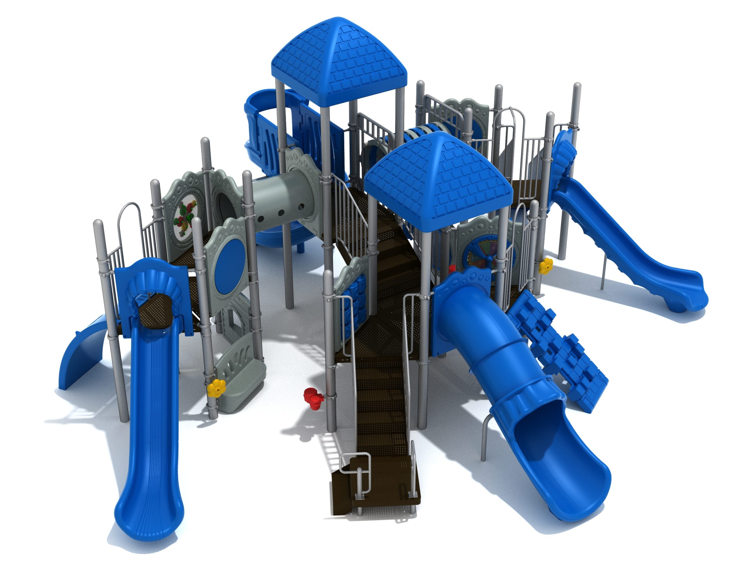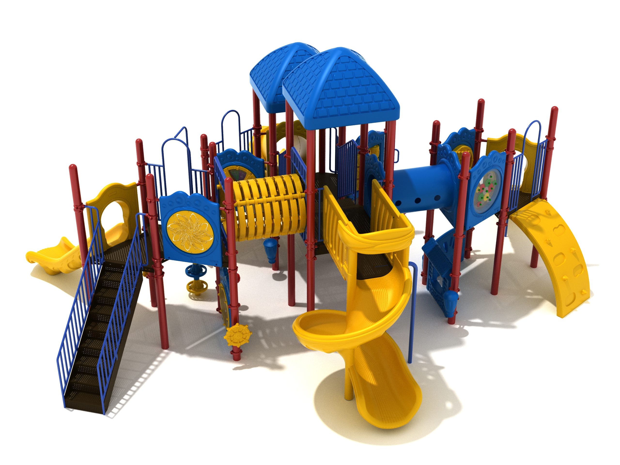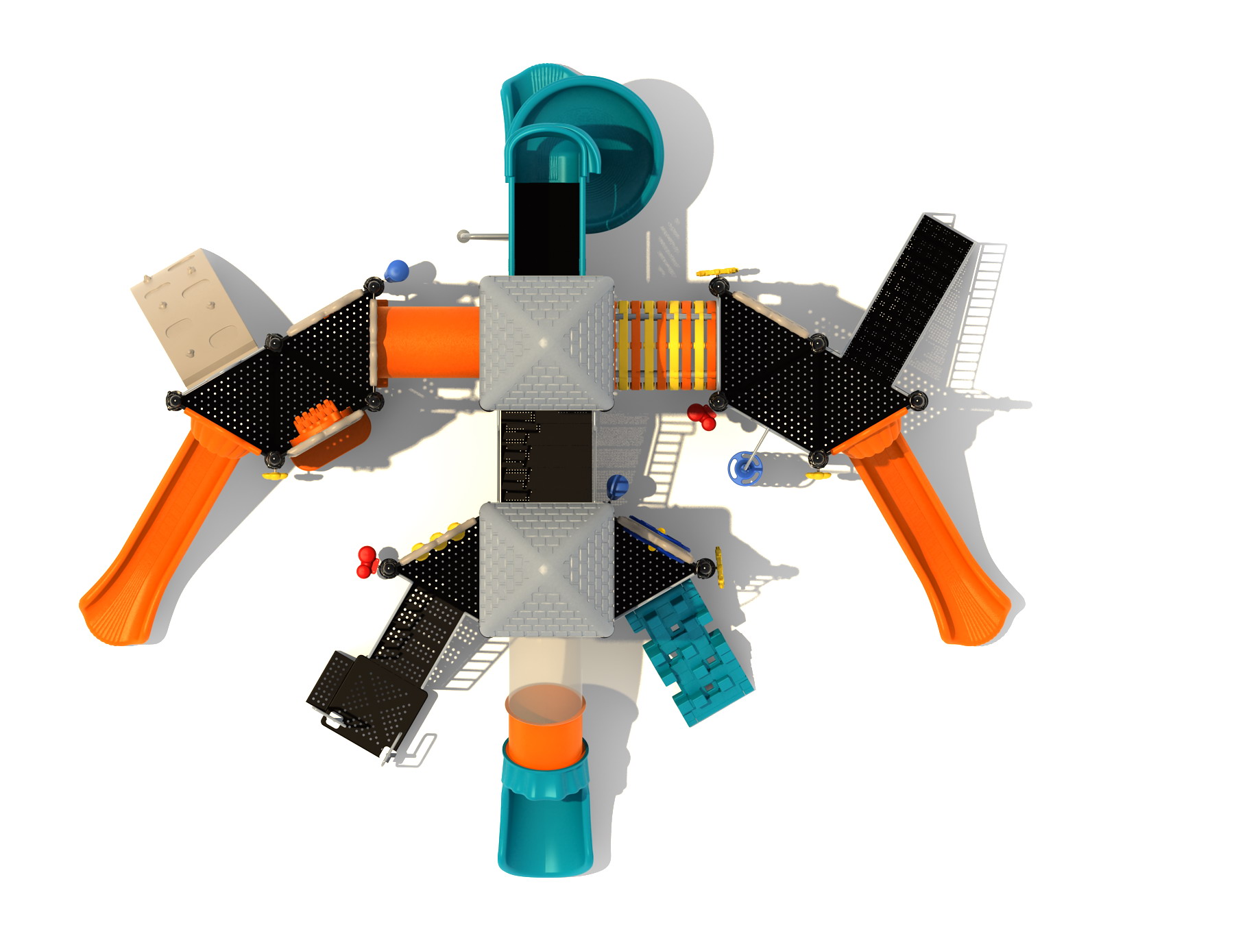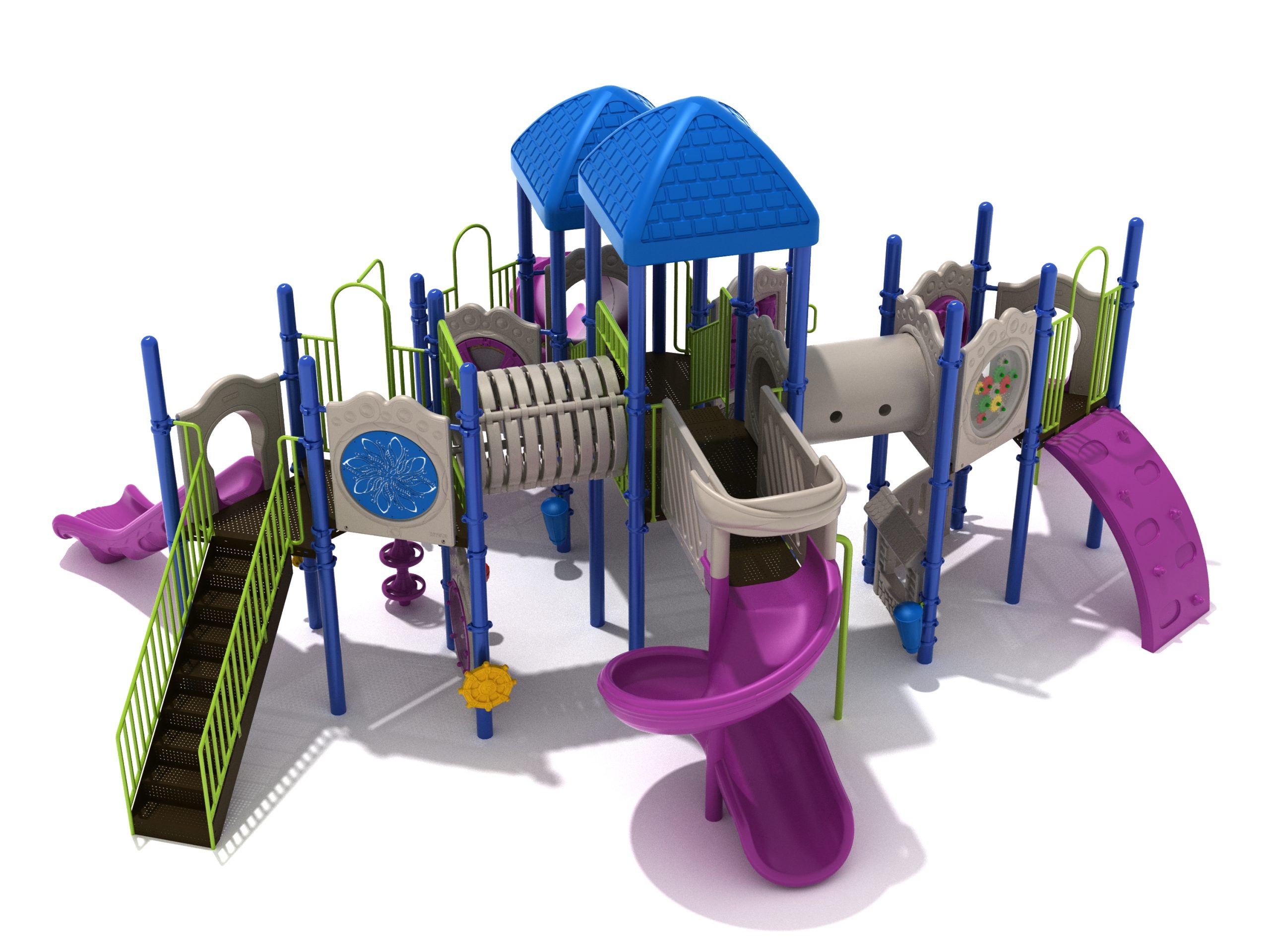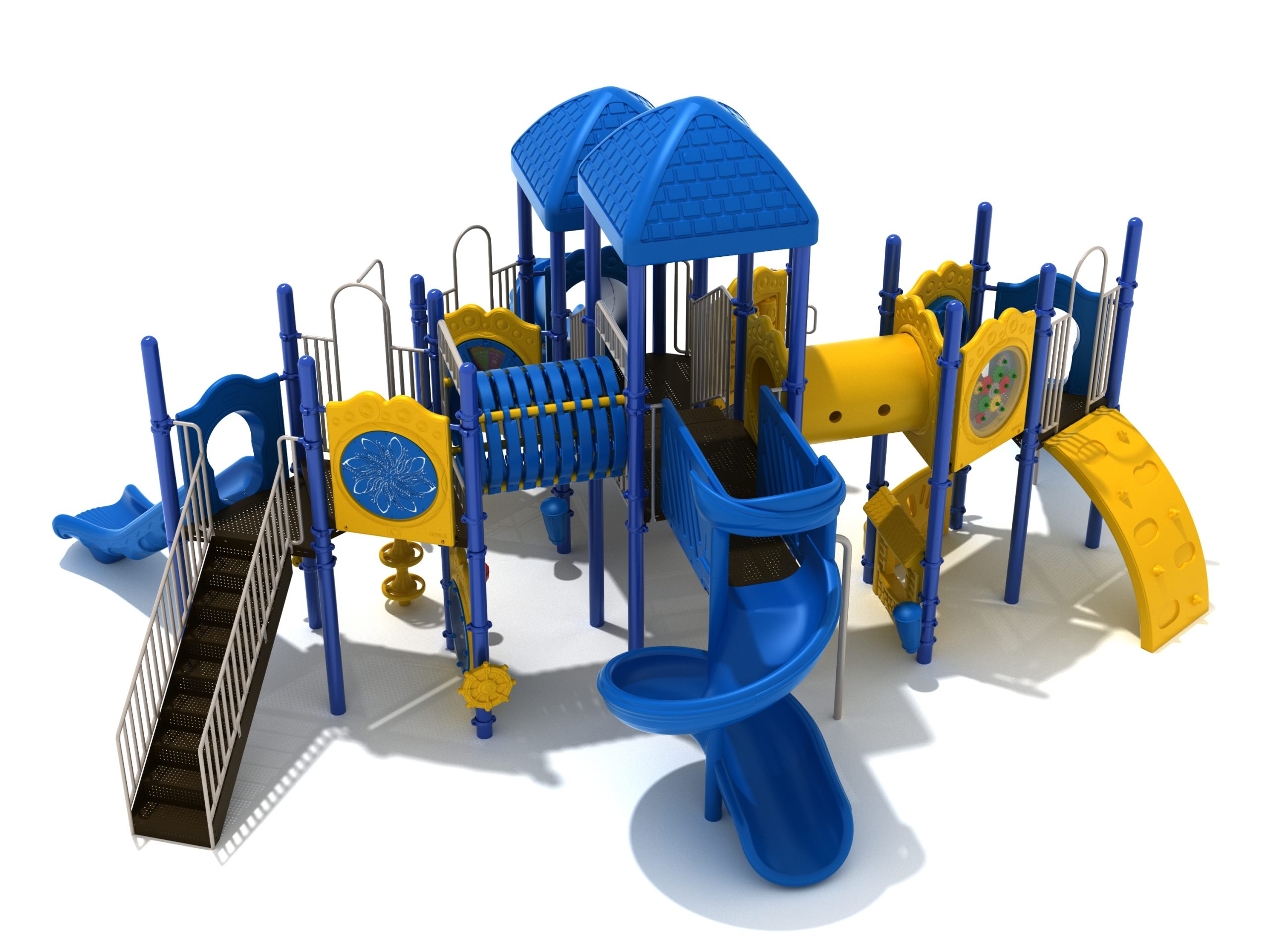 True to its name, the Roaring Fork is spread out in all four directions with a unique slide and a climber of its own. There are two easy-access stairways to mount the structure at two distant spots. At the top of one of these stairways is a 4-foot Tube Slide. The other two branches of the Roaring Fork each have a 5-foot-tall Straight Slide, offering a breezy ride down the deck. At the last and highest branch is a whopping 66-inch Spiral Slide that provides kids with a 360-degree view of the playground. The Fork also tests and polishes the climbing skills of kids with the curved and tilted Sea Creature Climber, Pixel Climber, and the vertical Pod Climber. Different activity panels are placed to ensure no kid is standing idle. Kids will have to lie down and crawl their way through at two points of the Fork, the thin Tube Bridge and the colorful Bones Tunnel. Musical instruments at the ground level also invite kids to experiment with sounds.