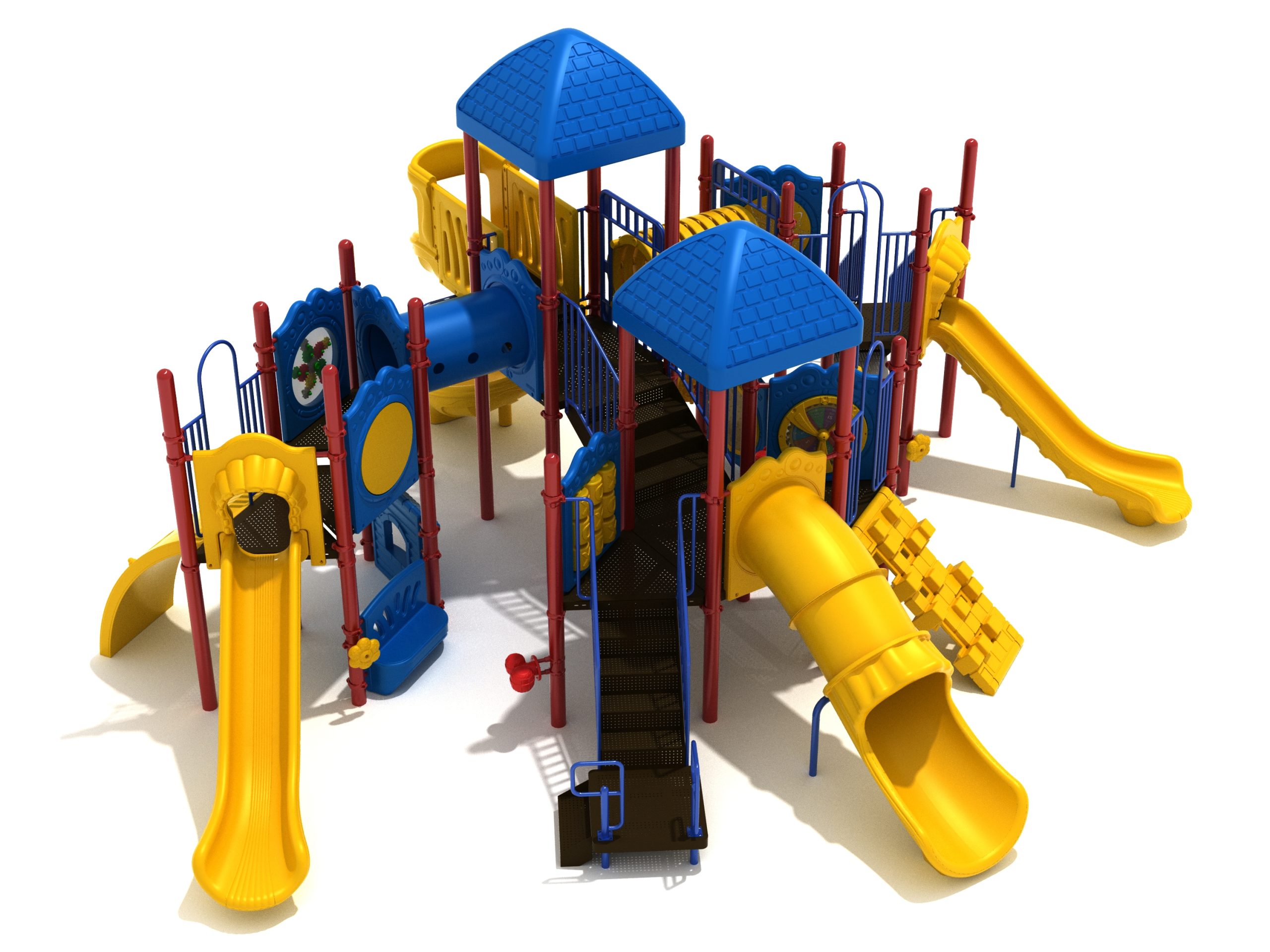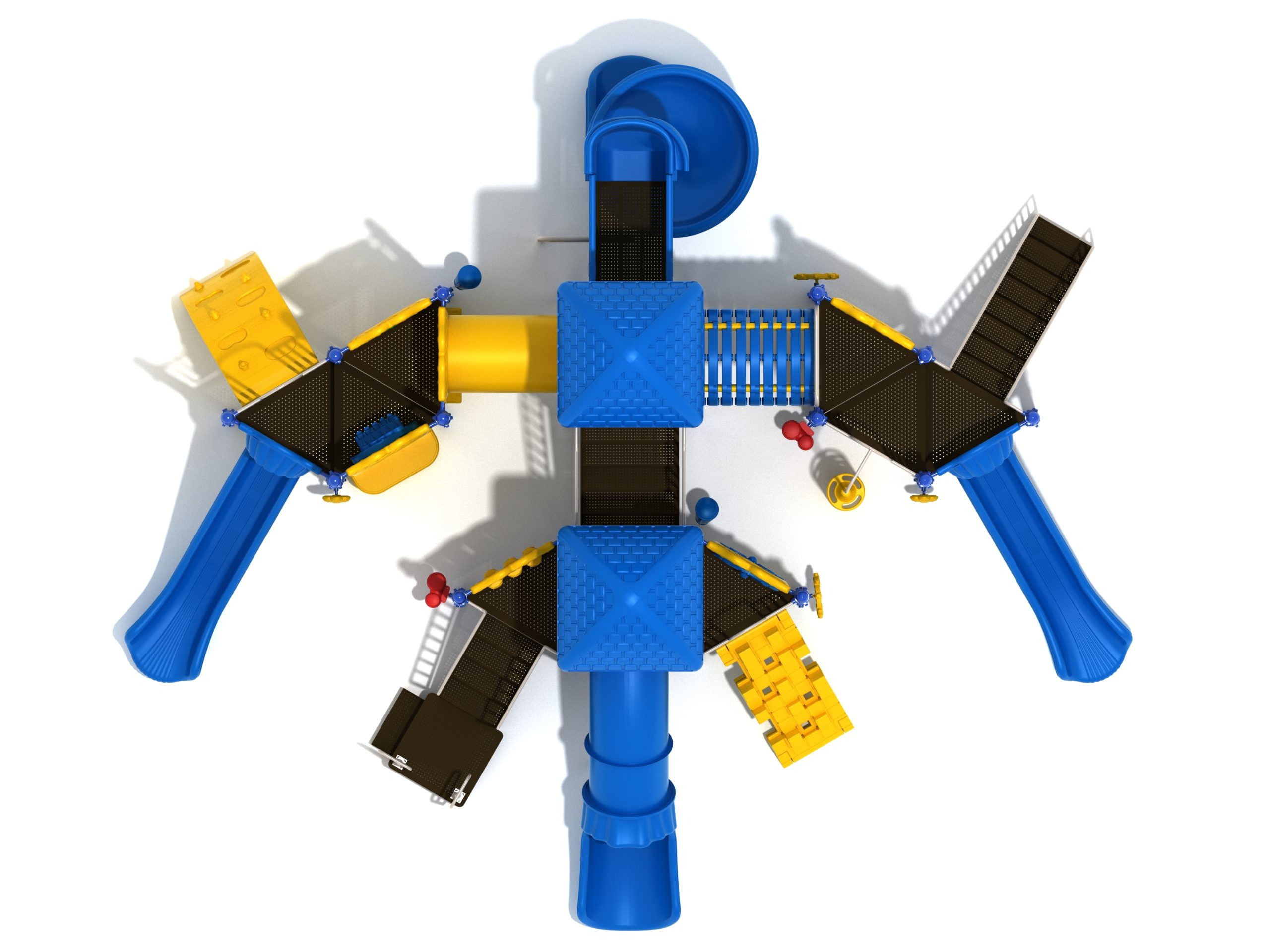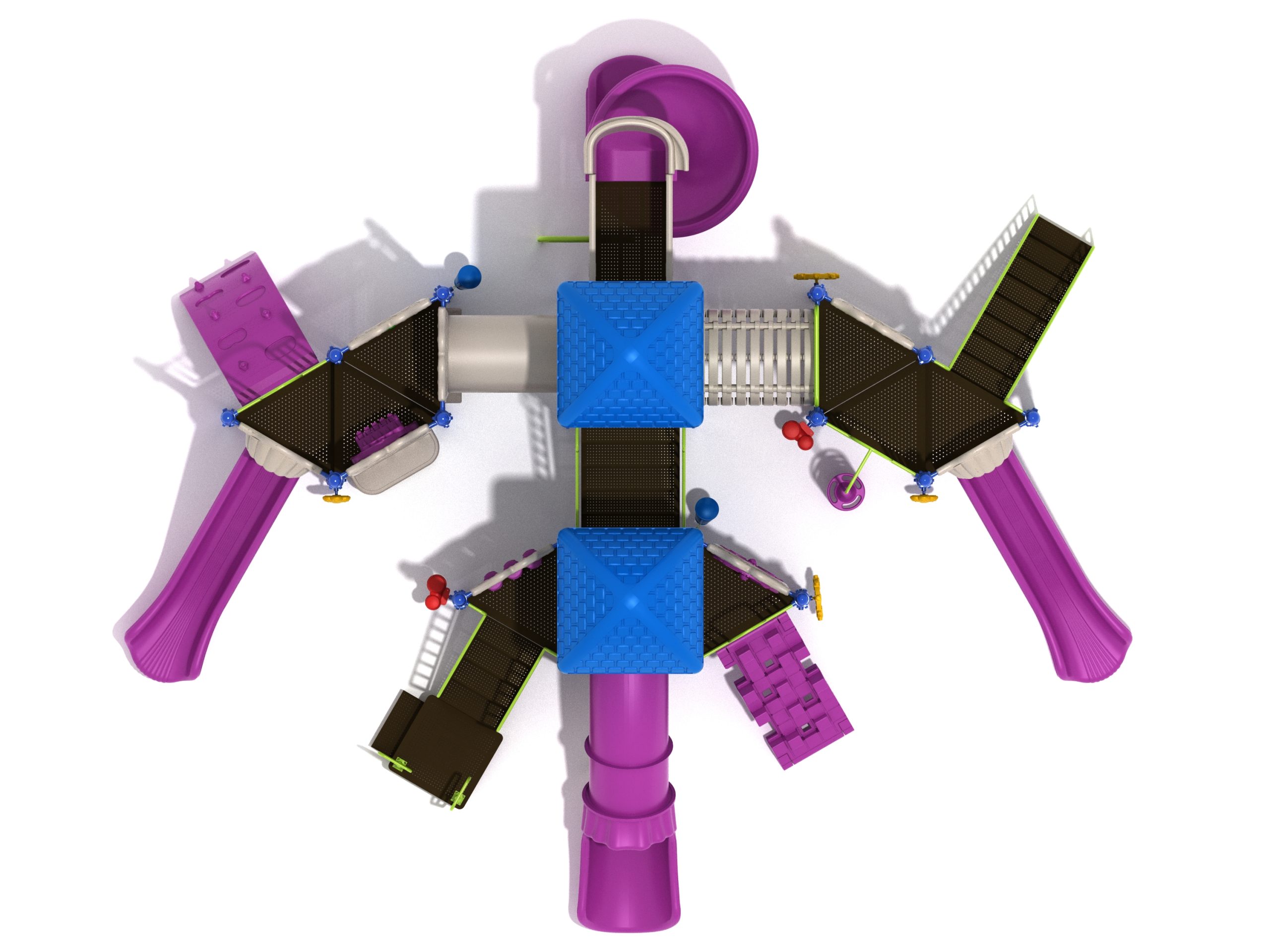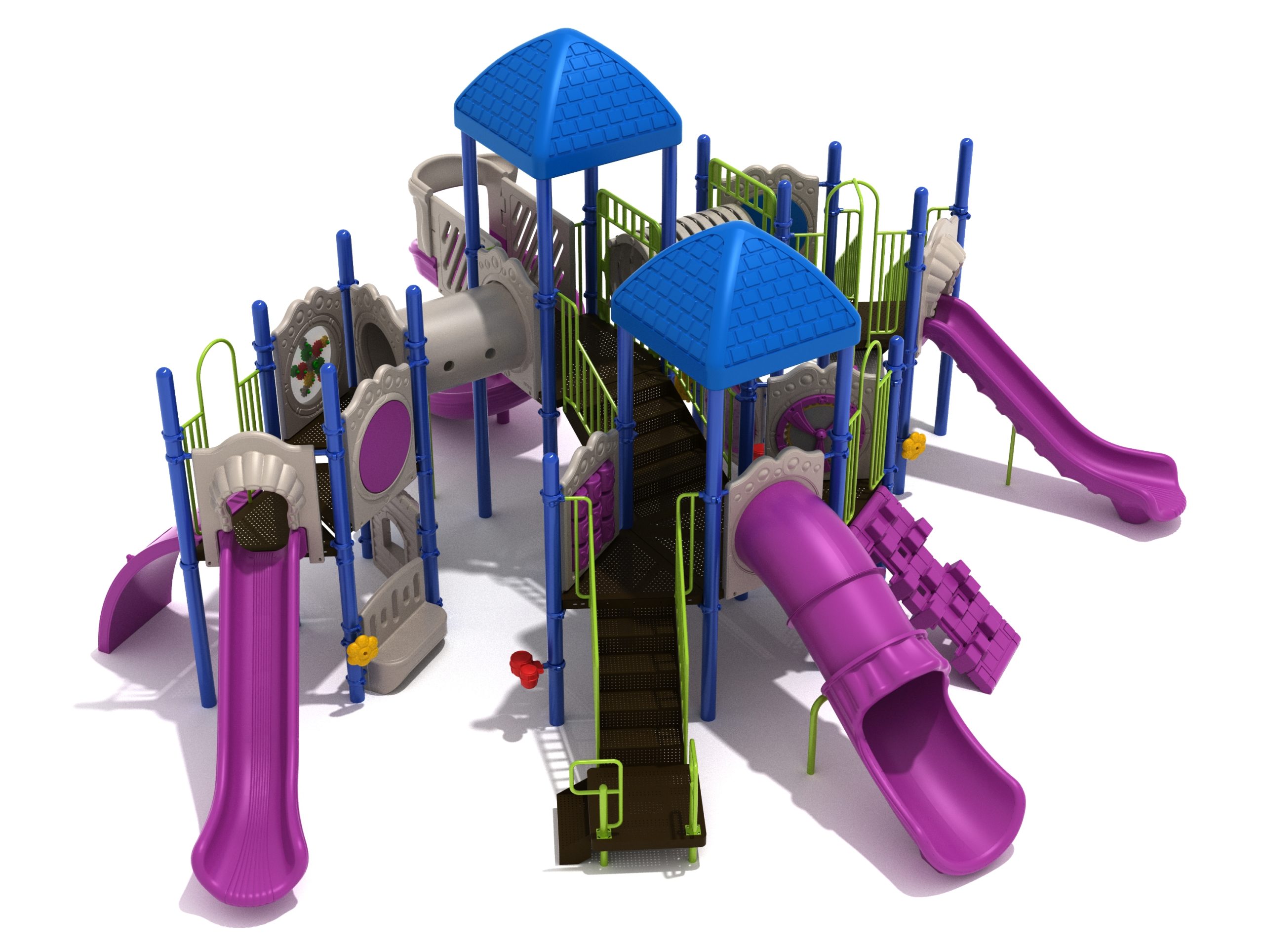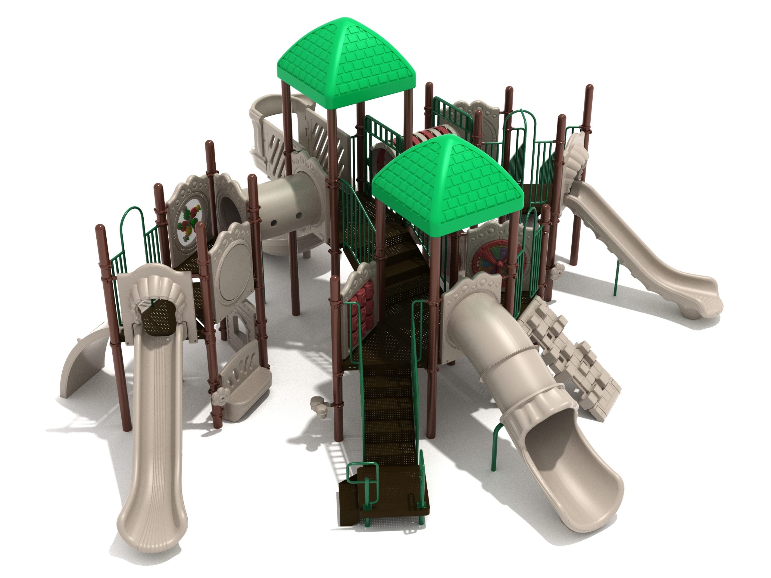 True to its name, the Roaring Fork is spread out in all four directions with a unique slide and a climber of its own. There are two easy-access stairways to mount the structure at two distant spots. At the top of one of these stairways is a 4-foot Tube Slide. The other two branches of the Roaring Fork each have a 5-foot-tall Straight Slide, offering a breezy ride down the deck. At the last and highest branch is a whopping 66-inch Spiral Slide that provides kids with a 360-degree view of the playground. The Fork also tests and polishes the climbing skills of kids with the curved and tilted Sea Creature Climber, Pixel Climber, and the vertical Pod Climber. Different activity panels are placed to ensure no kid is standing idle. Kids will have to lie down and crawl their way through at two points of the Fork, the thin Tube Bridge and the colorful Bones Tunnel. Musical instruments at the ground level also invite kids to experiment with sounds.