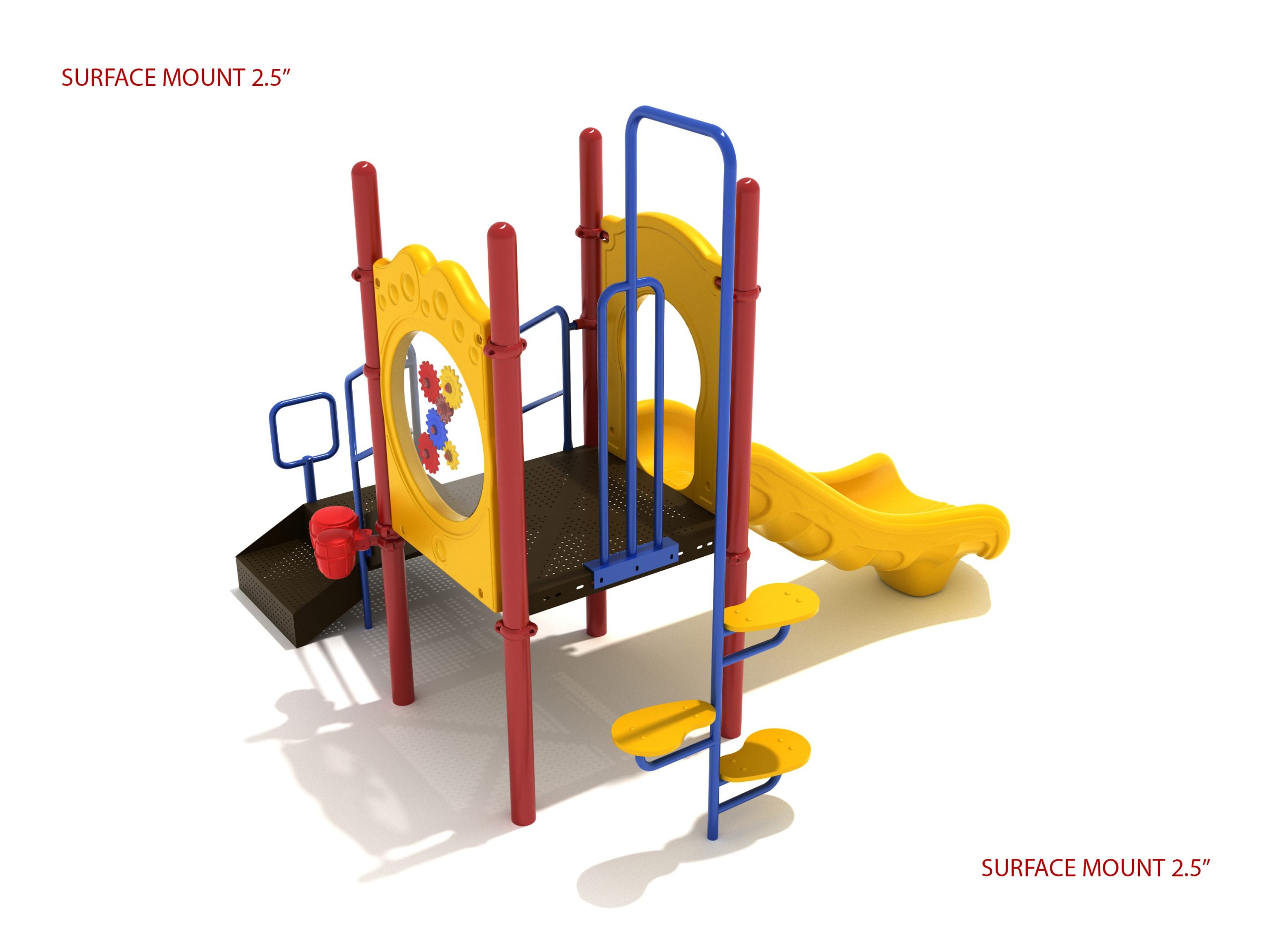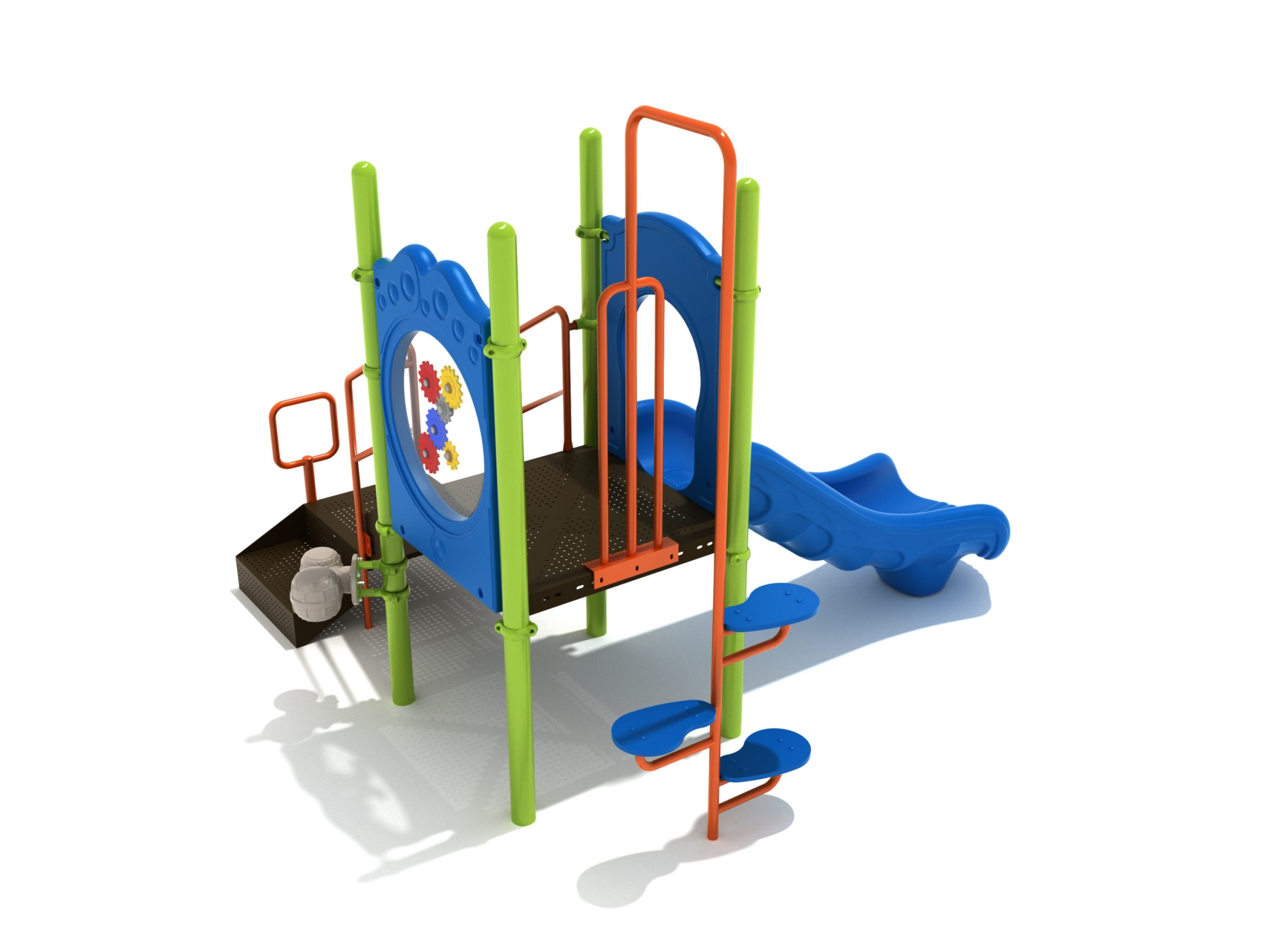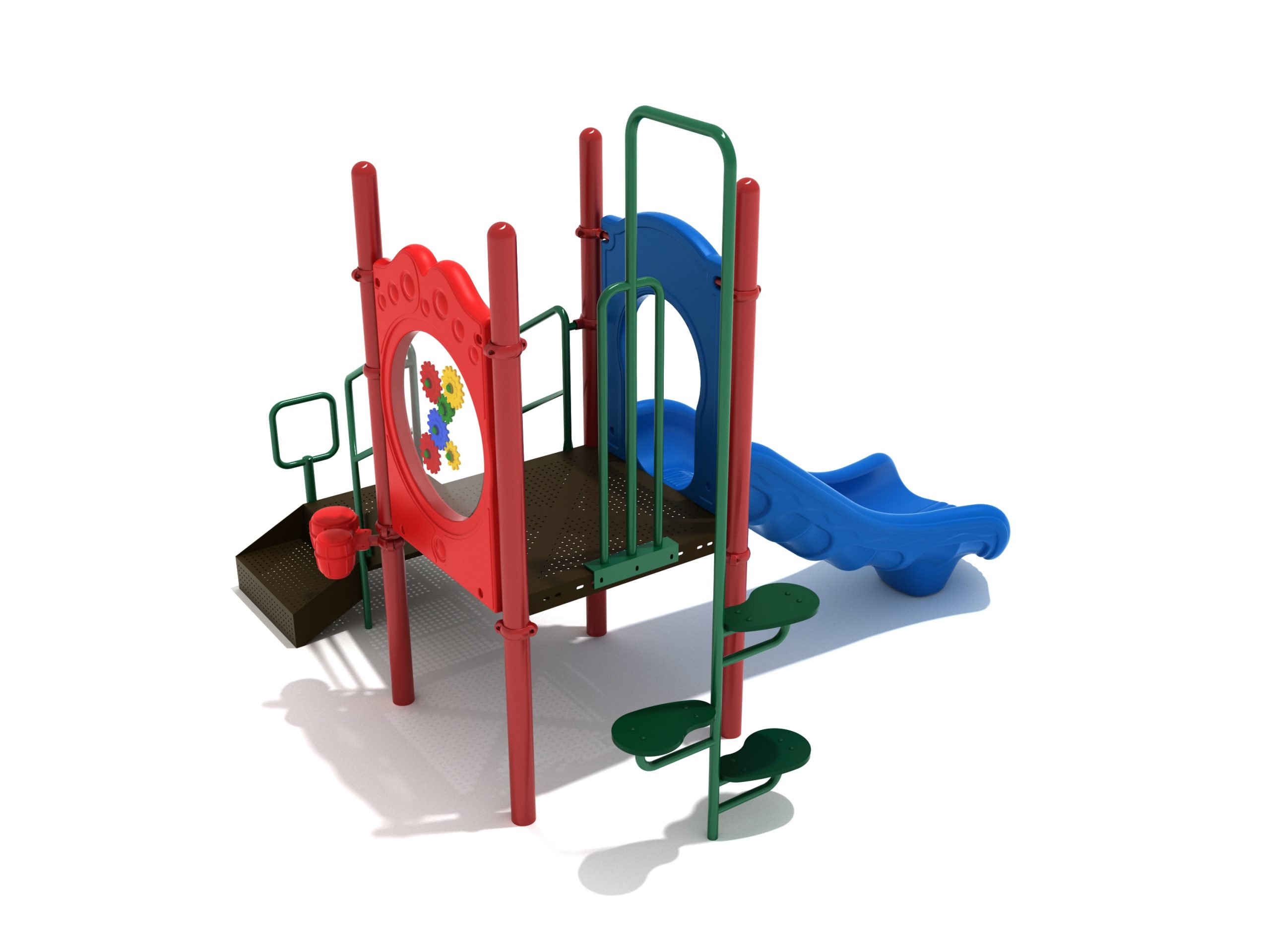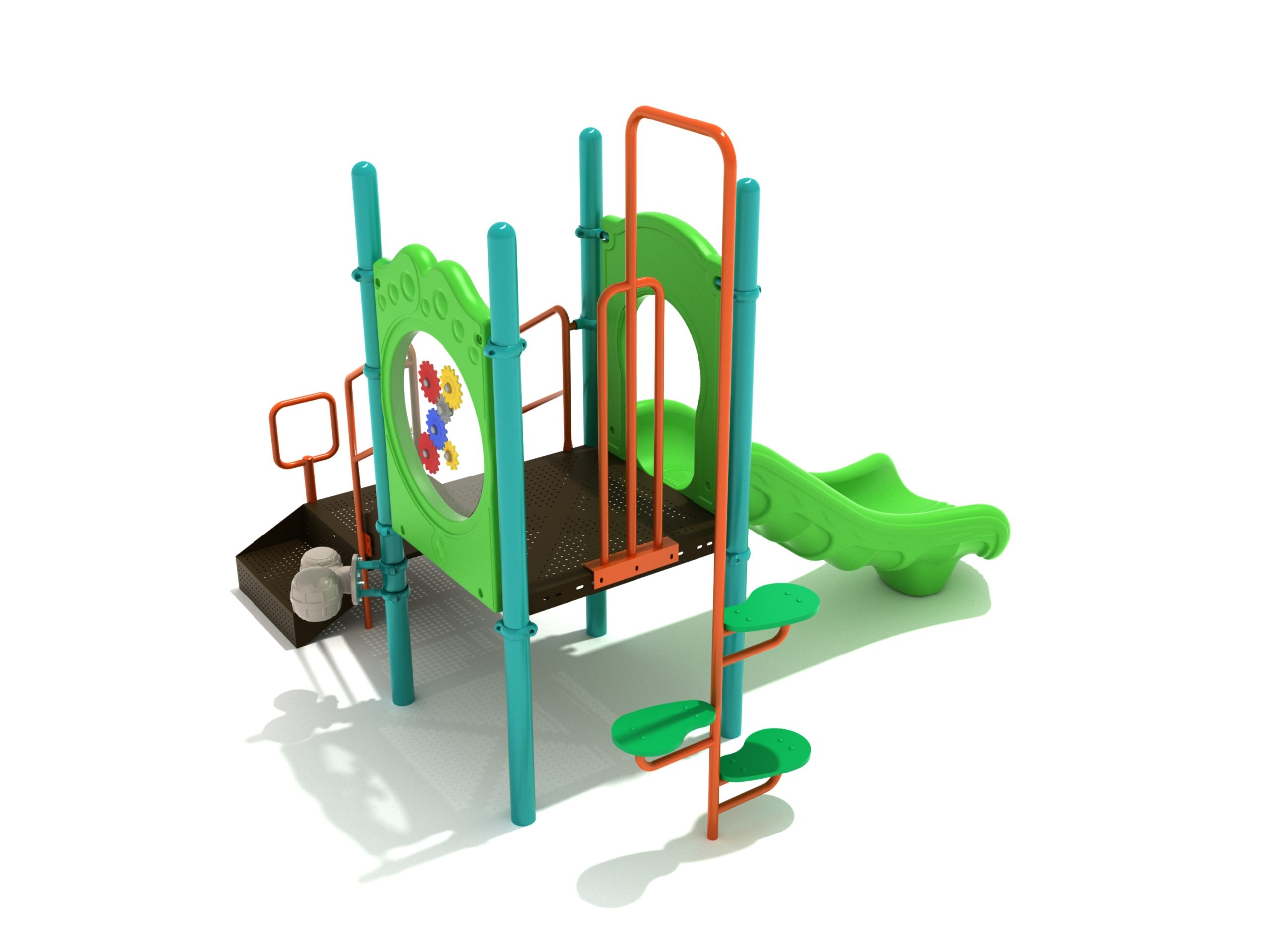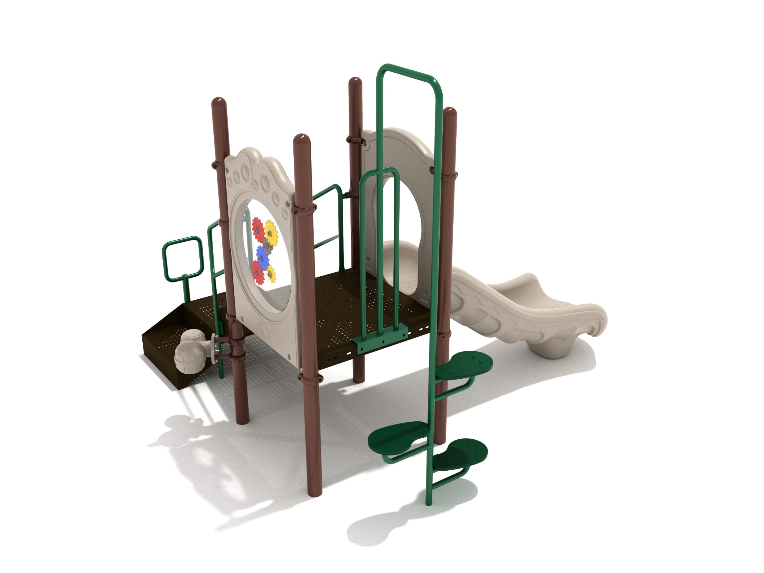 The Rochester play system: Made for Playing. Children will just blossom as they play on this play structure, made up of one 36 inch high elevated platform, and accessible by a pea pod climber and by stairs. Once on the elevated platform children can slide down a straight slide for a fun way off of the play structure. A gear panel borders the elevated platform, providing children with the fun opportunity to use their hands and play. Bongos are found on the ground level of this play structure providing children with the opportunity for on-ground and hands-on play, letting children explore their musical abilities, and also making the Rochester play structure ADA compliant. This play structure can hold up to 11-13 children, has a fall height of 3 feet, and weighs a total of 650 pounds. This play structure is designed for children who are between the ages of 2 and 12 years old.