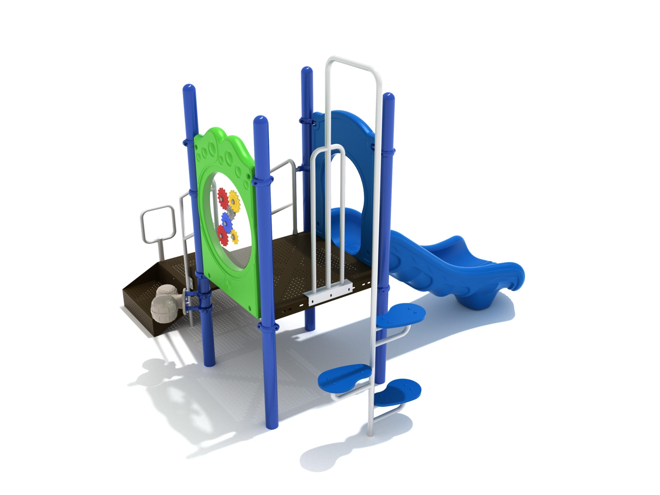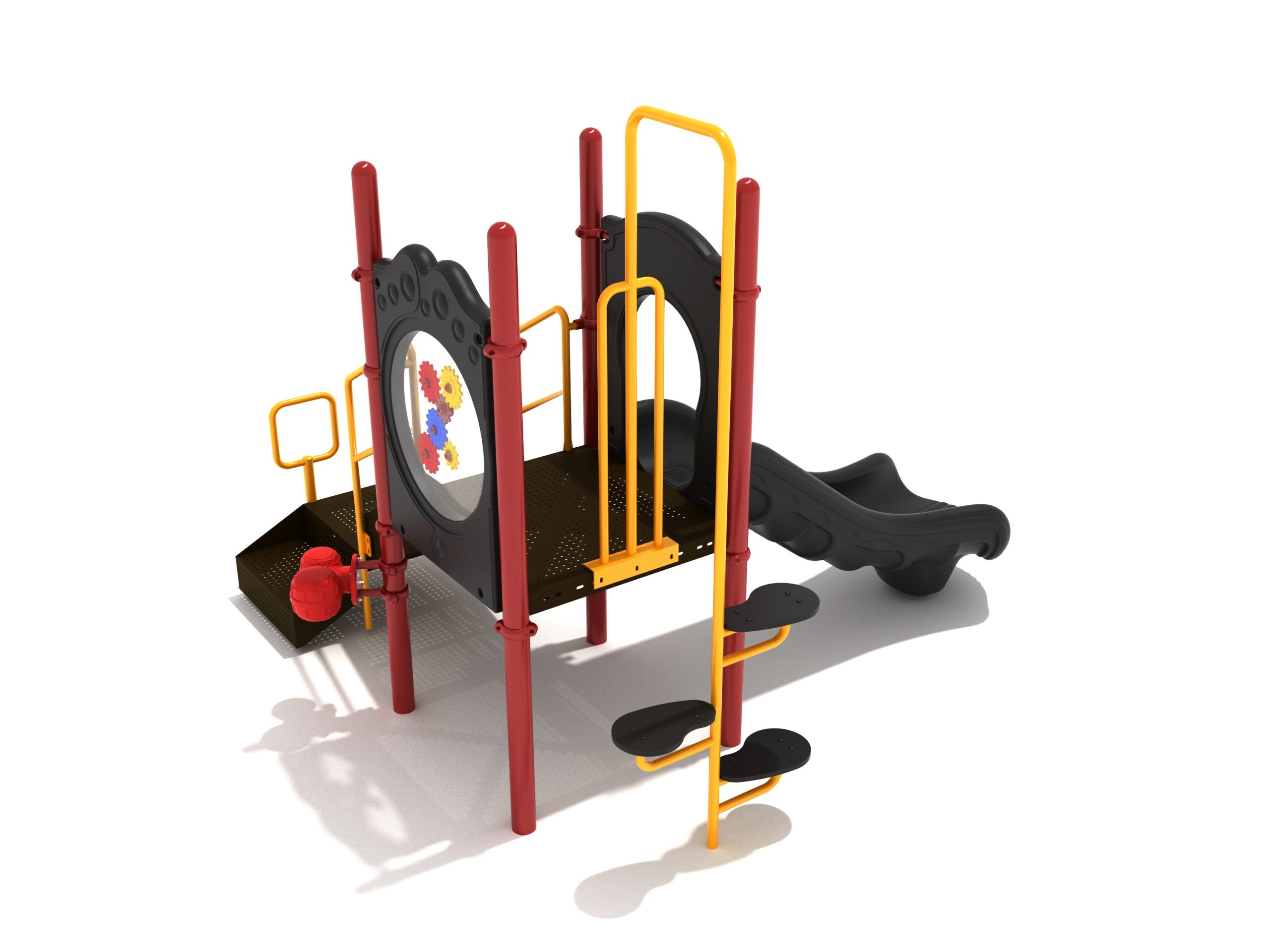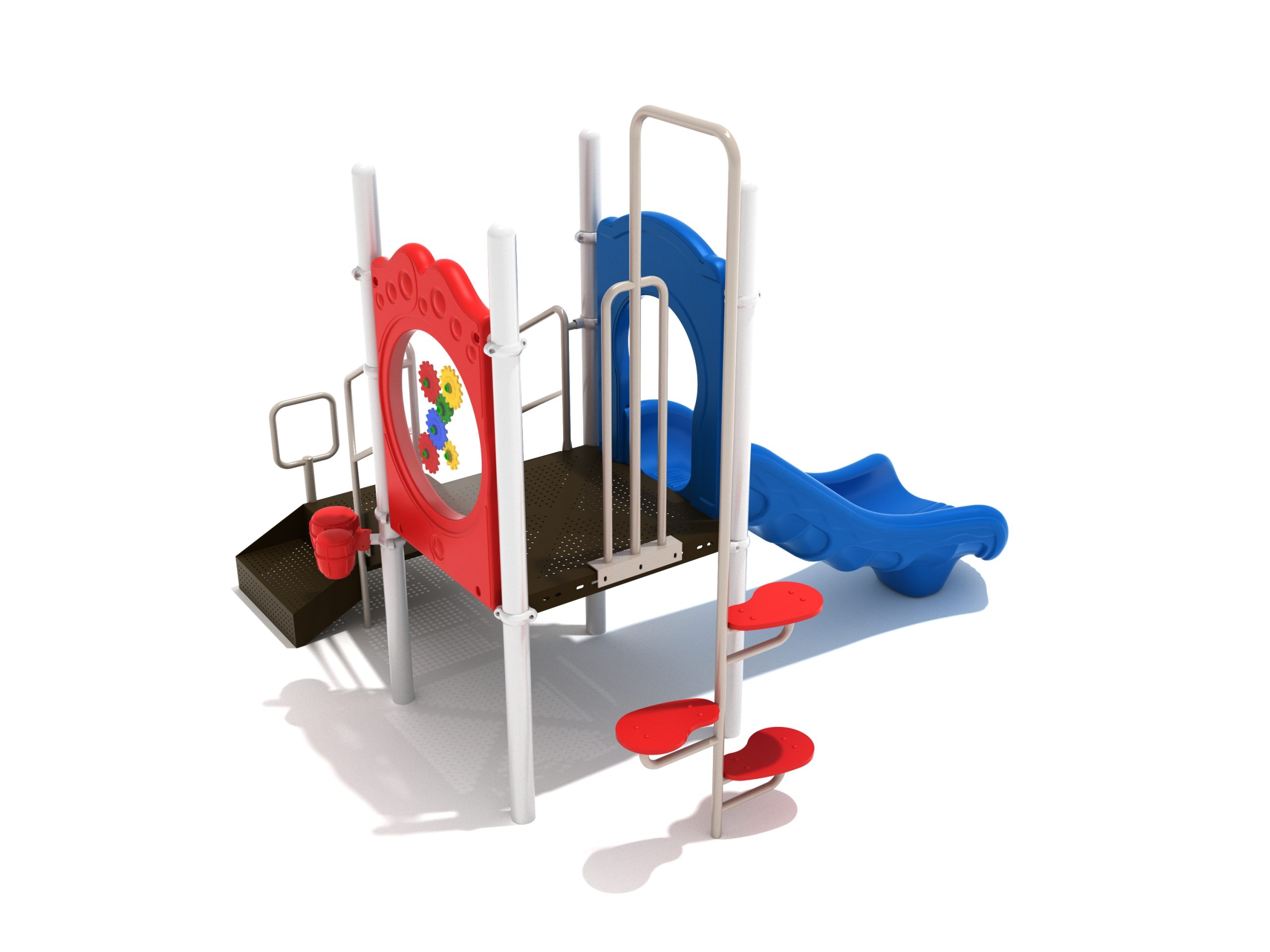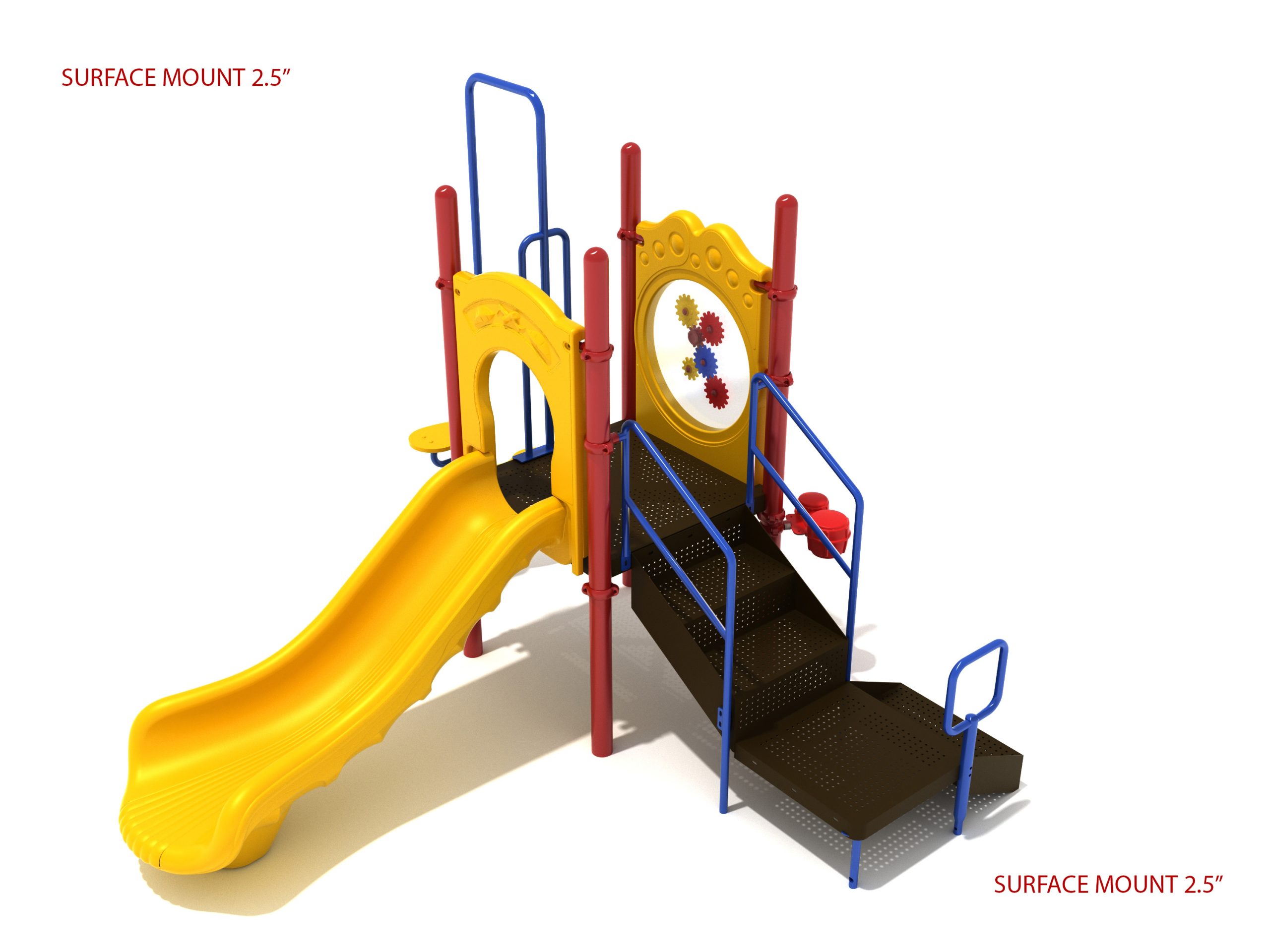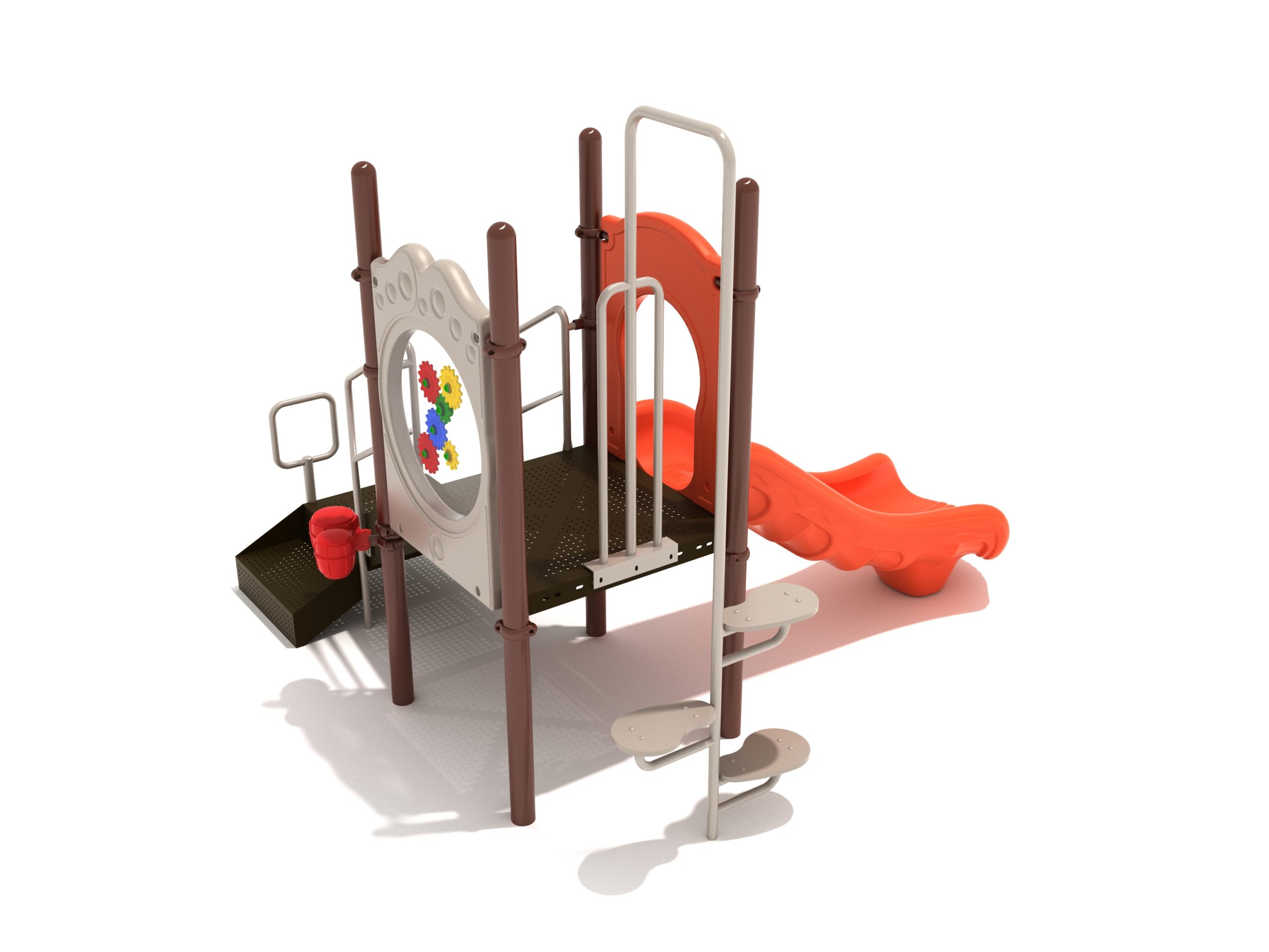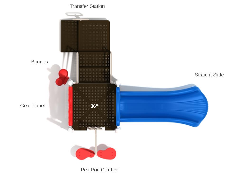 The Rochester play system: Made for Playing. Children will just blossom as they play on this play structure, made up of one 36 inch high elevated platform, and accessible by a pea pod climber and by stairs. Once on the elevated platform children can slide down a straight slide for a fun way off of the play structure. A gear panel borders the elevated platform, providing children with the fun opportunity to use their hands and play. Bongos are found on the ground level of this play structure providing children with the opportunity for on-ground and hands-on play, letting children explore their musical abilities, and also making the Rochester play structure ADA compliant. This play structure can hold up to 11-13 children, has a fall height of 3 feet, and weighs a total of 650 pounds. This play structure is designed for children who are between the ages of 2 and 12 years old.