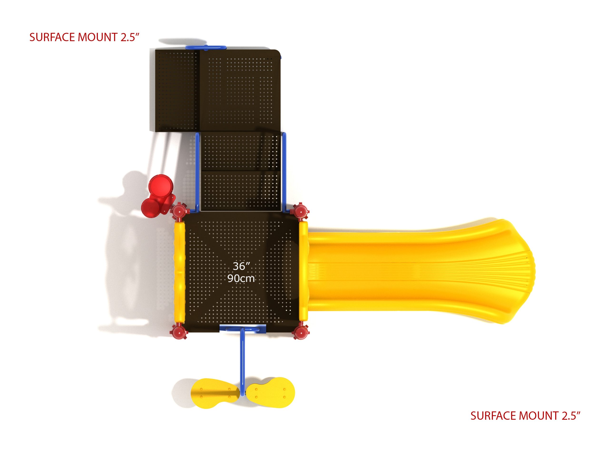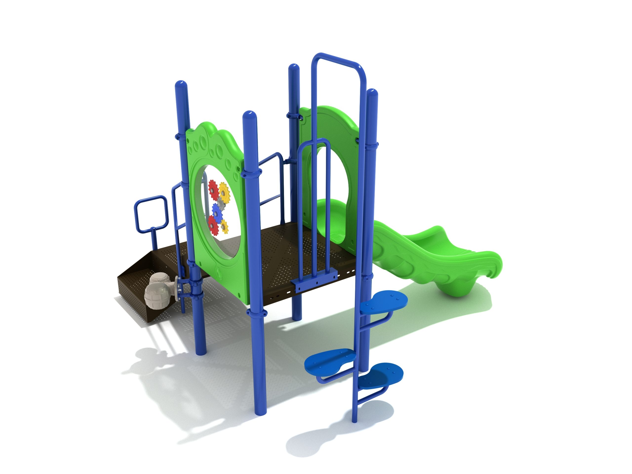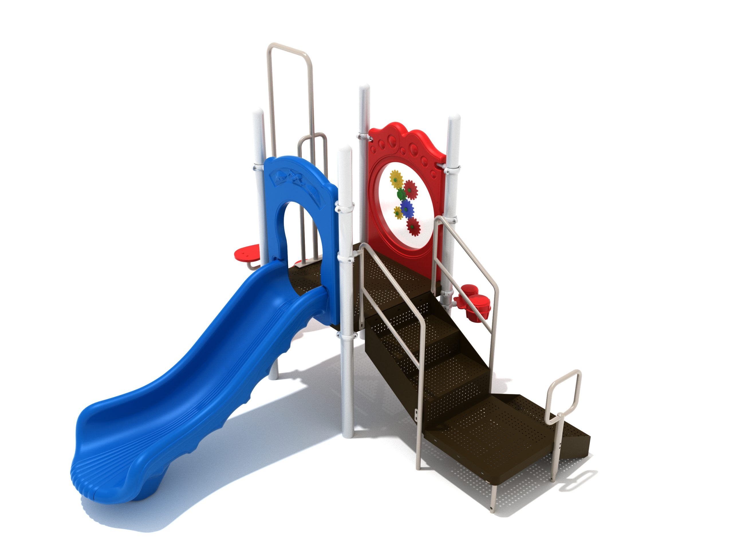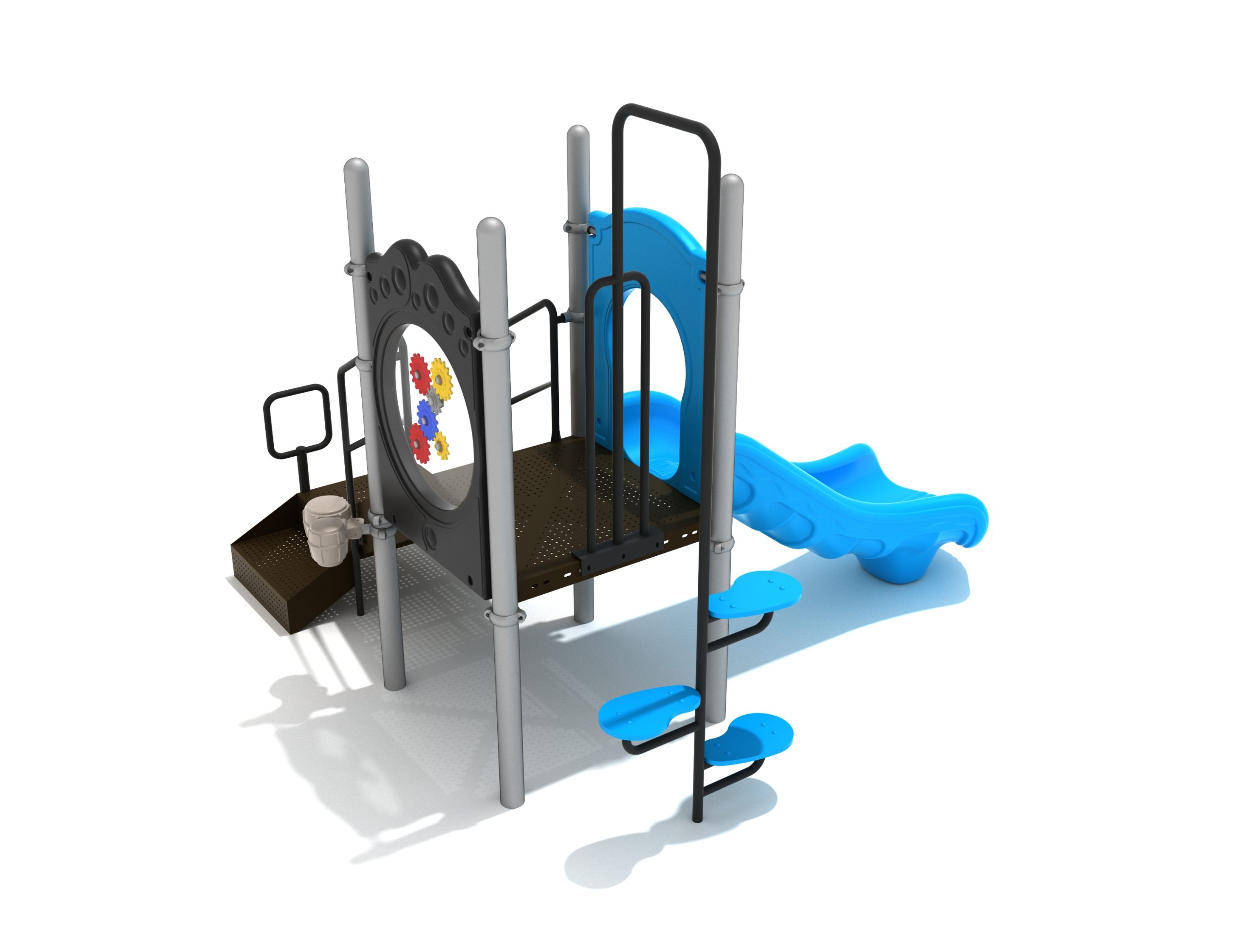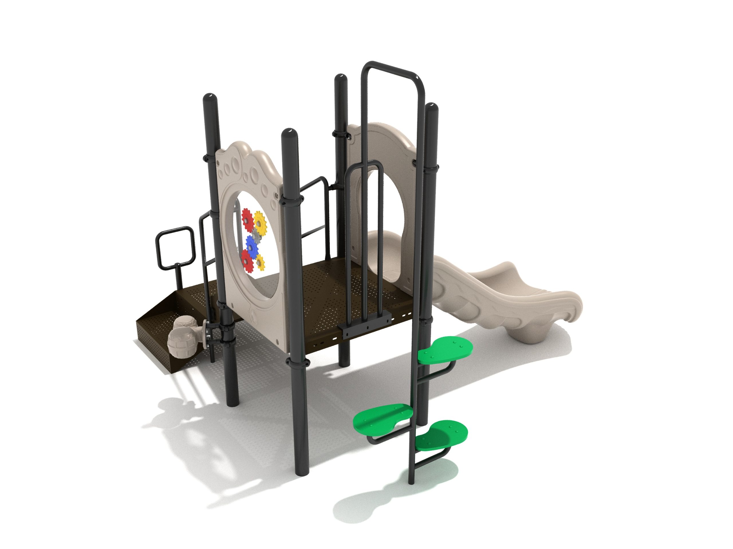 The Rochester play system: Made for Playing. Children will just blossom as they play on this play structure, made up of one 36 inch high elevated platform, and accessible by a pea pod climber and by stairs. Once on the elevated platform children can slide down a straight slide for a fun way off of the play structure. A gear panel borders the elevated platform, providing children with the fun opportunity to use their hands and play. Bongos are found on the ground level of this play structure providing children with the opportunity for on-ground and hands-on play, letting children explore their musical abilities, and also making the Rochester play structure ADA compliant. This play structure can hold up to 11-13 children, has a fall height of 3 feet, and weighs a total of 650 pounds. This play structure is designed for children who are between the ages of 2 and 12 years old.