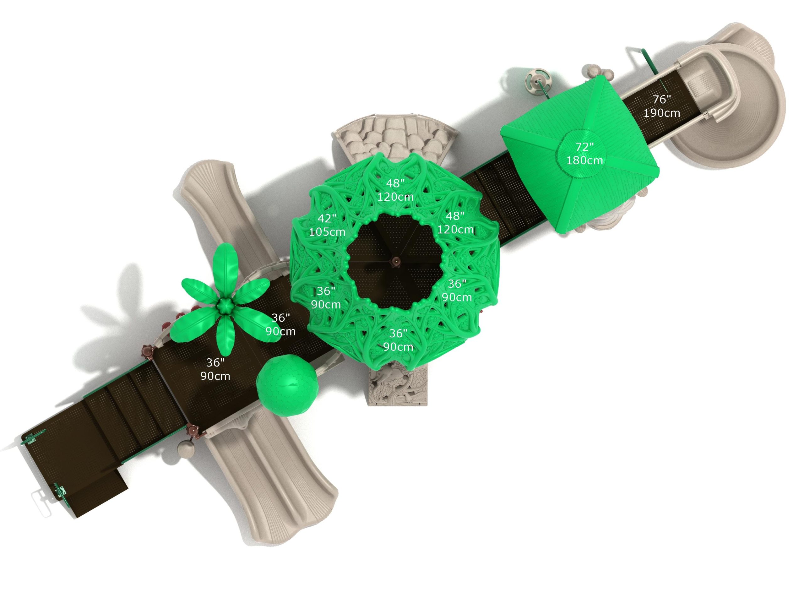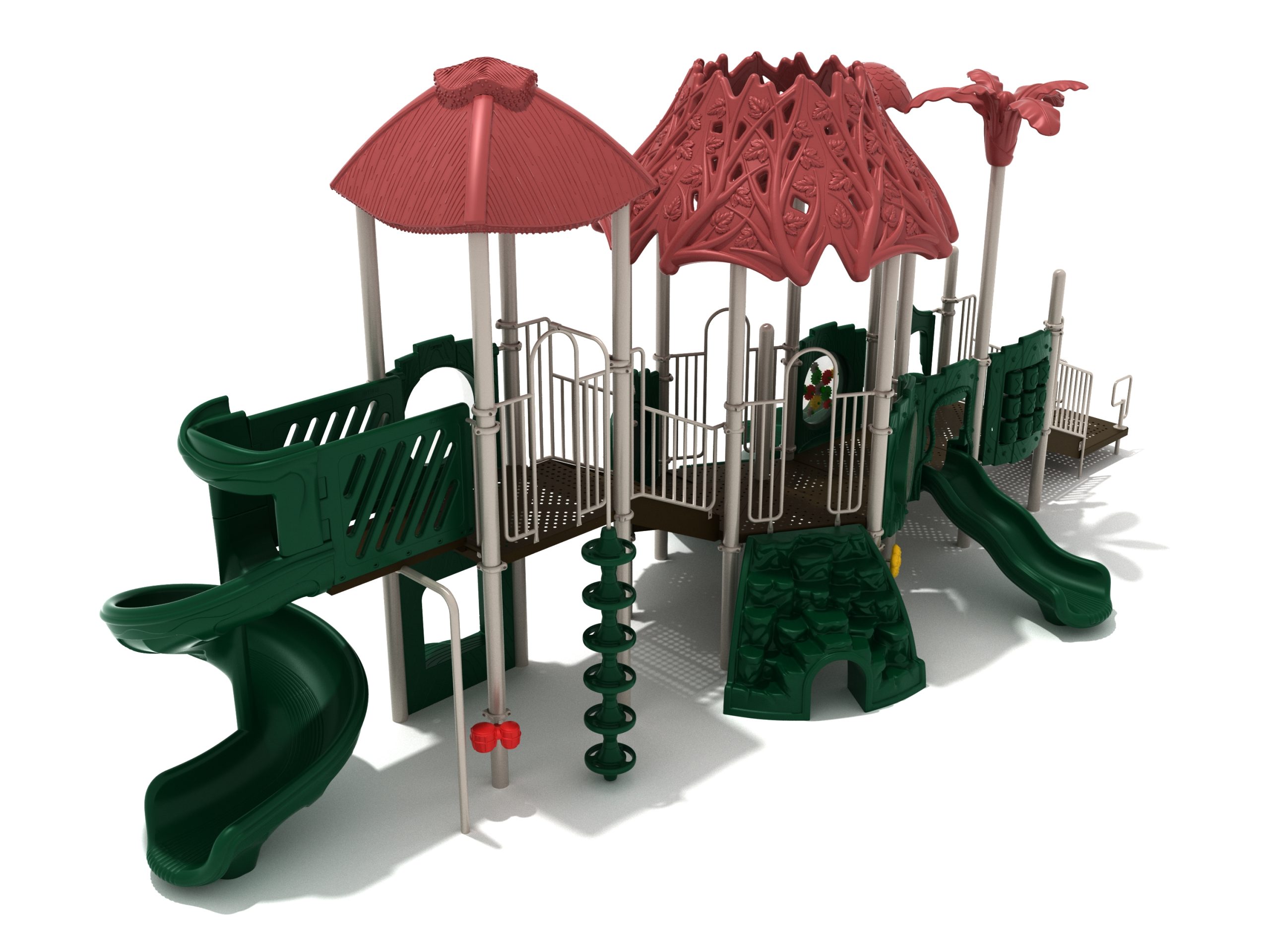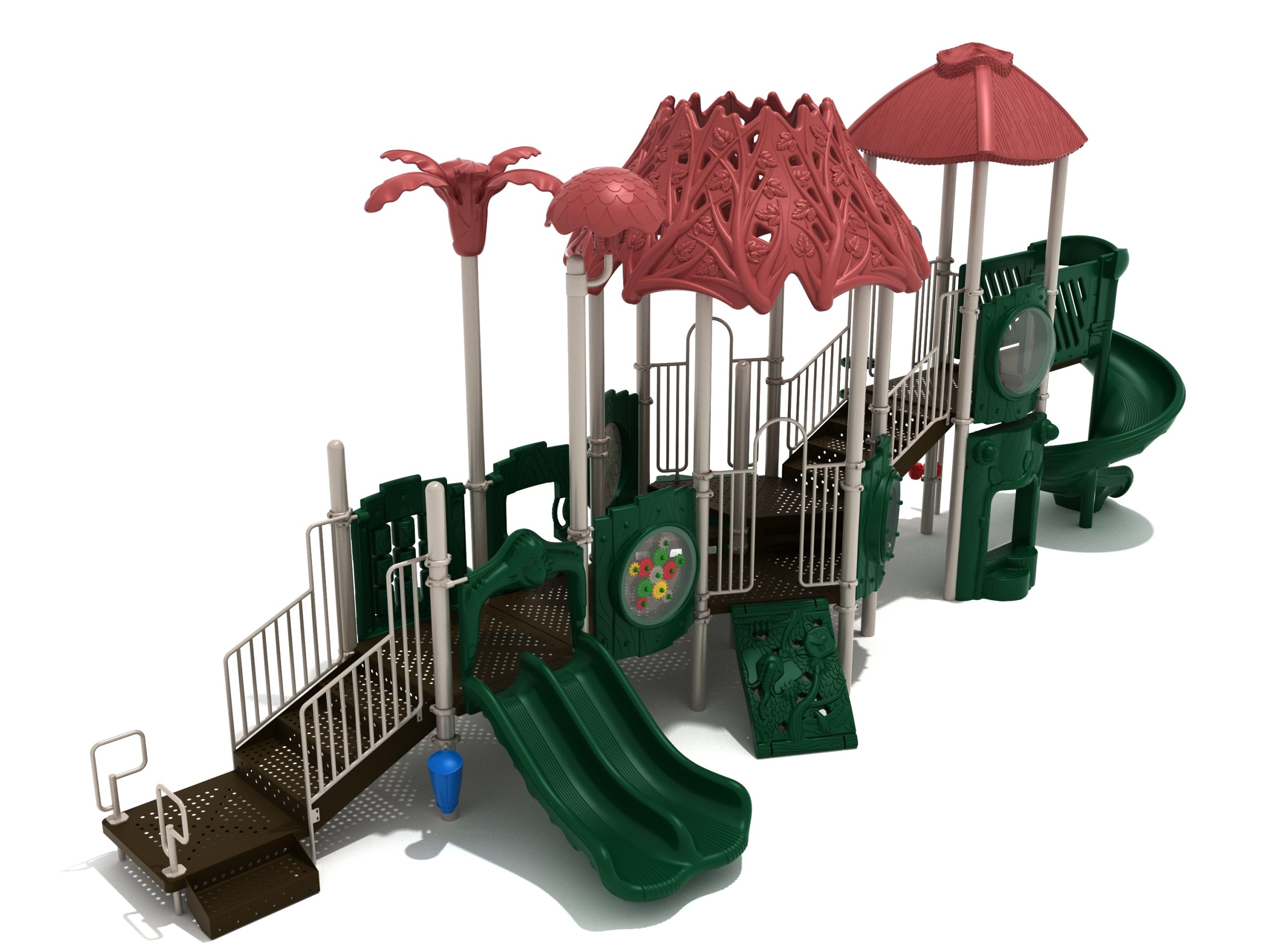 Hours of fun are guaranteed when the Romping Rhinoceros is installed in any playground. It boasts a linear design with lots of features on each side so it doesn’t matter which way around you want to place it. Capable of catering for dozens of children at the same time, the Romping Rhinoceros has three slides including a wavy Spiral Slide, a Double Slide for races, and a Wave Slide for a bumpy adventure. The central Hex Tree Roof is complemented by a Palm Tree Topper which aids with sparking kids’ imaginations, and this is reinforced with features like the Stump Store Panel for jungle roleplaying and the Jungle Climber which is perfect for introducing children to rainforest animals. A Rock Hole Climber on one side offers a variety of play scenarios. Kids can be climbing up a rock slide on a mountainside or they can explore the cave structure underneath. A Rain Wheel can make it sound like the clouds are dropping rain droplets, and the Bongos bring a brilliant beat to playtime.