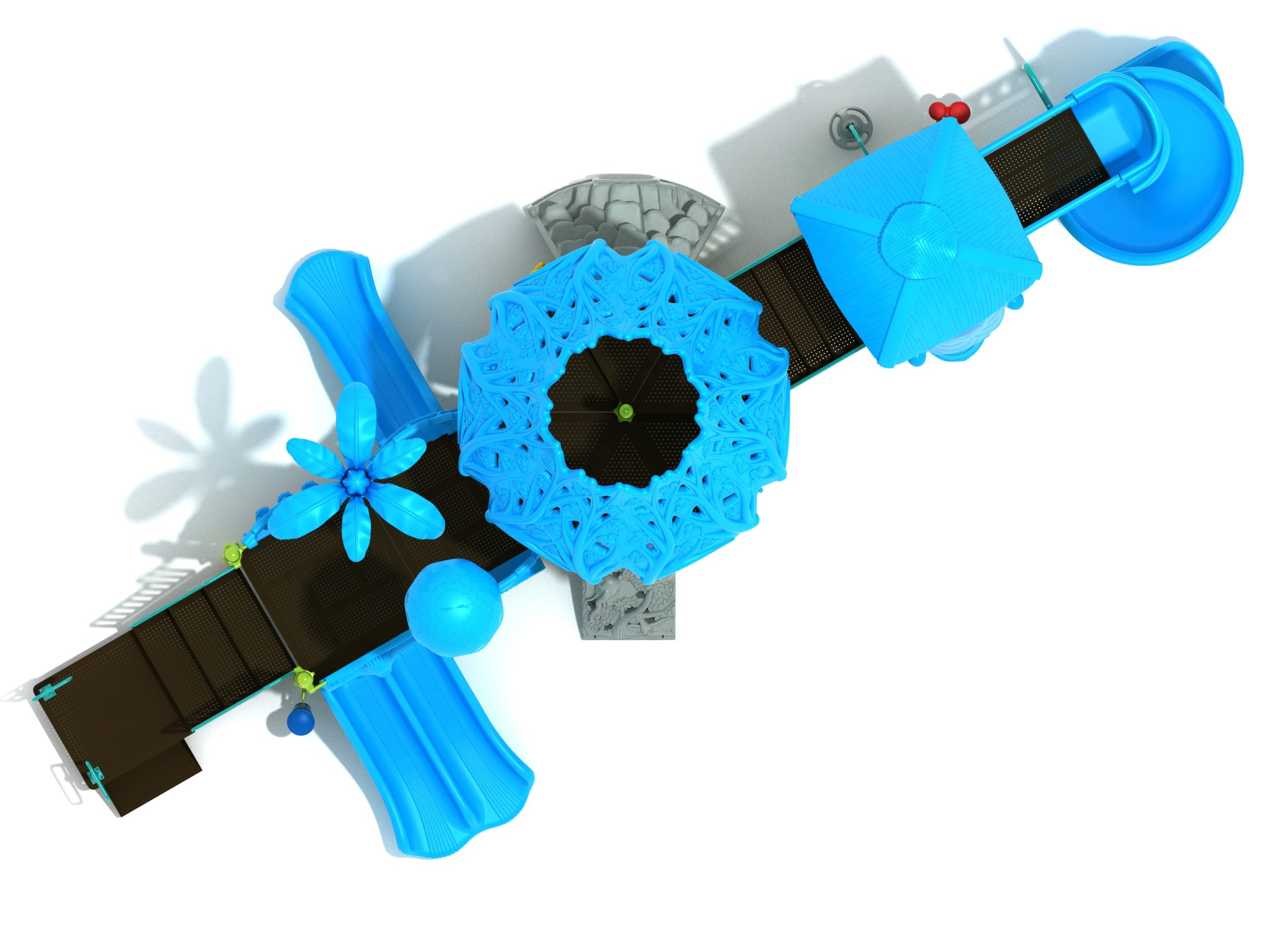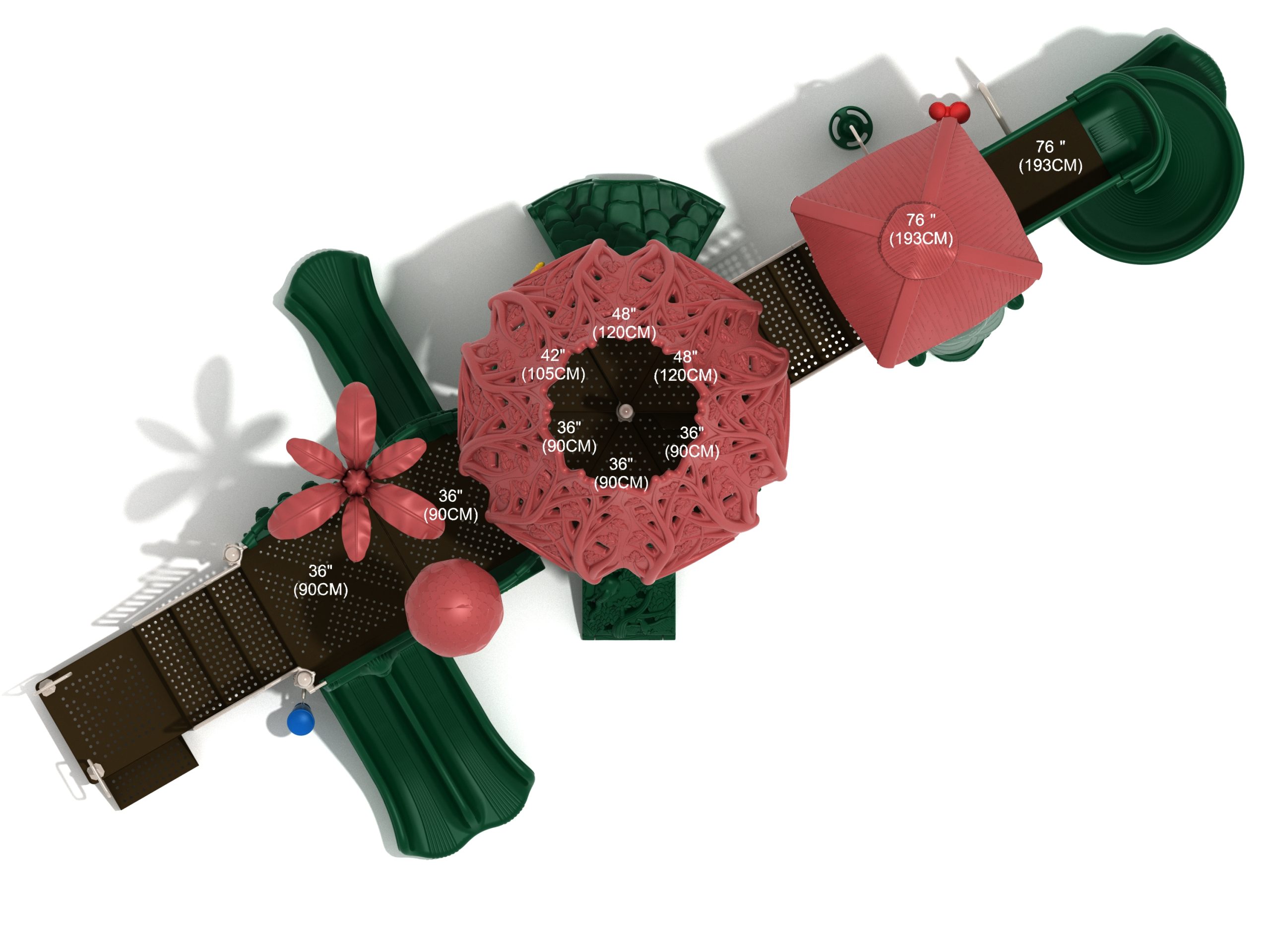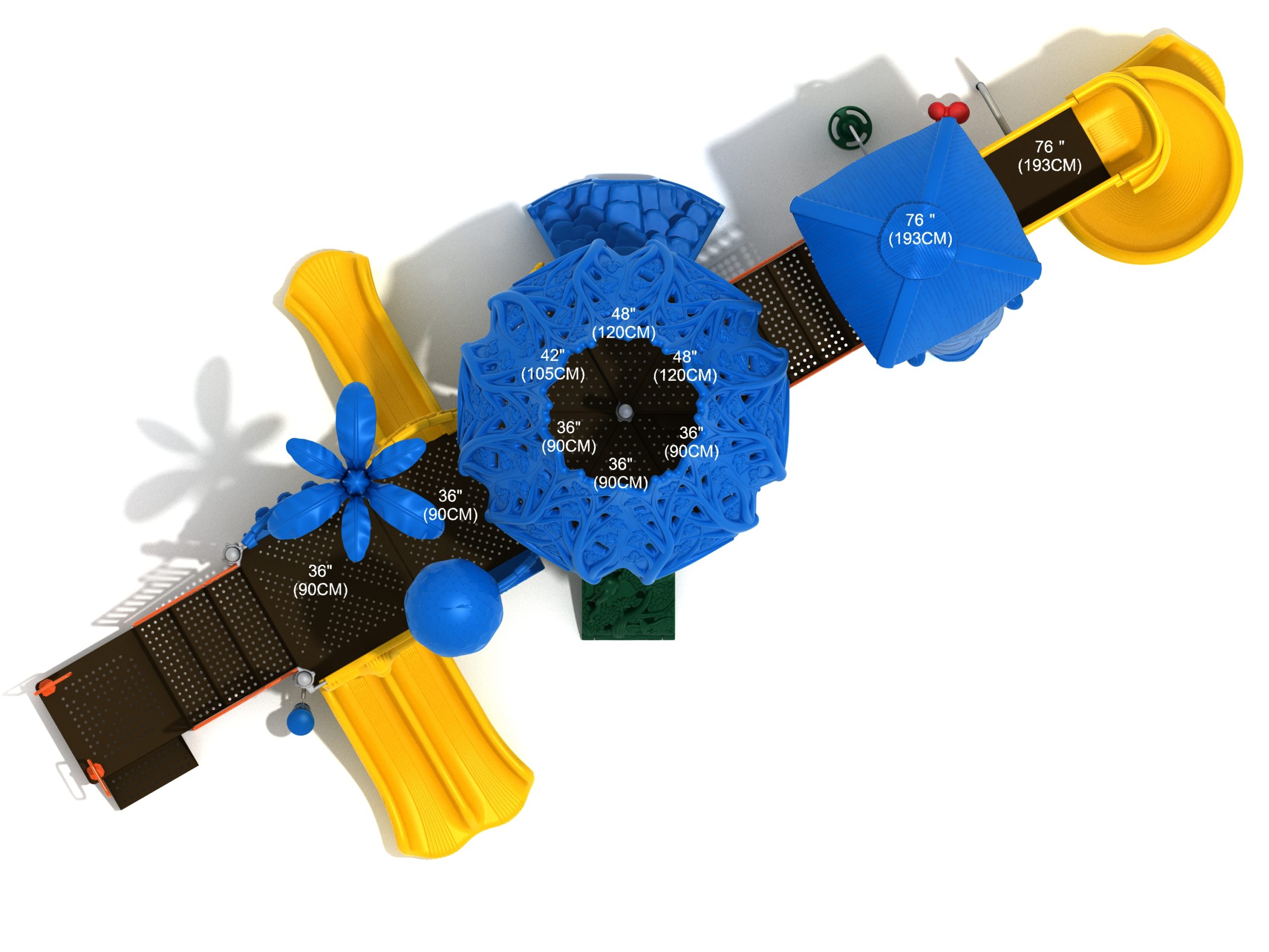 Hours of fun are guaranteed when the Romping Rhinoceros is installed in any playground. It boasts a linear design with lots of features on each side so it doesn’t matter which way around you want to place it. Capable of catering for dozens of children at the same time, the Romping Rhinoceros has three slides including a wavy Spiral Slide, a Double Slide for races, and a Wave Slide for a bumpy adventure. The central Hex Tree Roof is complemented by a Palm Tree Topper which aids with sparking kids’ imaginations, and this is reinforced with features like the Stump Store Panel for jungle roleplaying and the Jungle Climber which is perfect for introducing children to rainforest animals. A Rock Hole Climber on one side offers a variety of play scenarios. Kids can be climbing up a rock slide on a mountainside or they can explore the cave structure underneath. A Rain Wheel can make it sound like the clouds are dropping rain droplets, and the Bongos bring a brilliant beat to playtime.