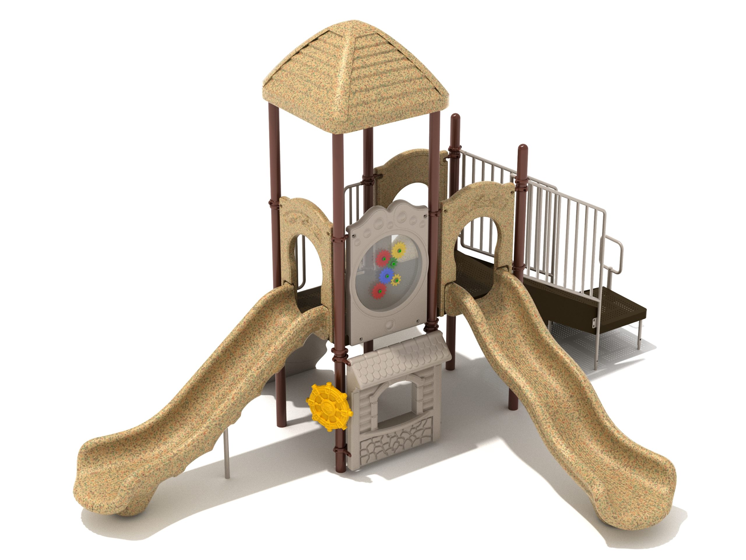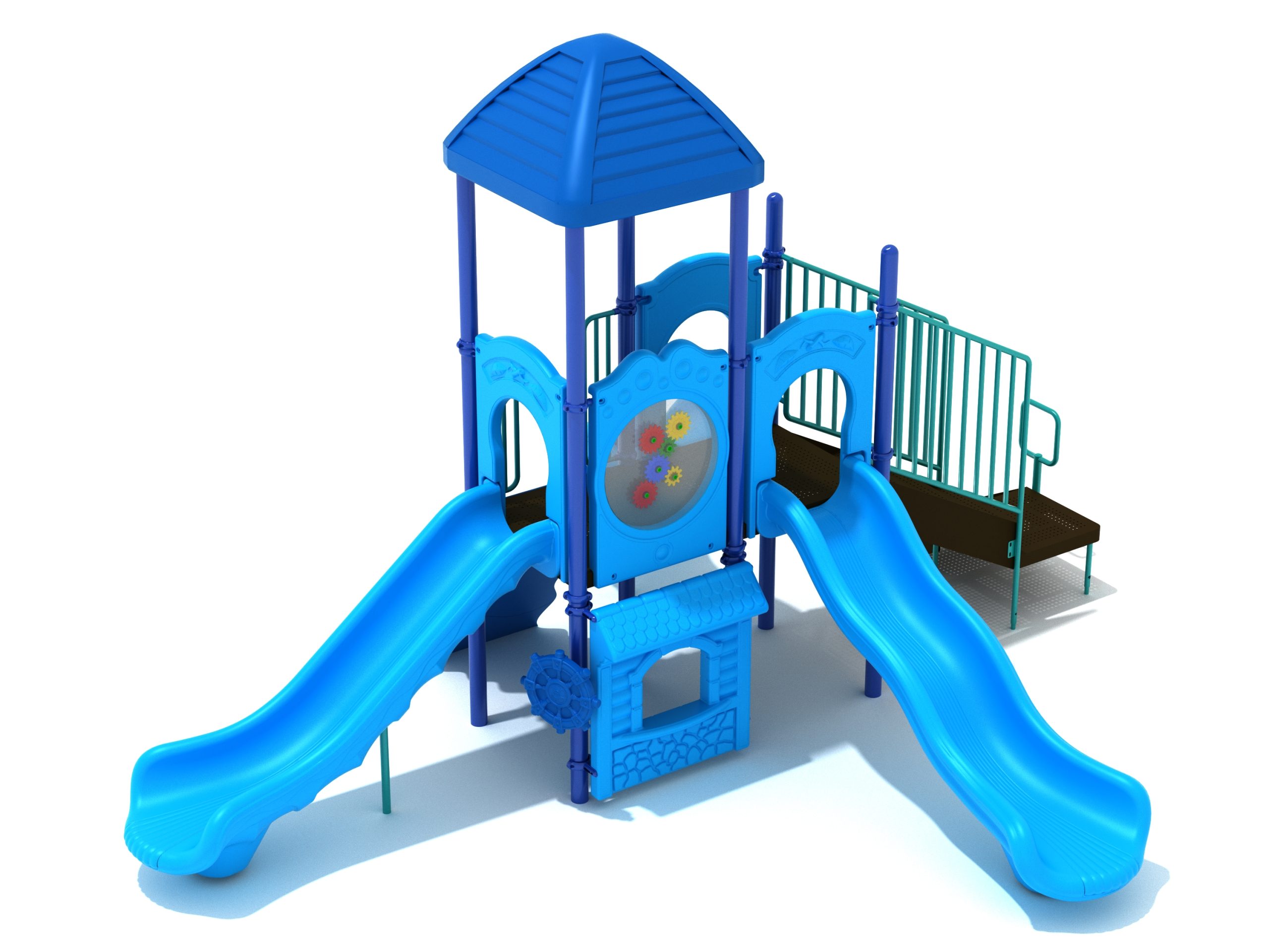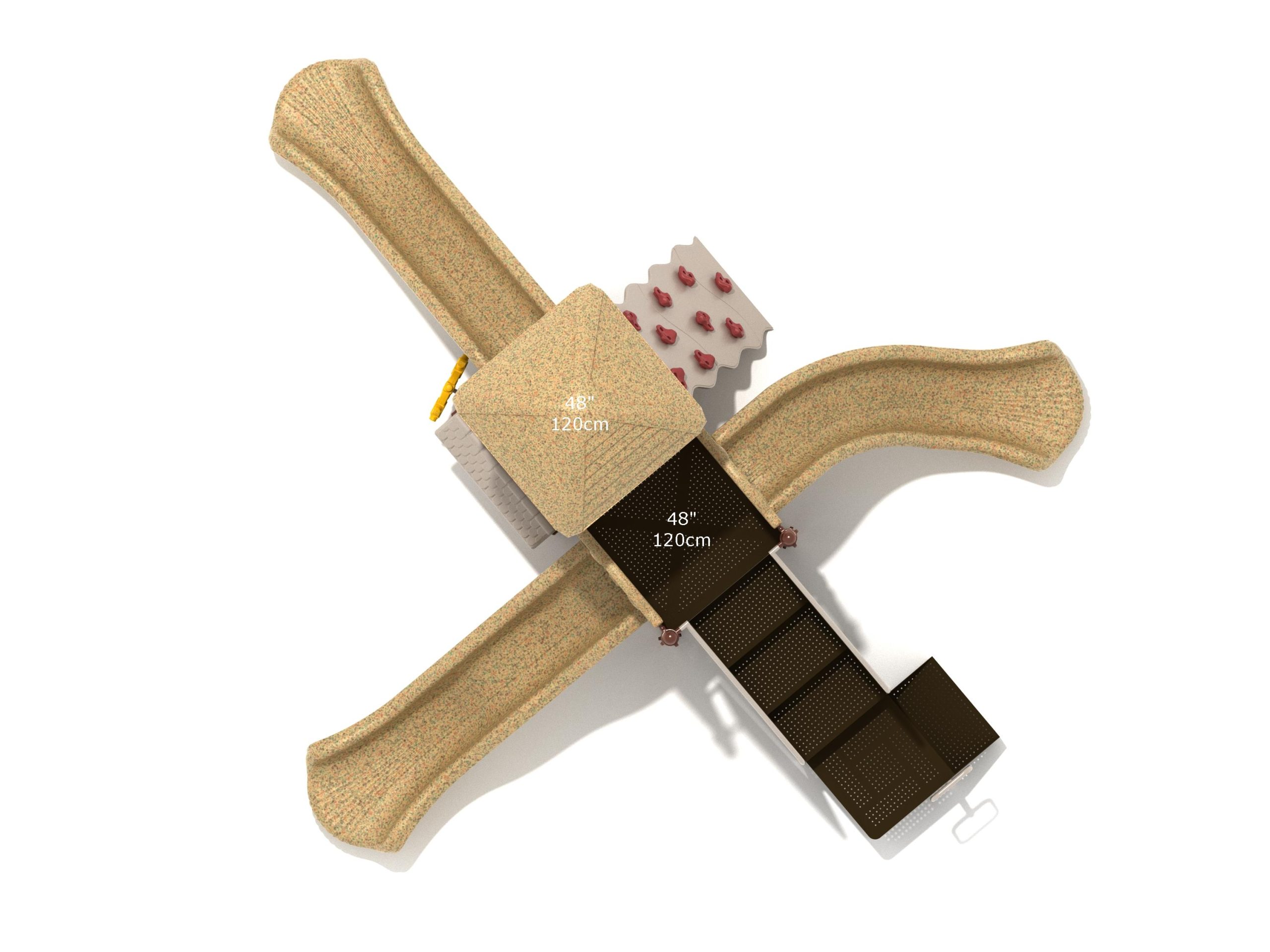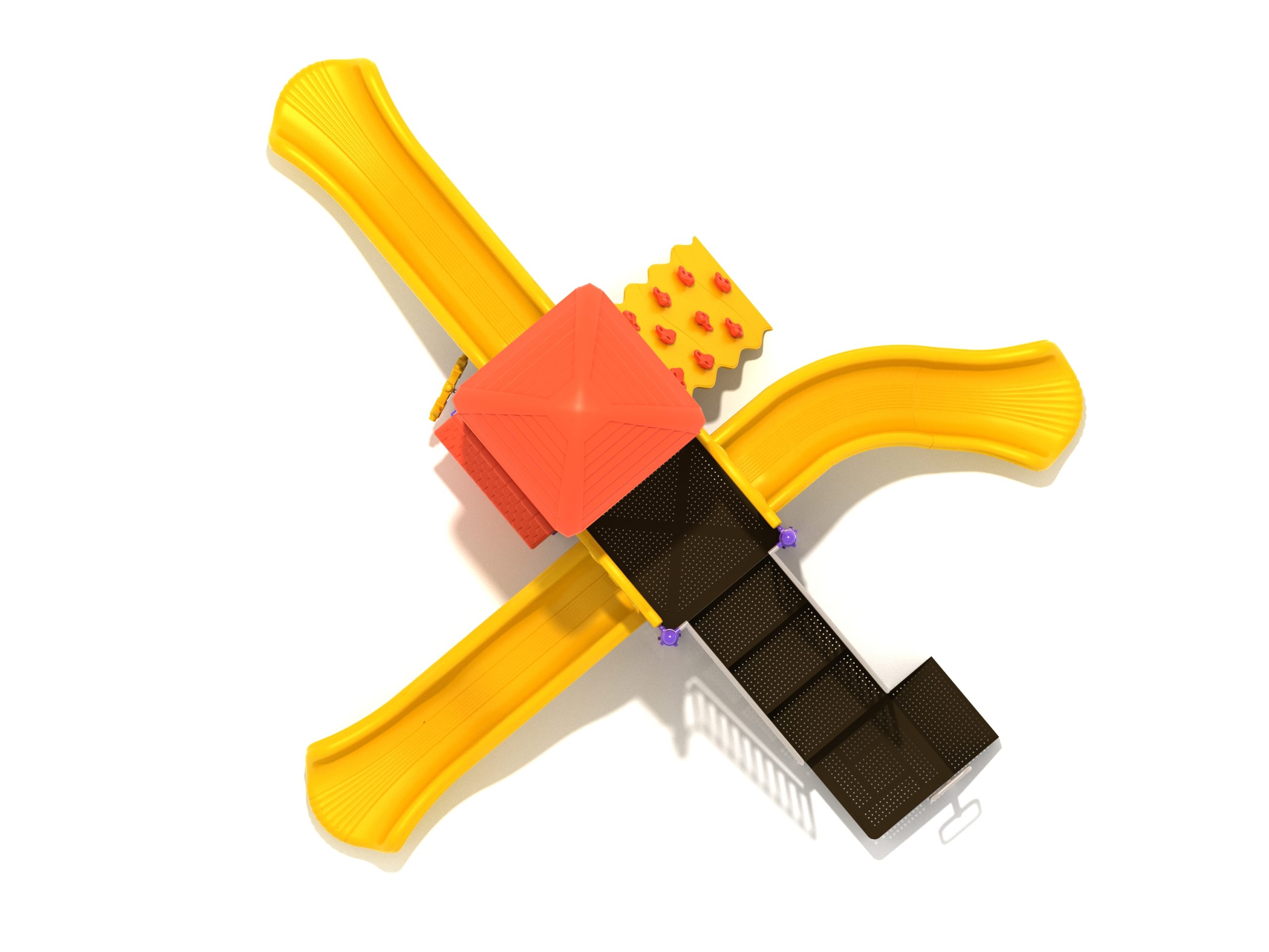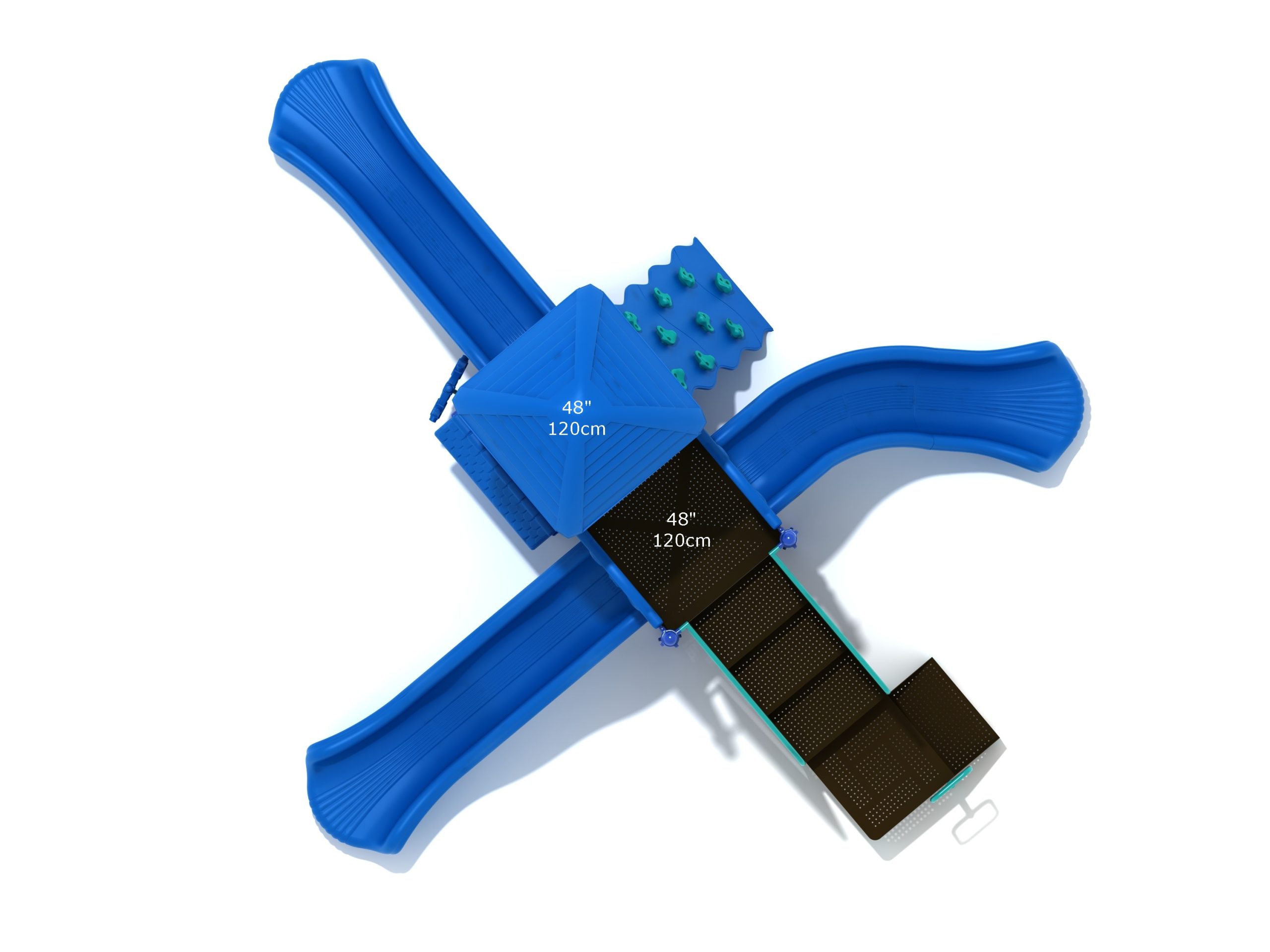 Children can ascend to the upper platform via the Transfer Station which features a gradual slope or test their skills on the Rock Climbing Wall. Kids will love to test their ability to scale this alternative to a ladder and pretend they’re working their way up a mountainside using the knobbly grips for hands and feet. When they reach the top there’s a Gear Panel directly in front that can be spun round to show how multiple cogs can work together to create motion. There’s a Line Roof above so no matter whether they need shelter from the rain or sun’s rays they have that protection. Three slides emerge in all directions from the San Rafael and whether they choose the fast Straight Slide, twisting Right Turn Slide or the bouncy Wave Slide they will love to experience it over and over. Creativity is inspired with a Store Panel underneath where children can go shopping for groceries or be the seller taking payments and cashing in coupons. They can also pretend to be sailors on rough seas with the addition of a Ship’s Wheel.