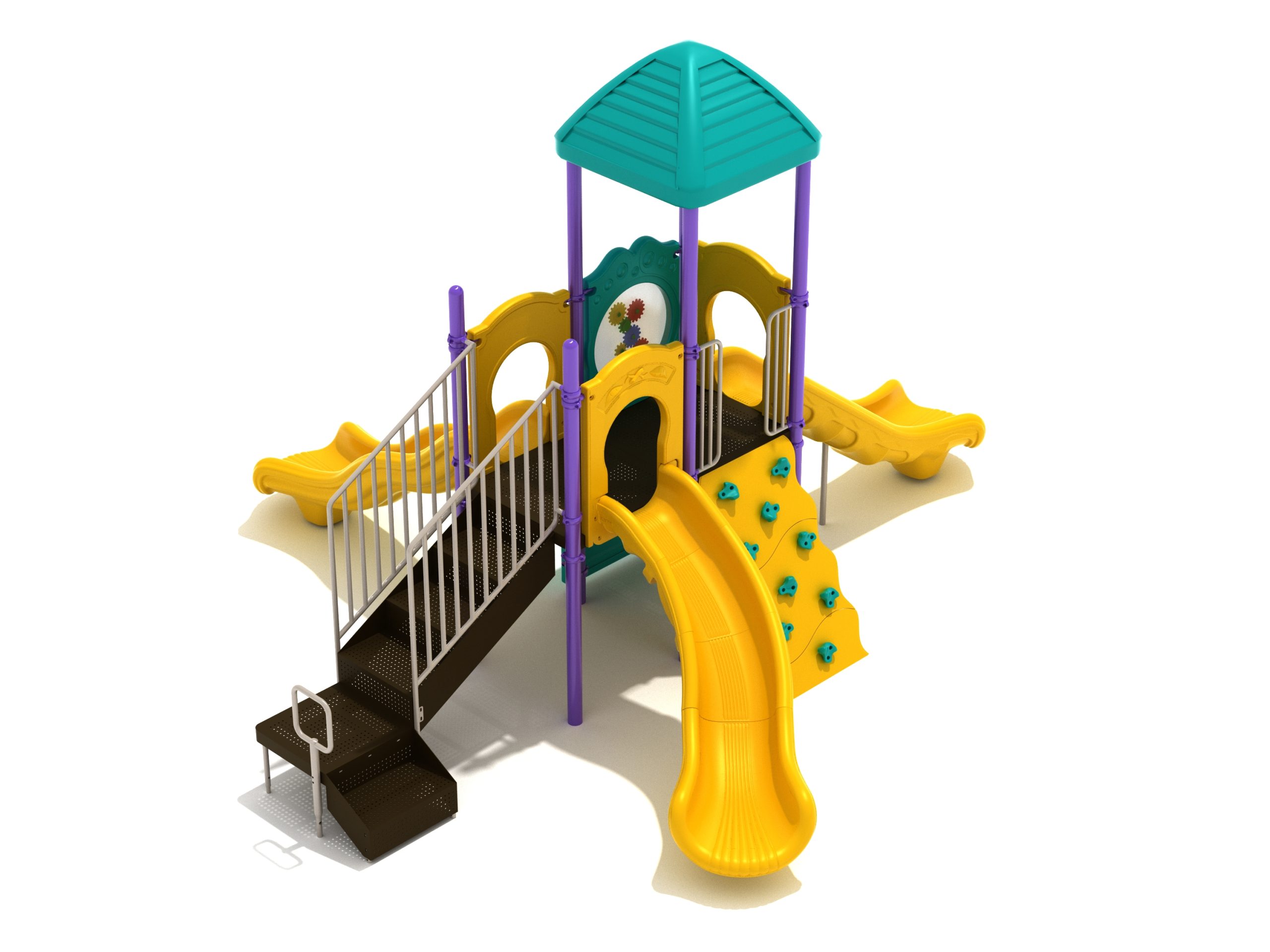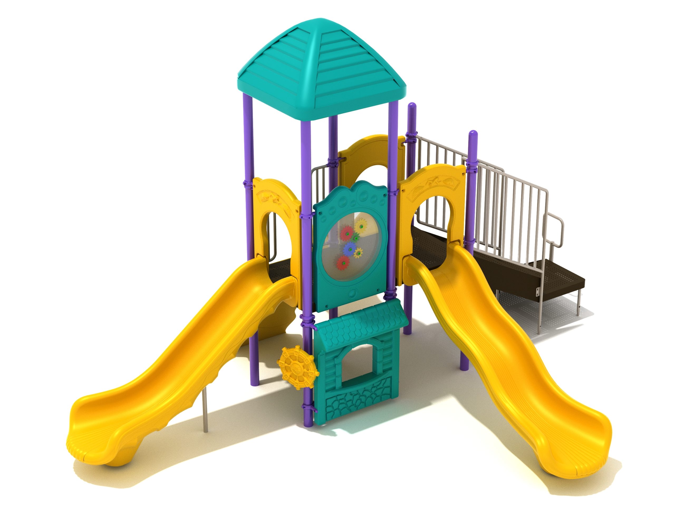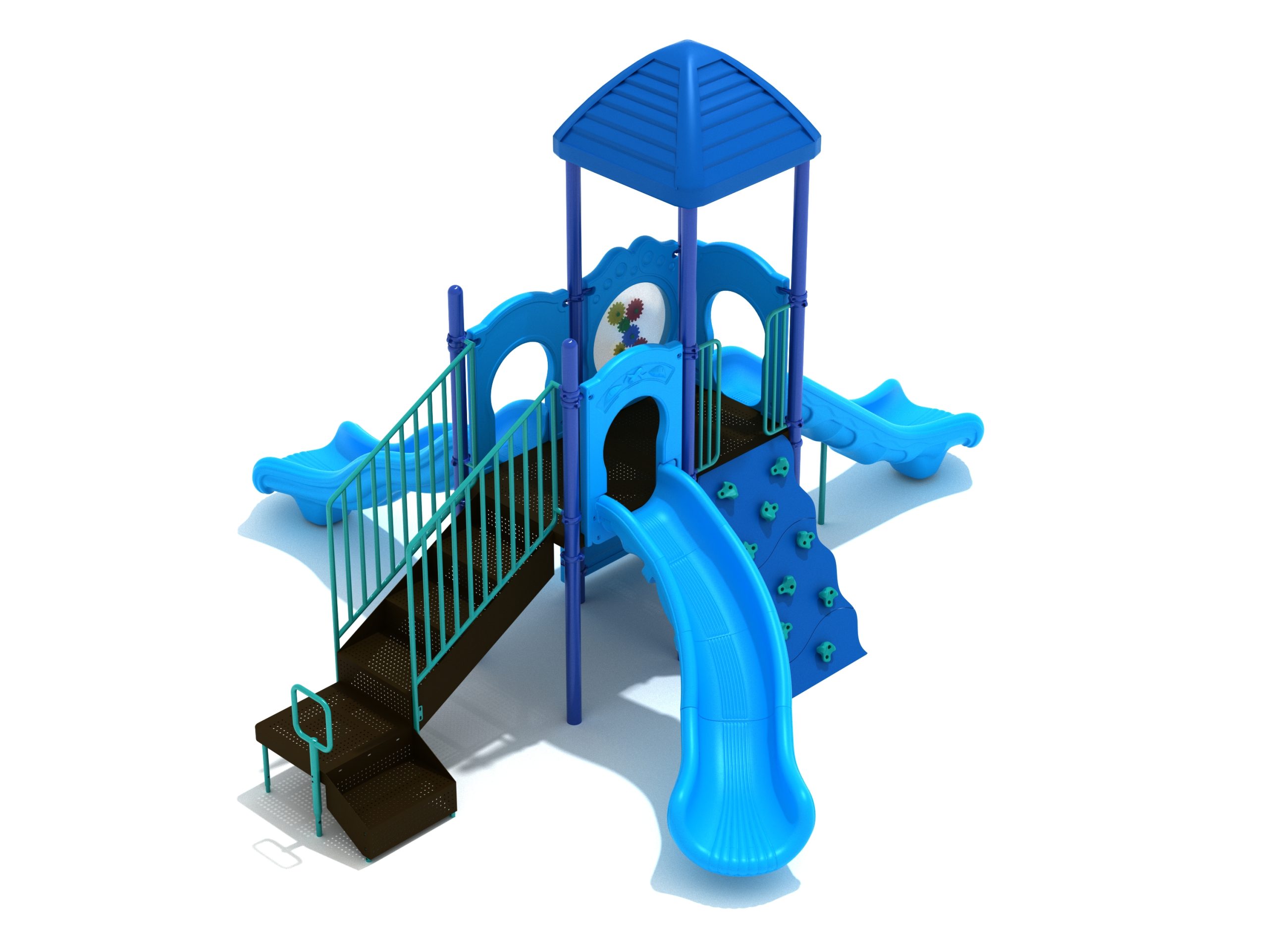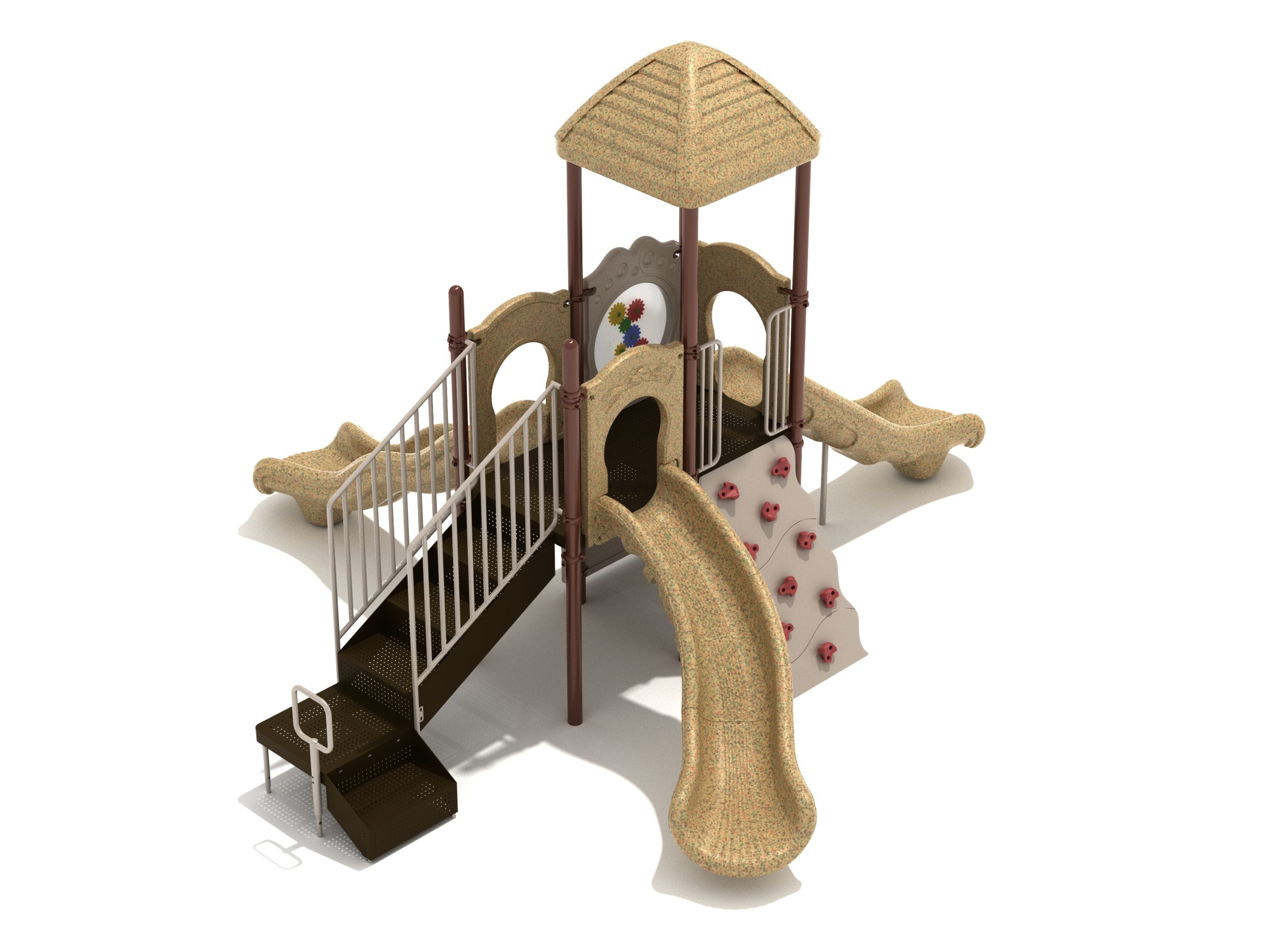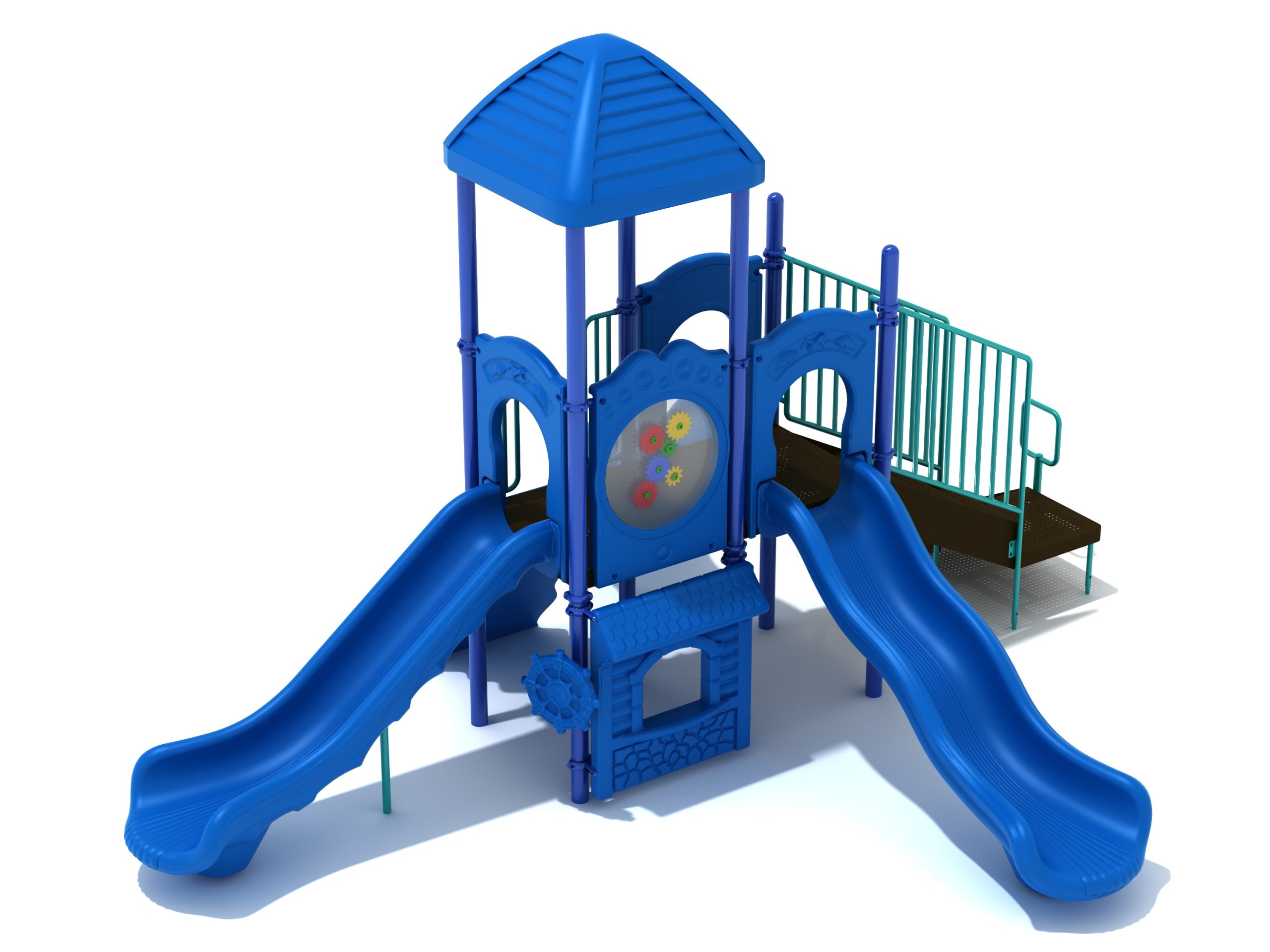 Children can ascend to the upper platform via the Transfer Station which features a gradual slope or test their skills on the Rock Climbing Wall. Kids will love to test their ability to scale this alternative to a ladder and pretend they’re working their way up a mountainside using the knobbly grips for hands and feet. When they reach the top there’s a Gear Panel directly in front that can be spun round to show how multiple cogs can work together to create motion. There’s a Line Roof above so no matter whether they need shelter from the rain or sun’s rays they have that protection. Three slides emerge in all directions from the San Rafael and whether they choose the fast Straight Slide, twisting Right Turn Slide or the bouncy Wave Slide they will love to experience it over and over. Creativity is inspired with a Store Panel underneath where children can go shopping for groceries or be the seller taking payments and cashing in coupons. They can also pretend to be sailors on rough seas with the addition of a Ship’s Wheel.