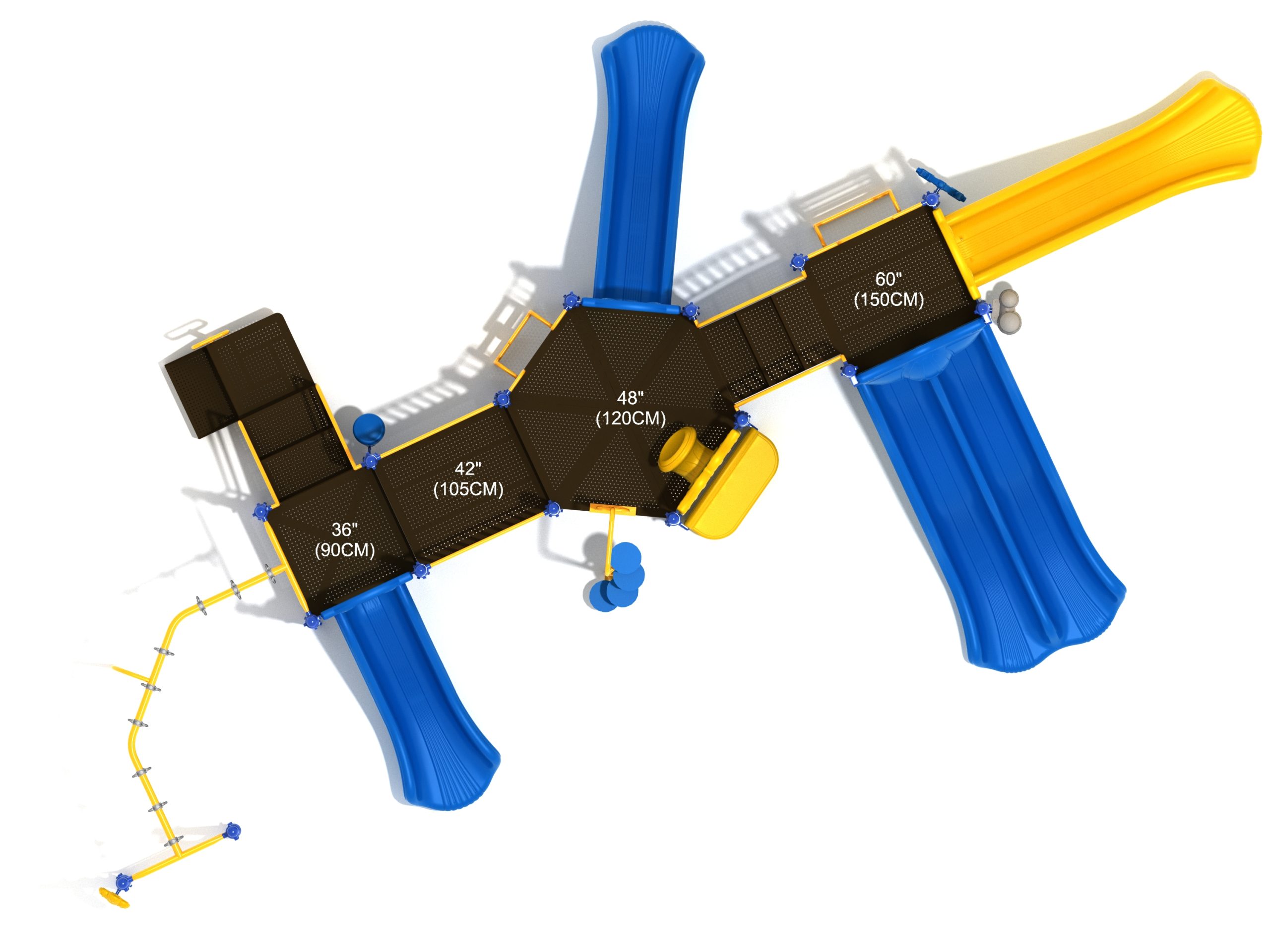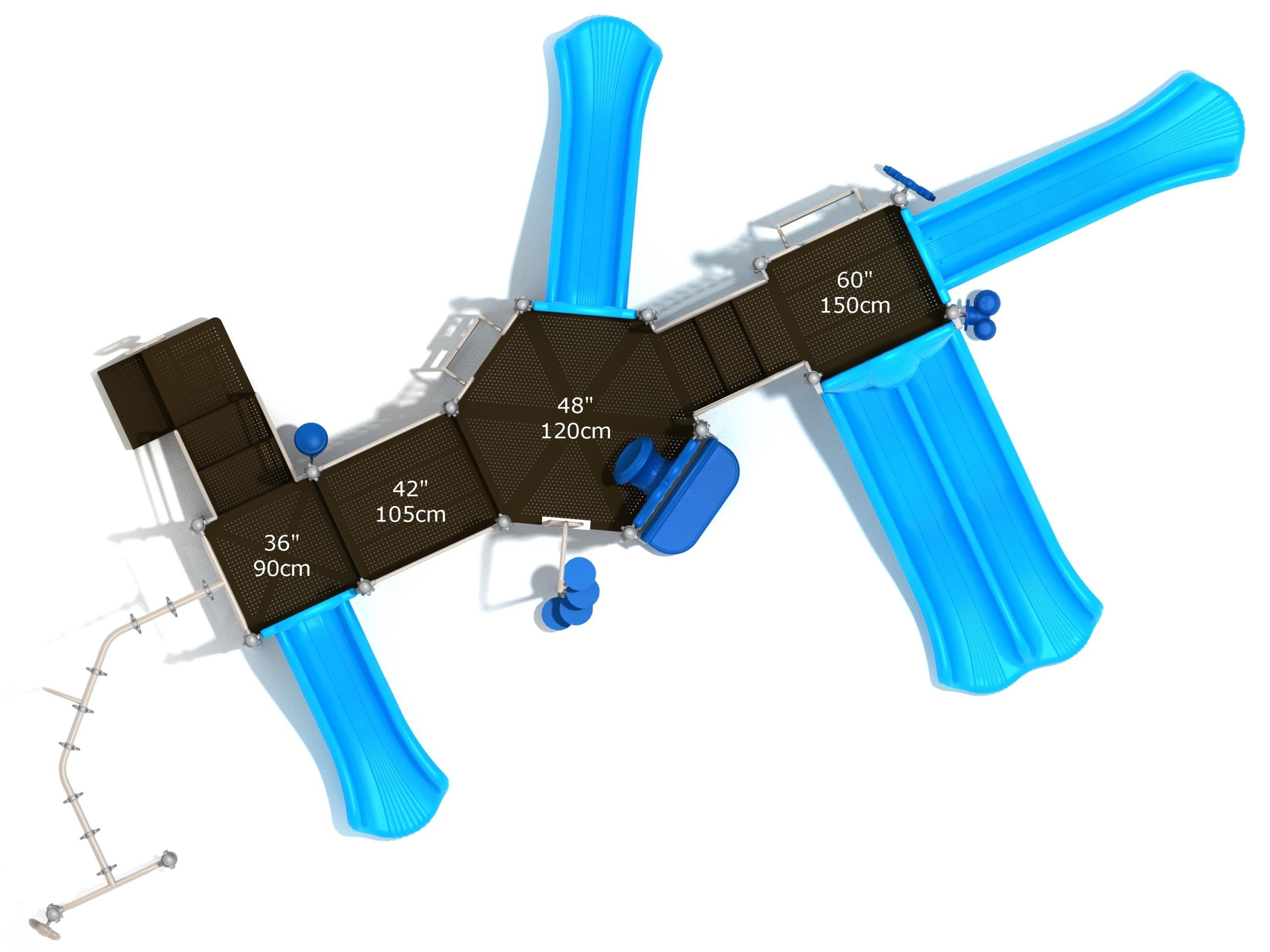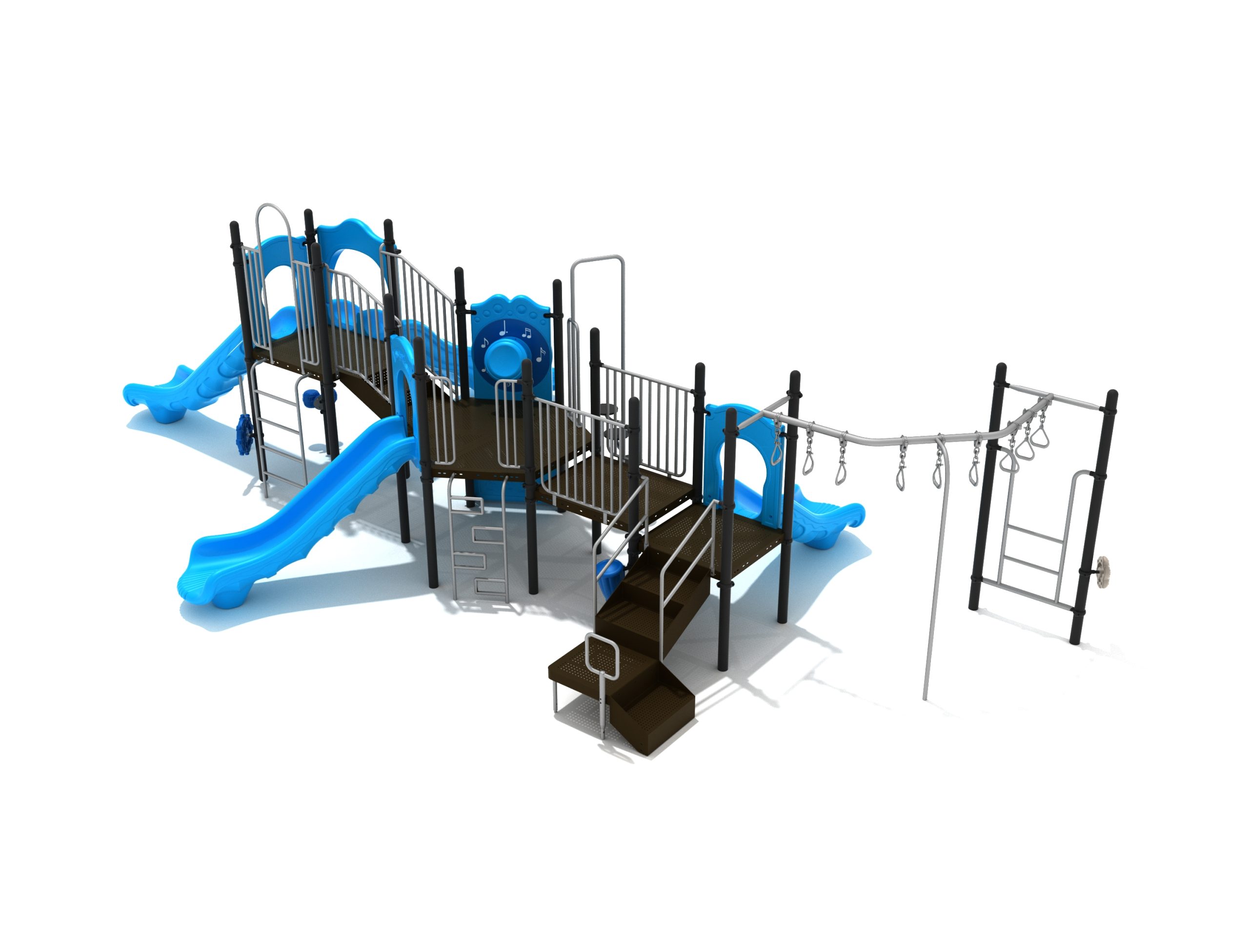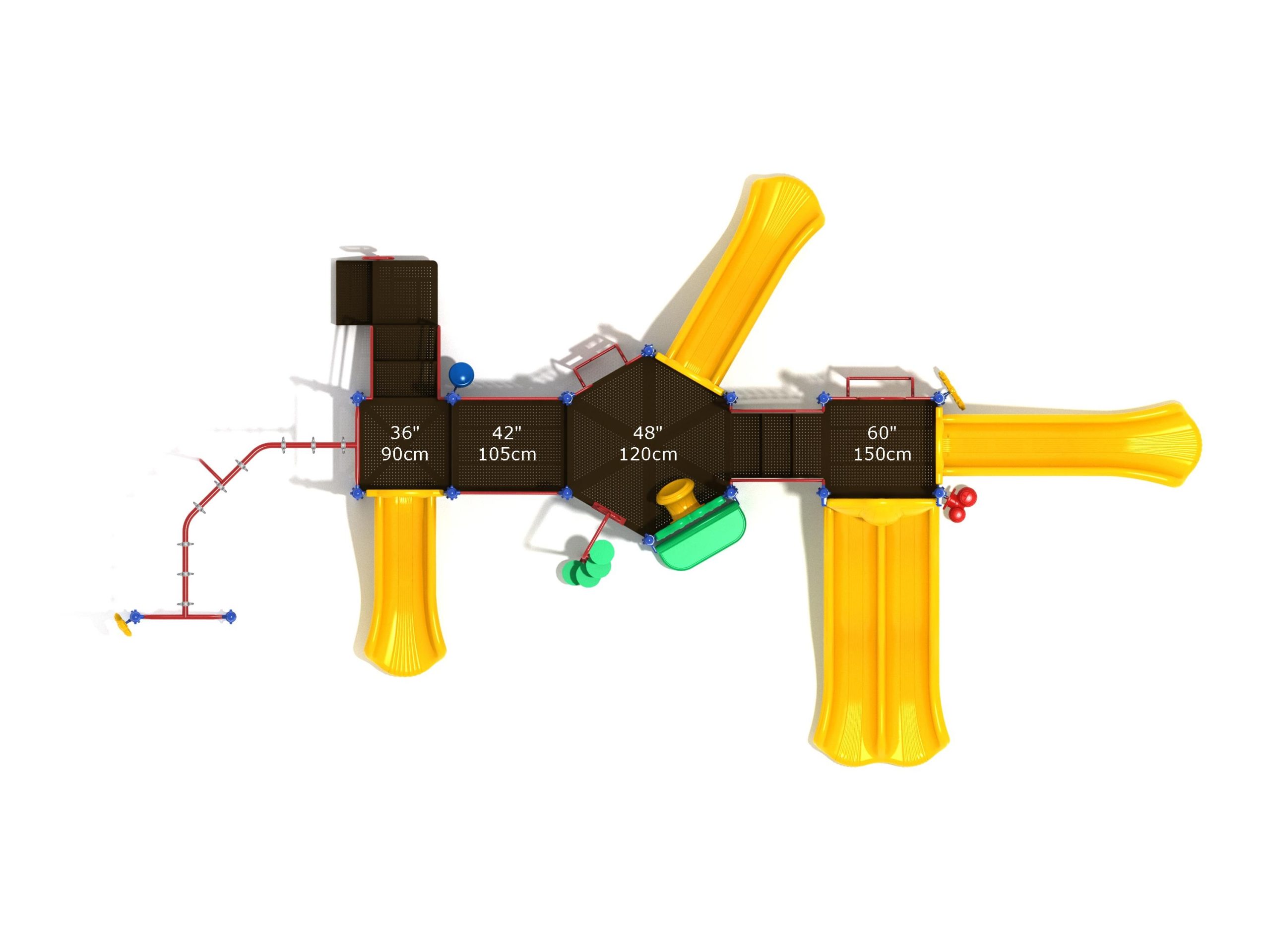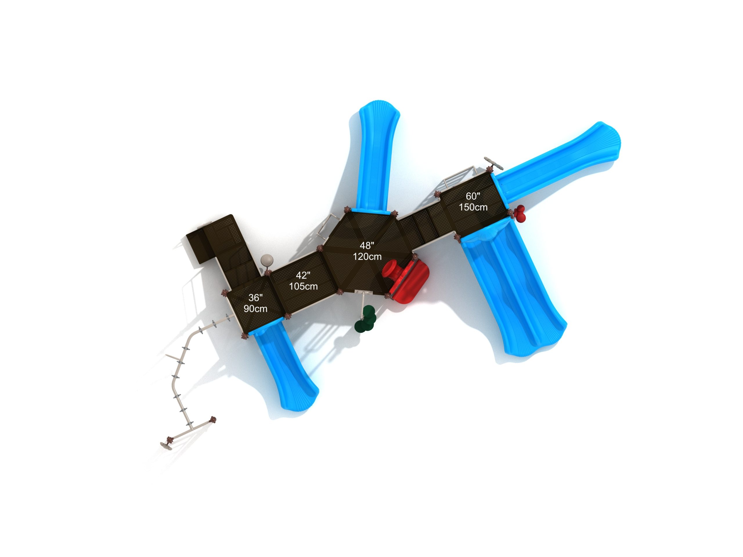 When you install the Santa Monica structure in a playground or public space you’re providing lots of enjoyment for many children of different ages and abilities. Promote physical fitness with a 90 Degree Overhead Swing Ladder accessible by a short Vertical Ladder and watch them use their upper body strength to achieve success. There is a longer Vertical Ladder to access the platform directly, but you can be sure that children will be choosing the more adventurous ways to climb up including the Disk Climber made up of circular footpads of the Zipper Climber which requires some basic hand-eye coordination. Three Straight Slides emerge in different directions which allow children to make decisions about which one they choose, but there’s a Double Wave Slide that every child will want to zip down quickly. Features like the Single Drum, Drum Panel and Bongos add an auditory experience to the structure, and the Rain Wheel and Ship’s Wheel add movement as they spin round and round when touched. A Bench Panel underneath provides an area for respite when kids need to recharge their batteries.