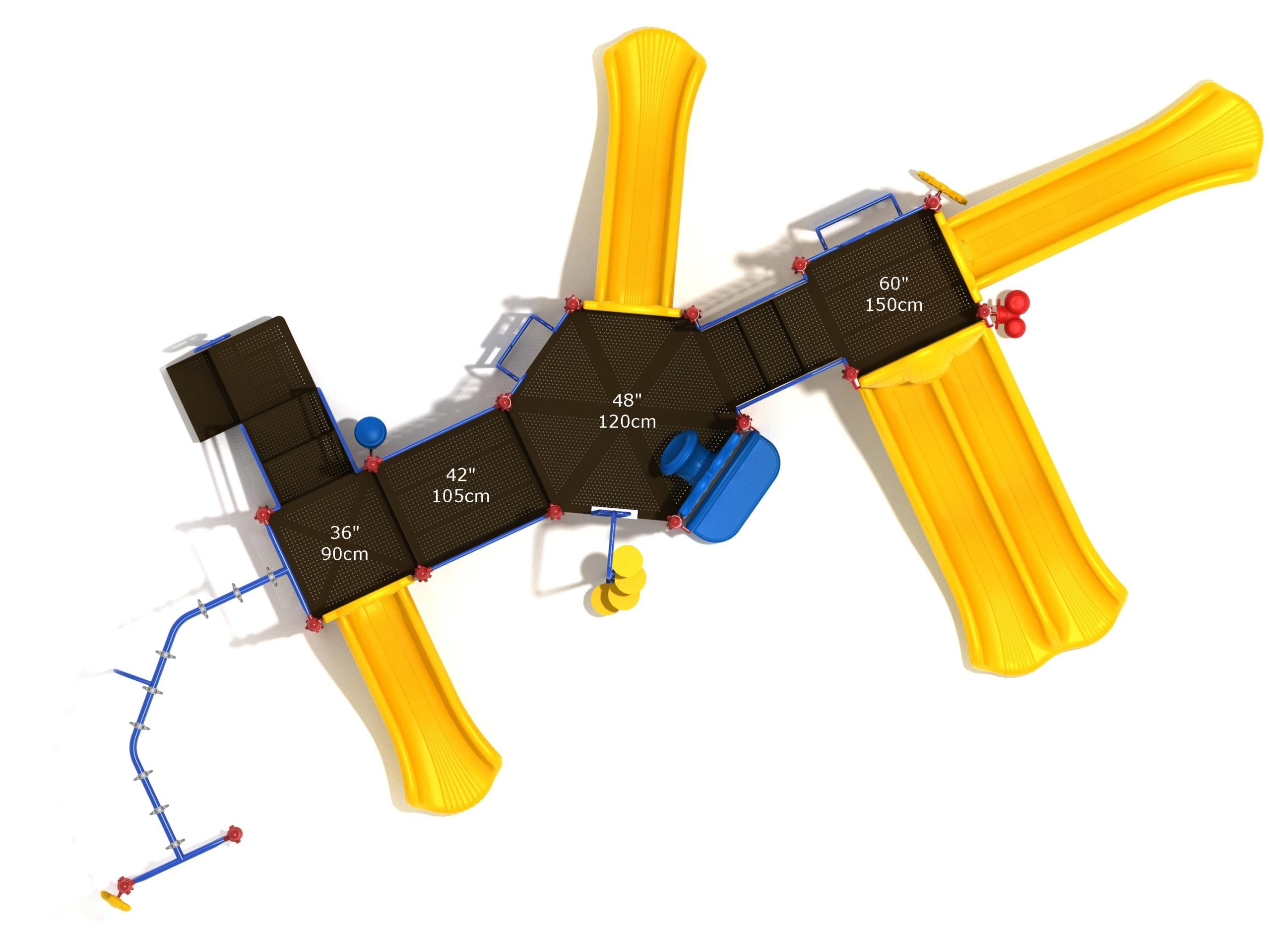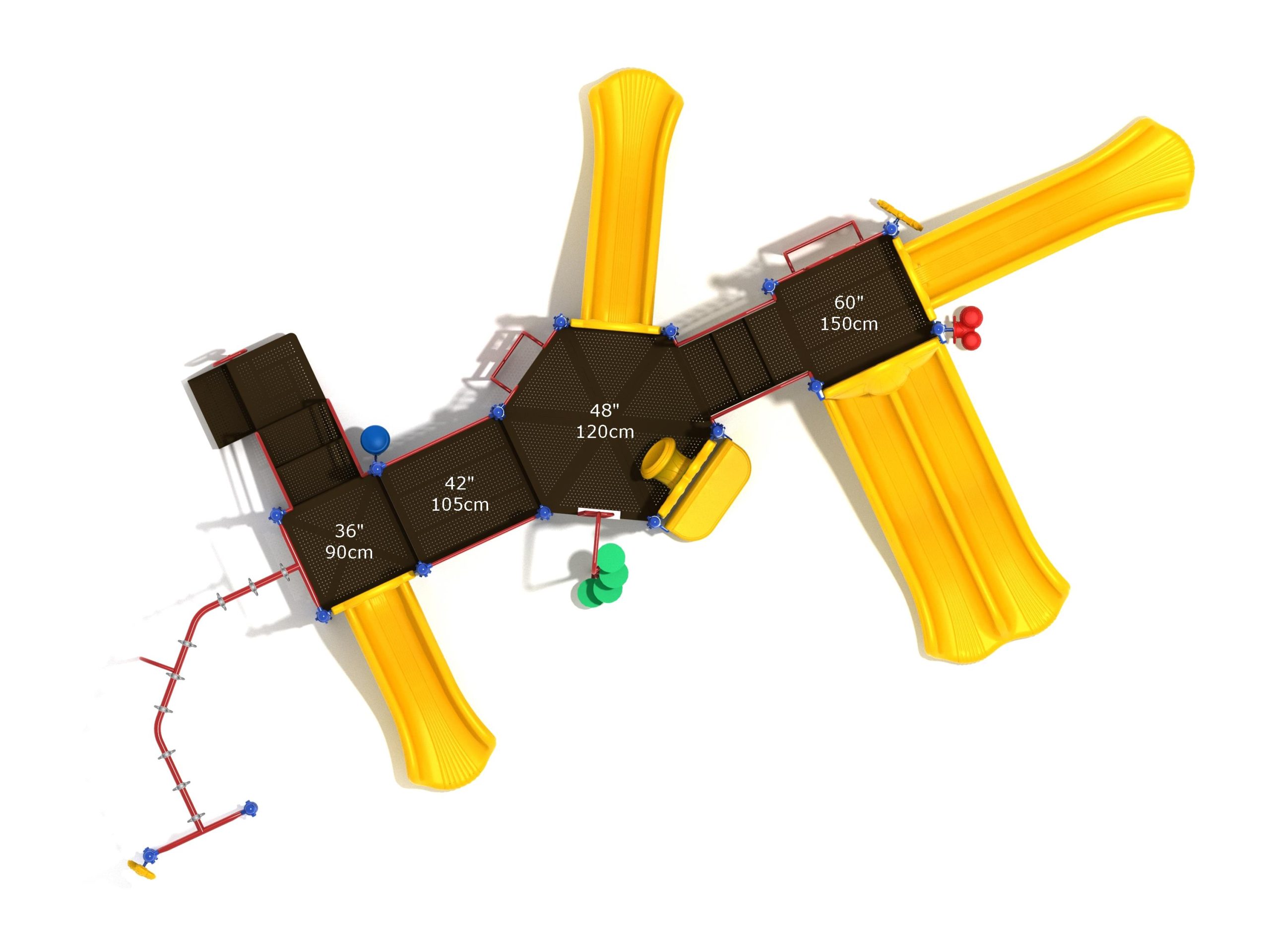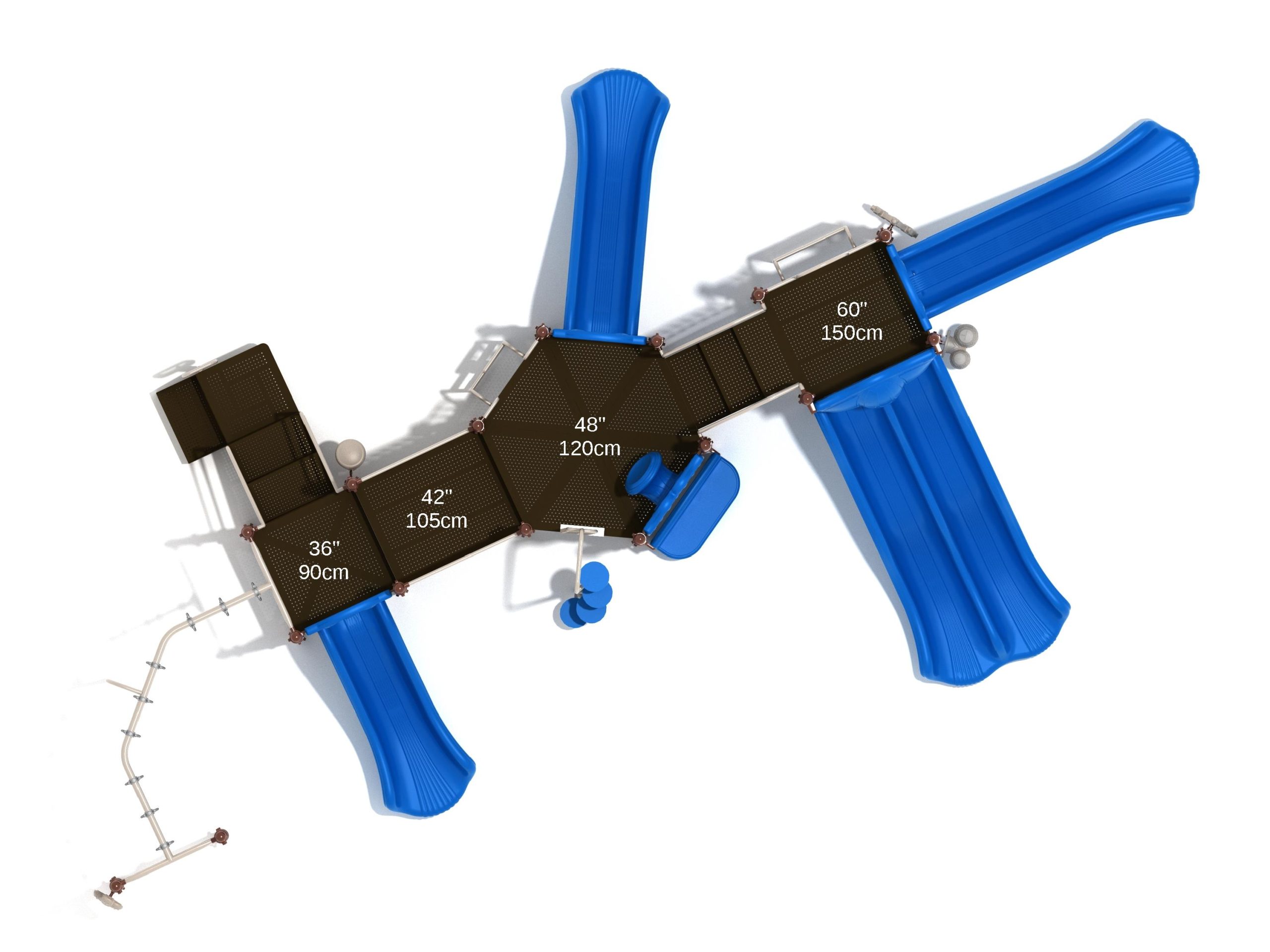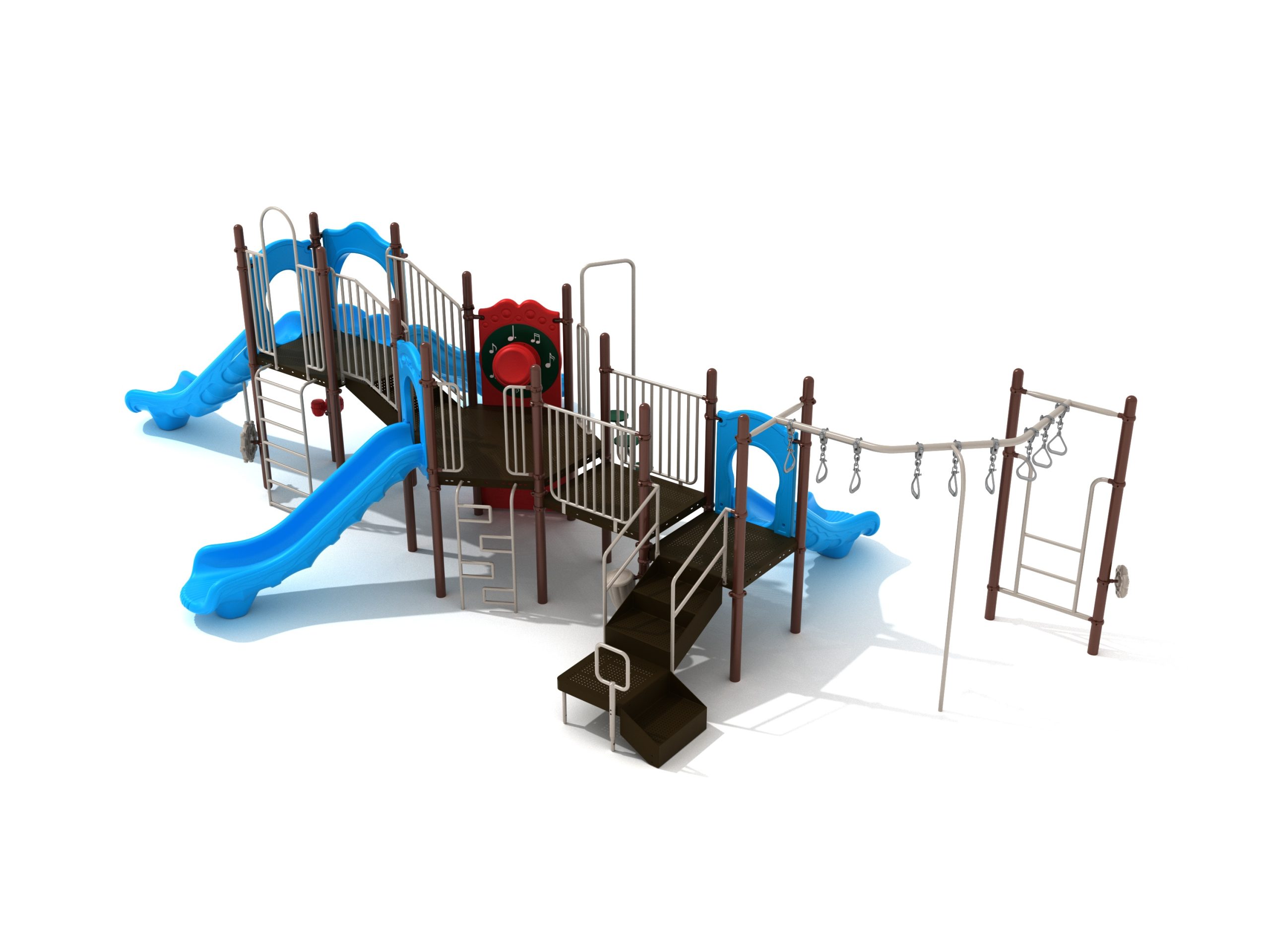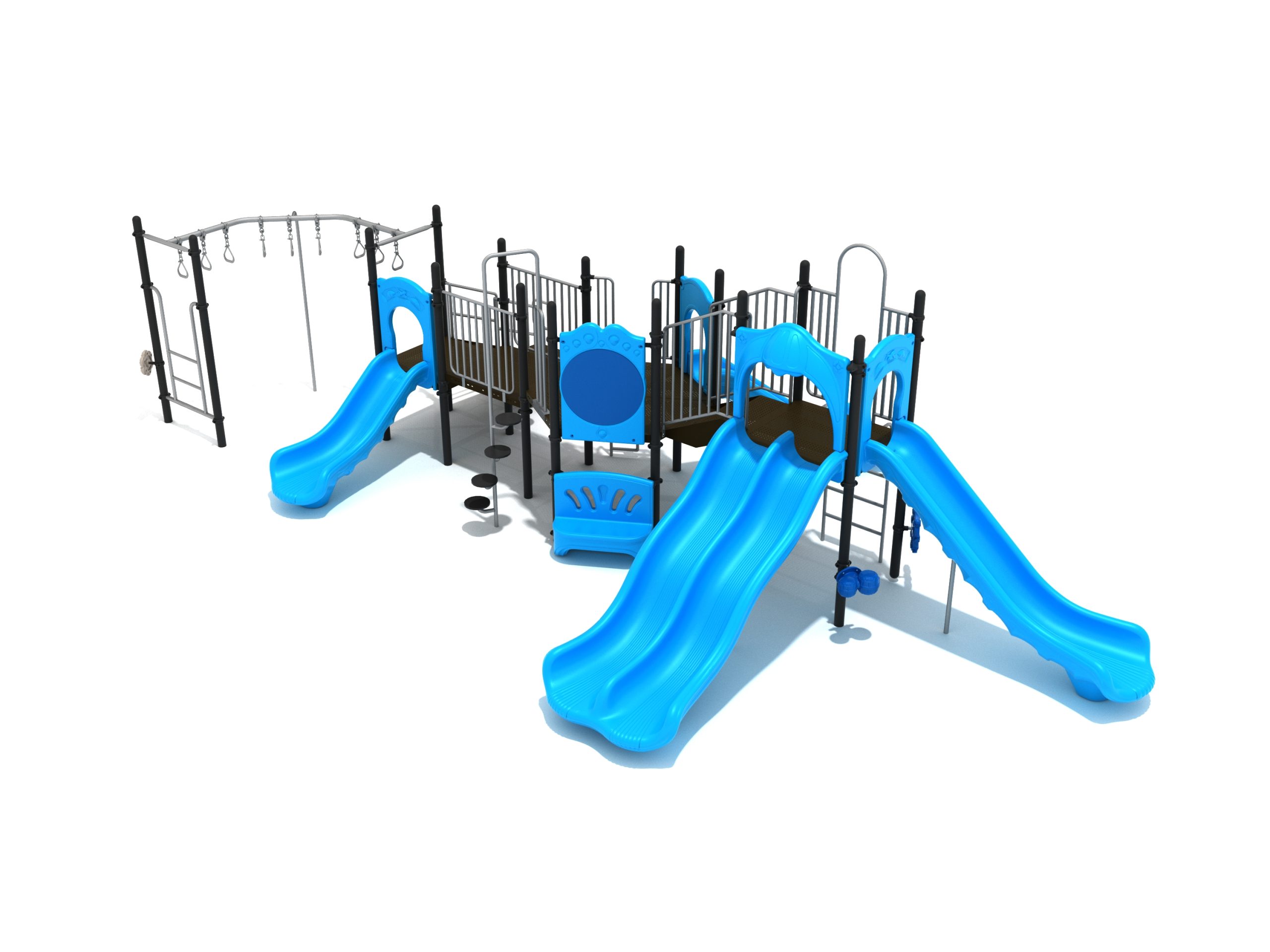 When you install the Santa Monica structure in a playground or public space you’re providing lots of enjoyment for many children of different ages and abilities. Promote physical fitness with a 90 Degree Overhead Swing Ladder accessible by a short Vertical Ladder and watch them use their upper body strength to achieve success. There is a longer Vertical Ladder to access the platform directly, but you can be sure that children will be choosing the more adventurous ways to climb up including the Disk Climber made up of circular footpads of the Zipper Climber which requires some basic hand-eye coordination. Three Straight Slides emerge in different directions which allow children to make decisions about which one they choose, but there’s a Double Wave Slide that every child will want to zip down quickly. Features like the Single Drum, Drum Panel and Bongos add an auditory experience to the structure, and the Rain Wheel and Ship’s Wheel add movement as they spin round and round when touched. A Bench Panel underneath provides an area for respite when kids need to recharge their batteries.