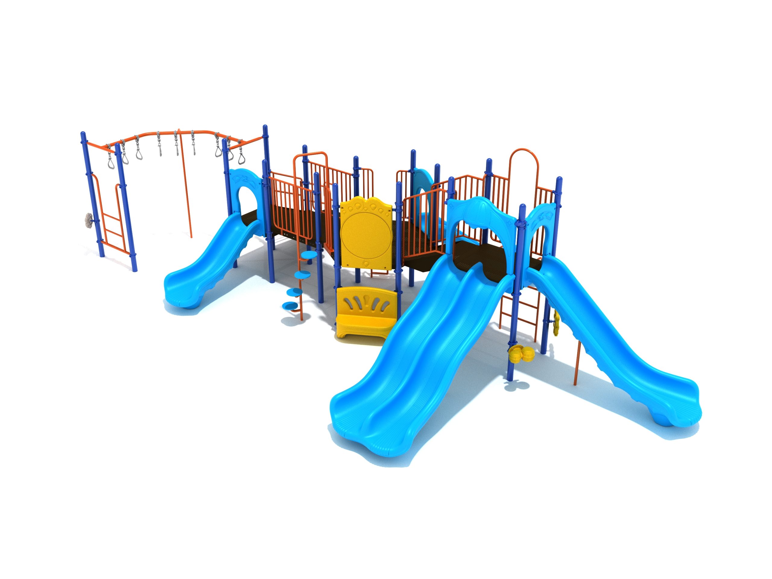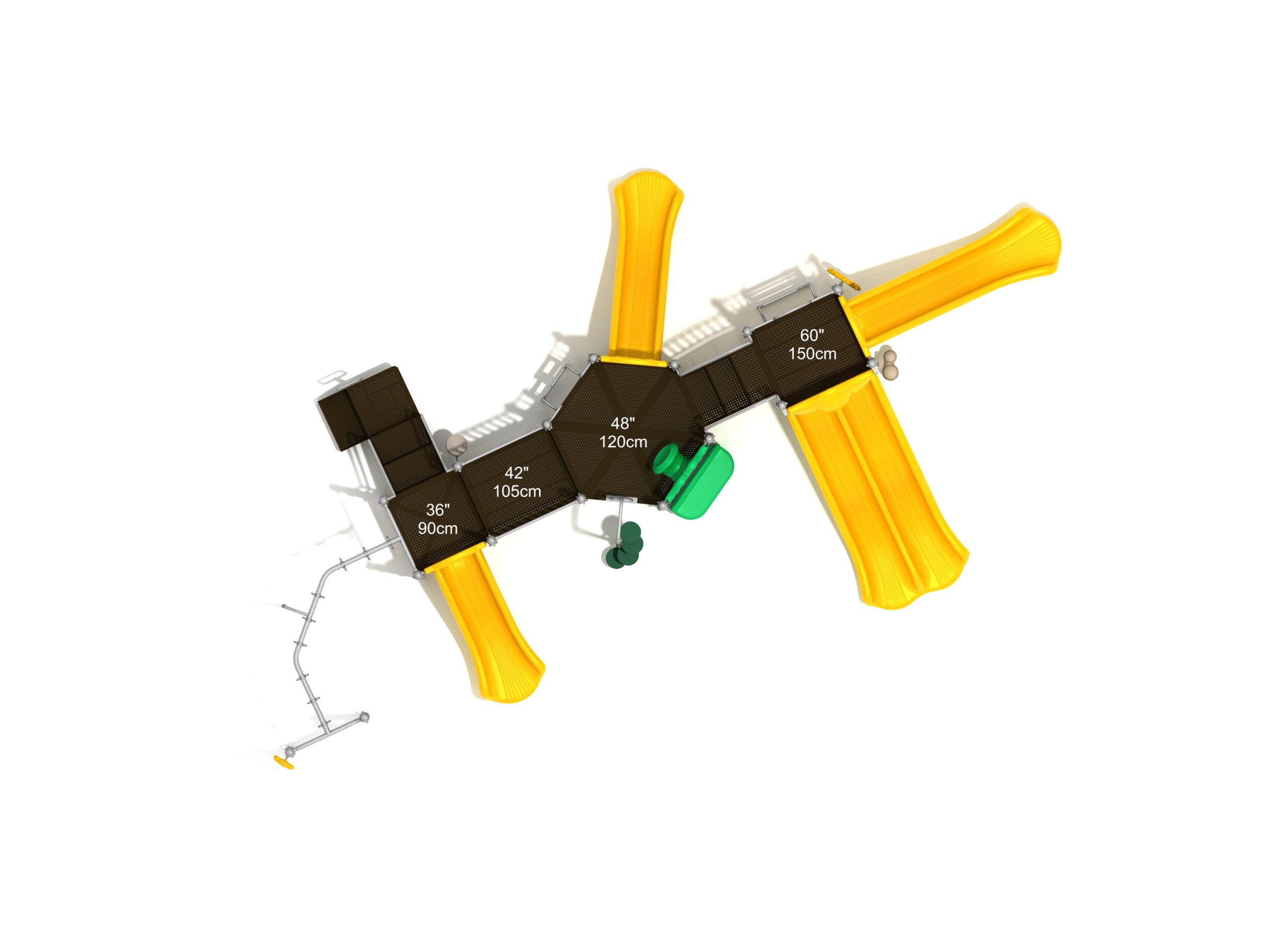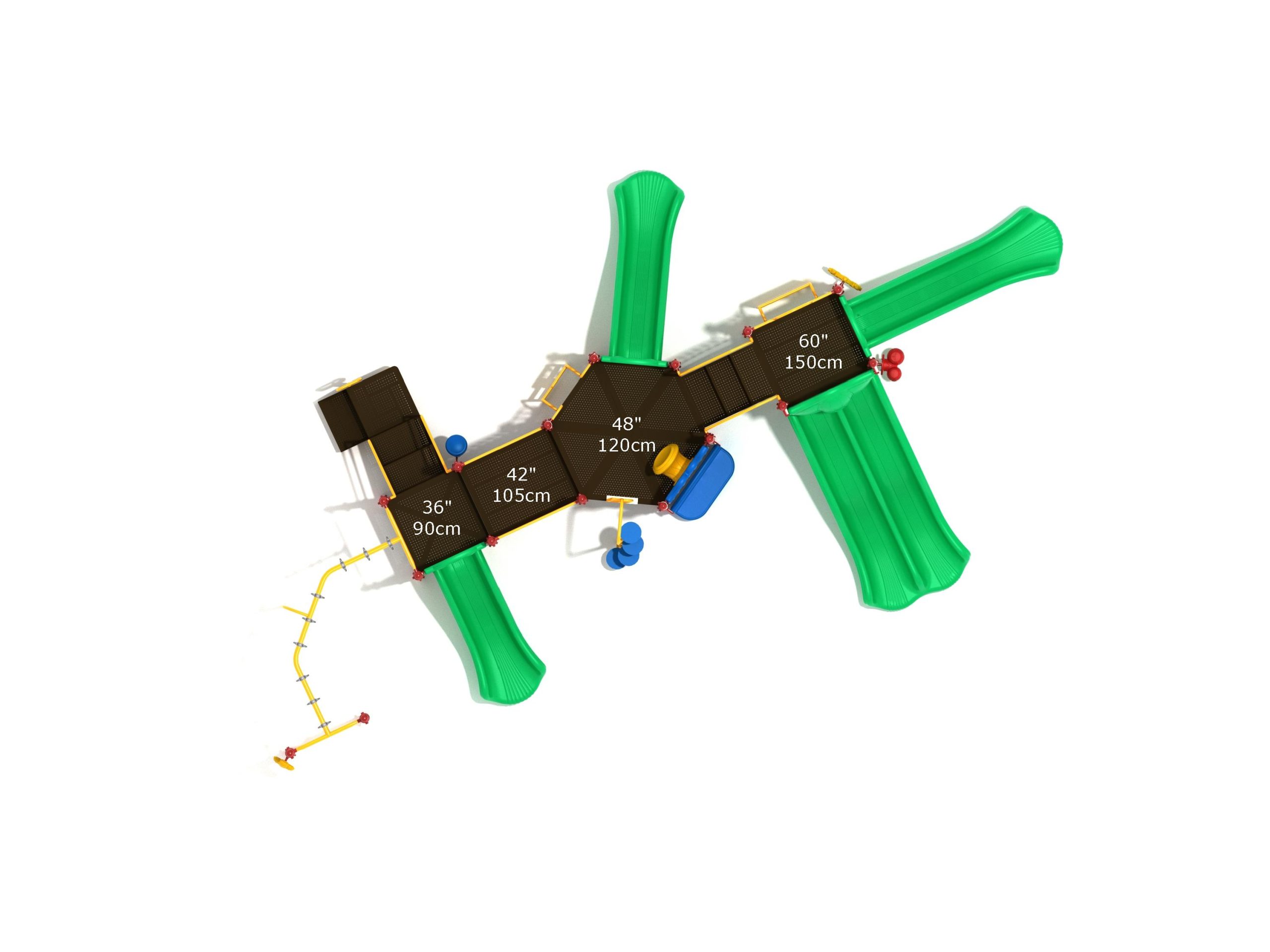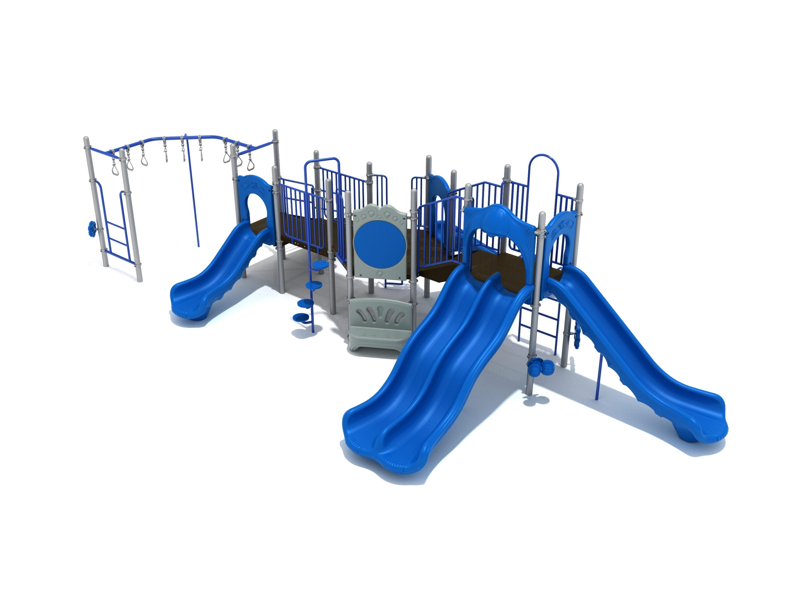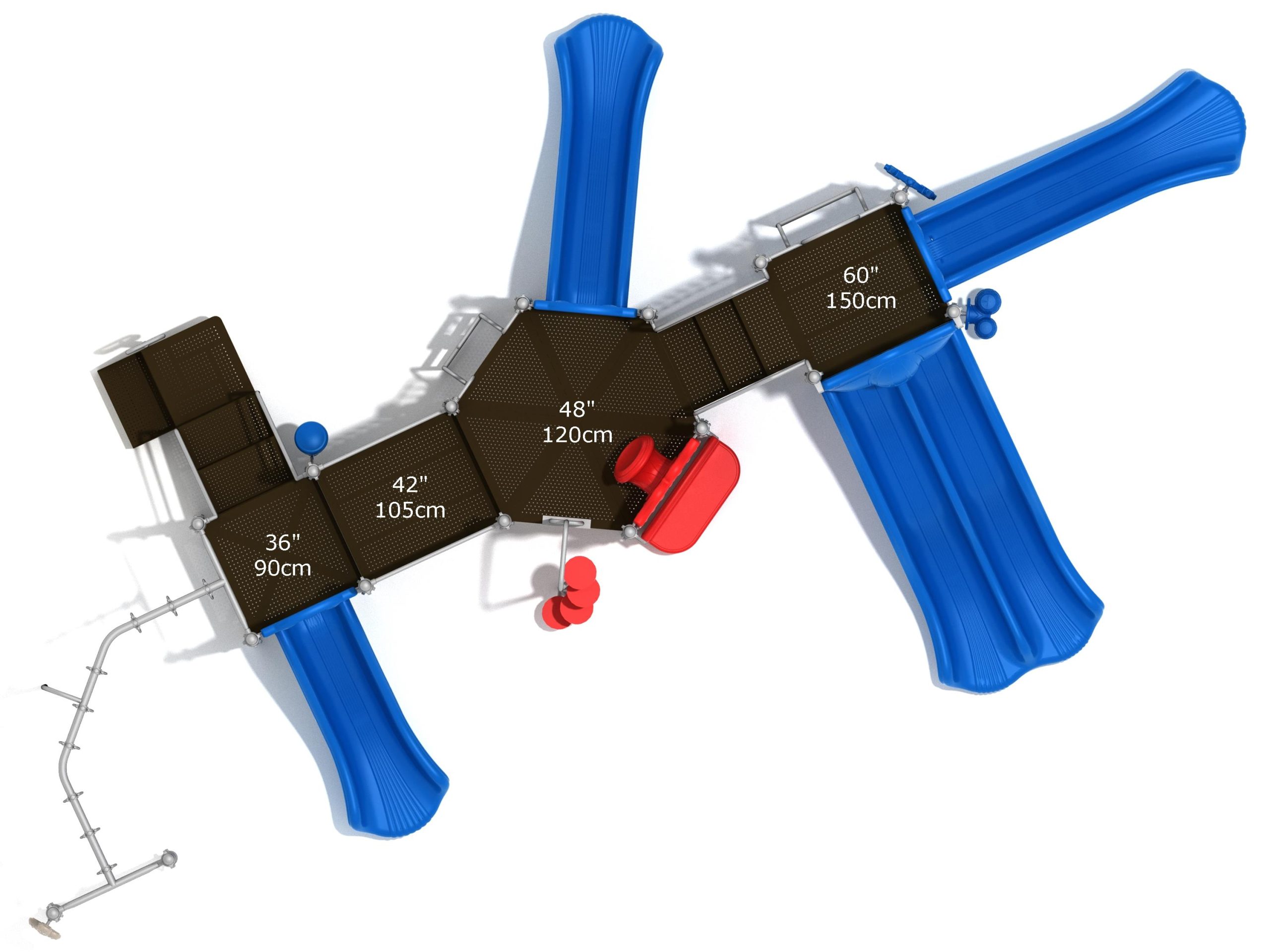 When you install the Santa Monica structure in a playground or public space you’re providing lots of enjoyment for many children of different ages and abilities. Promote physical fitness with a 90 Degree Overhead Swing Ladder accessible by a short Vertical Ladder and watch them use their upper body strength to achieve success. There is a longer Vertical Ladder to access the platform directly, but you can be sure that children will be choosing the more adventurous ways to climb up including the Disk Climber made up of circular footpads of the Zipper Climber which requires some basic hand-eye coordination. Three Straight Slides emerge in different directions which allow children to make decisions about which one they choose, but there’s a Double Wave Slide that every child will want to zip down quickly. Features like the Single Drum, Drum Panel and Bongos add an auditory experience to the structure, and the Rain Wheel and Ship’s Wheel add movement as they spin round and round when touched. A Bench Panel underneath provides an area for respite when kids need to recharge their batteries.