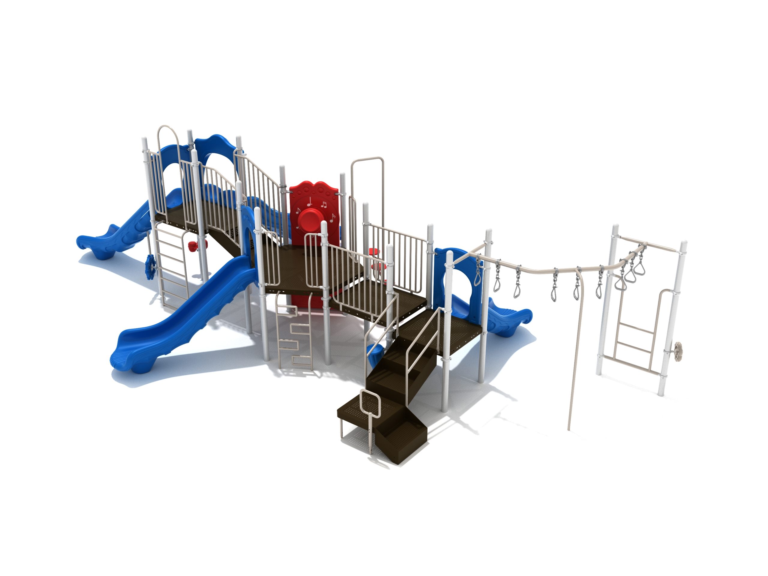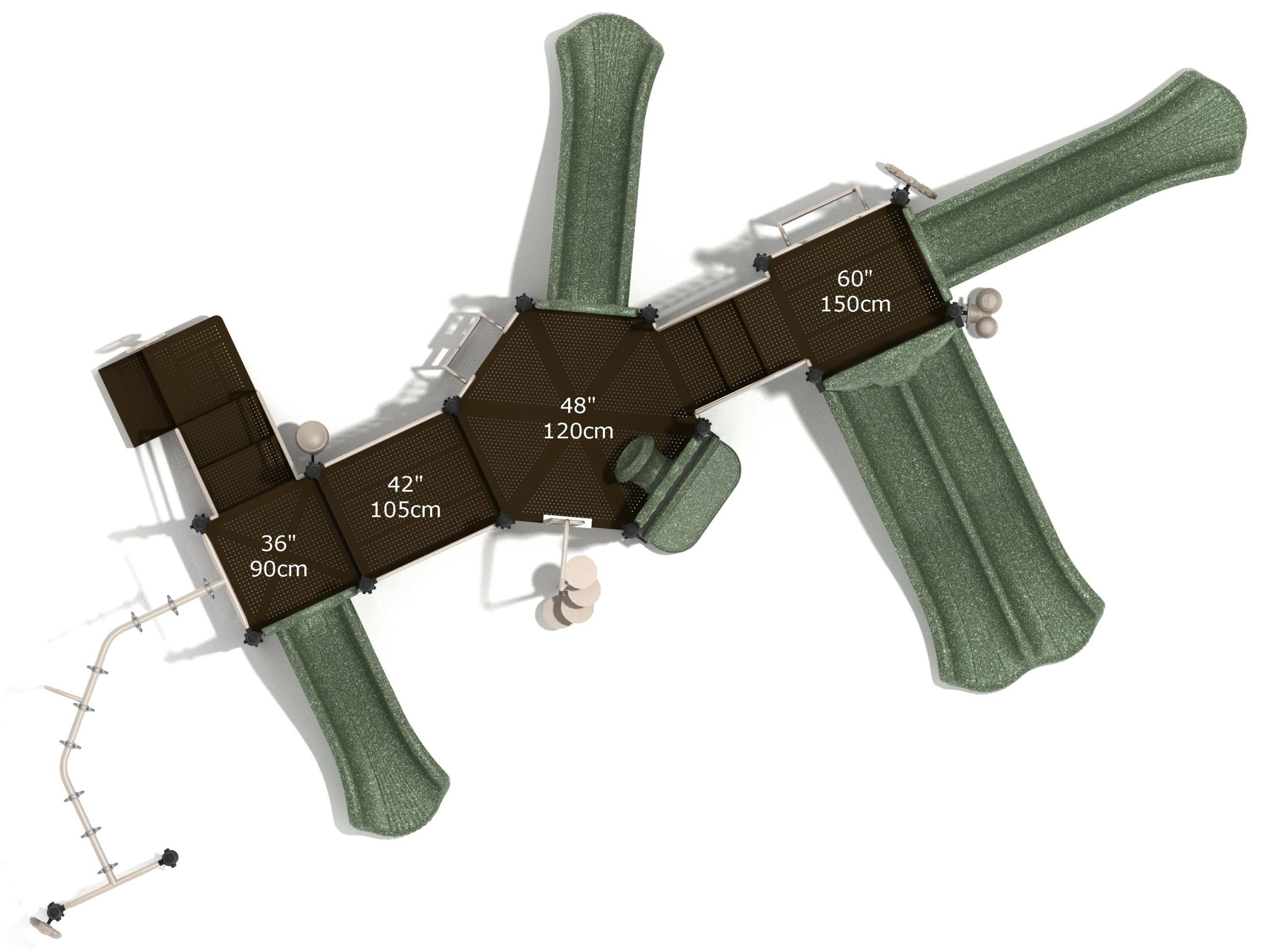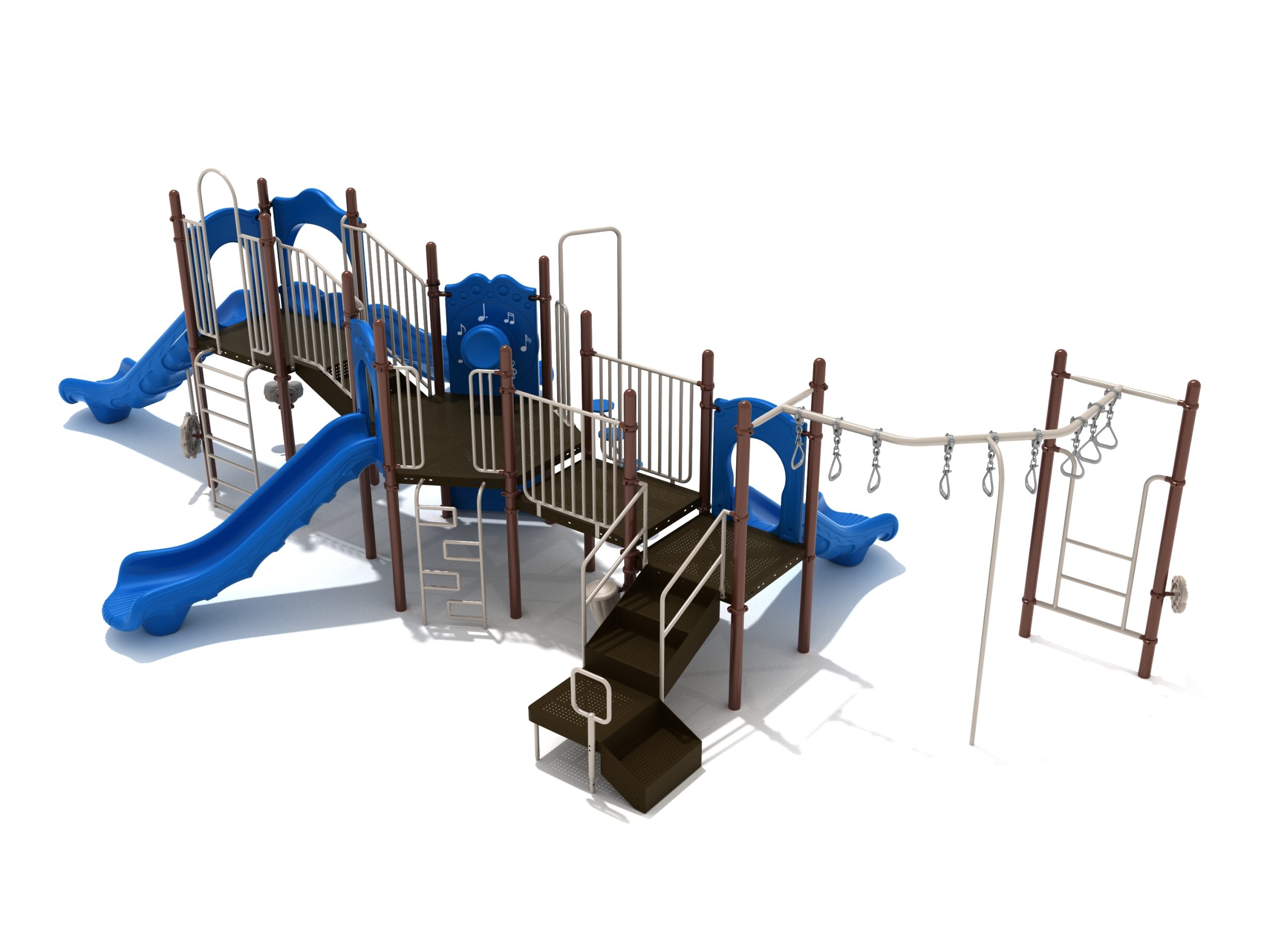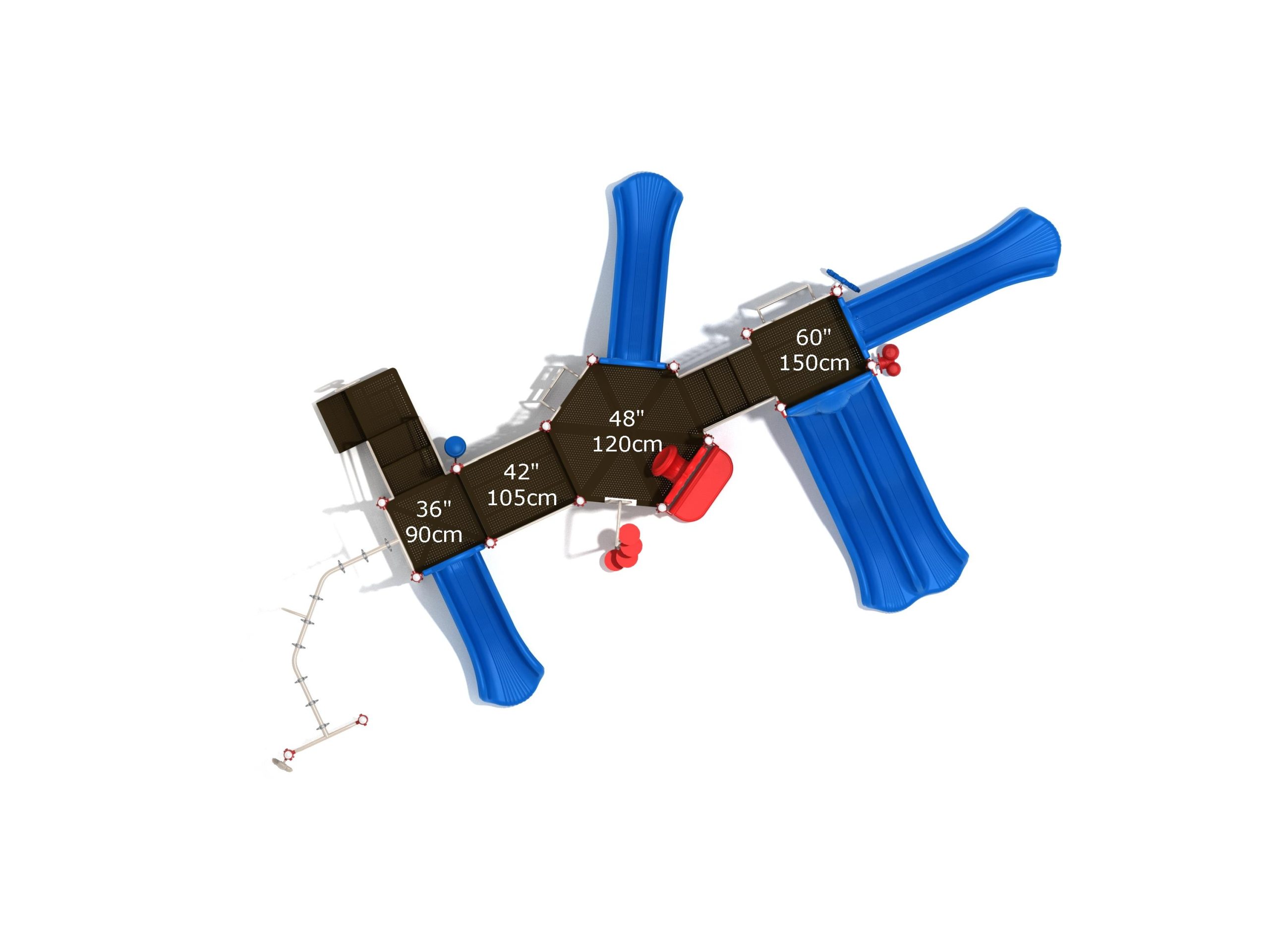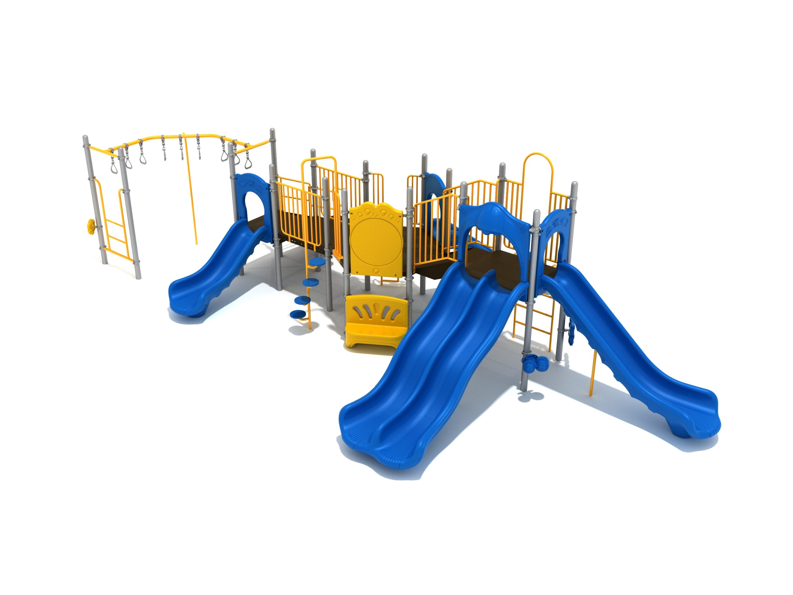 When you install the Santa Monica structure in a playground or public space you’re providing lots of enjoyment for many children of different ages and abilities. Promote physical fitness with a 90 Degree Overhead Swing Ladder accessible by a short Vertical Ladder and watch them use their upper body strength to achieve success. There is a longer Vertical Ladder to access the platform directly, but you can be sure that children will be choosing the more adventurous ways to climb up including the Disk Climber made up of circular footpads of the Zipper Climber which requires some basic hand-eye coordination. Three Straight Slides emerge in different directions which allow children to make decisions about which one they choose, but there’s a Double Wave Slide that every child will want to zip down quickly. Features like the Single Drum, Drum Panel and Bongos add an auditory experience to the structure, and the Rain Wheel and Ship’s Wheel add movement as they spin round and round when touched. A Bench Panel underneath provides an area for respite when kids need to recharge their batteries.