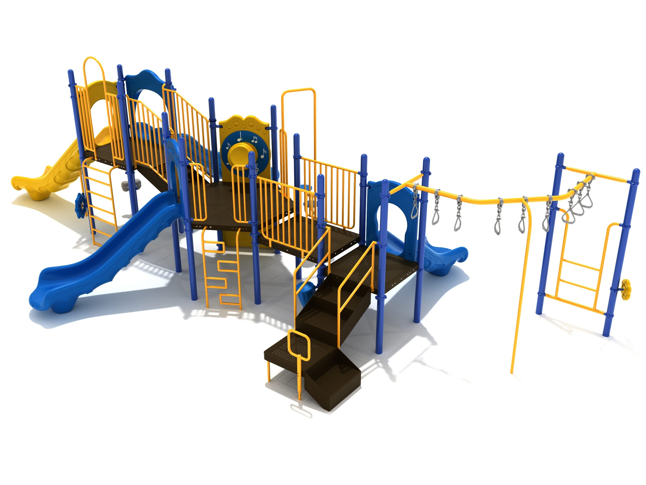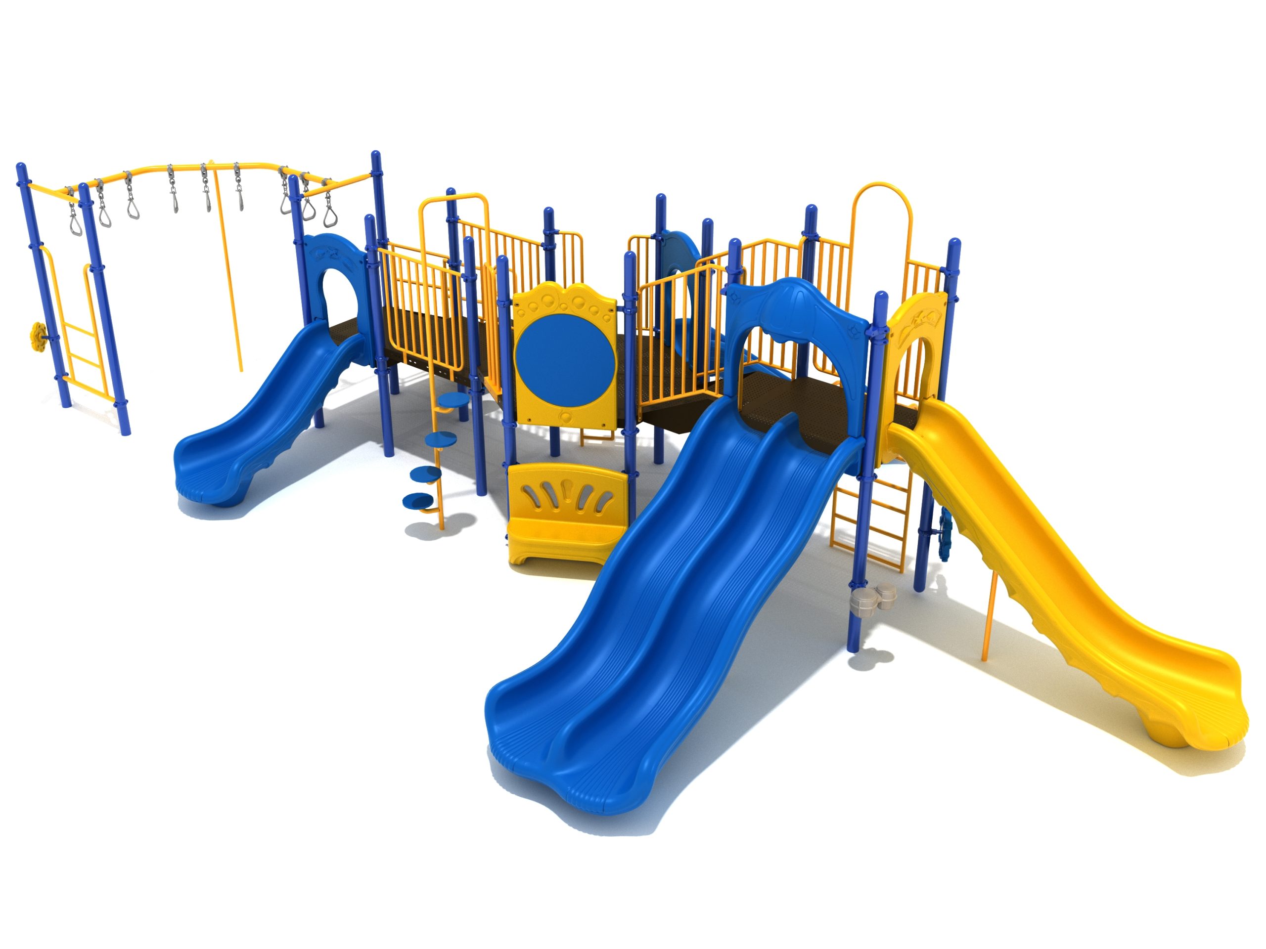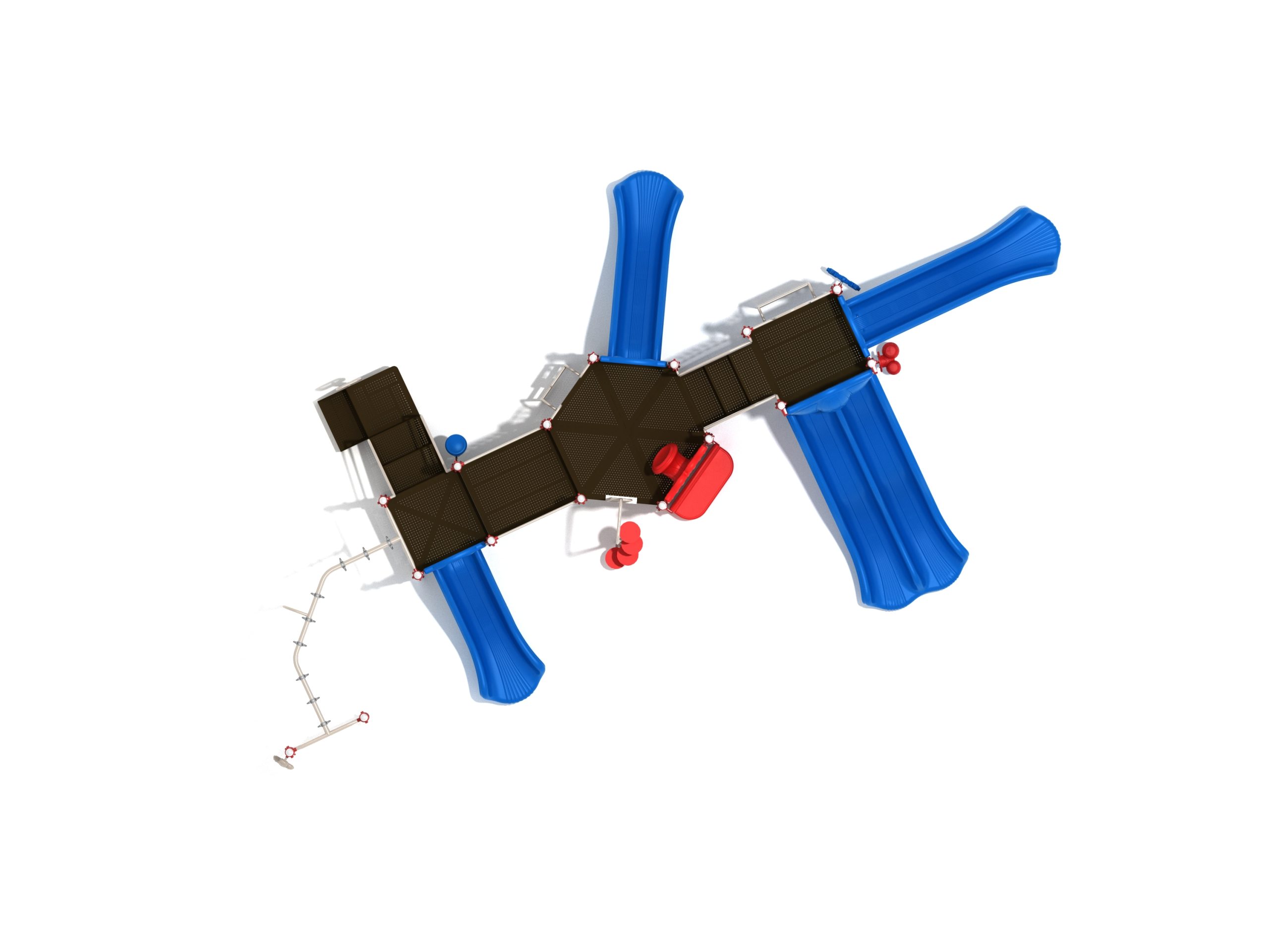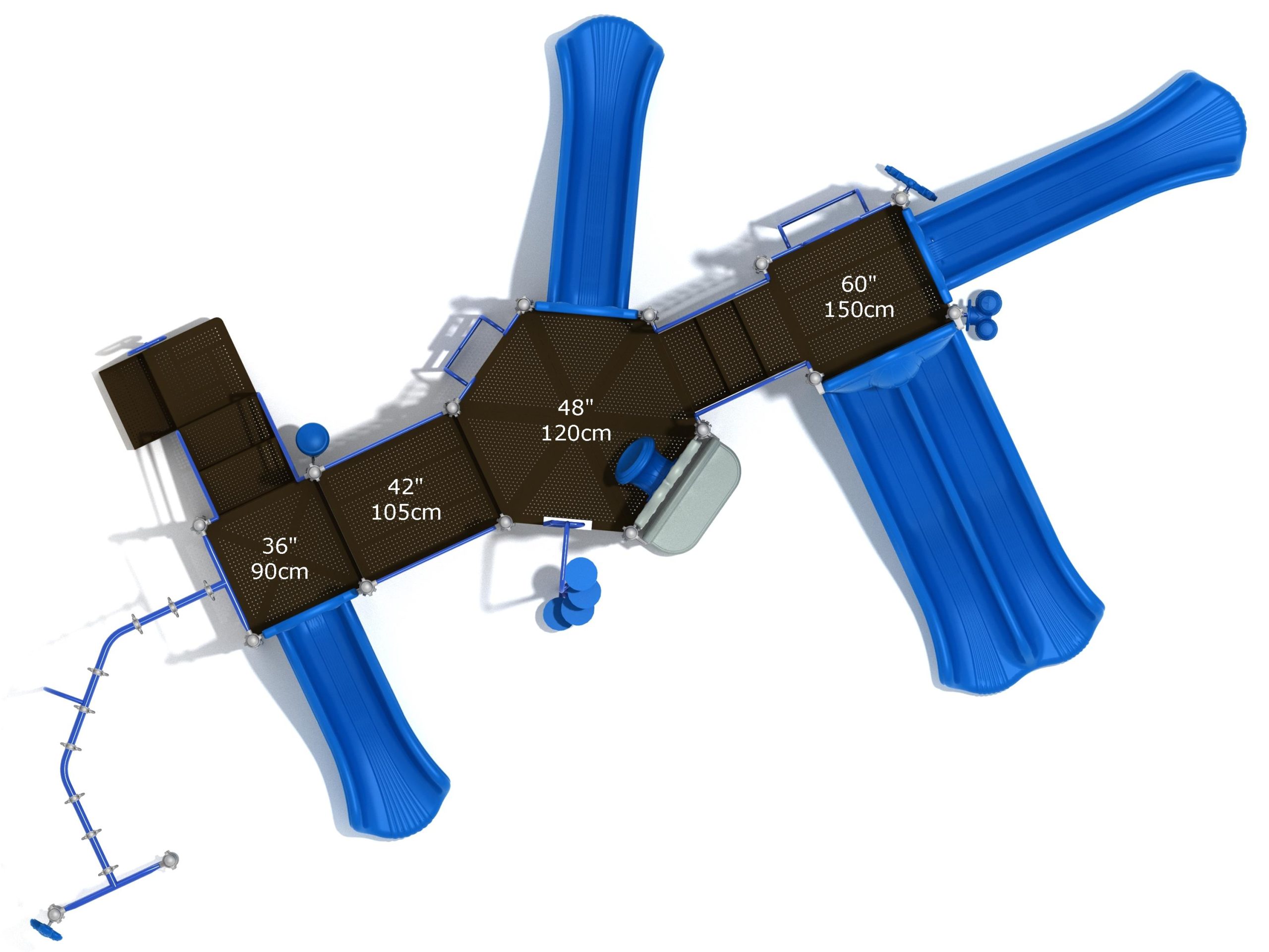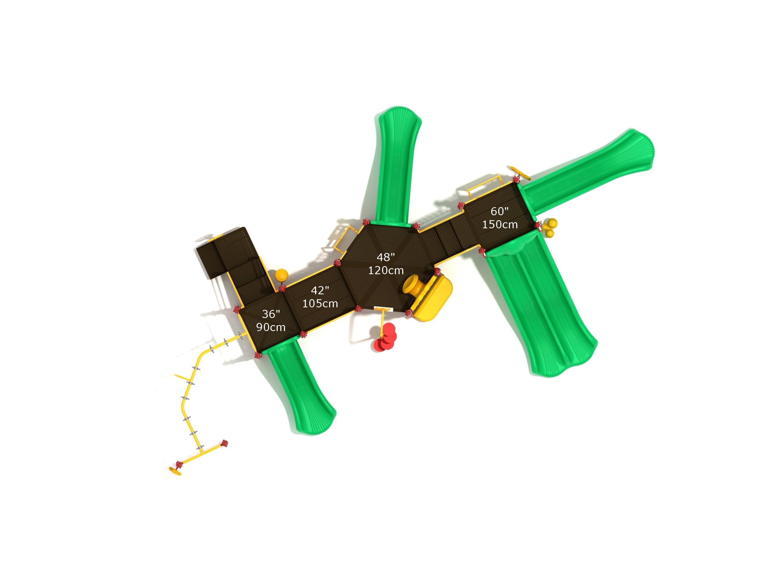 When you install the Santa Monica structure in a playground or public space you’re providing lots of enjoyment for many children of different ages and abilities. Promote physical fitness with a 90 Degree Overhead Swing Ladder accessible by a short Vertical Ladder and watch them use their upper body strength to achieve success. There is a longer Vertical Ladder to access the platform directly, but you can be sure that children will be choosing the more adventurous ways to climb up including the Disk Climber made up of circular footpads of the Zipper Climber which requires some basic hand-eye coordination. Three Straight Slides emerge in different directions which allow children to make decisions about which one they choose, but there’s a Double Wave Slide that every child will want to zip down quickly. Features like the Single Drum, Drum Panel and Bongos add an auditory experience to the structure, and the Rain Wheel and Ship’s Wheel add movement as they spin round and round when touched. A Bench Panel underneath provides an area for respite when kids need to recharge their batteries.