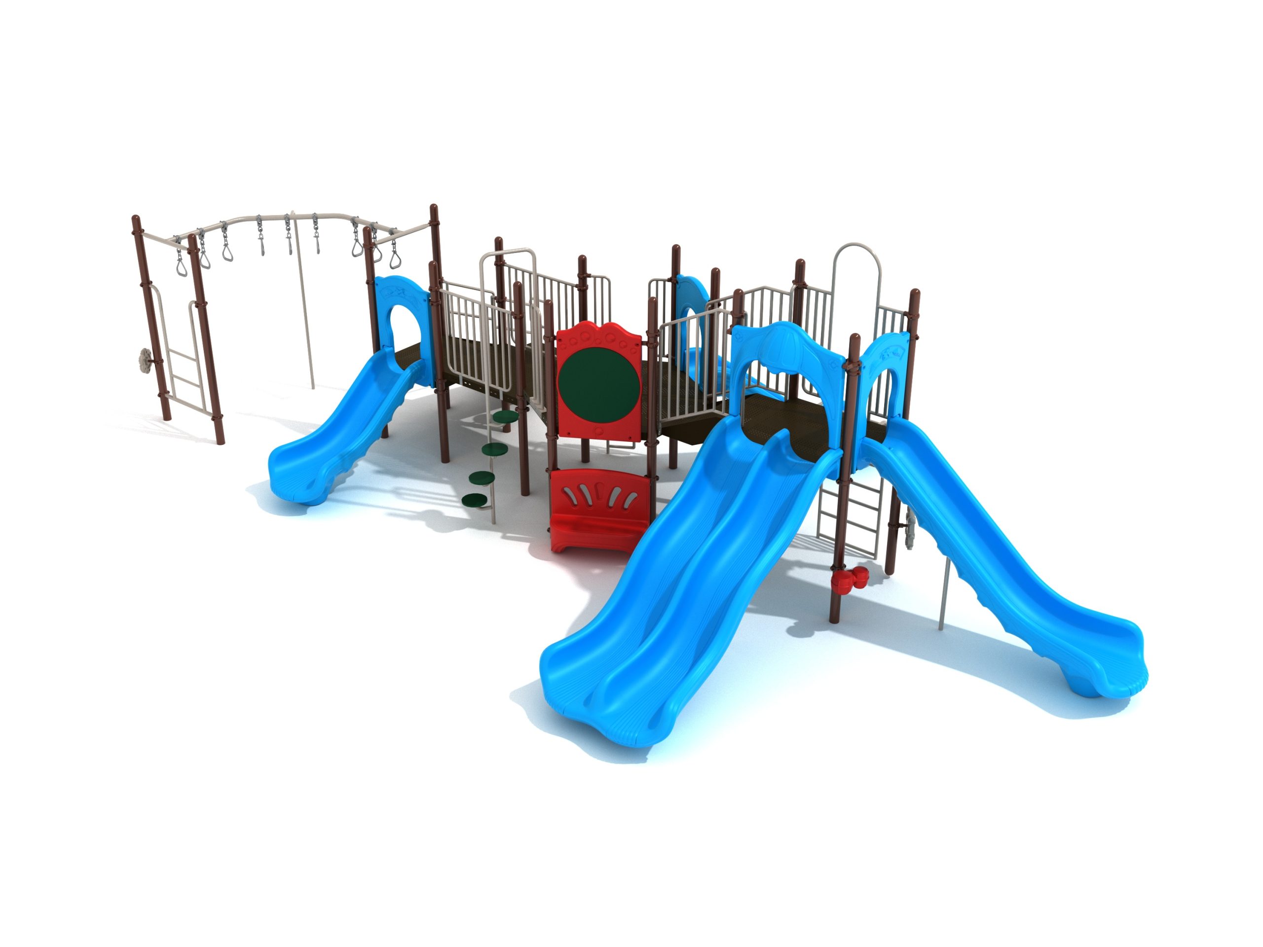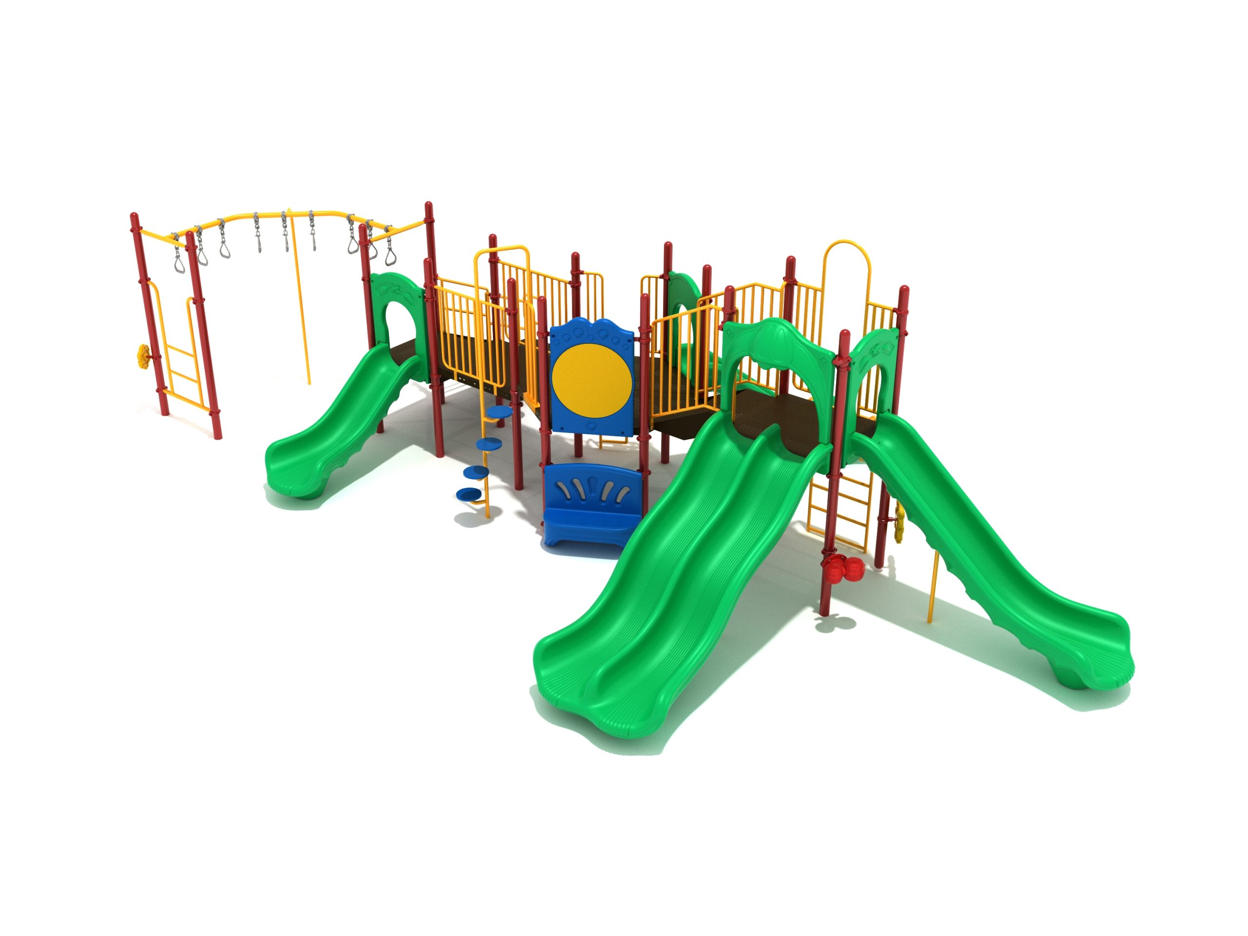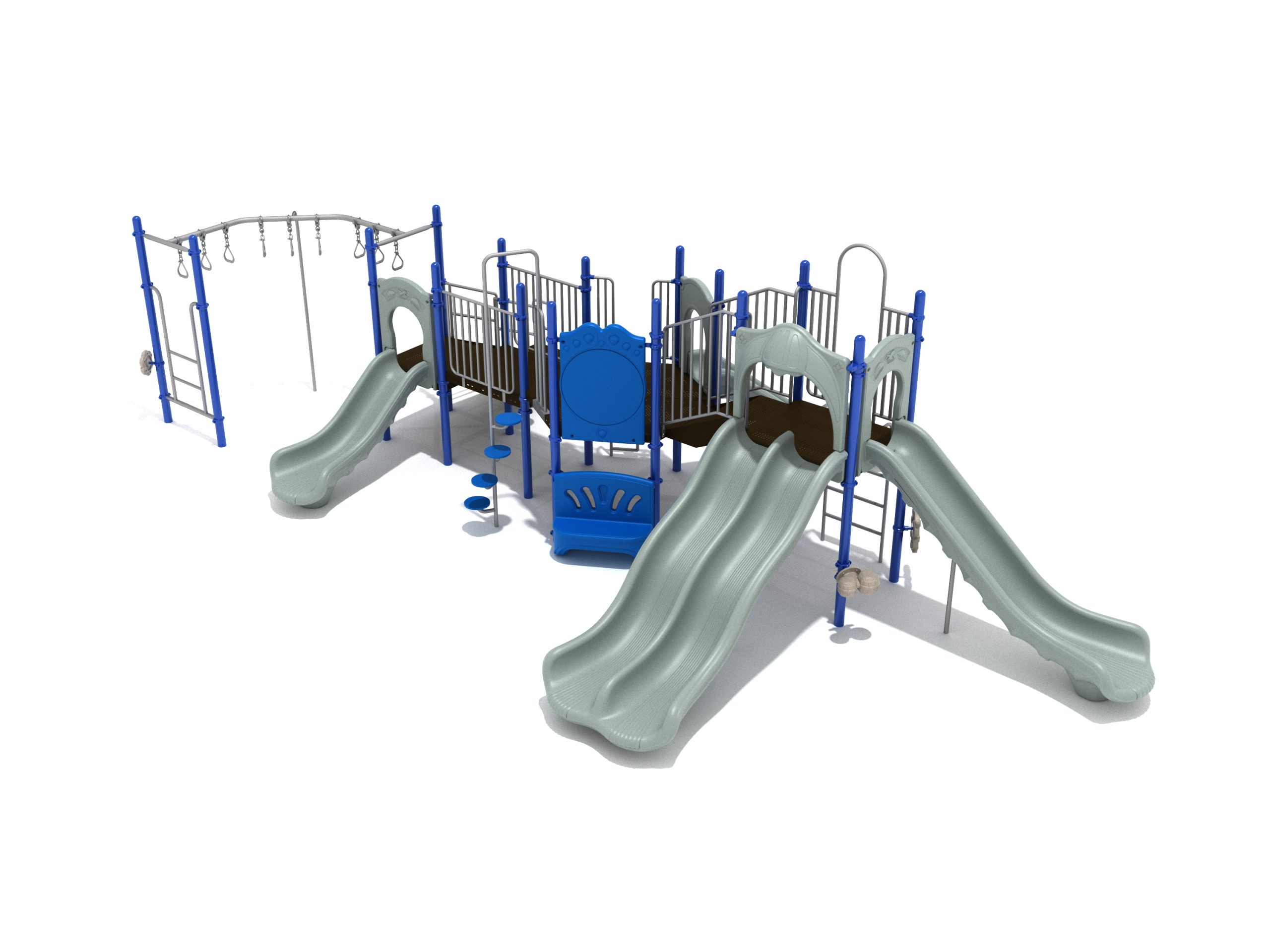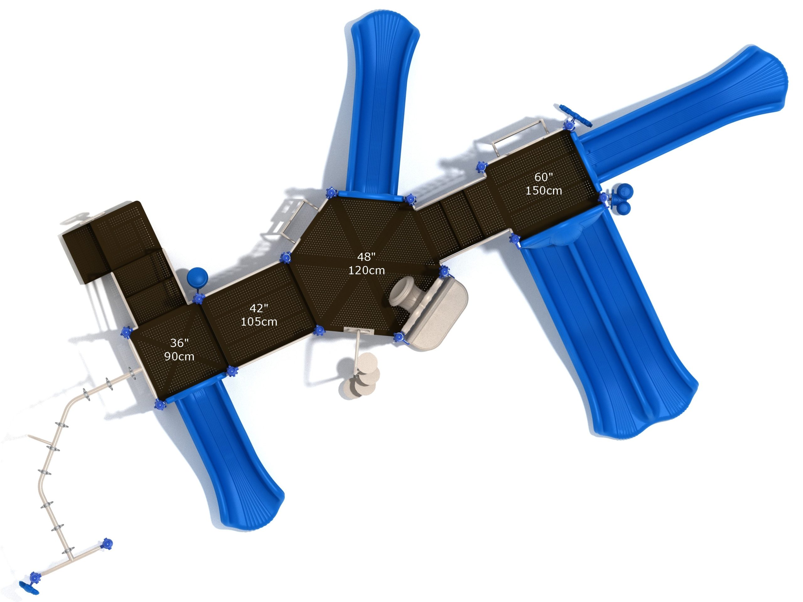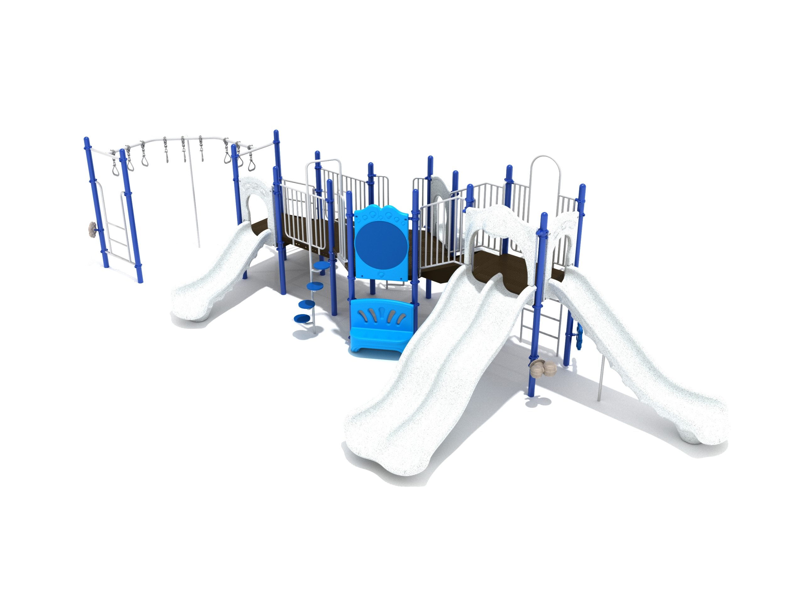 When you install the Santa Monica structure in a playground or public space you’re providing lots of enjoyment for many children of different ages and abilities. Promote physical fitness with a 90 Degree Overhead Swing Ladder accessible by a short Vertical Ladder and watch them use their upper body strength to achieve success. There is a longer Vertical Ladder to access the platform directly, but you can be sure that children will be choosing the more adventurous ways to climb up including the Disk Climber made up of circular footpads of the Zipper Climber which requires some basic hand-eye coordination. Three Straight Slides emerge in different directions which allow children to make decisions about which one they choose, but there’s a Double Wave Slide that every child will want to zip down quickly. Features like the Single Drum, Drum Panel and Bongos add an auditory experience to the structure, and the Rain Wheel and Ship’s Wheel add movement as they spin round and round when touched. A Bench Panel underneath provides an area for respite when kids need to recharge their batteries.