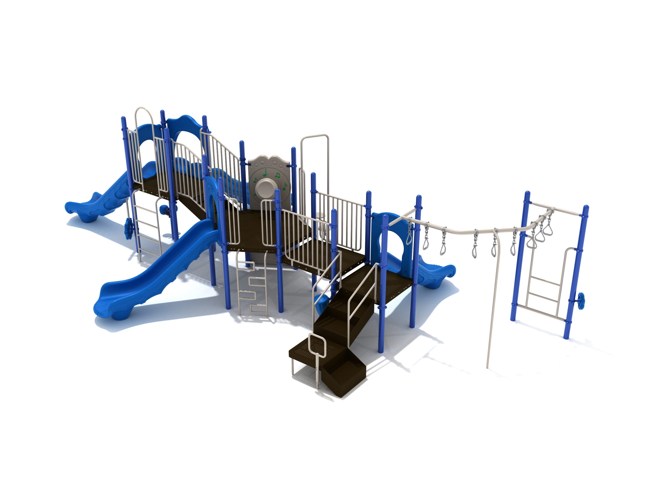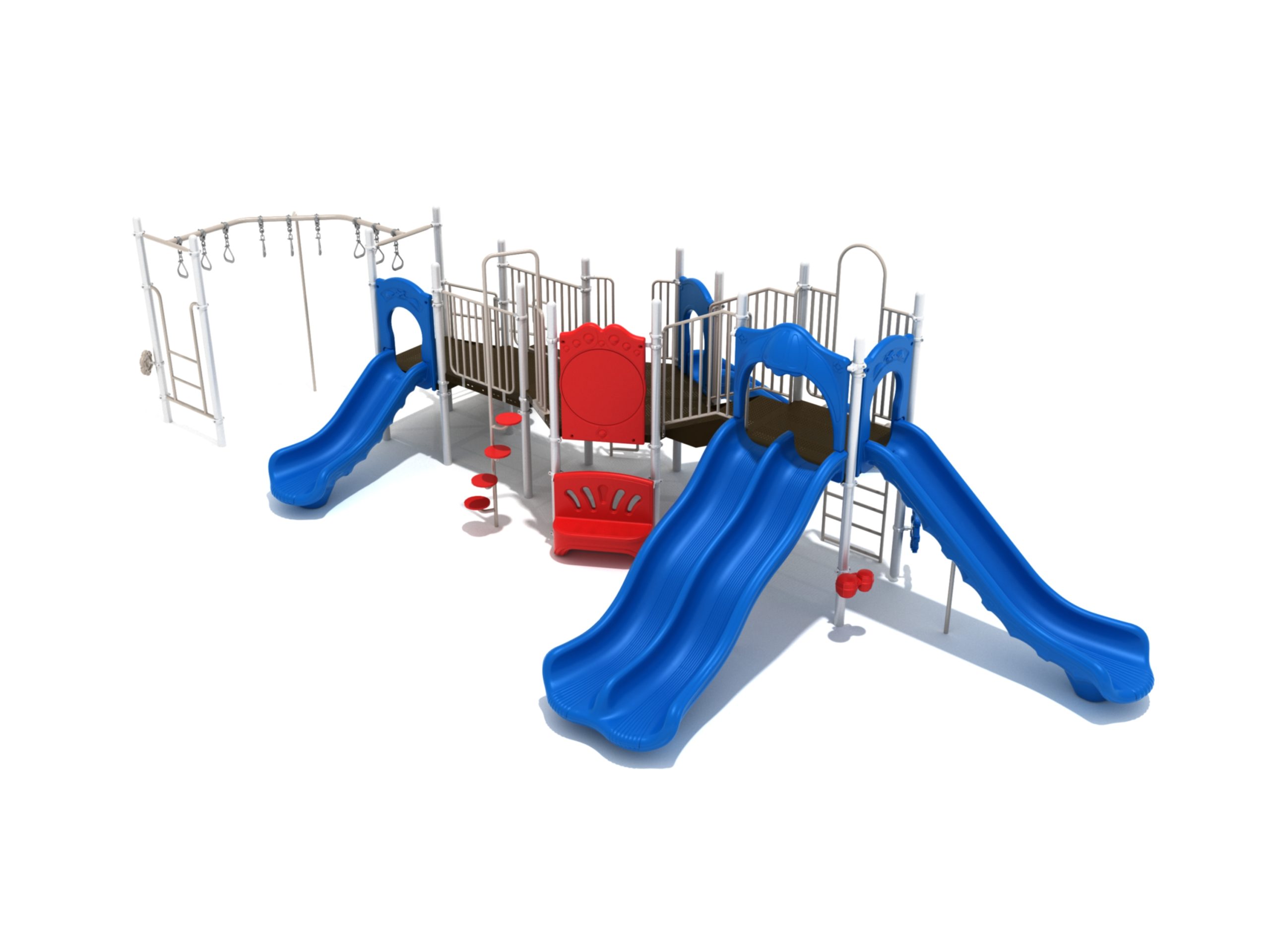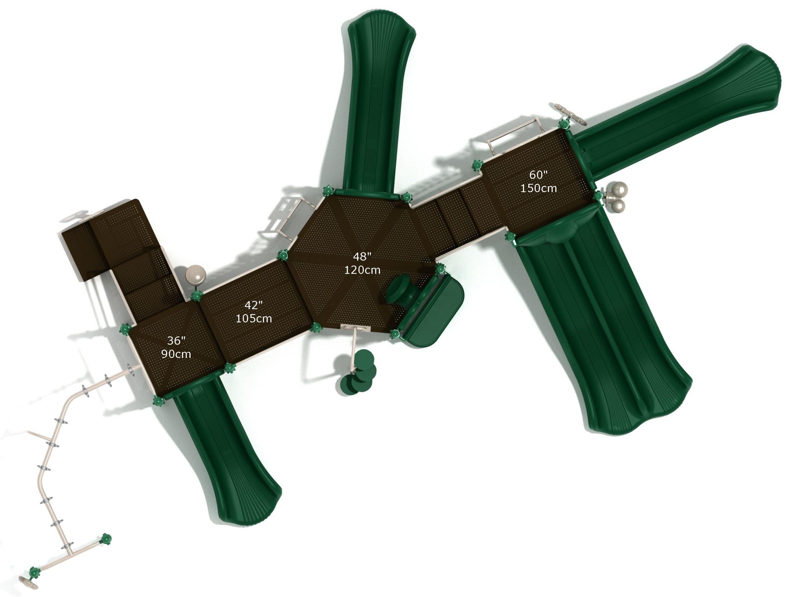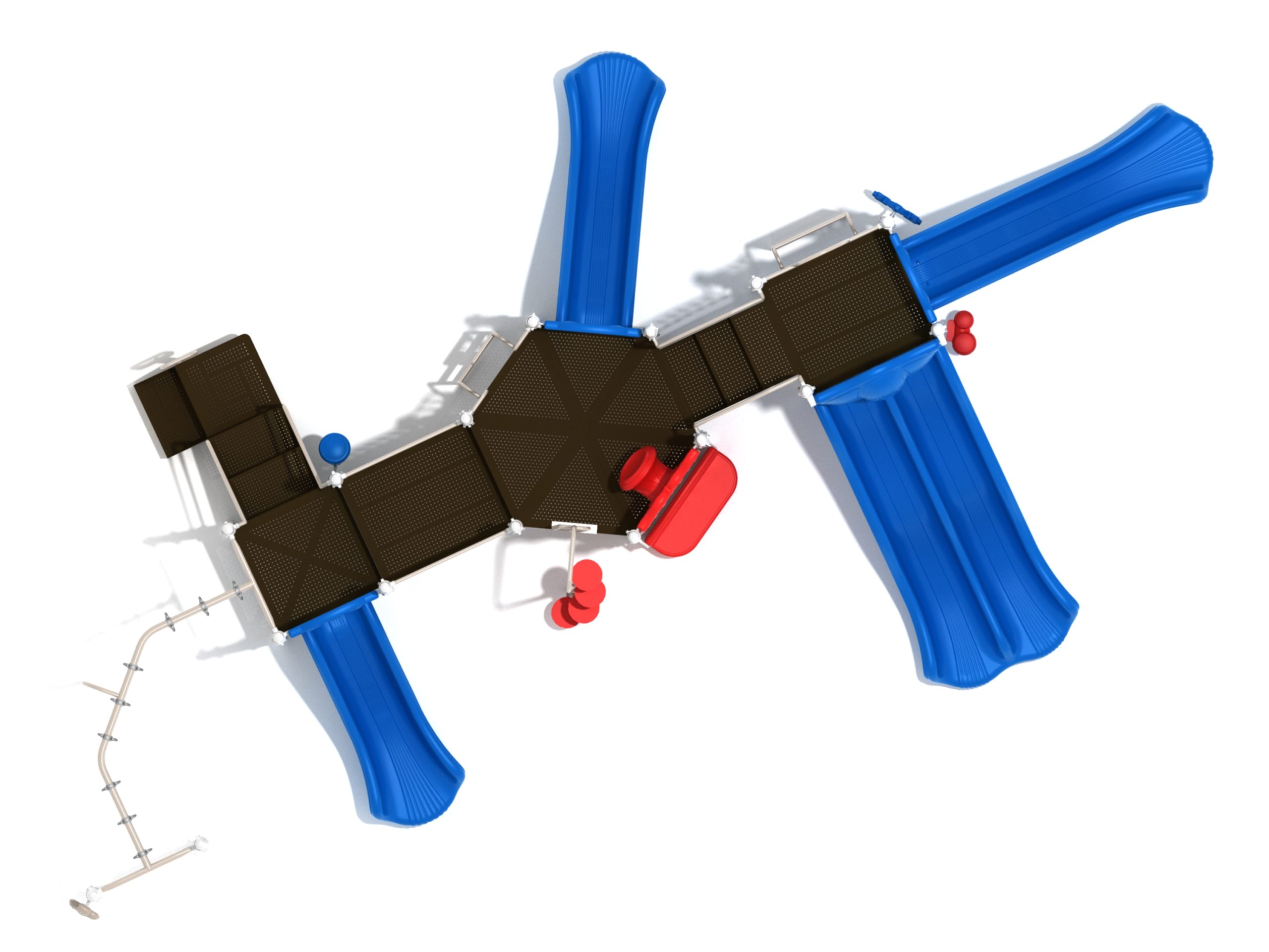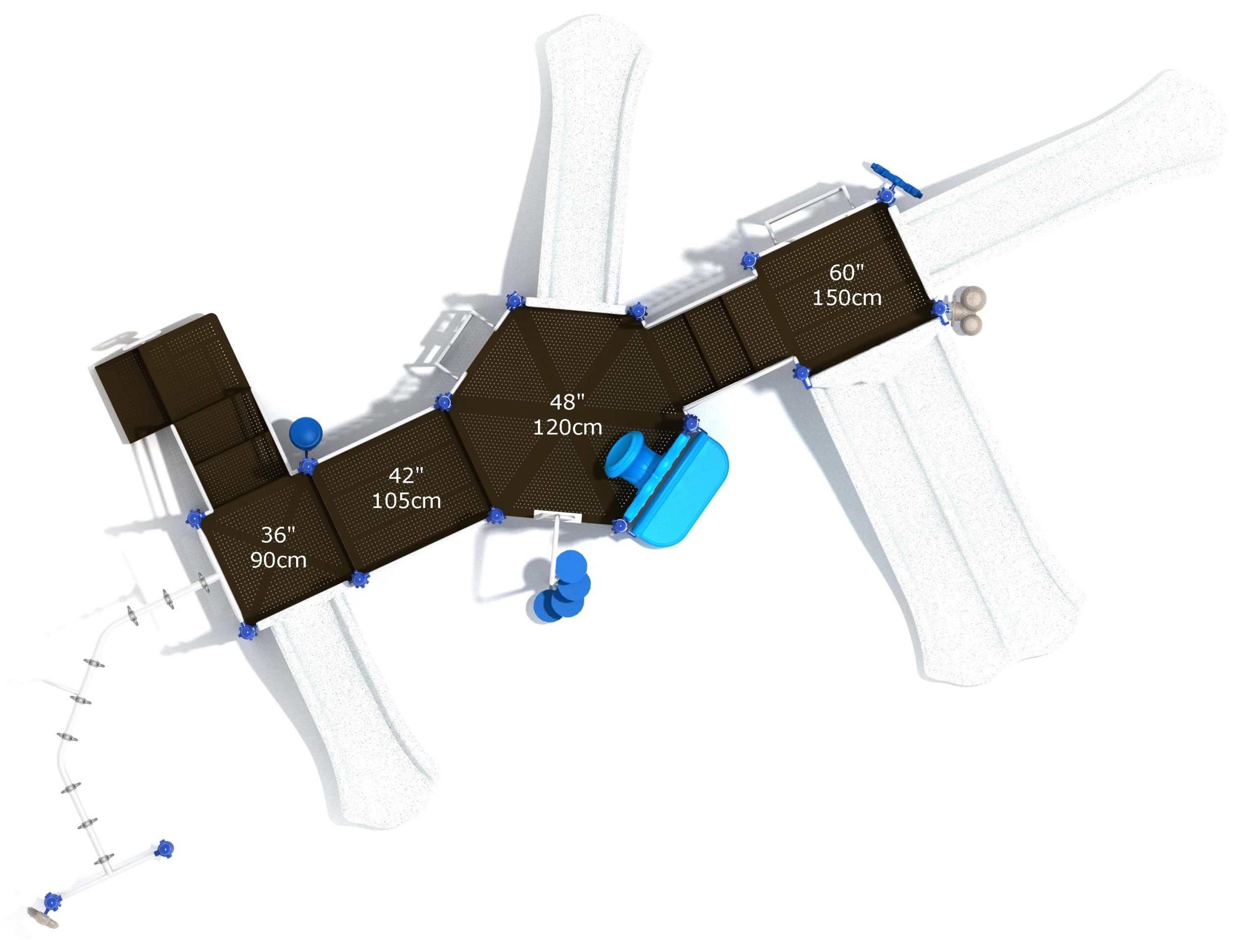 When you install the Santa Monica structure in a playground or public space you’re providing lots of enjoyment for many children of different ages and abilities. Promote physical fitness with a 90 Degree Overhead Swing Ladder accessible by a short Vertical Ladder and watch them use their upper body strength to achieve success. There is a longer Vertical Ladder to access the platform directly, but you can be sure that children will be choosing the more adventurous ways to climb up including the Disk Climber made up of circular footpads of the Zipper Climber which requires some basic hand-eye coordination. Three Straight Slides emerge in different directions which allow children to make decisions about which one they choose, but there’s a Double Wave Slide that every child will want to zip down quickly. Features like the Single Drum, Drum Panel and Bongos add an auditory experience to the structure, and the Rain Wheel and Ship’s Wheel add movement as they spin round and round when touched. A Bench Panel underneath provides an area for respite when kids need to recharge their batteries.