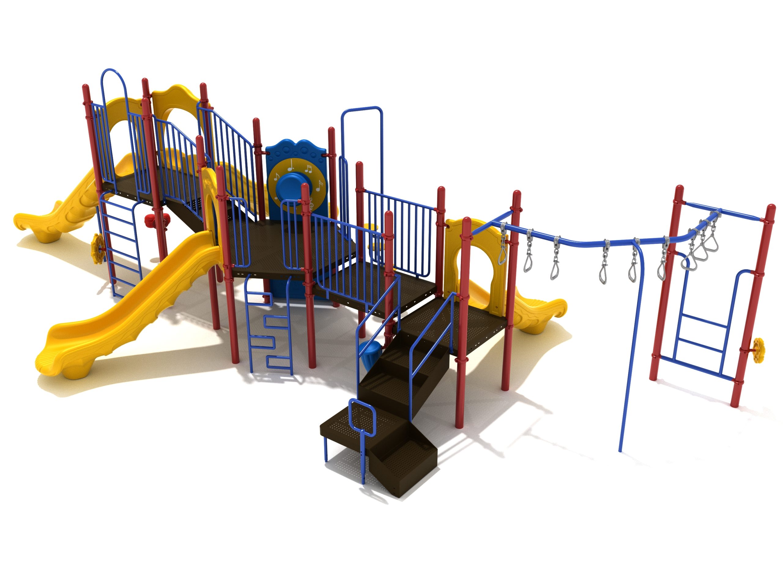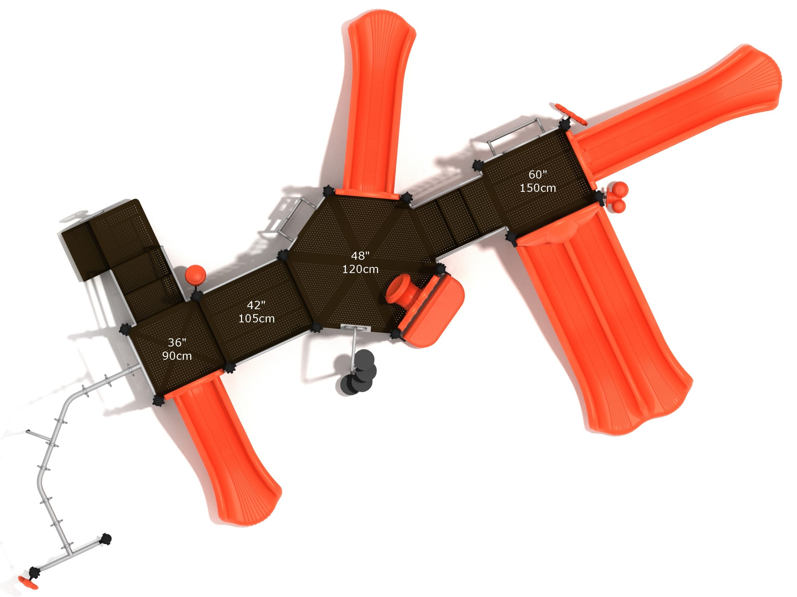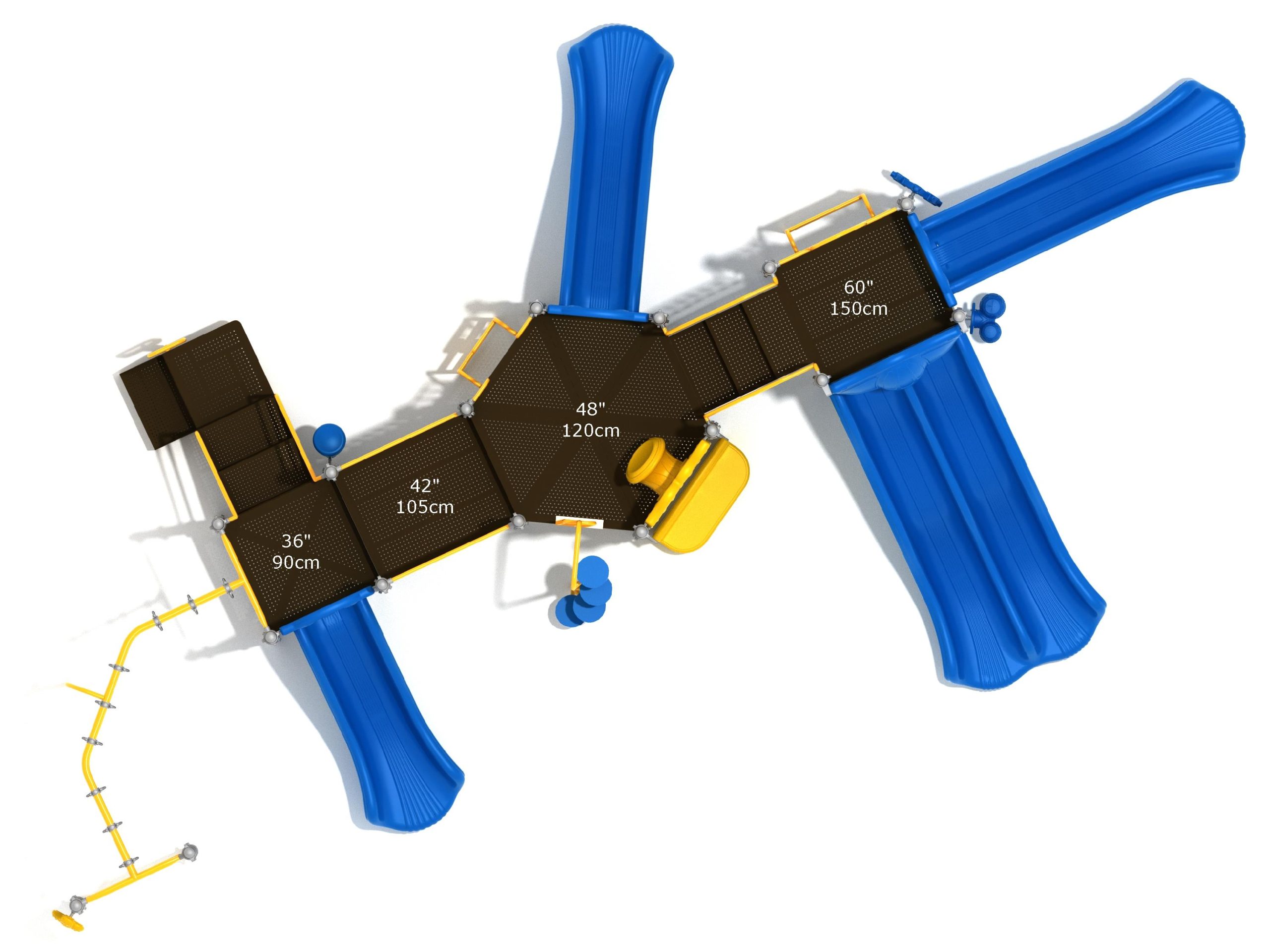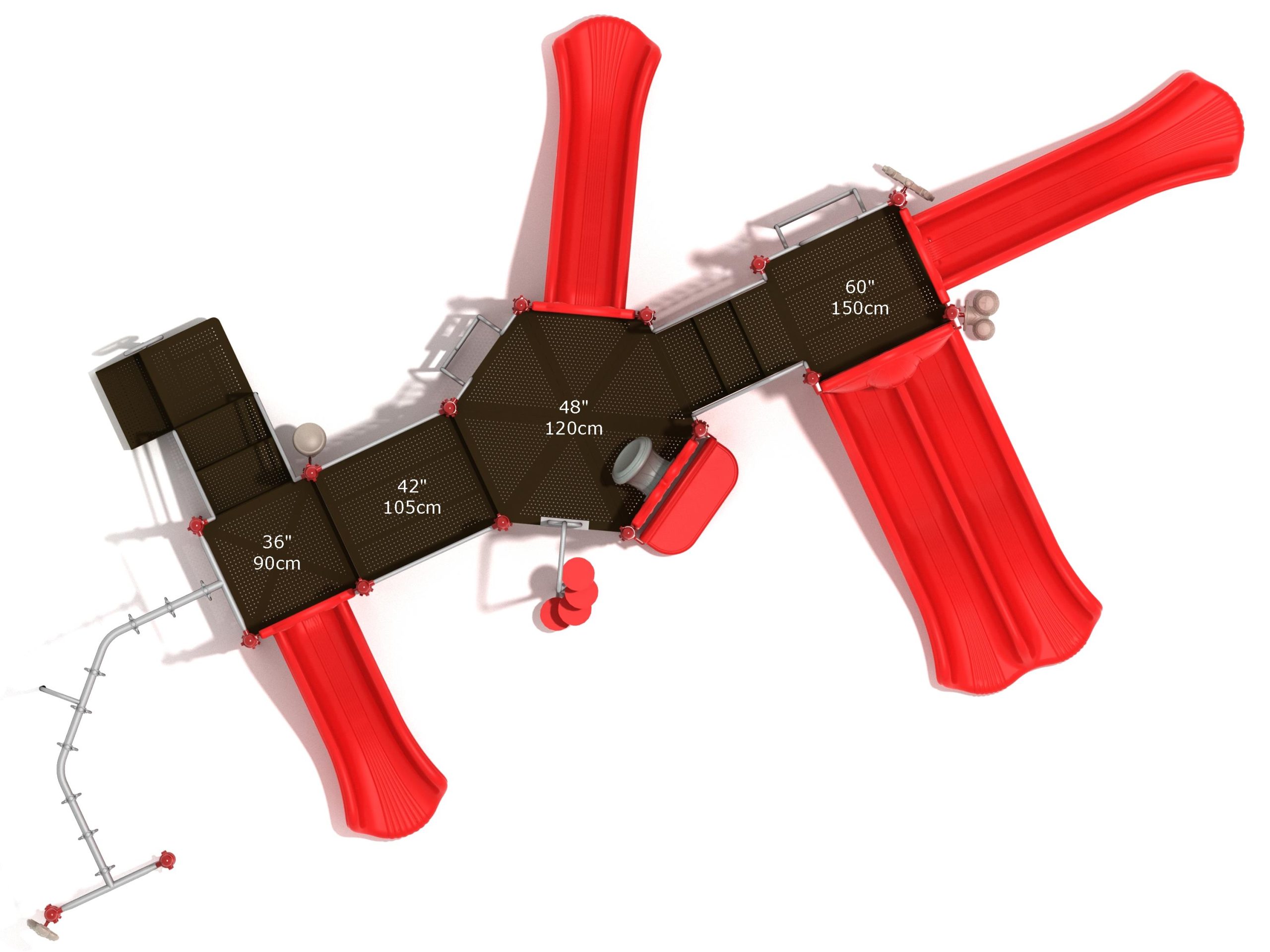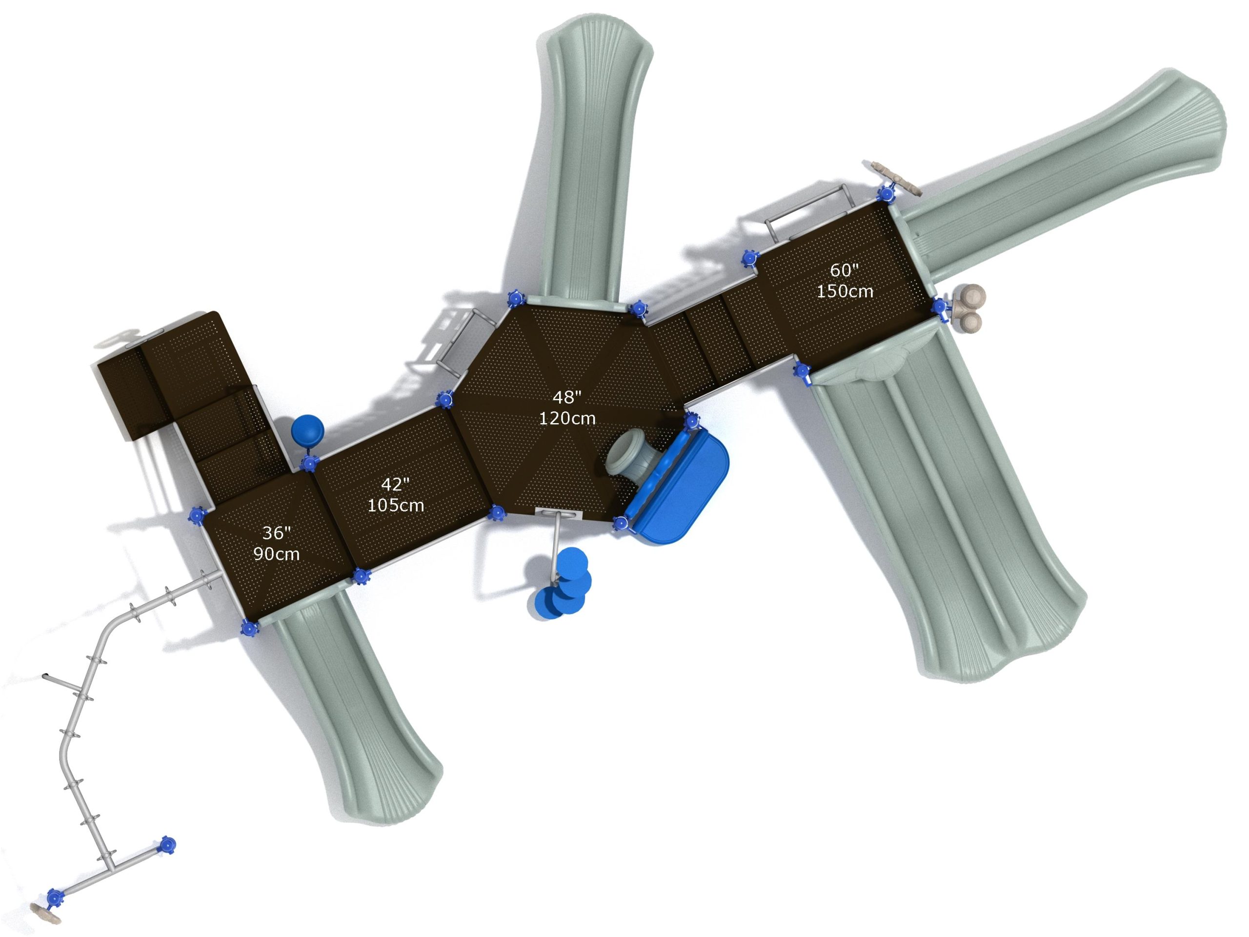 When you install the Santa Monica structure in a playground or public space you’re providing lots of enjoyment for many children of different ages and abilities. Promote physical fitness with a 90 Degree Overhead Swing Ladder accessible by a short Vertical Ladder and watch them use their upper body strength to achieve success. There is a longer Vertical Ladder to access the platform directly, but you can be sure that children will be choosing the more adventurous ways to climb up including the Disk Climber made up of circular footpads of the Zipper Climber which requires some basic hand-eye coordination. Three Straight Slides emerge in different directions which allow children to make decisions about which one they choose, but there’s a Double Wave Slide that every child will want to zip down quickly. Features like the Single Drum, Drum Panel and Bongos add an auditory experience to the structure, and the Rain Wheel and Ship’s Wheel add movement as they spin round and round when touched. A Bench Panel underneath provides an area for respite when kids need to recharge their batteries.
