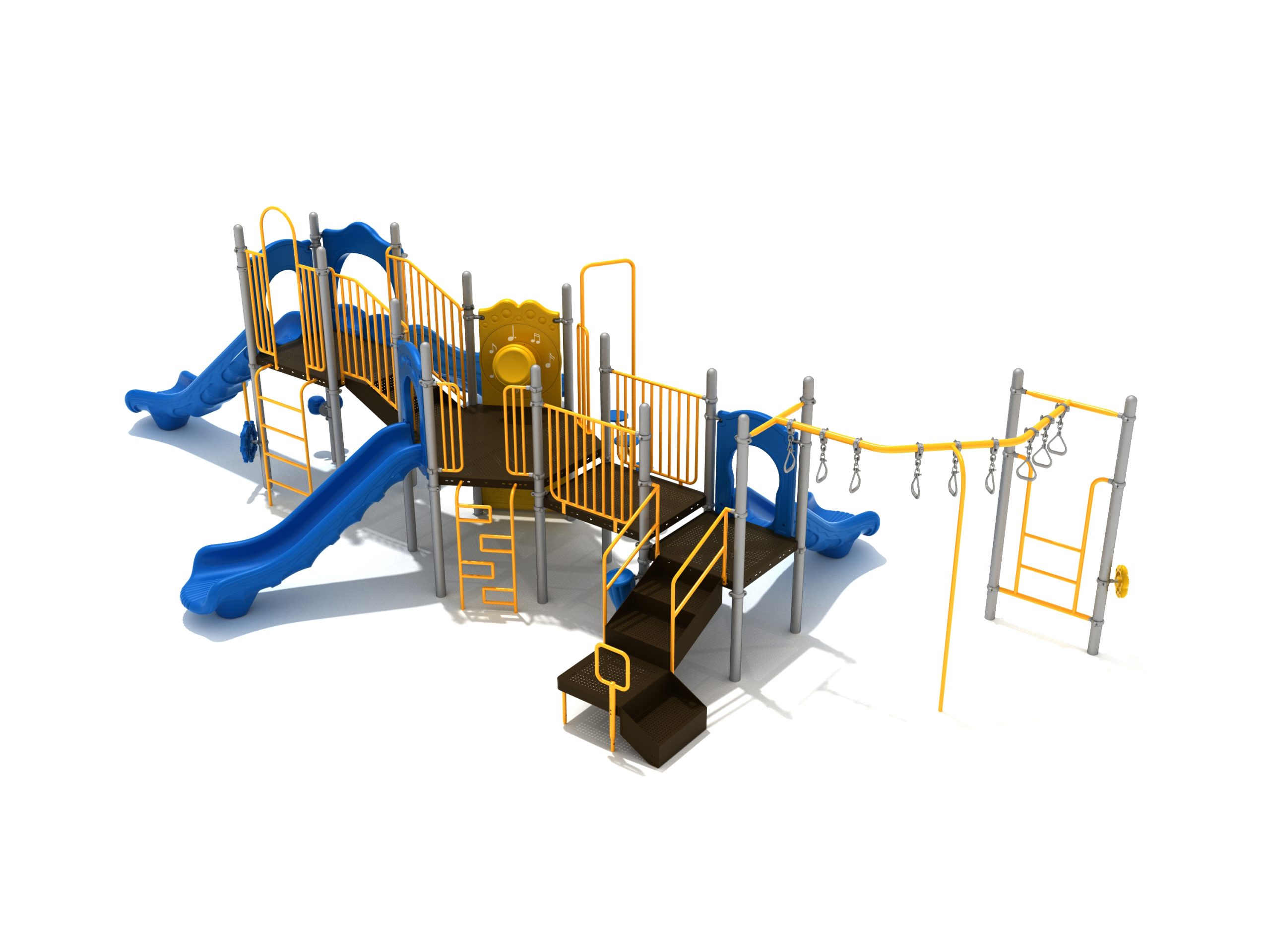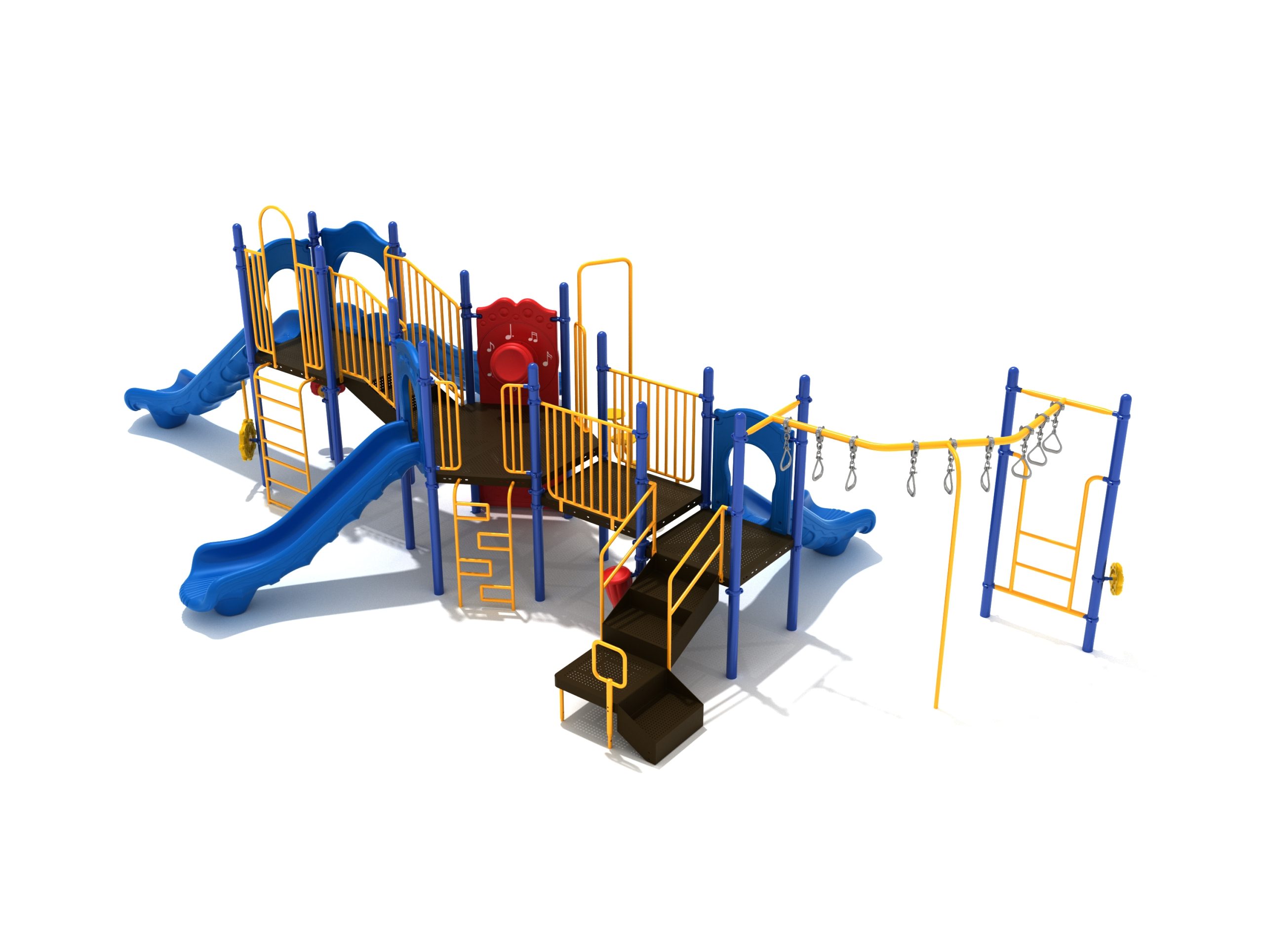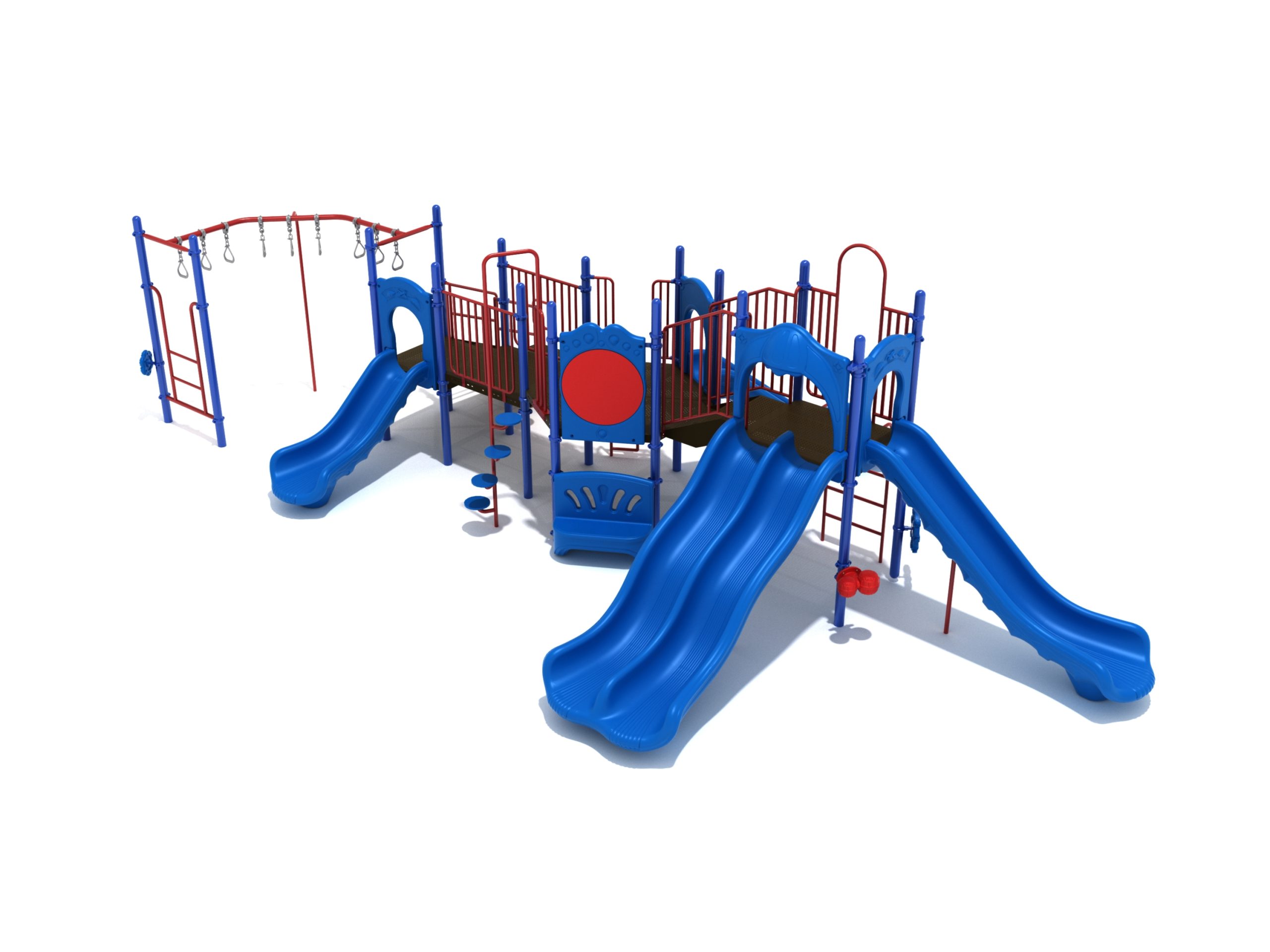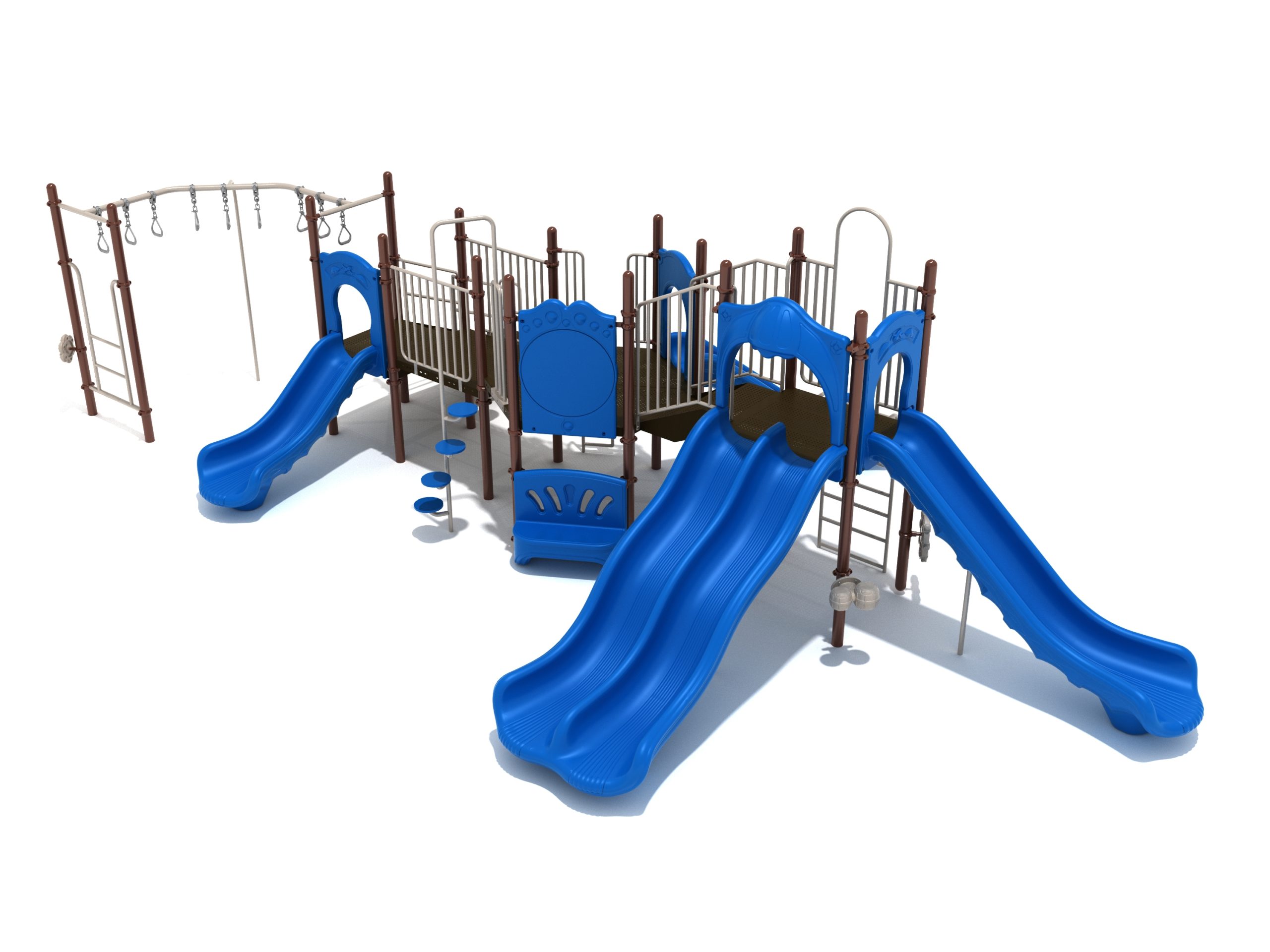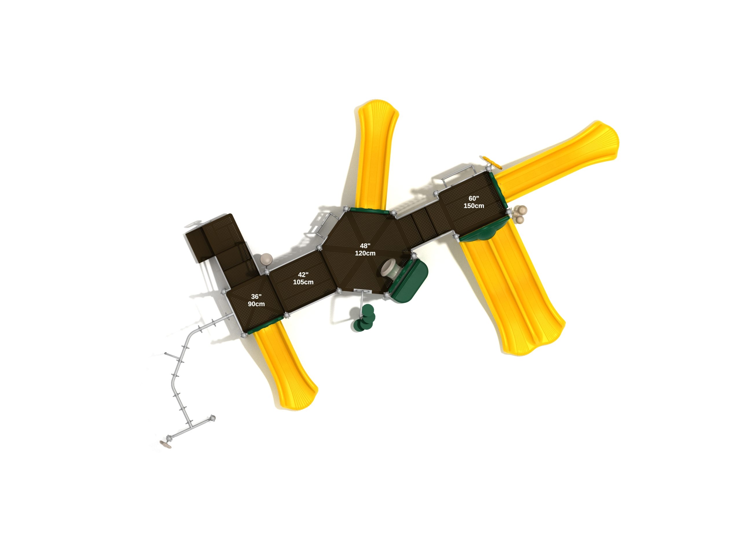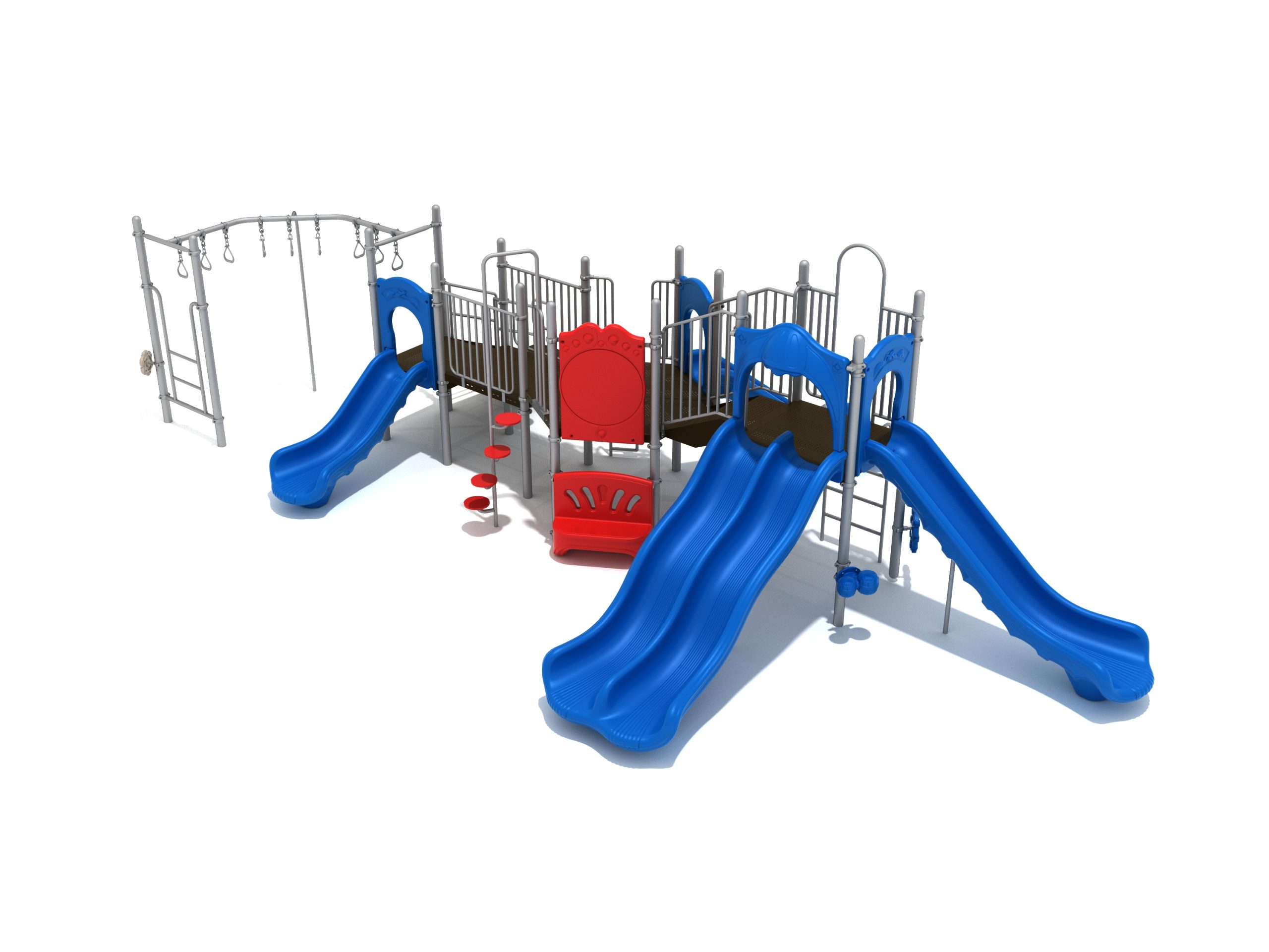 When you install the Santa Monica structure in a playground or public space you’re providing lots of enjoyment for many children of different ages and abilities. Promote physical fitness with a 90 Degree Overhead Swing Ladder accessible by a short Vertical Ladder and watch them use their upper body strength to achieve success. There is a longer Vertical Ladder to access the platform directly, but you can be sure that children will be choosing the more adventurous ways to climb up including the Disk Climber made up of circular footpads of the Zipper Climber which requires some basic hand-eye coordination. Three Straight Slides emerge in different directions which allow children to make decisions about which one they choose, but there’s a Double Wave Slide that every child will want to zip down quickly. Features like the Single Drum, Drum Panel and Bongos add an auditory experience to the structure, and the Rain Wheel and Ship’s Wheel add movement as they spin round and round when touched. A Bench Panel underneath provides an area for respite when kids need to recharge their batteries.