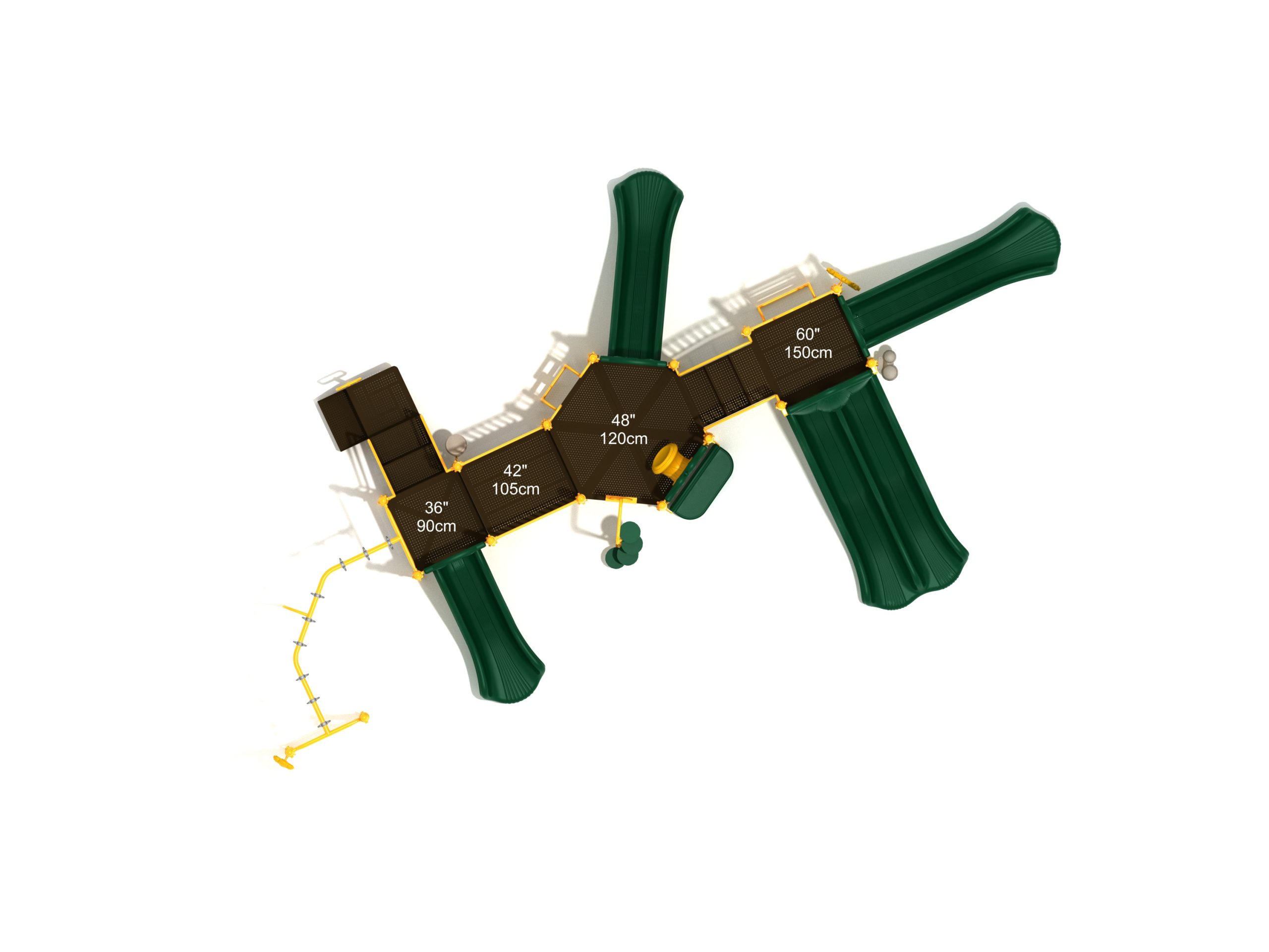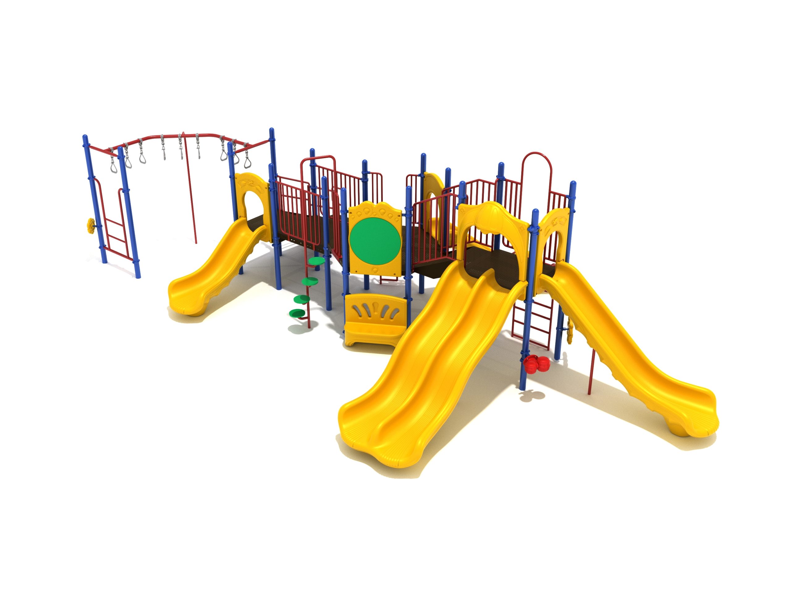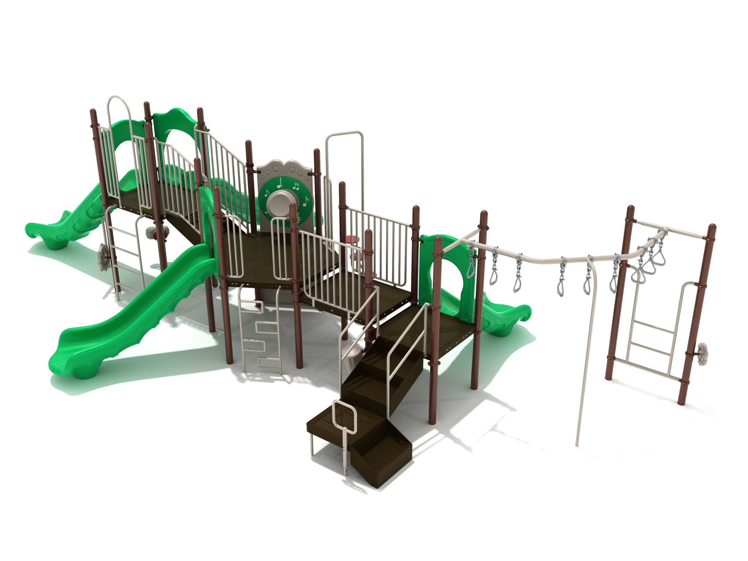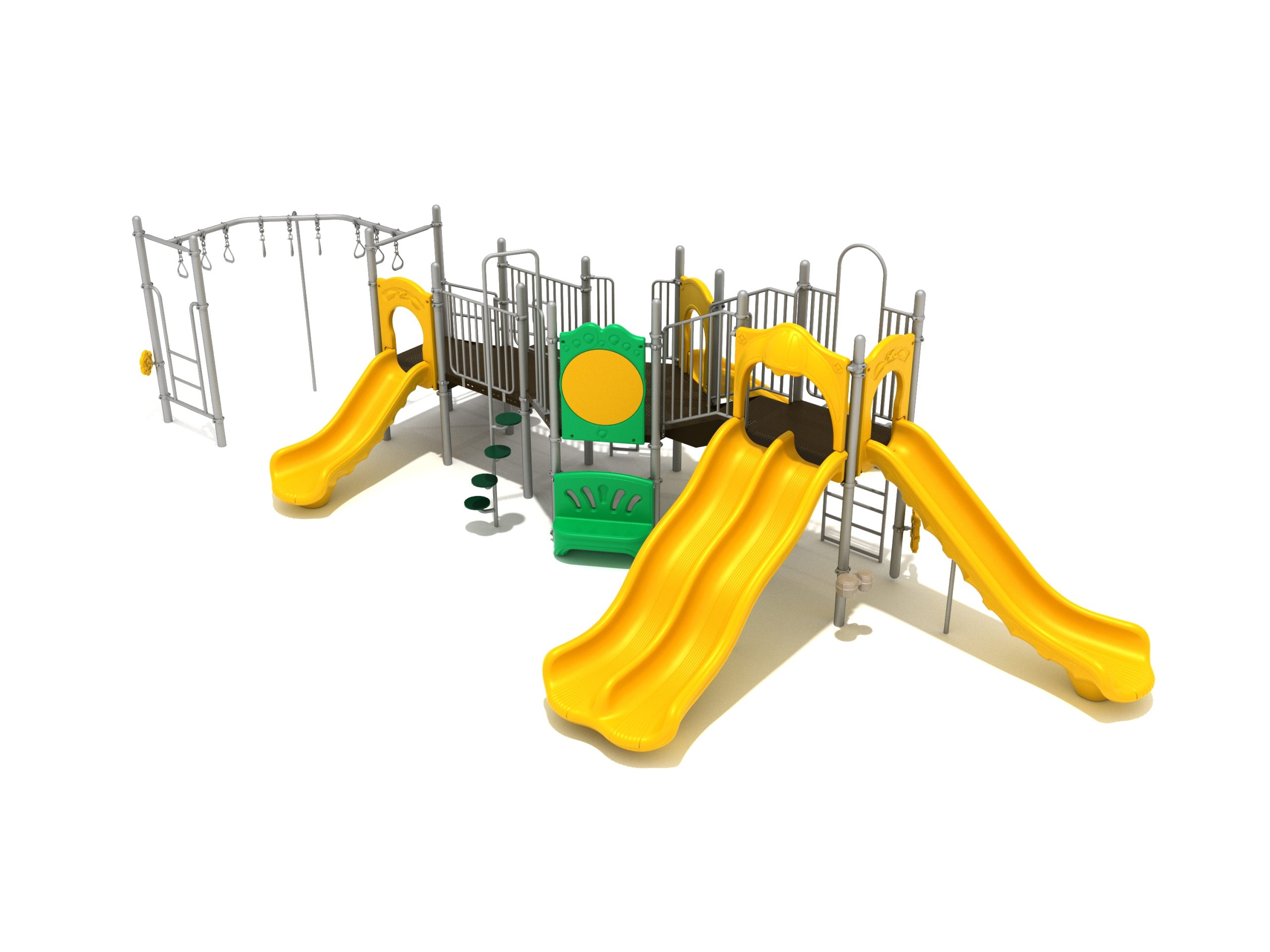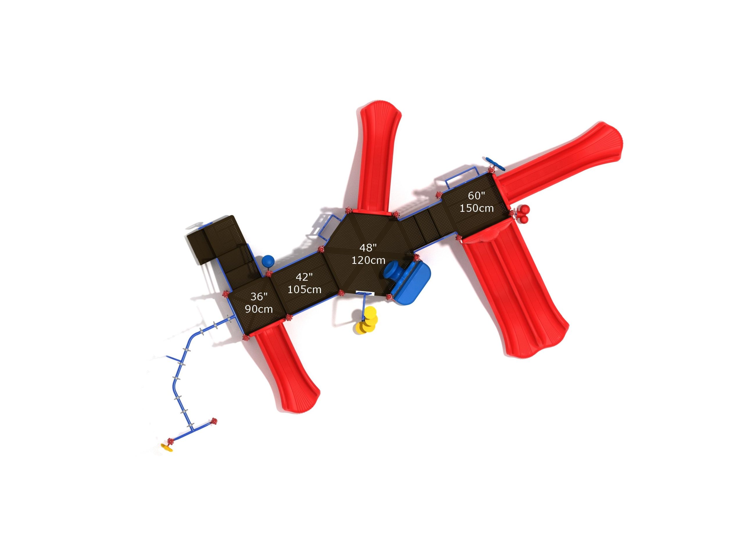 When you install the Santa Monica structure in a playground or public space you’re providing lots of enjoyment for many children of different ages and abilities. Promote physical fitness with a 90 Degree Overhead Swing Ladder accessible by a short Vertical Ladder and watch them use their upper body strength to achieve success. There is a longer Vertical Ladder to access the platform directly, but you can be sure that children will be choosing the more adventurous ways to climb up including the Disk Climber made up of circular footpads of the Zipper Climber which requires some basic hand-eye coordination. Three Straight Slides emerge in different directions which allow children to make decisions about which one they choose, but there’s a Double Wave Slide that every child will want to zip down quickly. Features like the Single Drum, Drum Panel and Bongos add an auditory experience to the structure, and the Rain Wheel and Ship’s Wheel add movement as they spin round and round when touched. A Bench Panel underneath provides an area for respite when kids need to recharge their batteries.
