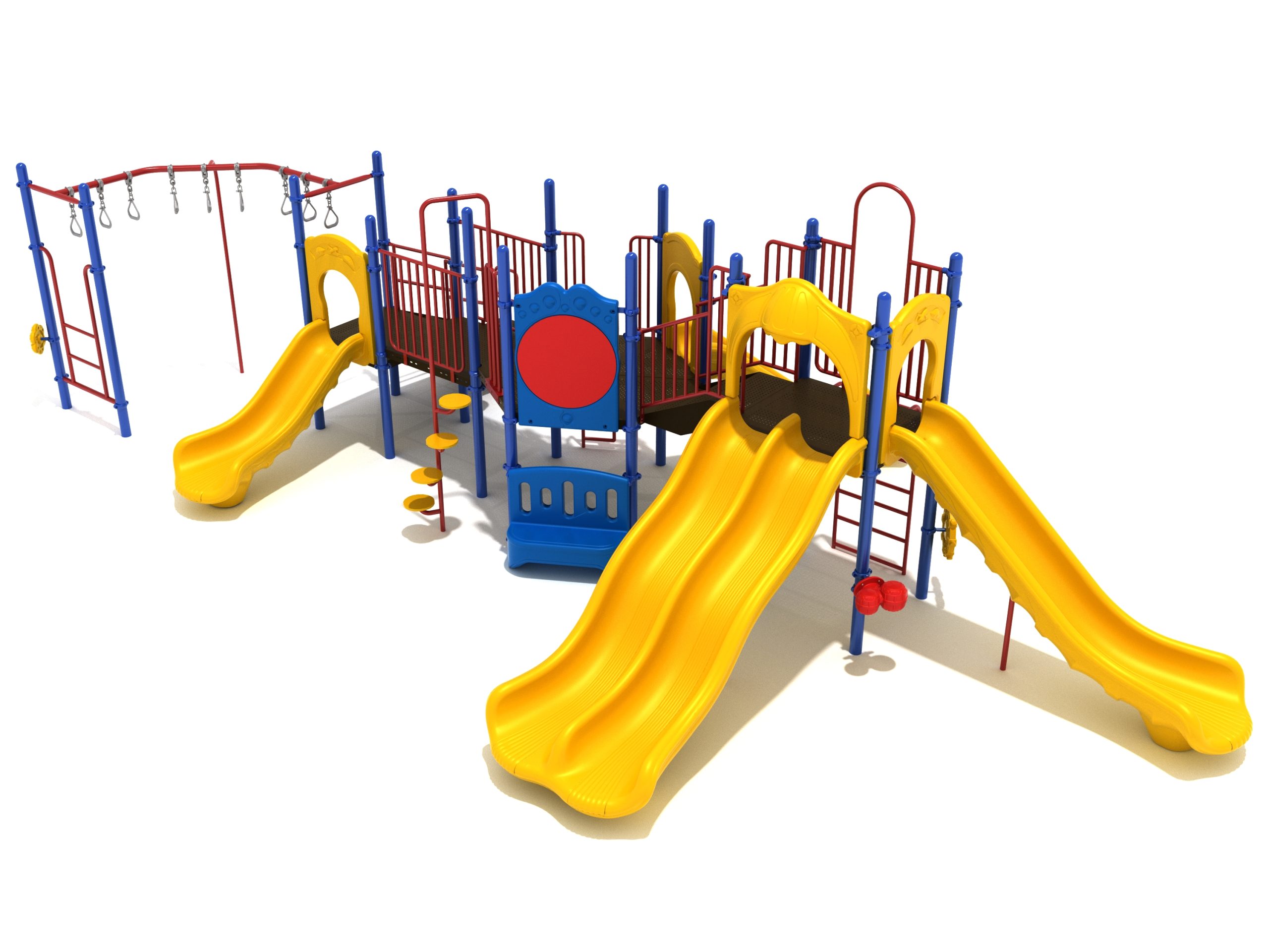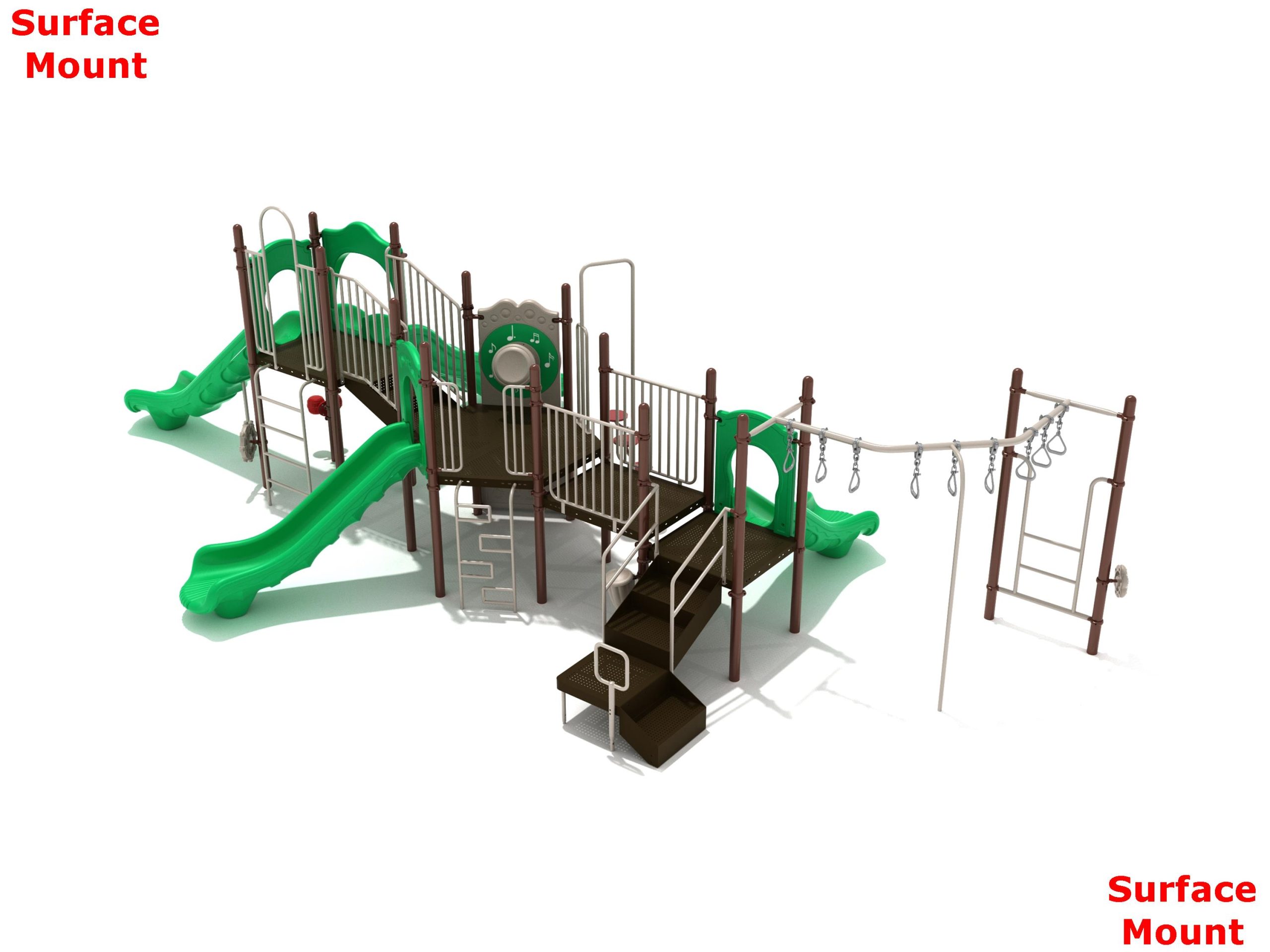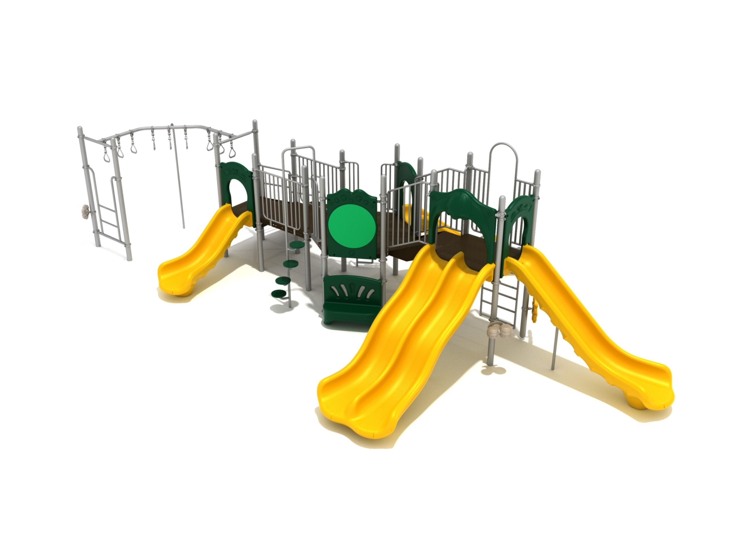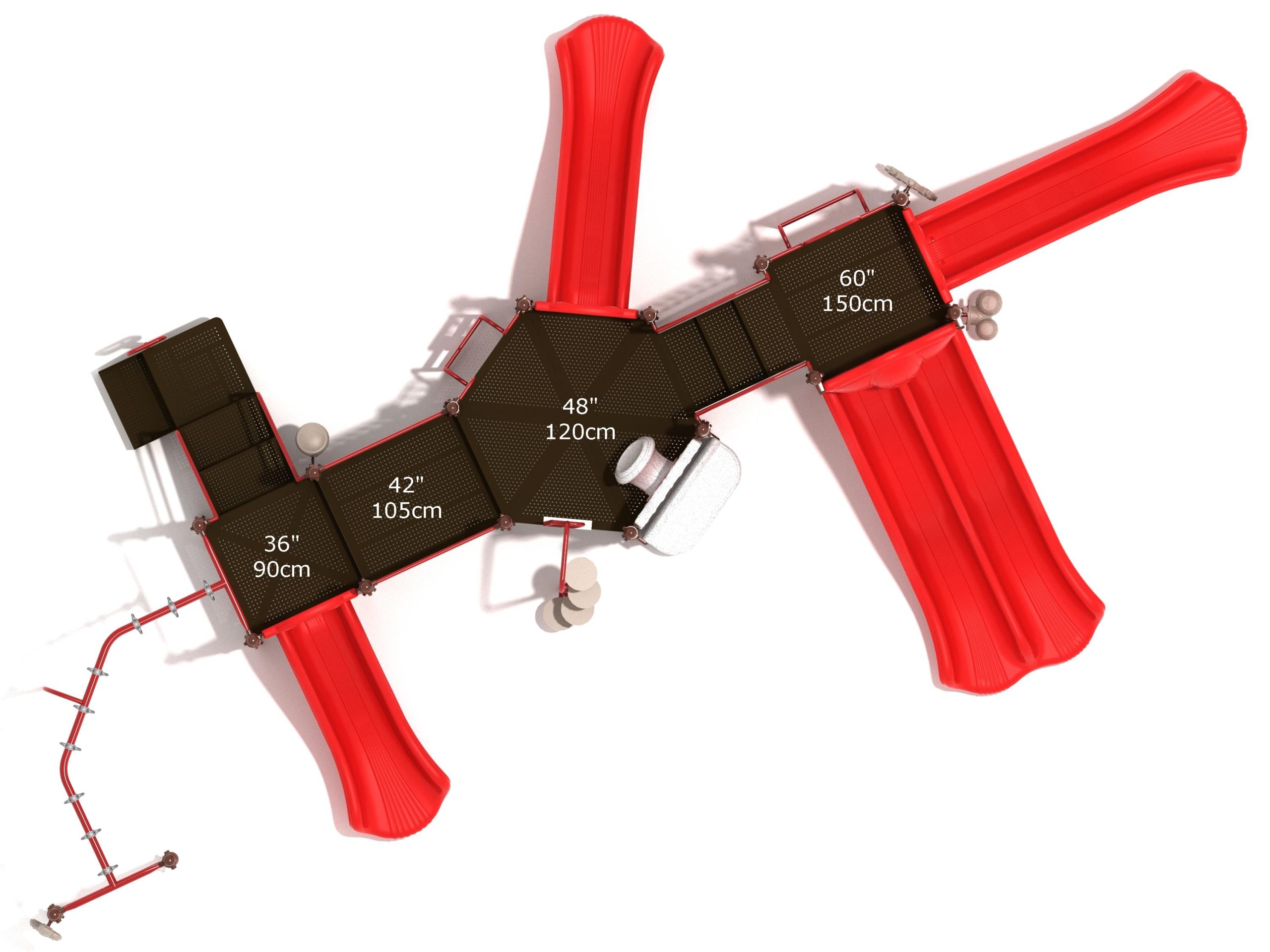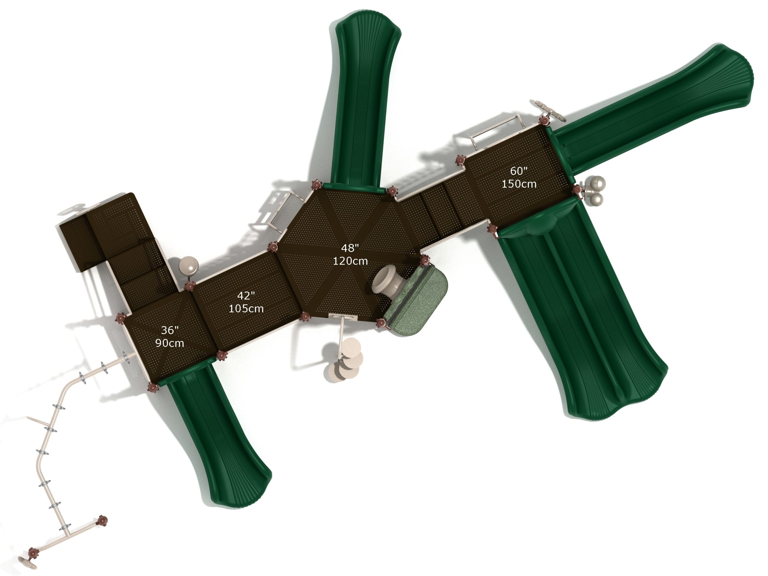 When you install the Santa Monica structure in a playground or public space you’re providing lots of enjoyment for many children of different ages and abilities. Promote physical fitness with a 90 Degree Overhead Swing Ladder accessible by a short Vertical Ladder and watch them use their upper body strength to achieve success. There is a longer Vertical Ladder to access the platform directly, but you can be sure that children will be choosing the more adventurous ways to climb up including the Disk Climber made up of circular footpads of the Zipper Climber which requires some basic hand-eye coordination. Three Straight Slides emerge in different directions which allow children to make decisions about which one they choose, but there’s a Double Wave Slide that every child will want to zip down quickly. Features like the Single Drum, Drum Panel and Bongos add an auditory experience to the structure, and the Rain Wheel and Ship’s Wheel add movement as they spin round and round when touched. A Bench Panel underneath provides an area for respite when kids need to recharge their batteries.