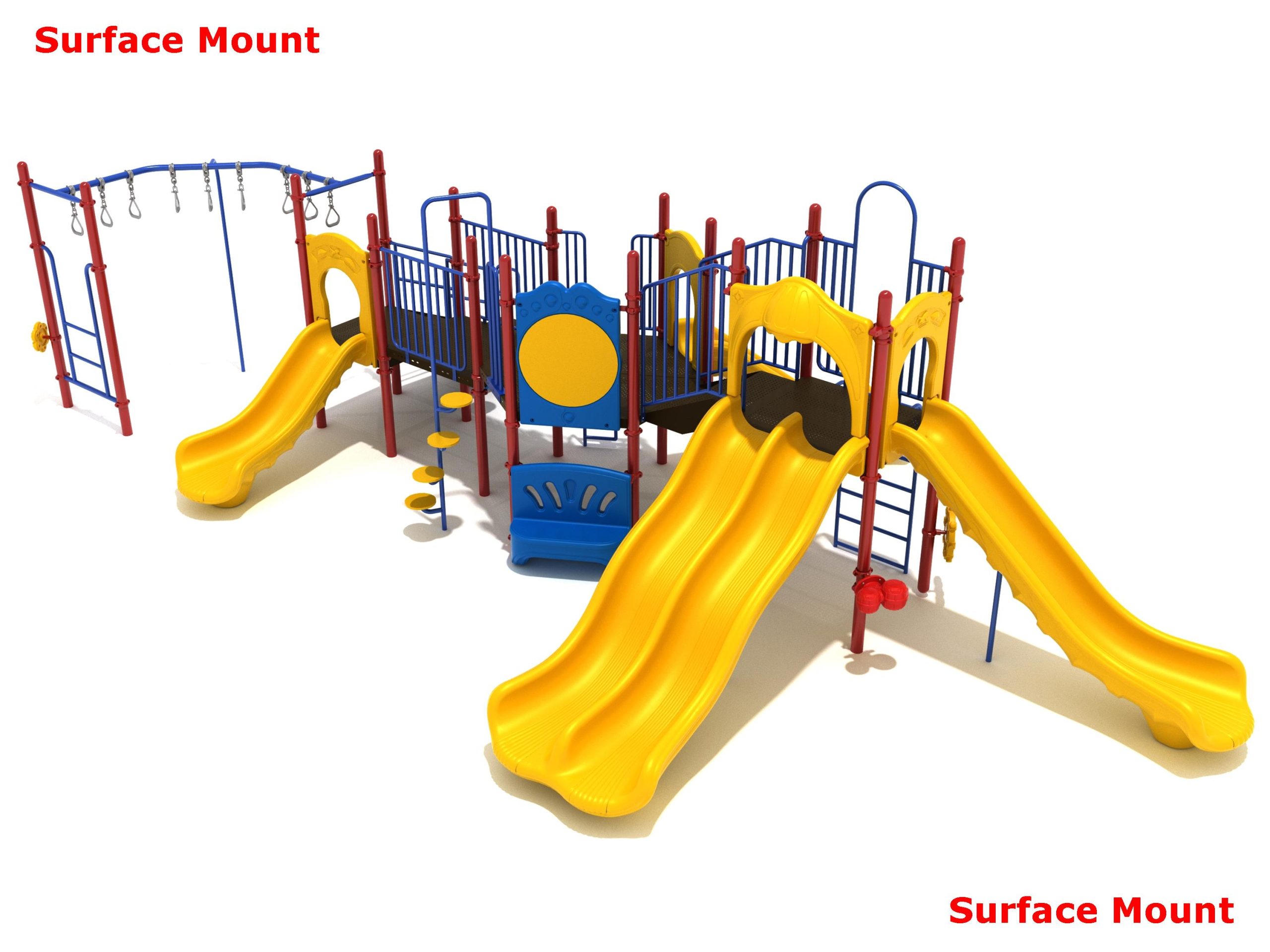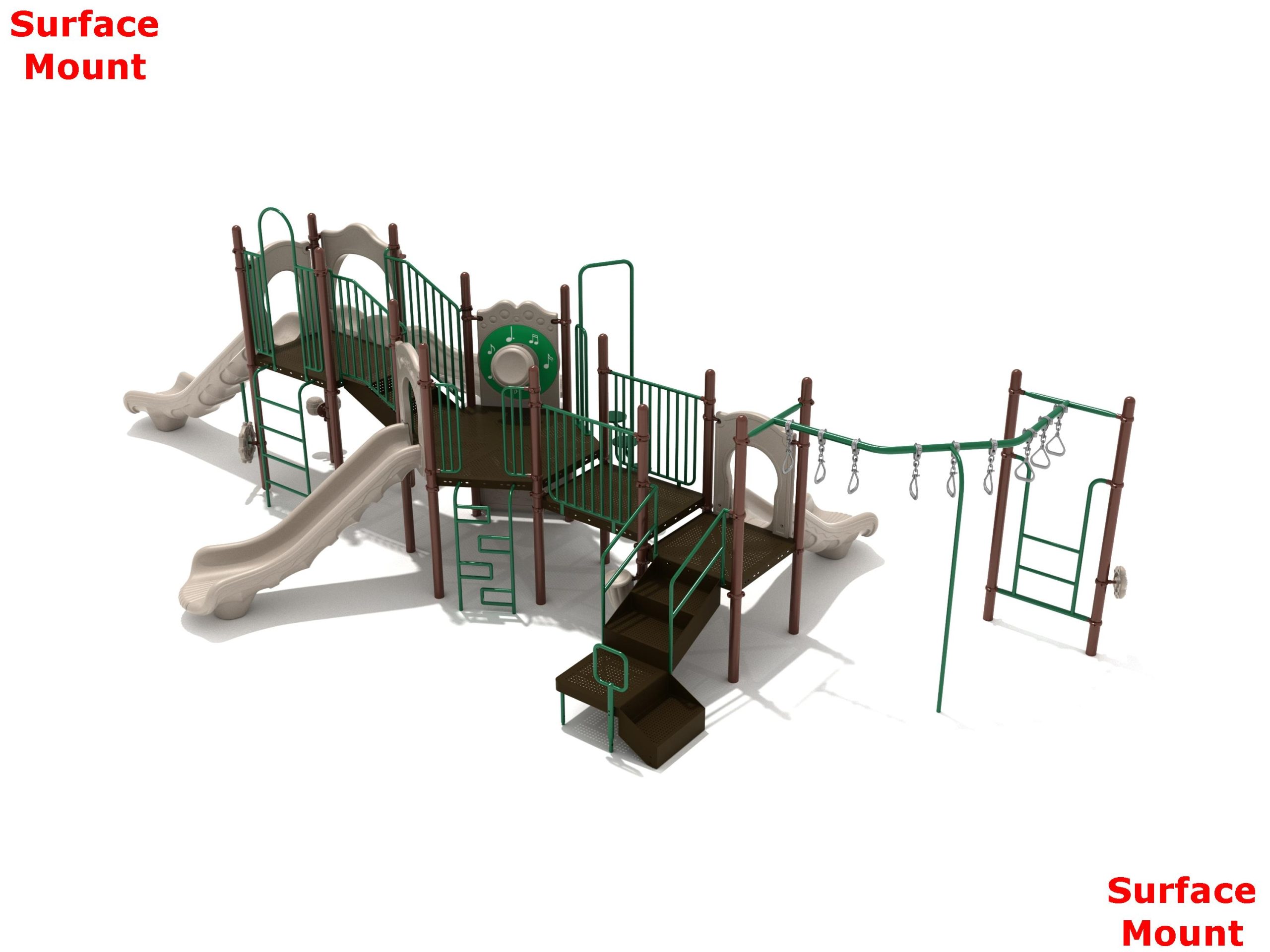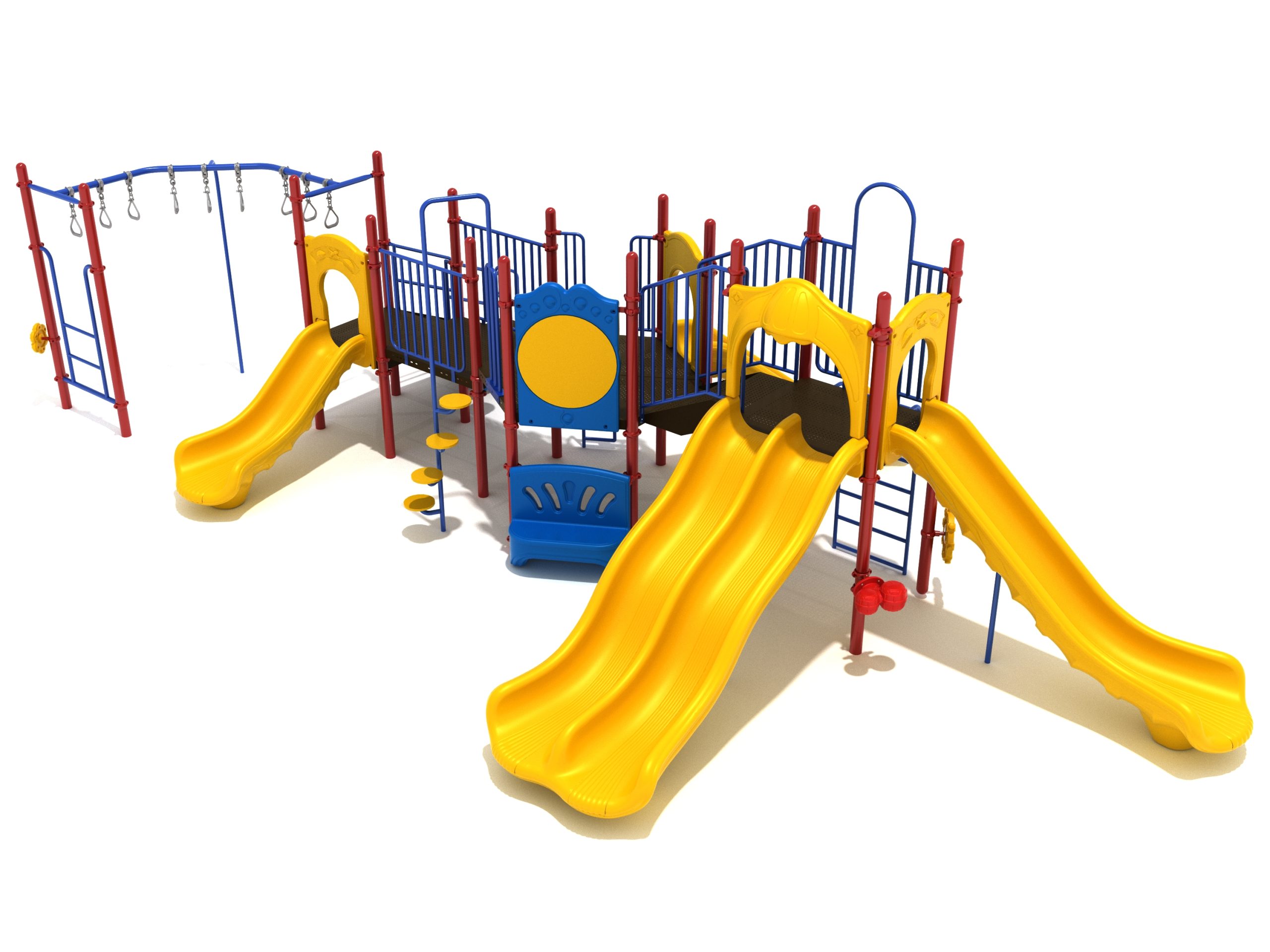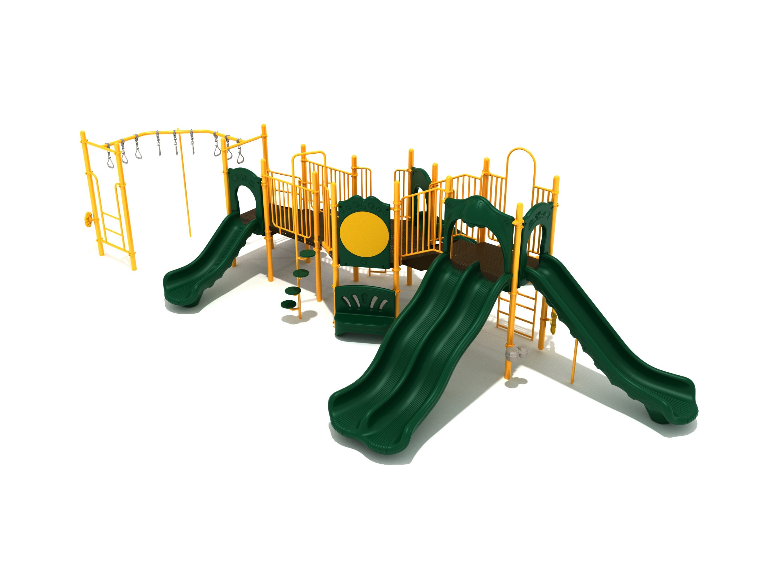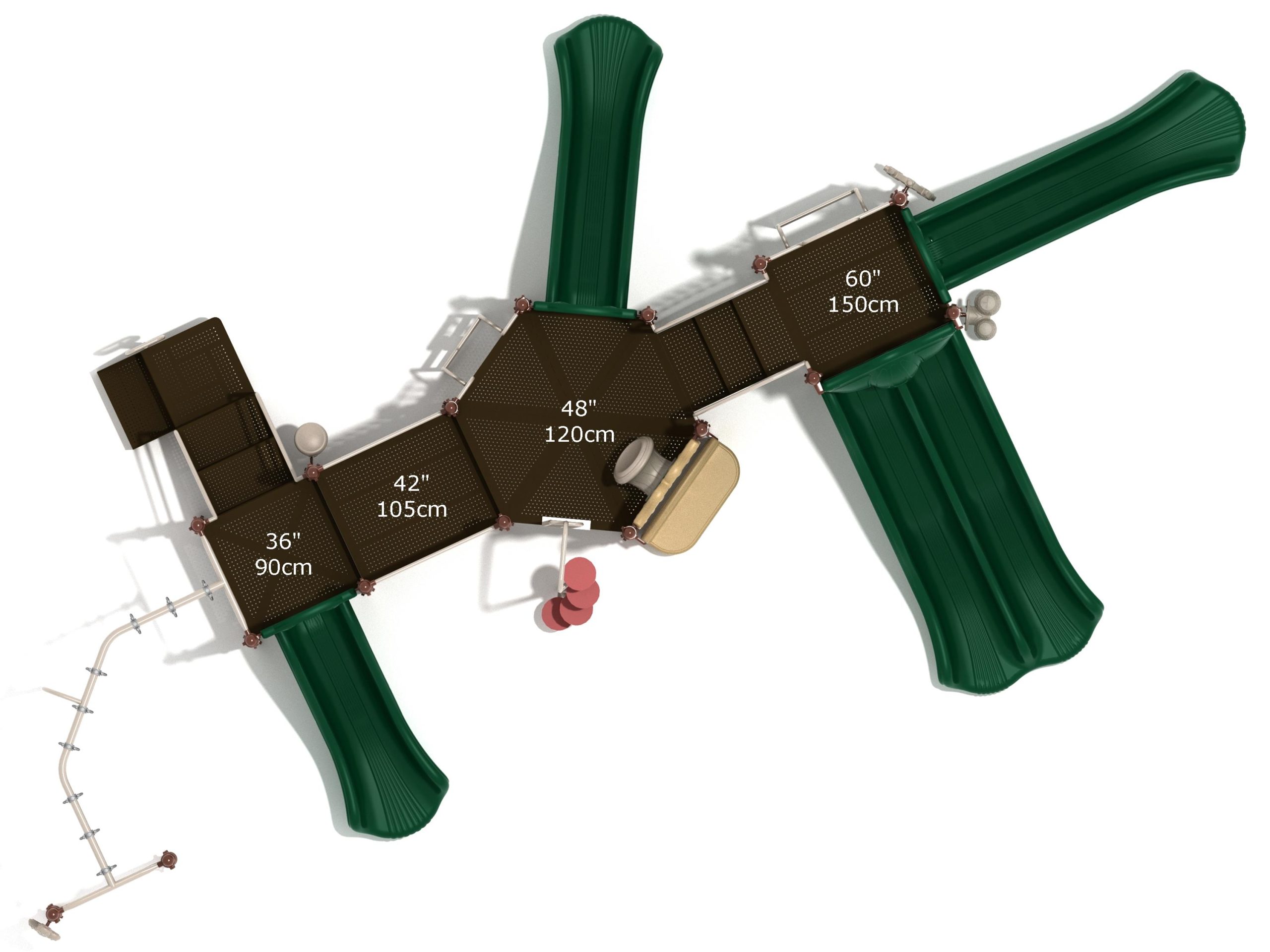 When you install the Santa Monica structure in a playground or public space you’re providing lots of enjoyment for many children of different ages and abilities. Promote physical fitness with a 90 Degree Overhead Swing Ladder accessible by a short Vertical Ladder and watch them use their upper body strength to achieve success. There is a longer Vertical Ladder to access the platform directly, but you can be sure that children will be choosing the more adventurous ways to climb up including the Disk Climber made up of circular footpads of the Zipper Climber which requires some basic hand-eye coordination. Three Straight Slides emerge in different directions which allow children to make decisions about which one they choose, but there’s a Double Wave Slide that every child will want to zip down quickly. Features like the Single Drum, Drum Panel and Bongos add an auditory experience to the structure, and the Rain Wheel and Ship’s Wheel add movement as they spin round and round when touched. A Bench Panel underneath provides an area for respite when kids need to recharge their batteries.